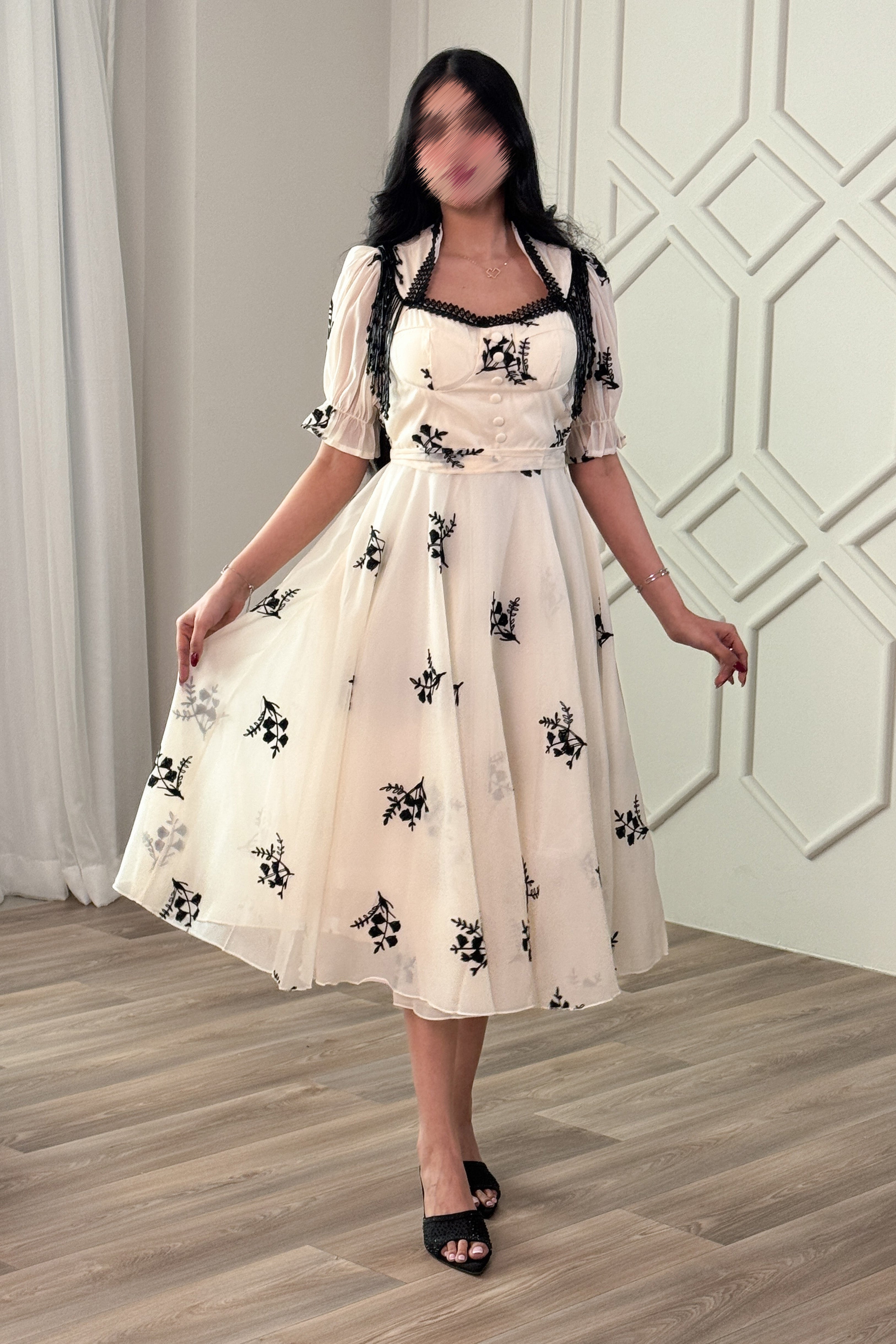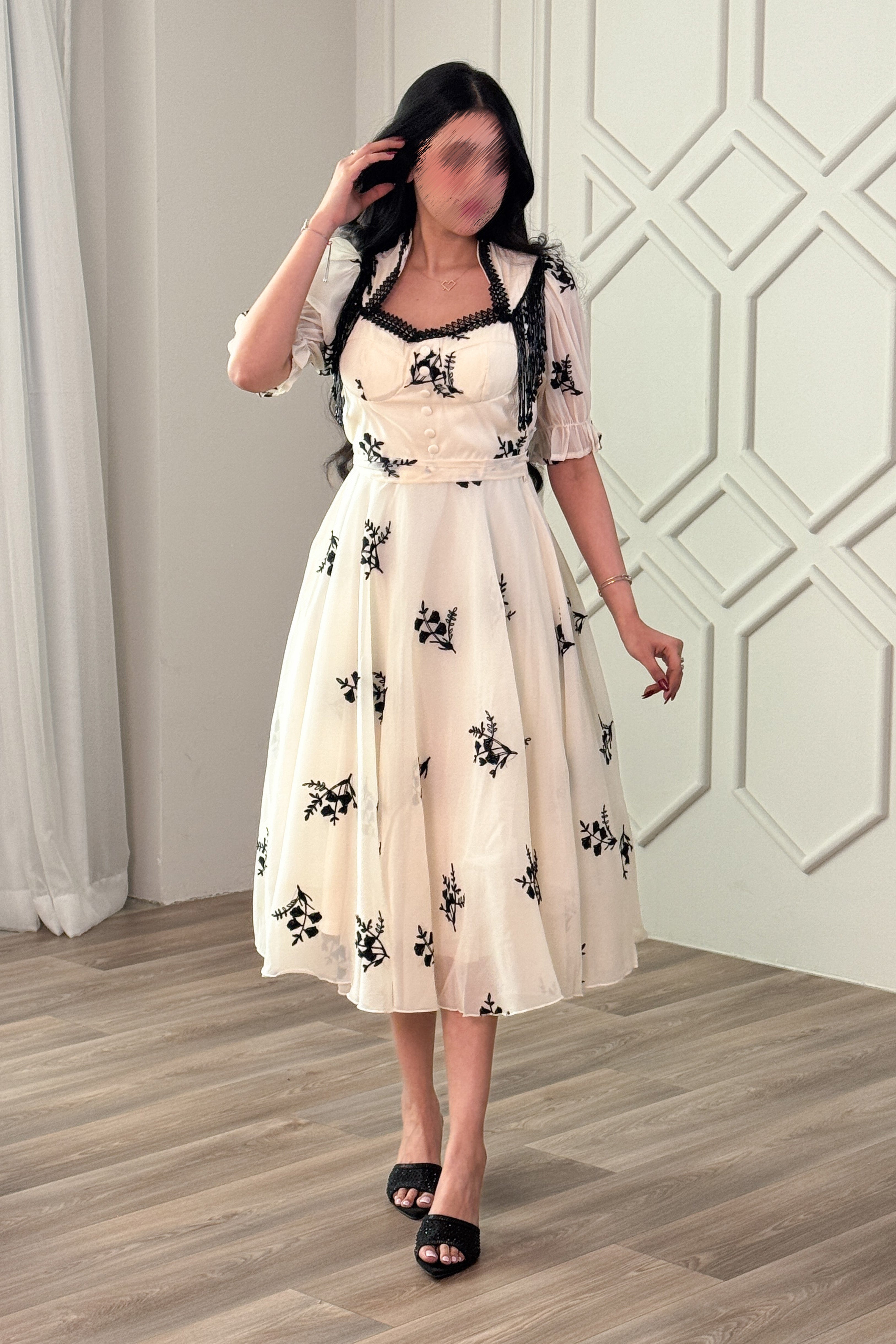 الخامة شيفون مع بوليستر نوع التصميم فستان ميدي كلوش نوع القصة ميدي كلوش بزم عالخصر والياقه كوين اني واكمام حيران بزم مزين بدانتيل المناسبة خروج حفله او سهره الخصر زم كلوش الياقة كوين اني الاكمام حيران بزم التمدد غير قابل لتمدد الاضافات كلفه قيطان وهدب ارشادات العناية قابل للغسيل والكي بدرجة حراره منخفضه