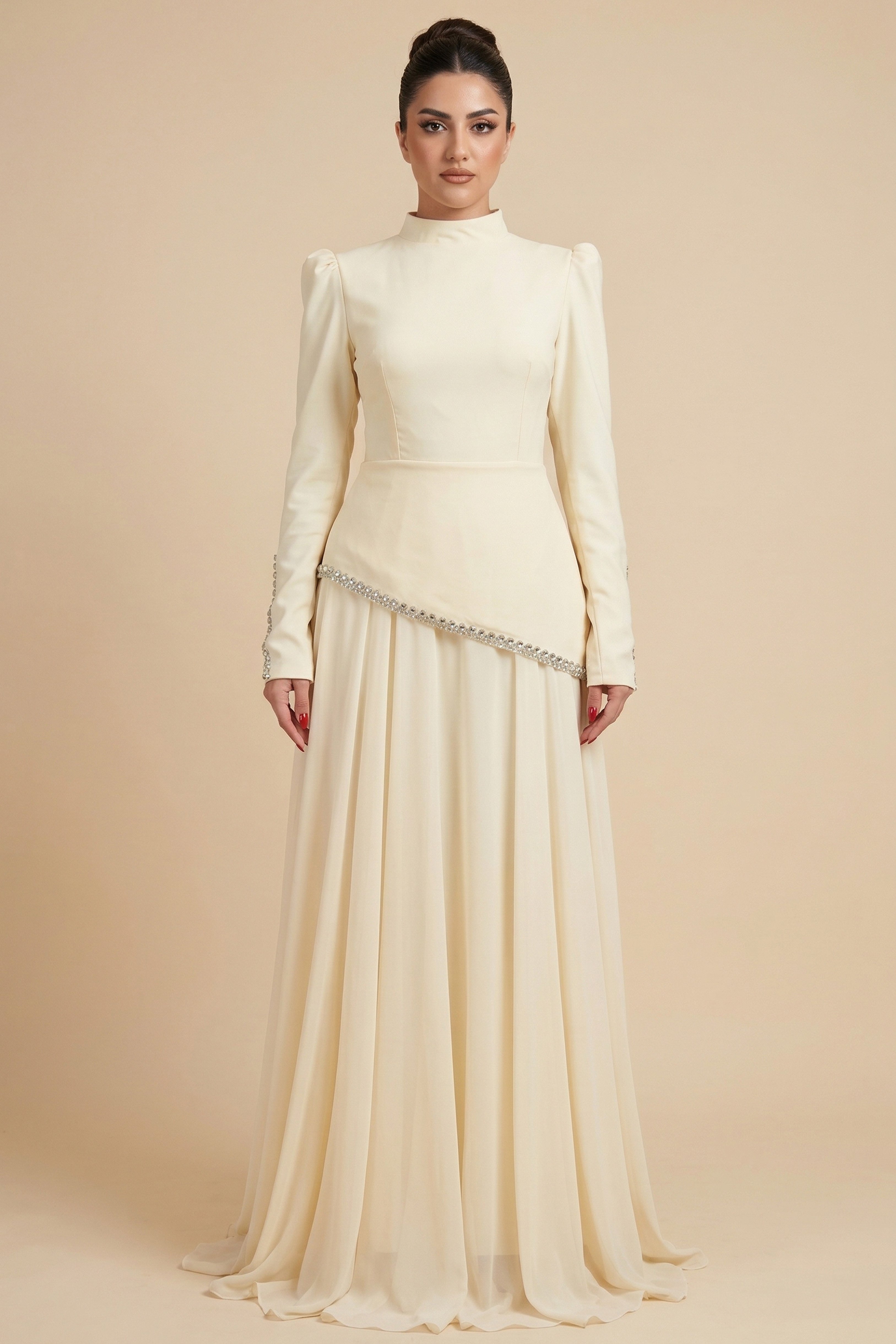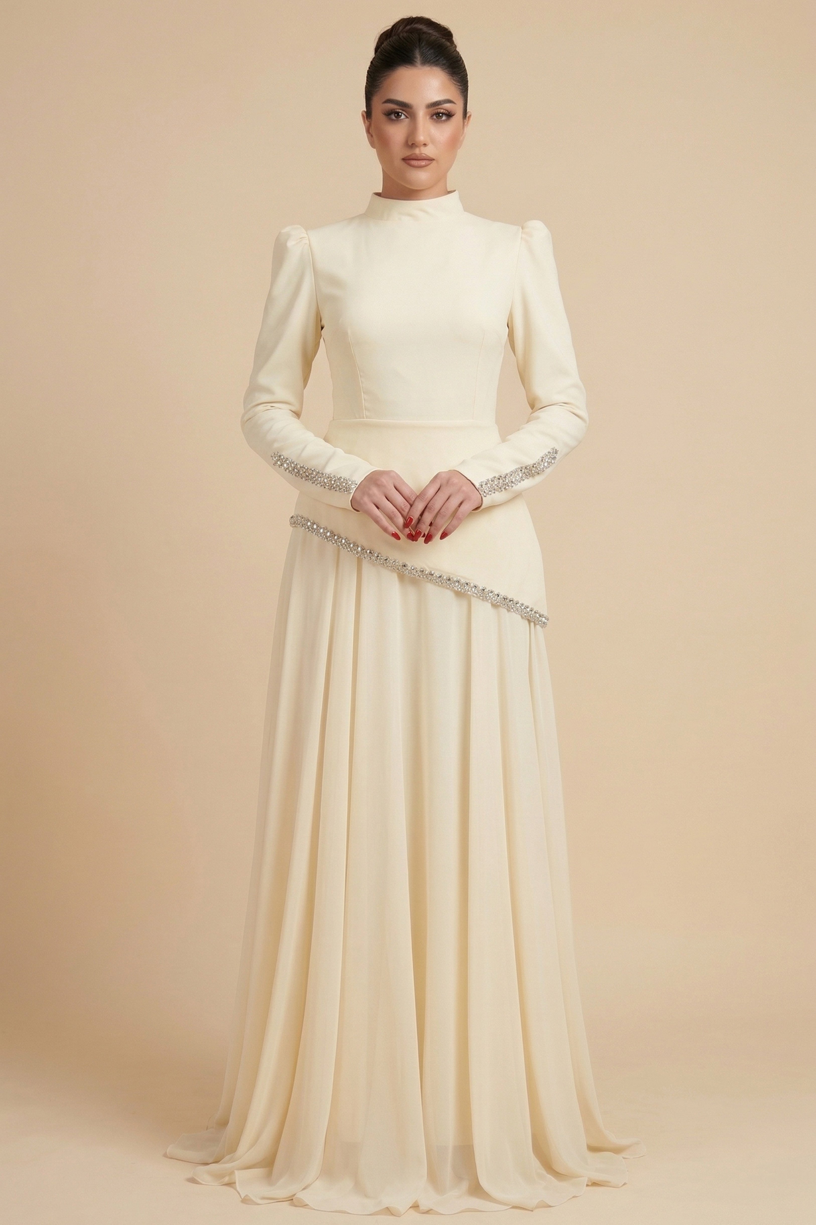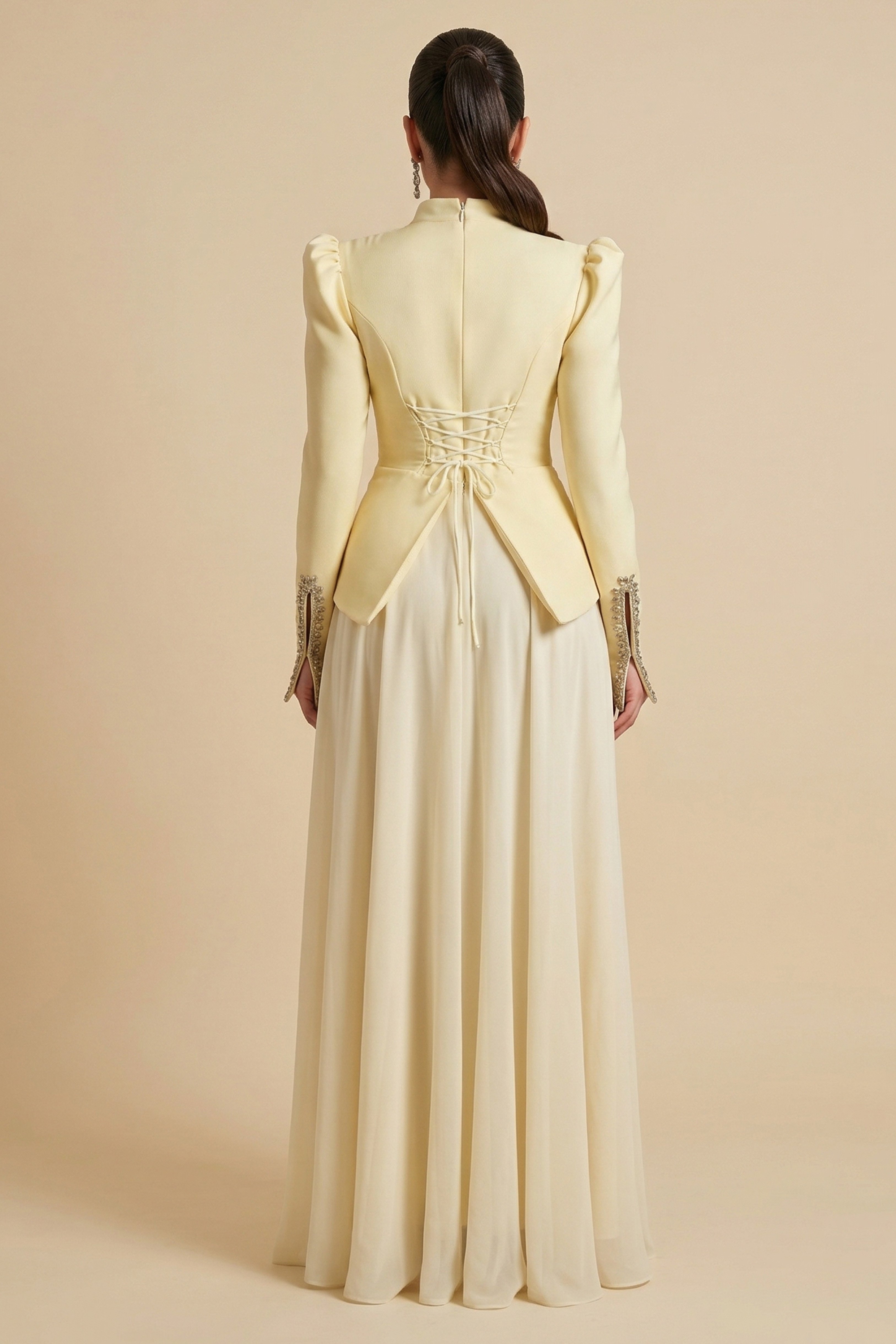 • نوع القصة: فستان طويل سهرة أصفر فاتح بياقة عالية وتفاصيل كريستال مائلة بأكمام طويلة