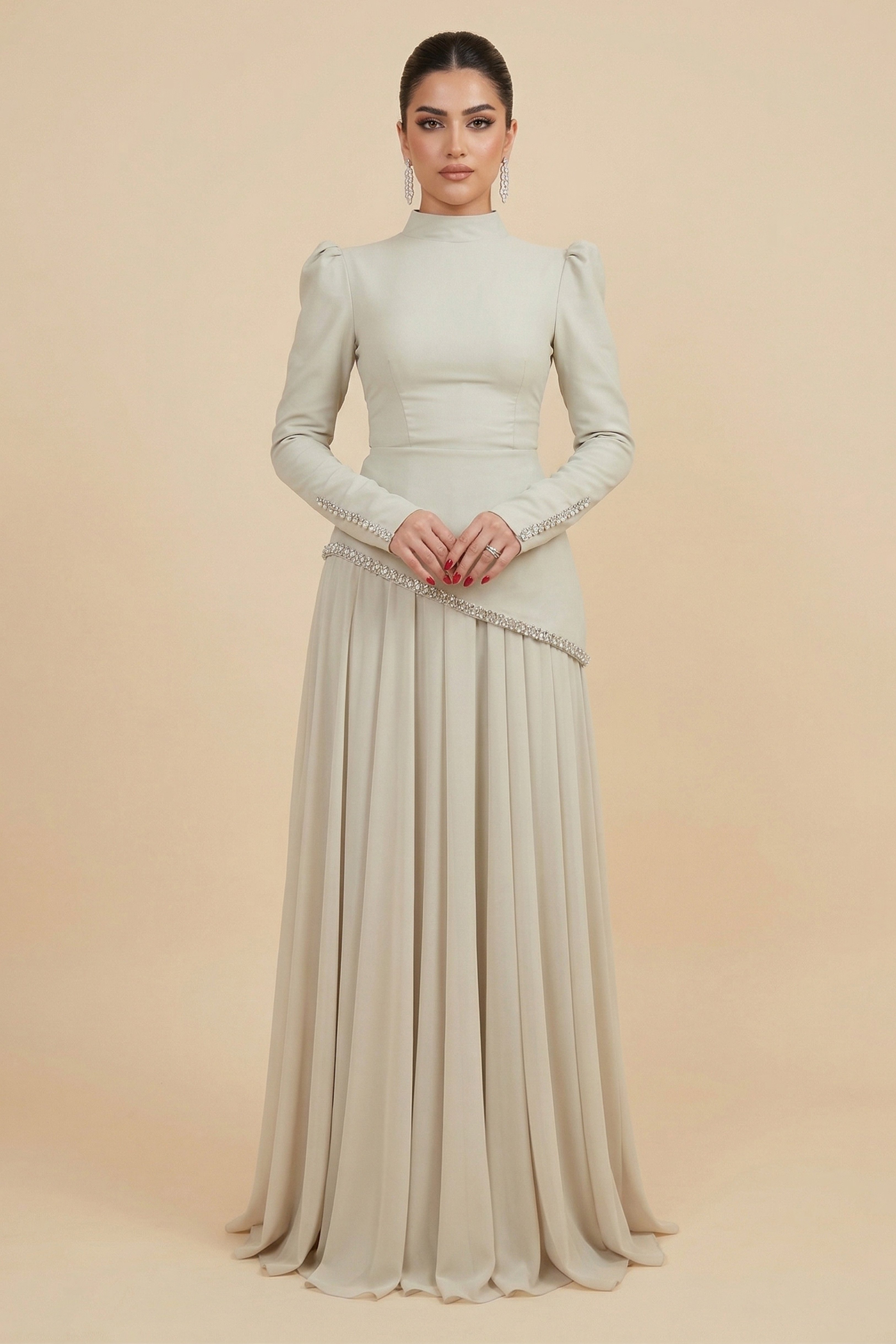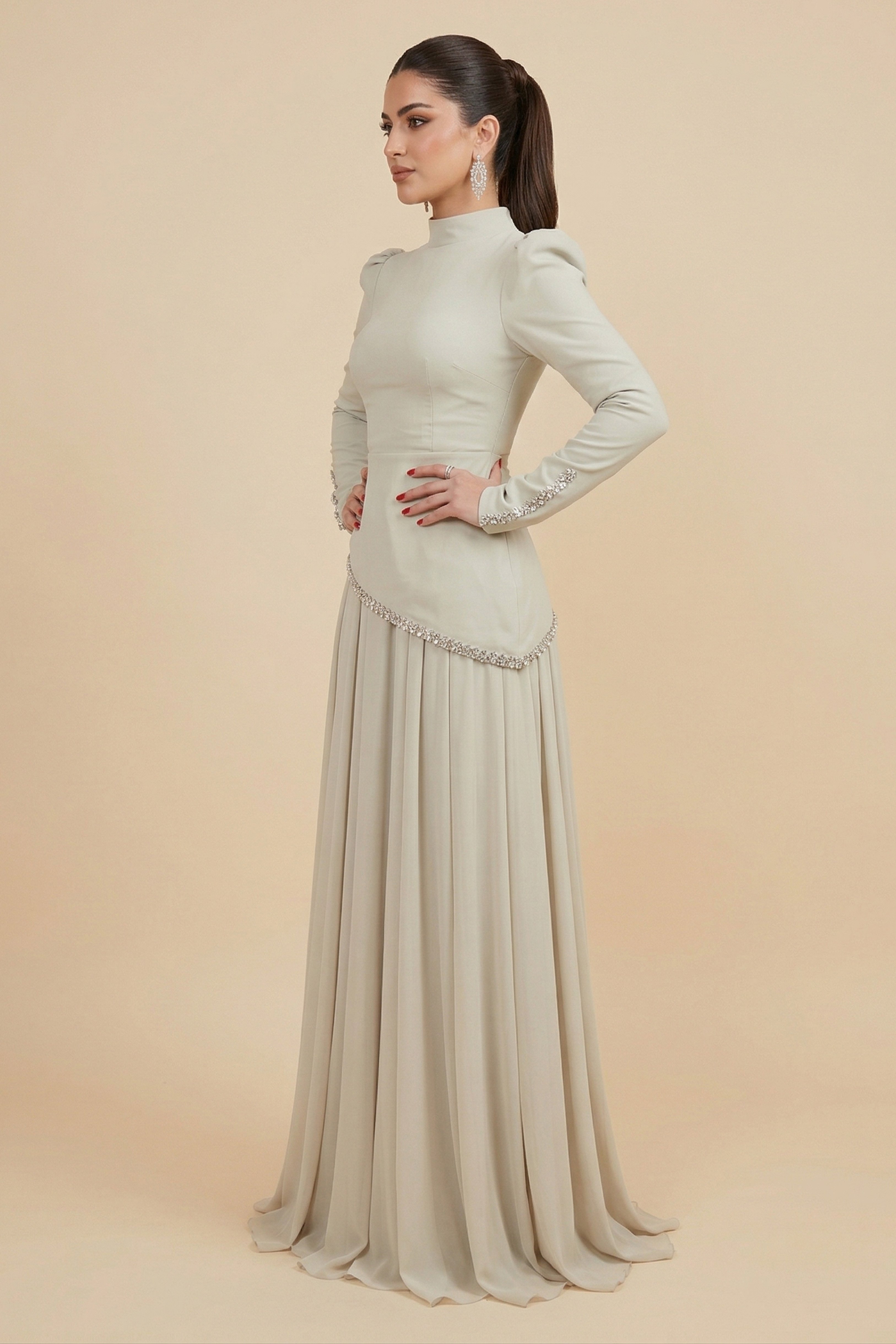 نوع القصة: فستان طويل سهرة أخضر فاتح بياقة عالية وتفاصيل كريستال مائلة بأكمام طويلة