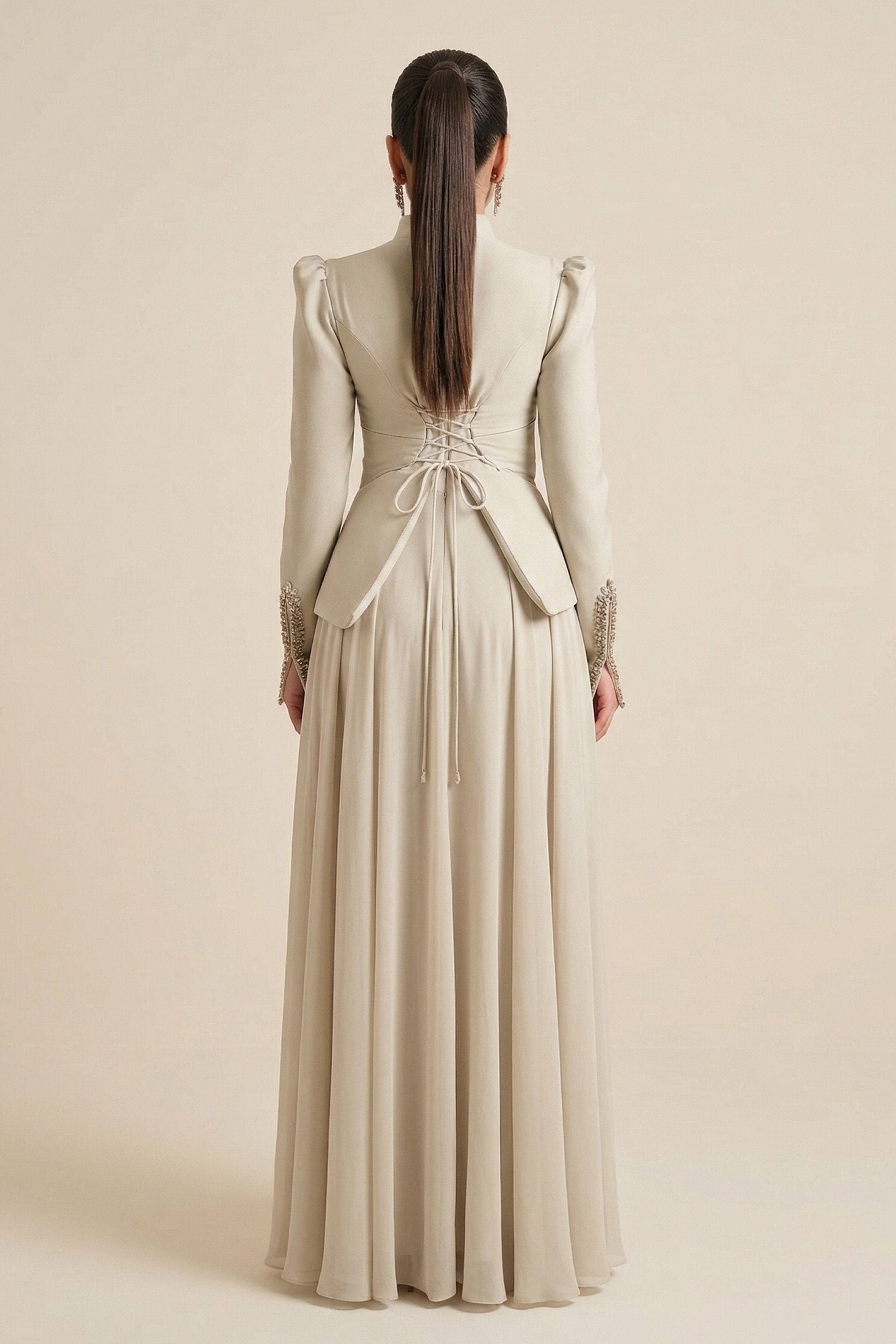 هذا التصميم مثالي لكل من تبحث عن فستان يجمع بين الاحتشام والفخامة ضمن مجموعة فساتين سهرة كلاسيك