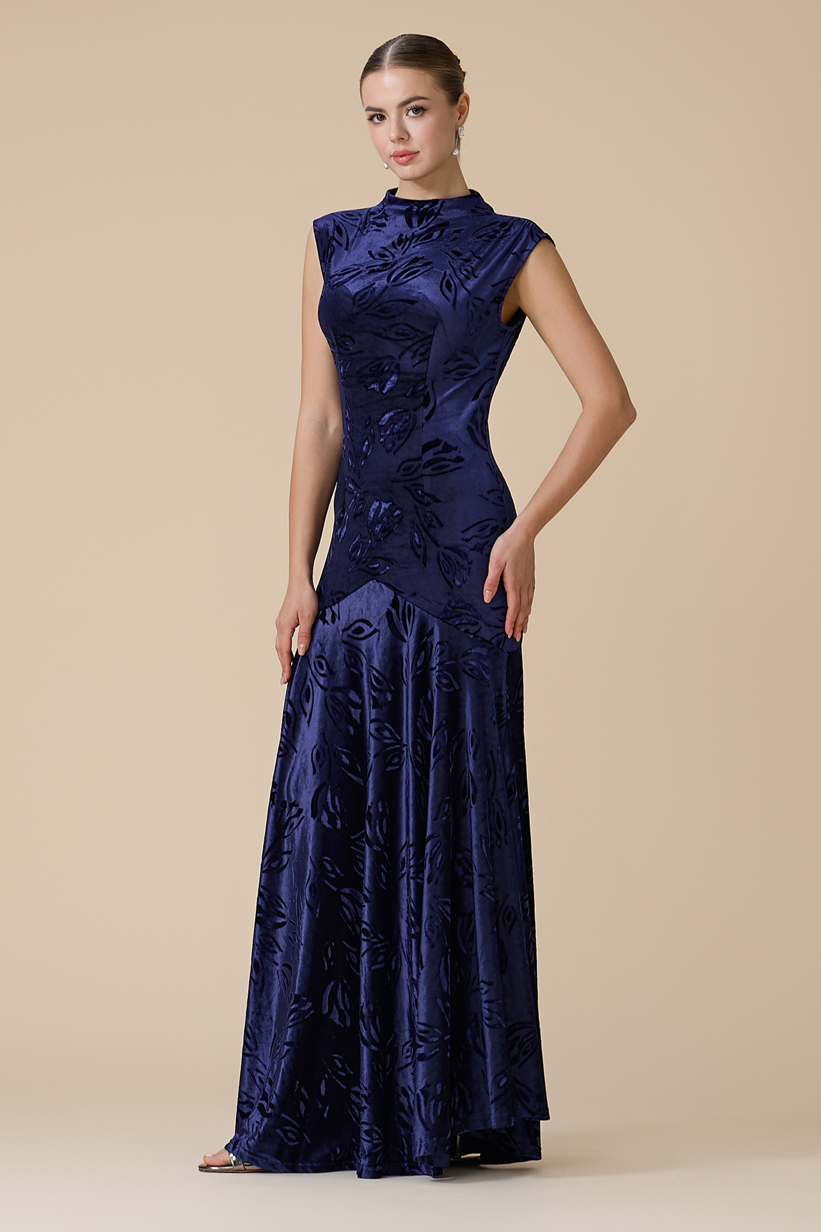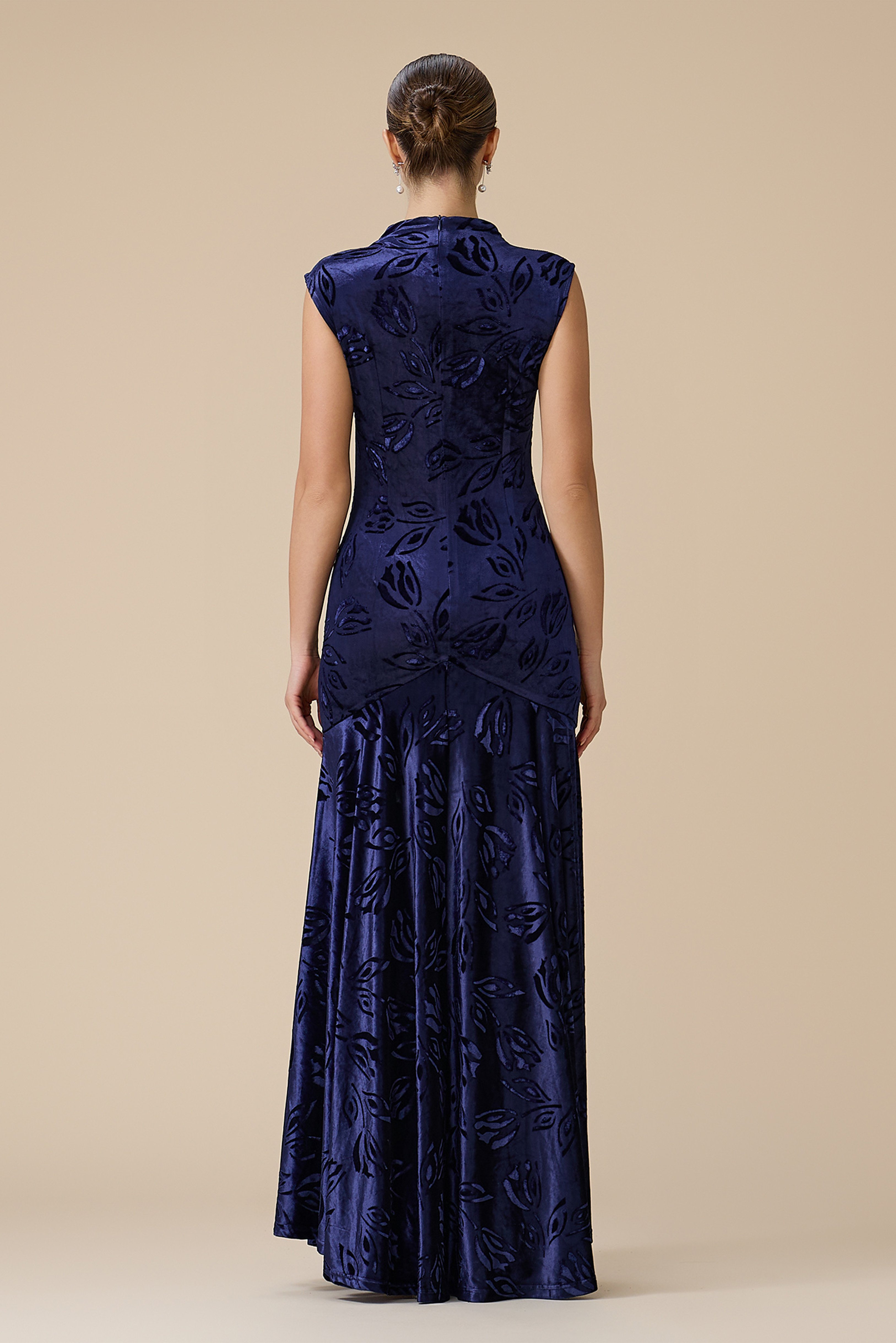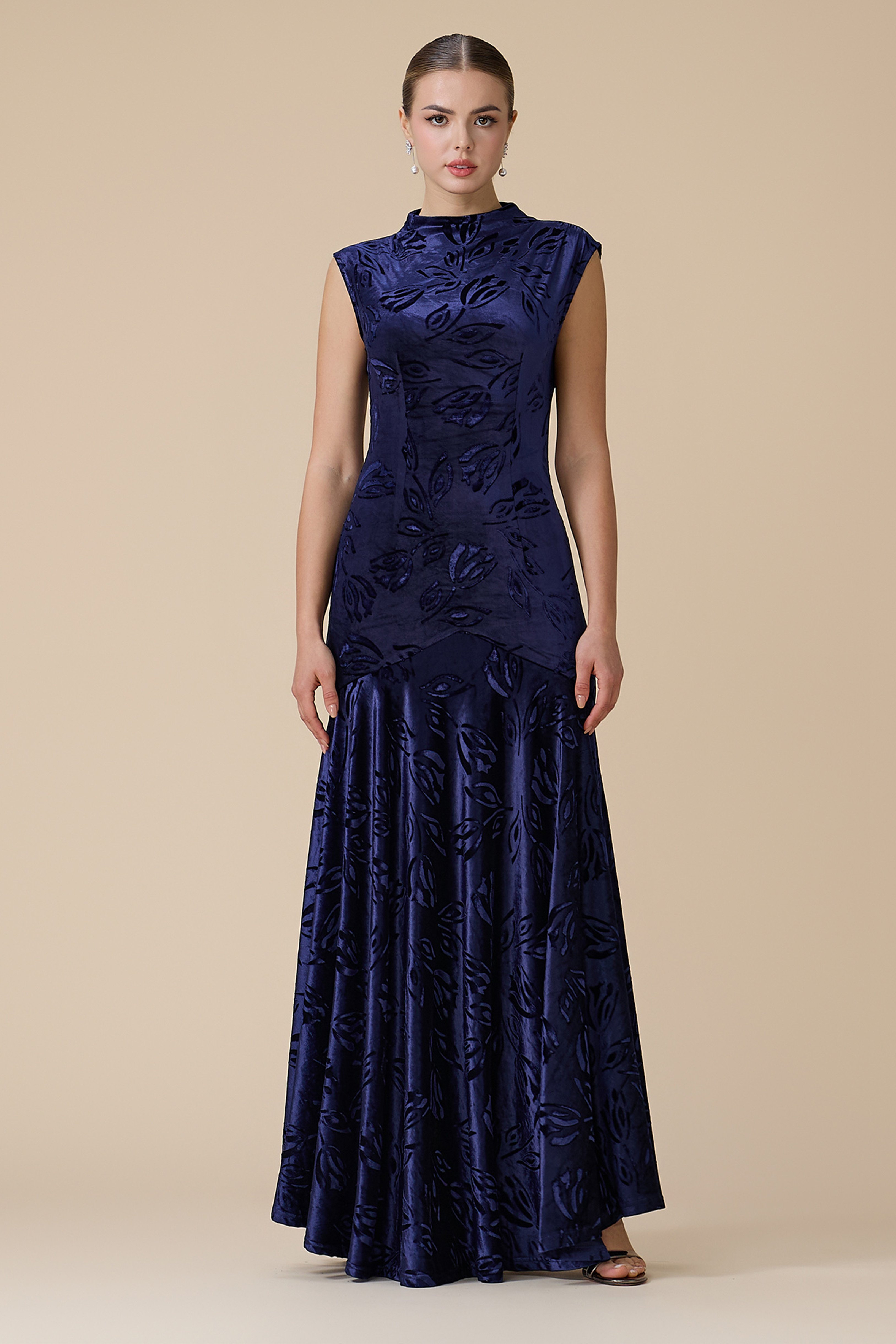 فستان طويل مخمل كحلي – نقوش زهرية – ياقة عالية درابيه – بلا أكمام – قصة مخصّرة – بتمدد مريح