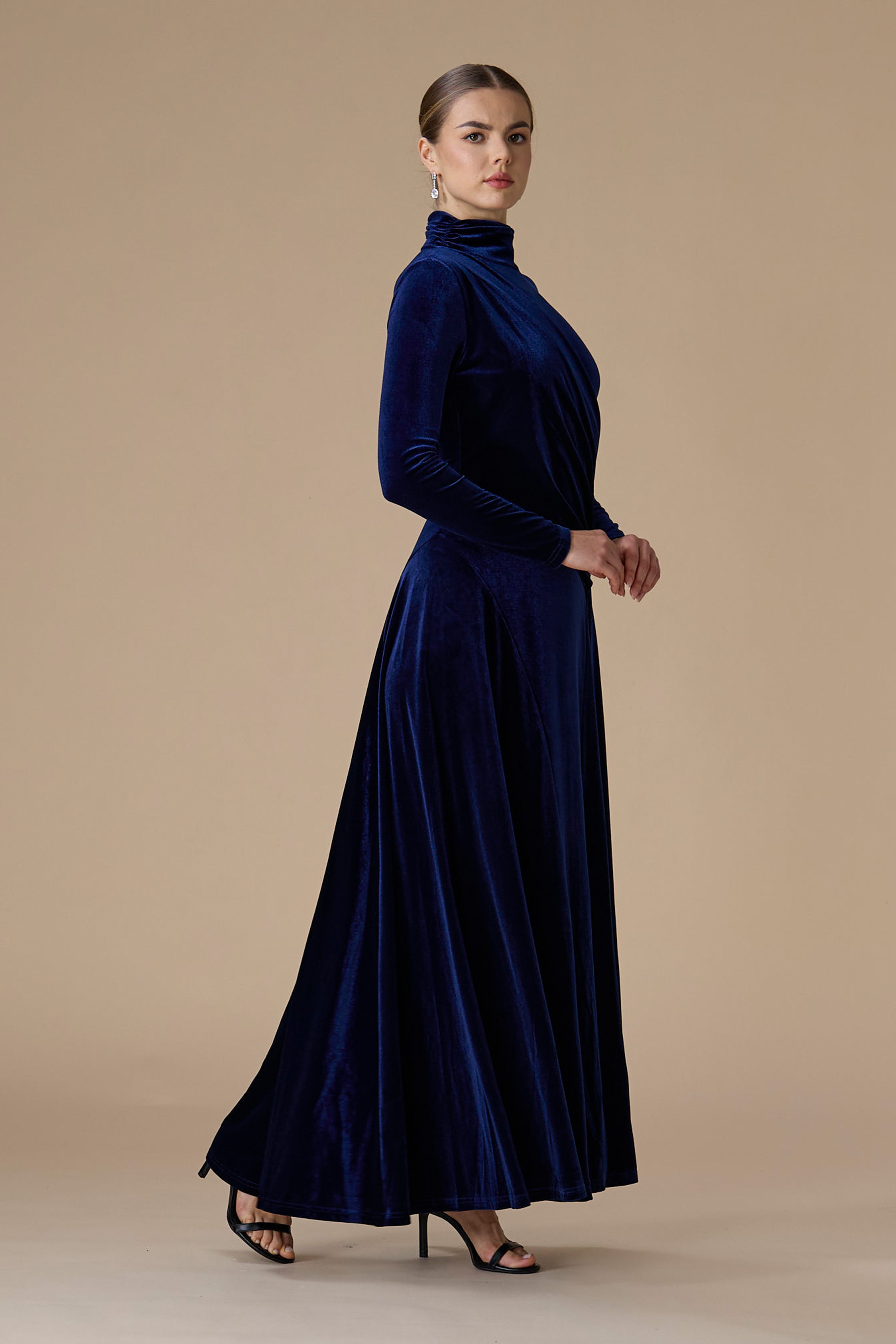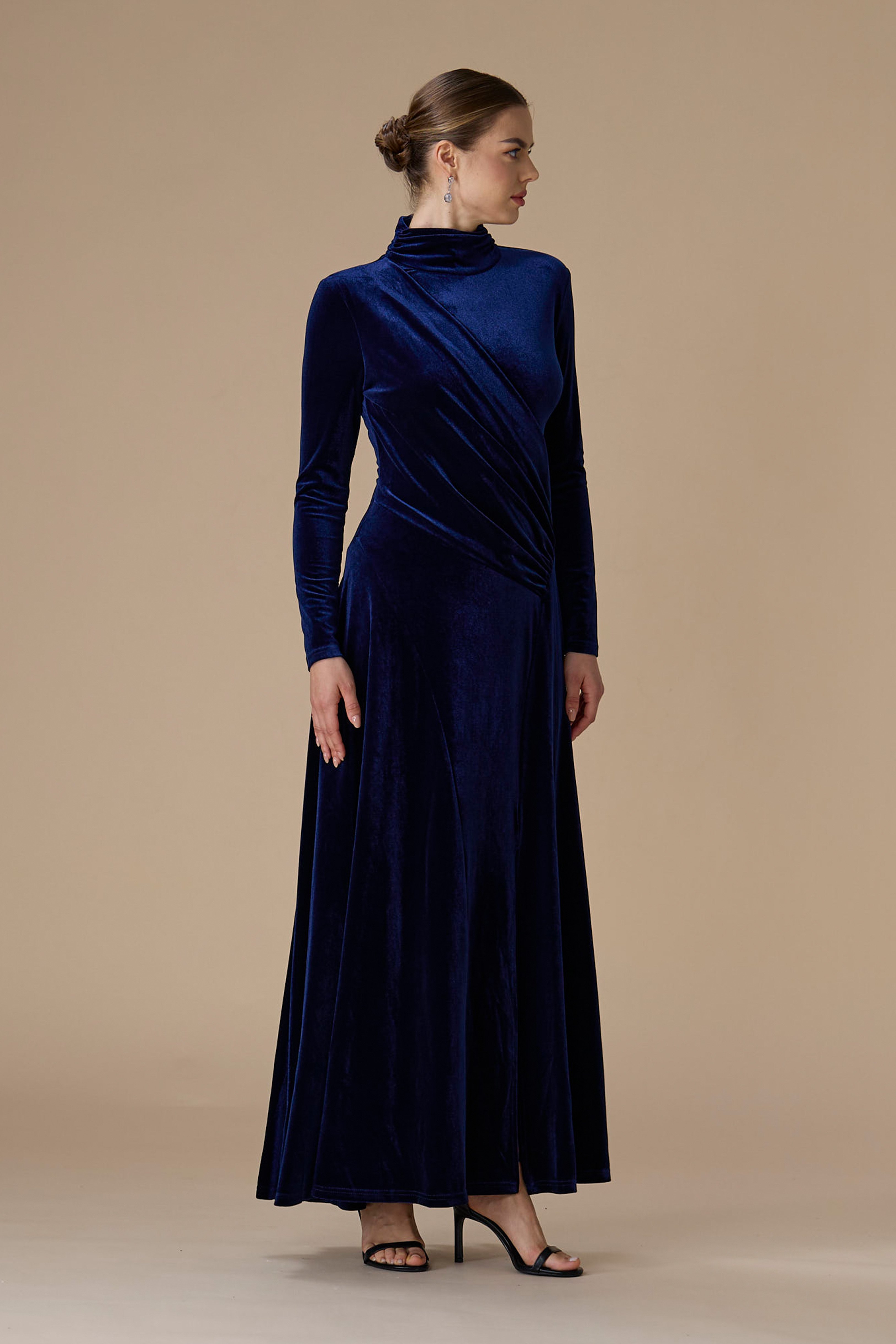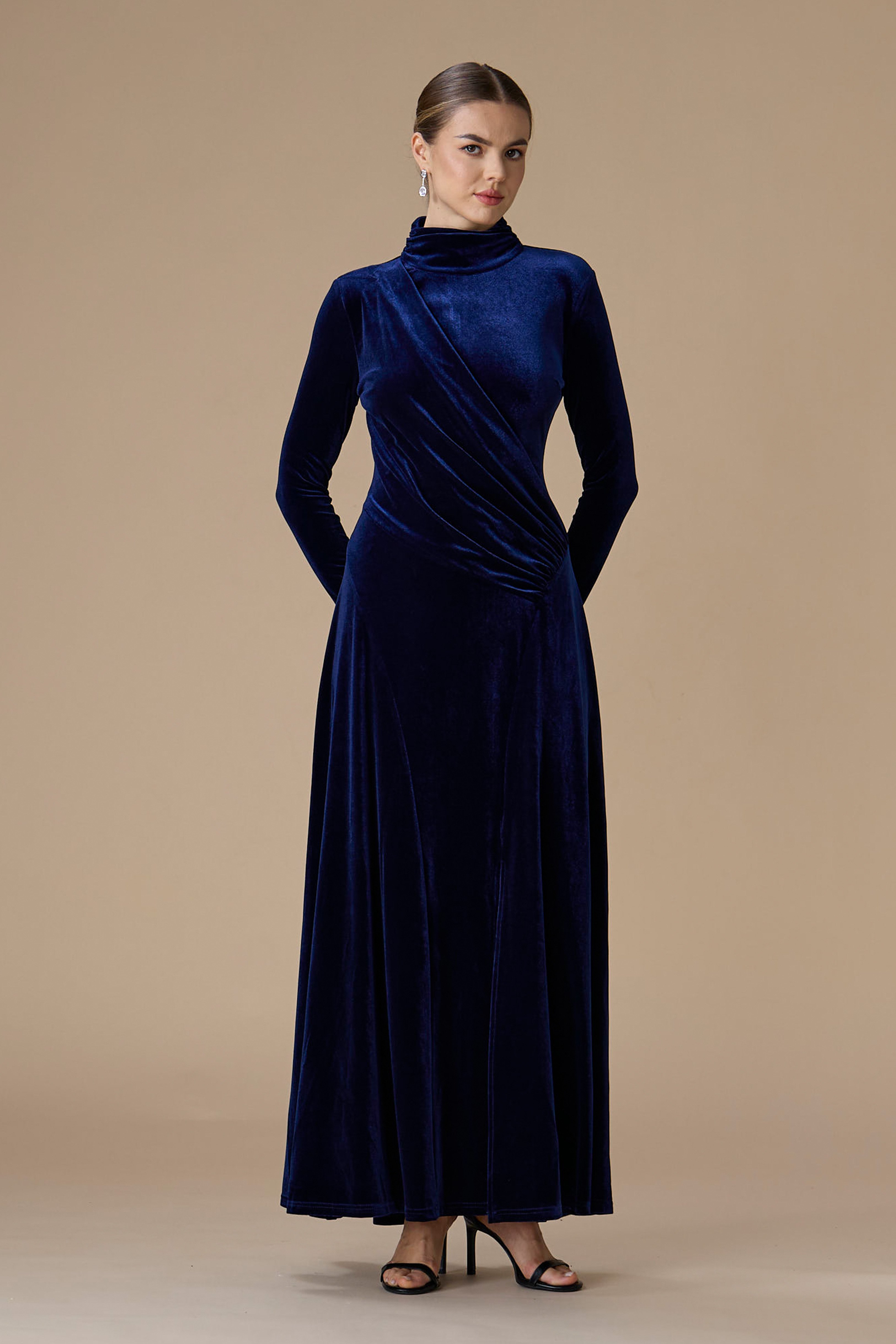 - نوع القصة: فستان كحلي مخمل درابيه طويل بياقة عالية وأكمام طويلة وضيقة