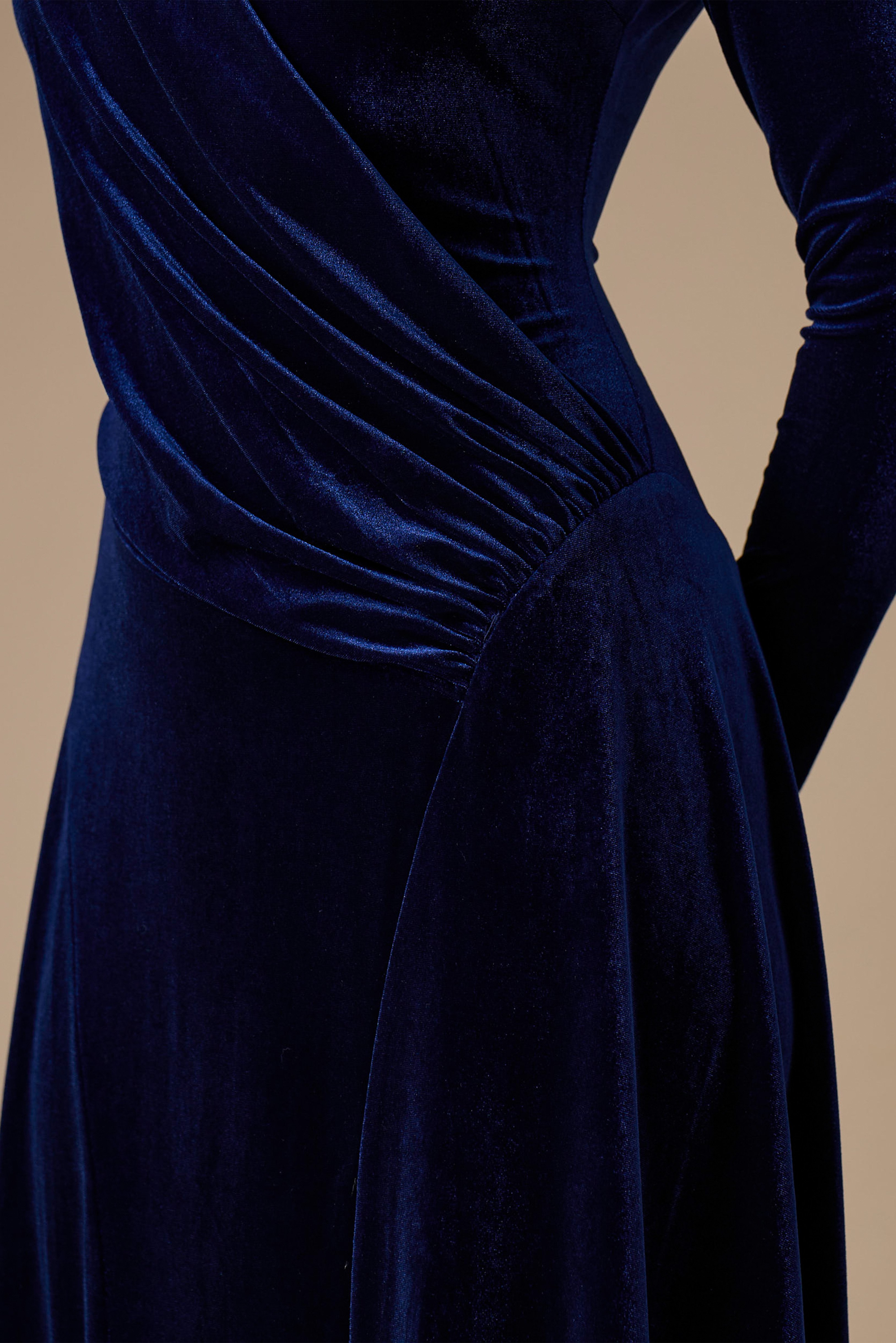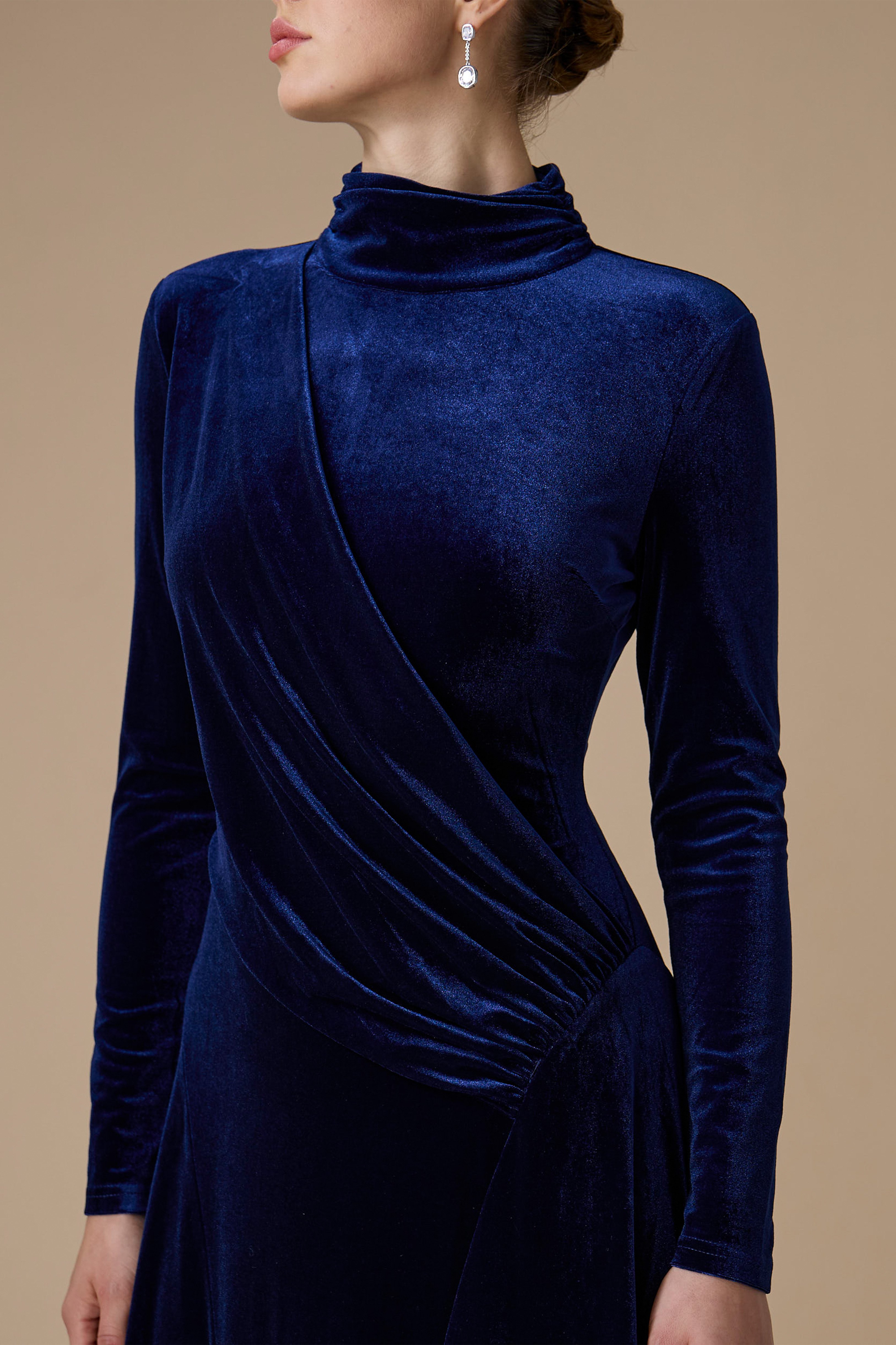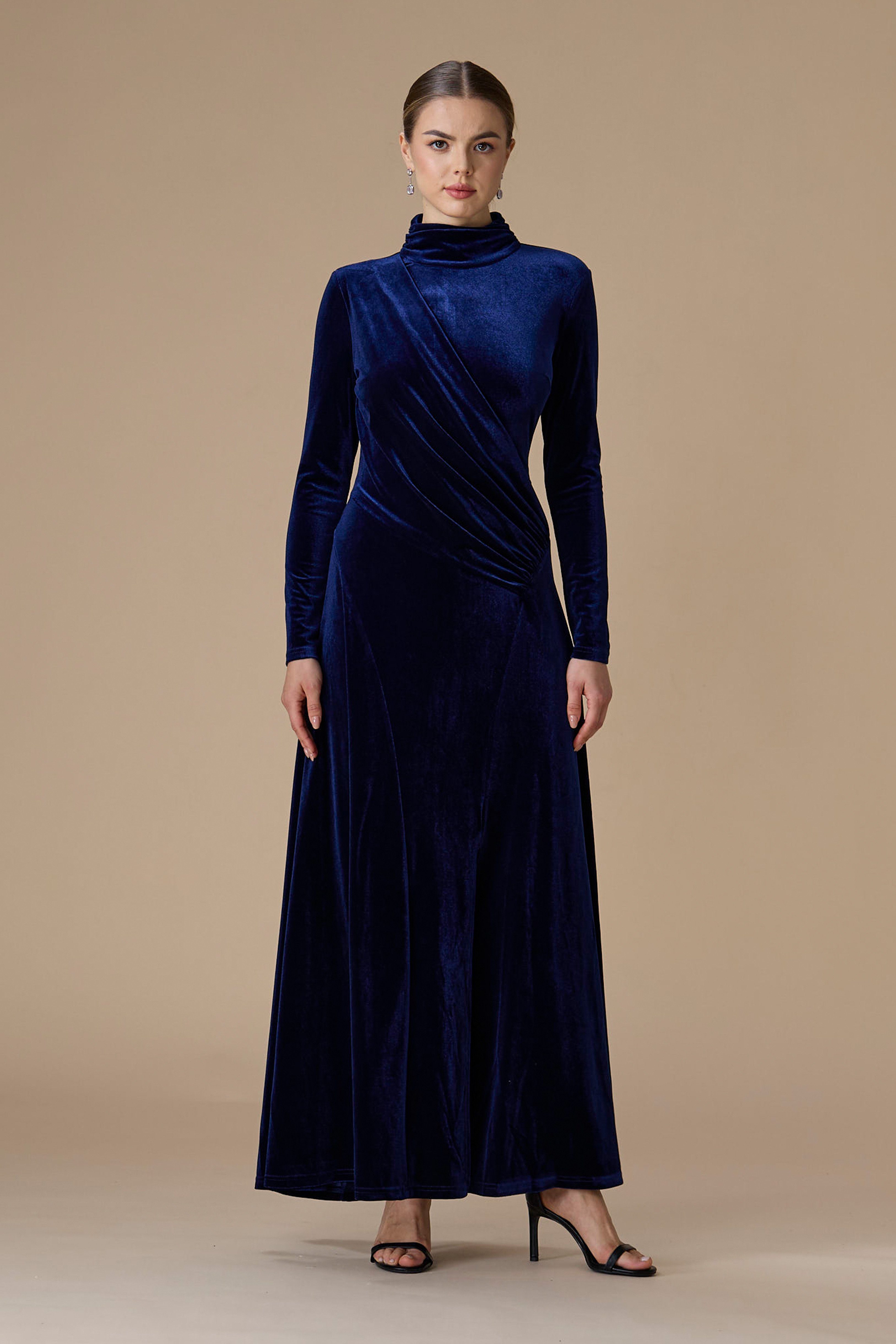 - نوع القصة: فستان كحلي مخمل درابيه طويل بياقة عالية وأكمام طويلة وضيقة