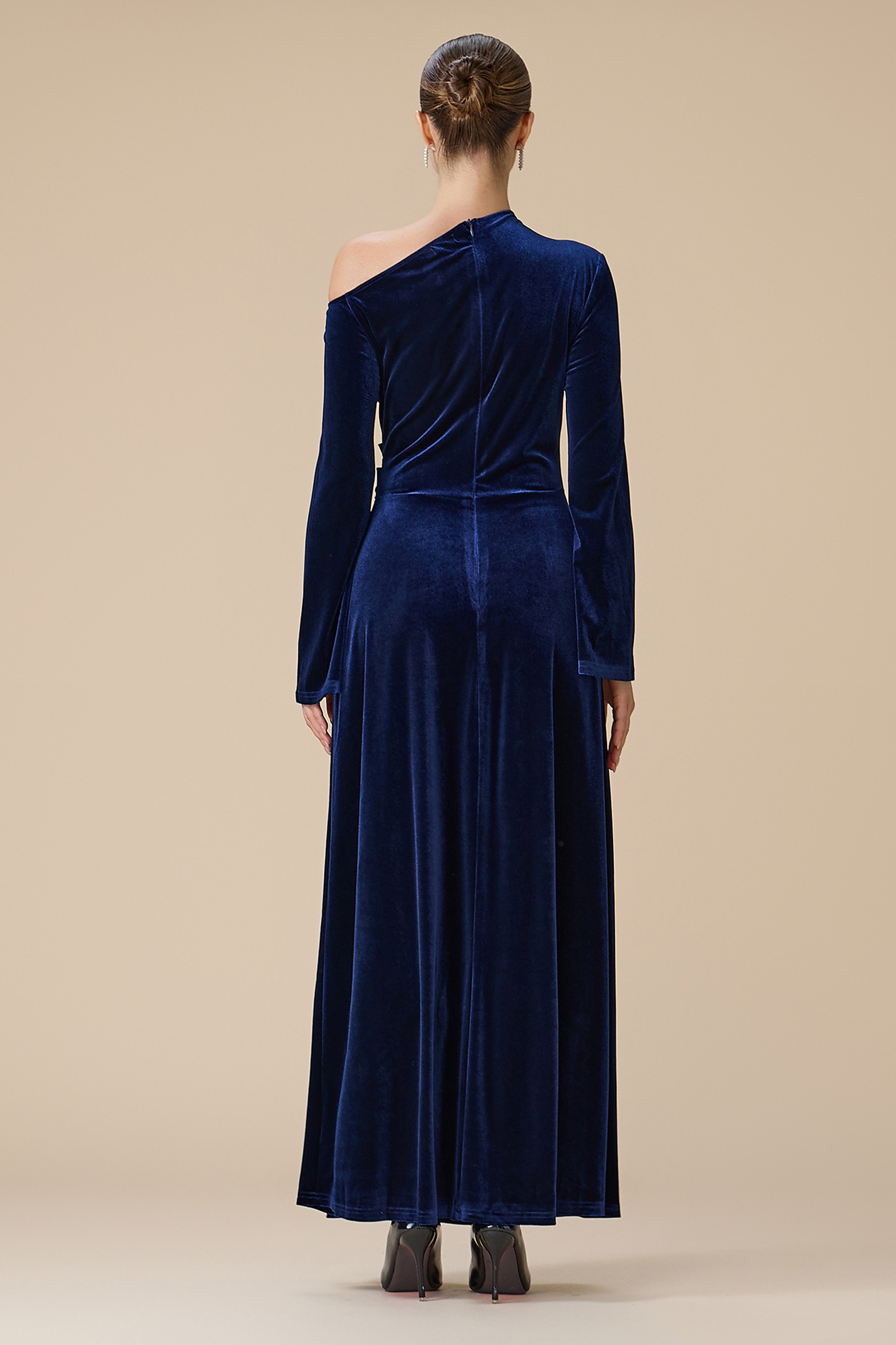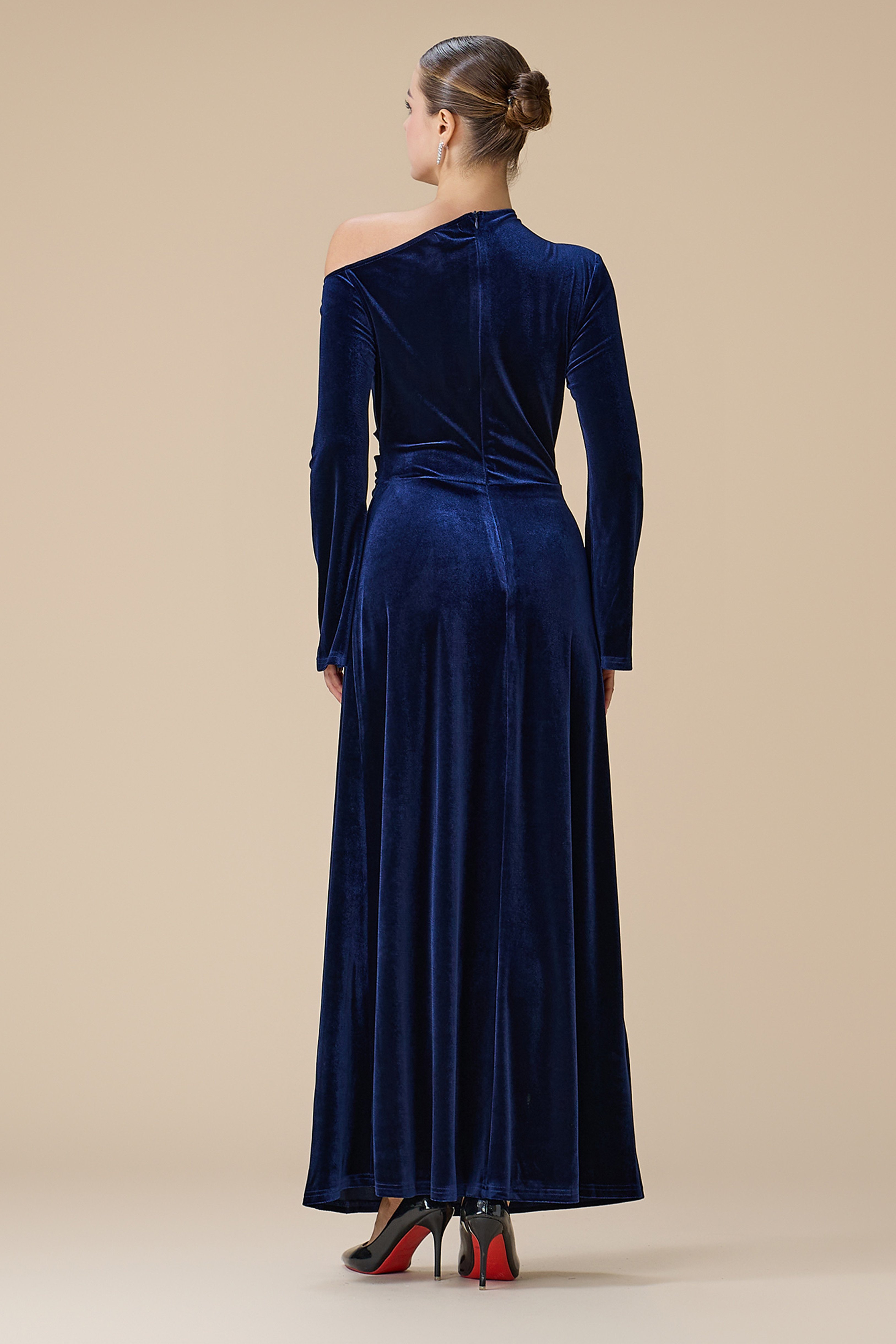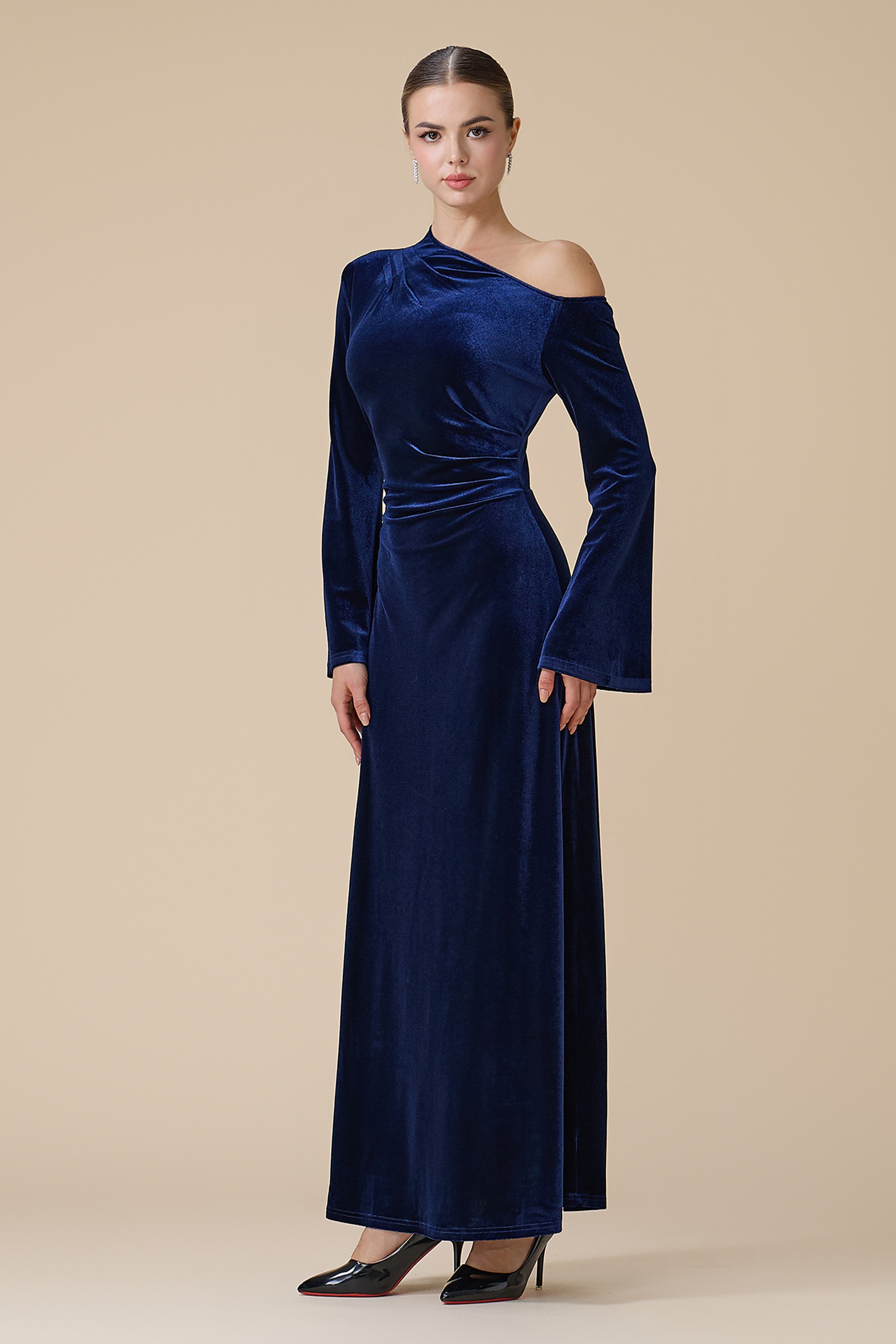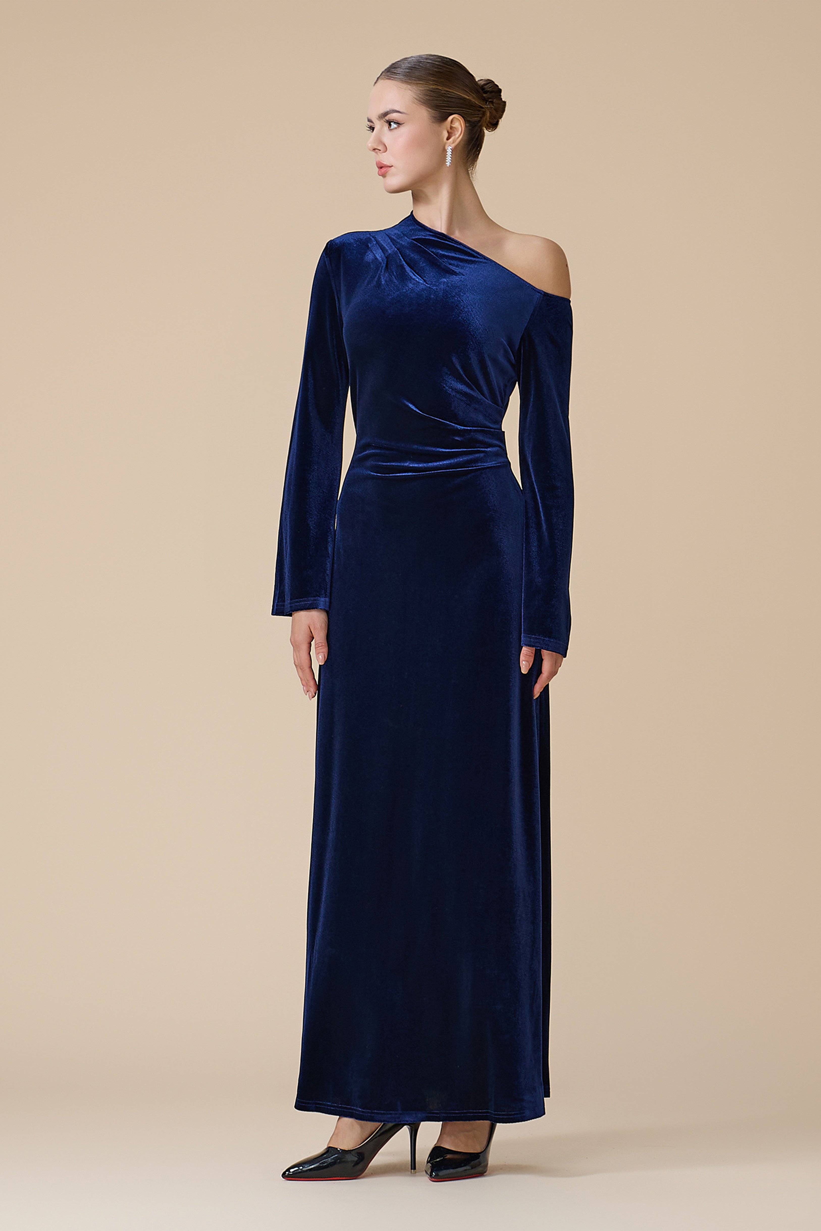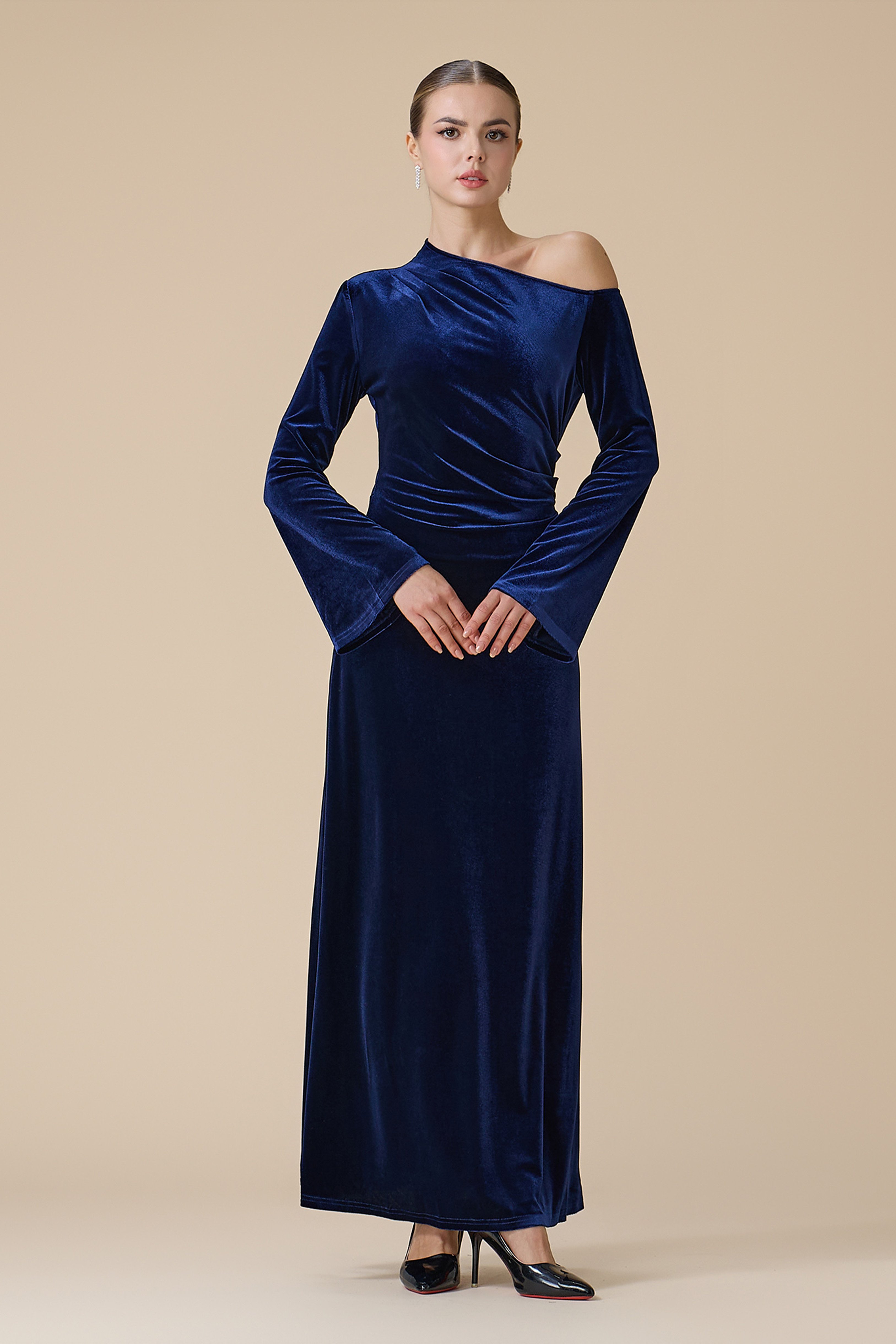 استمتعي بإطلالة أنيقة وفاخرة مع هذا الفستان الكحلي المخمل الطويل المصمم بأسلوب أوف شولدر يمنحك مظهرًا أنثويًا راقيًا. يتميز الفستان بقصة مستقيمة تزيد من جمال القوام، بينما يضيف الدناتيل الدرابيه عند الخصر لمسة انسيابية تمنحك حضورًا لافتًا في السهرات والمناسبات الخاصة.