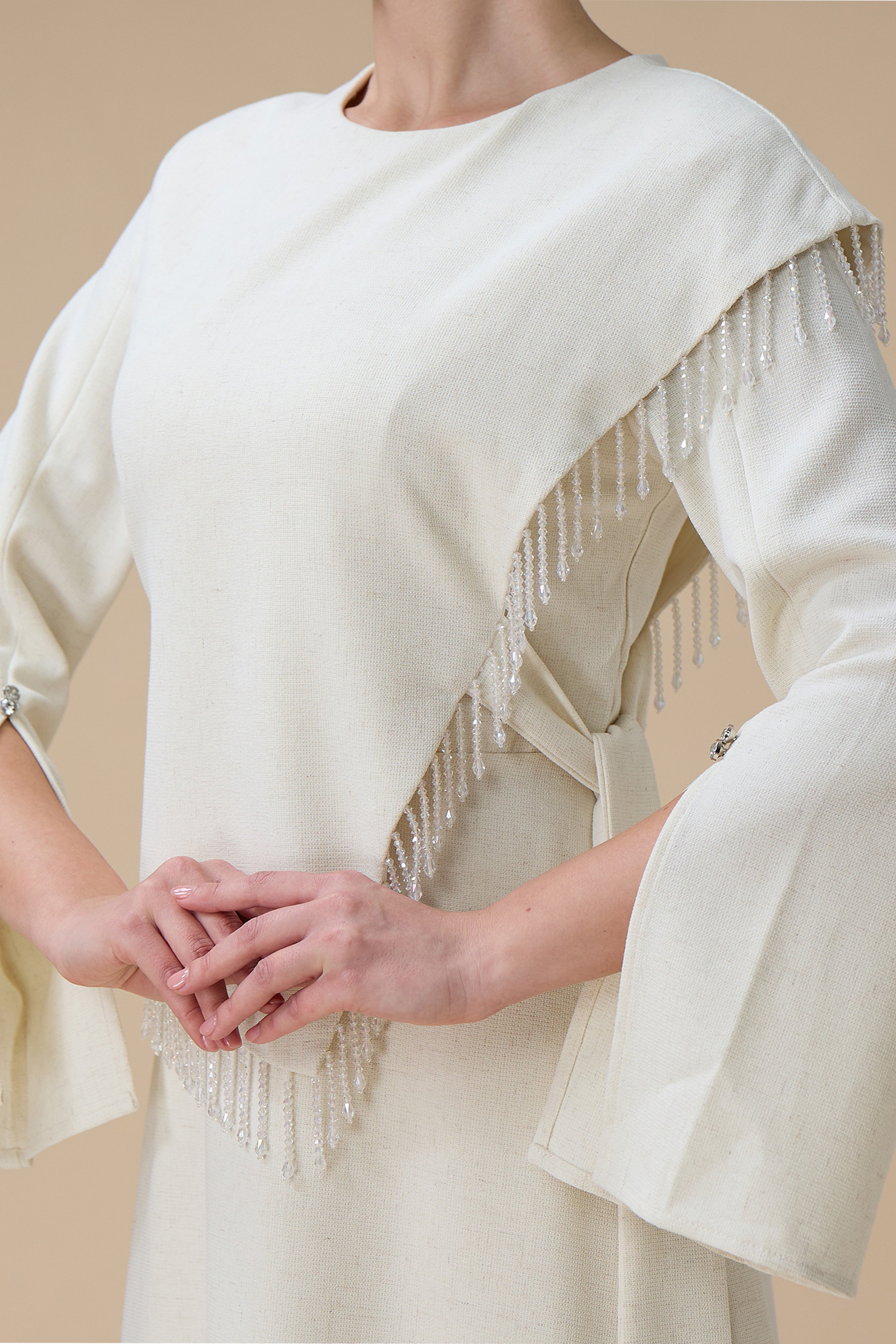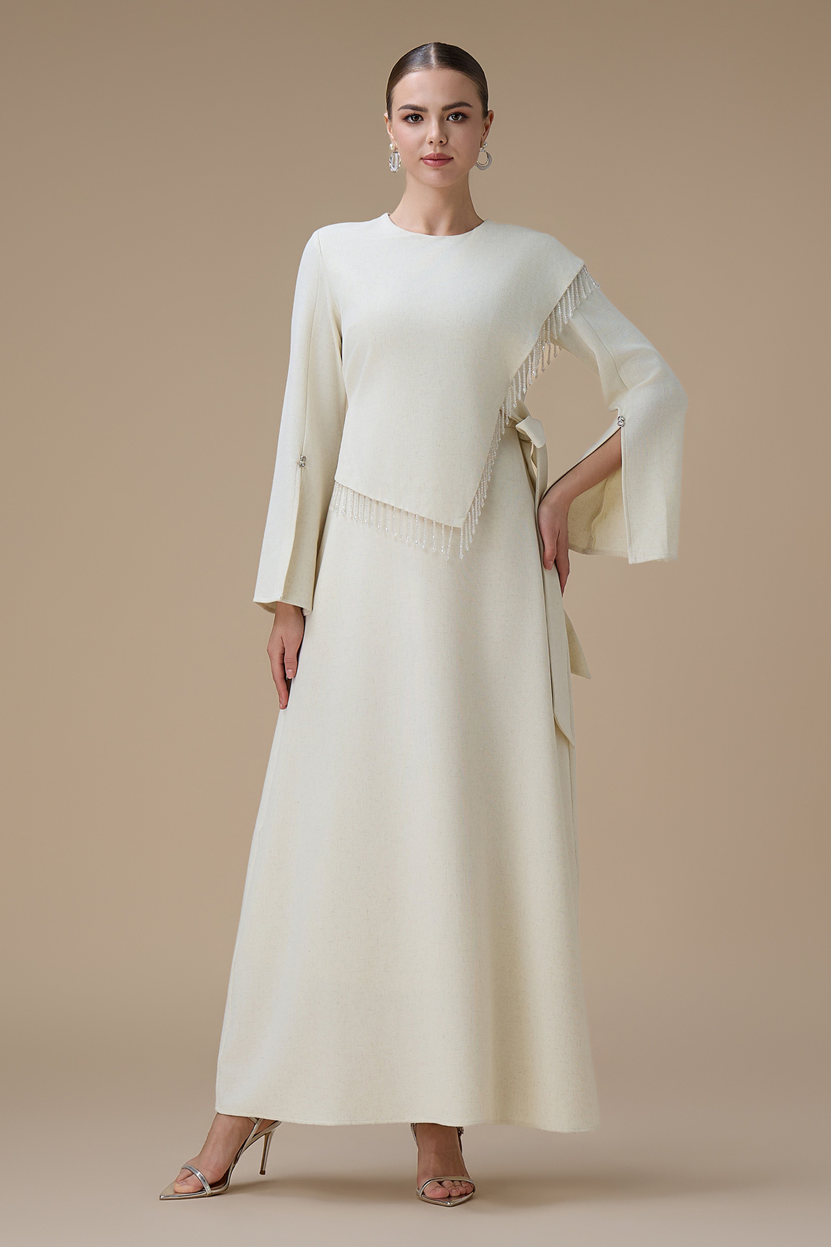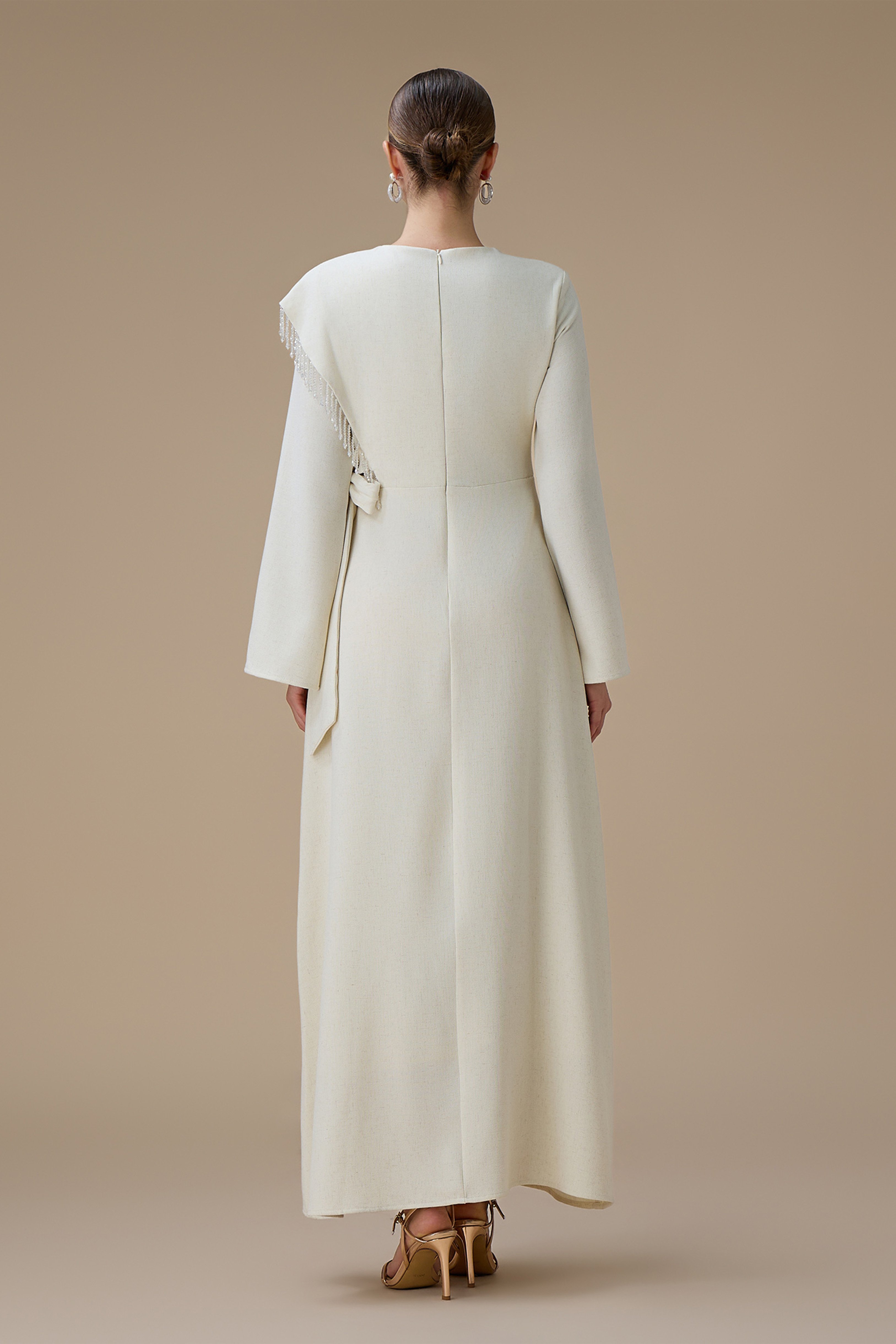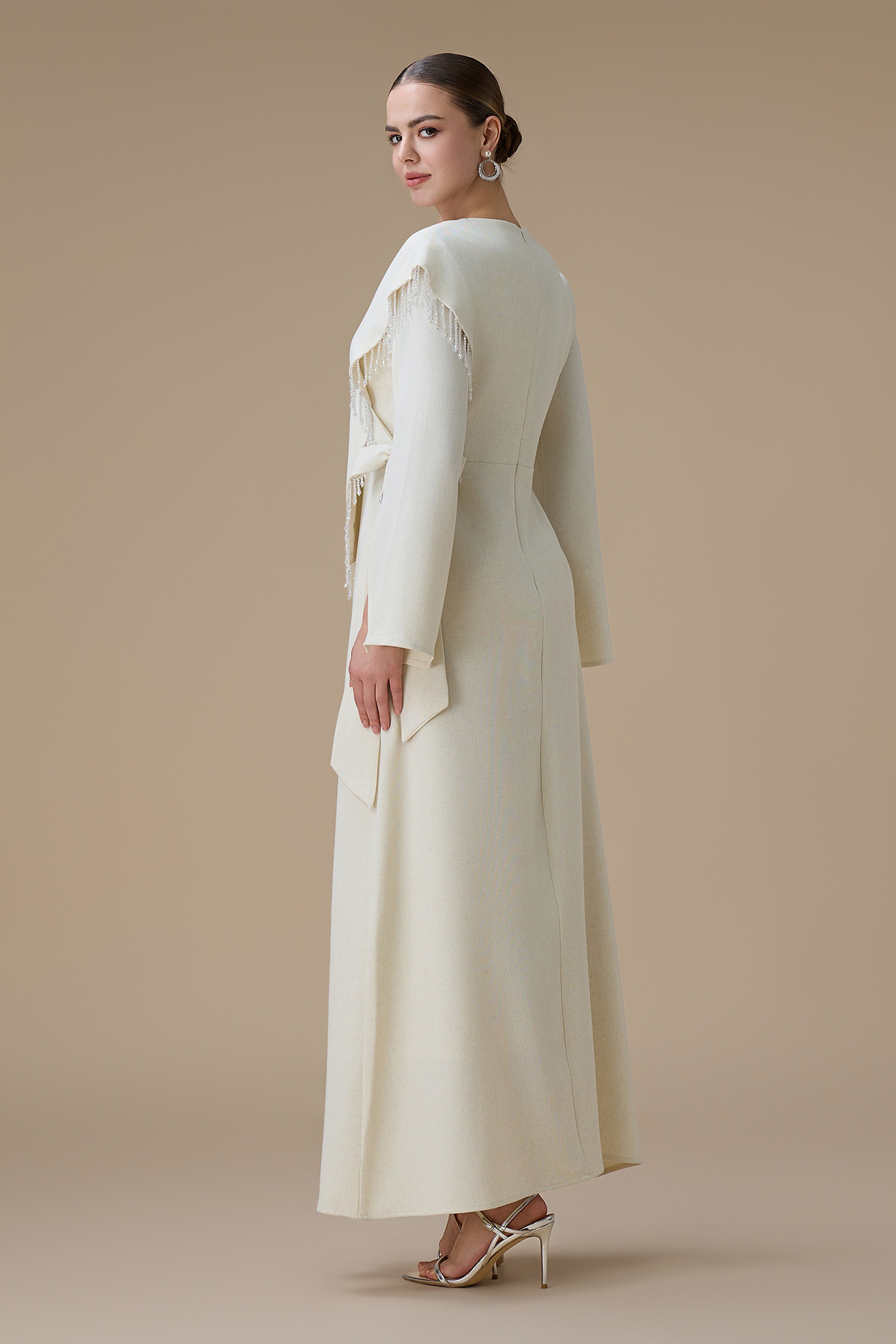 فستان بيج طويل برباط جانبي، بأكمام طويلة وياقة دائرية