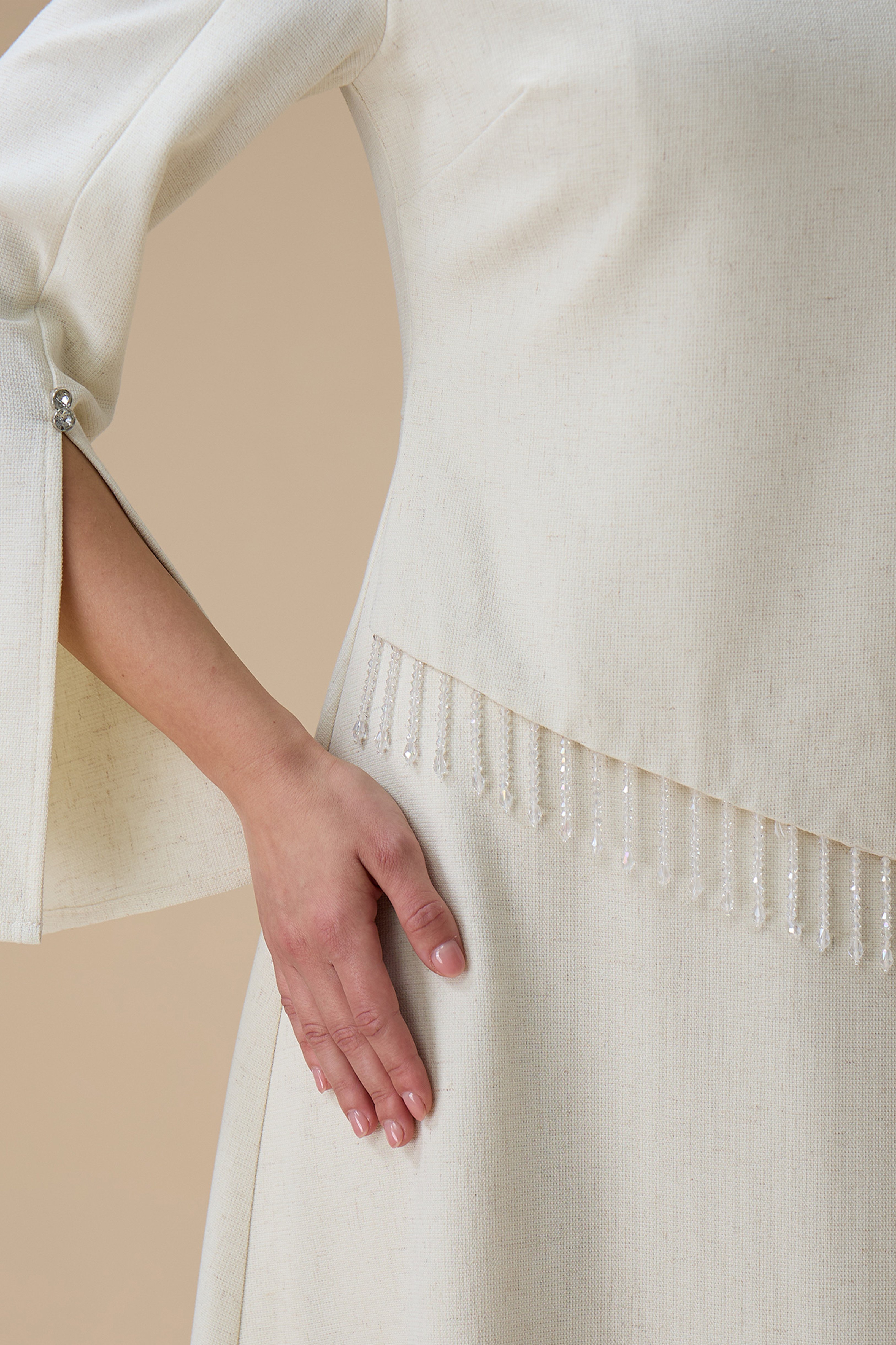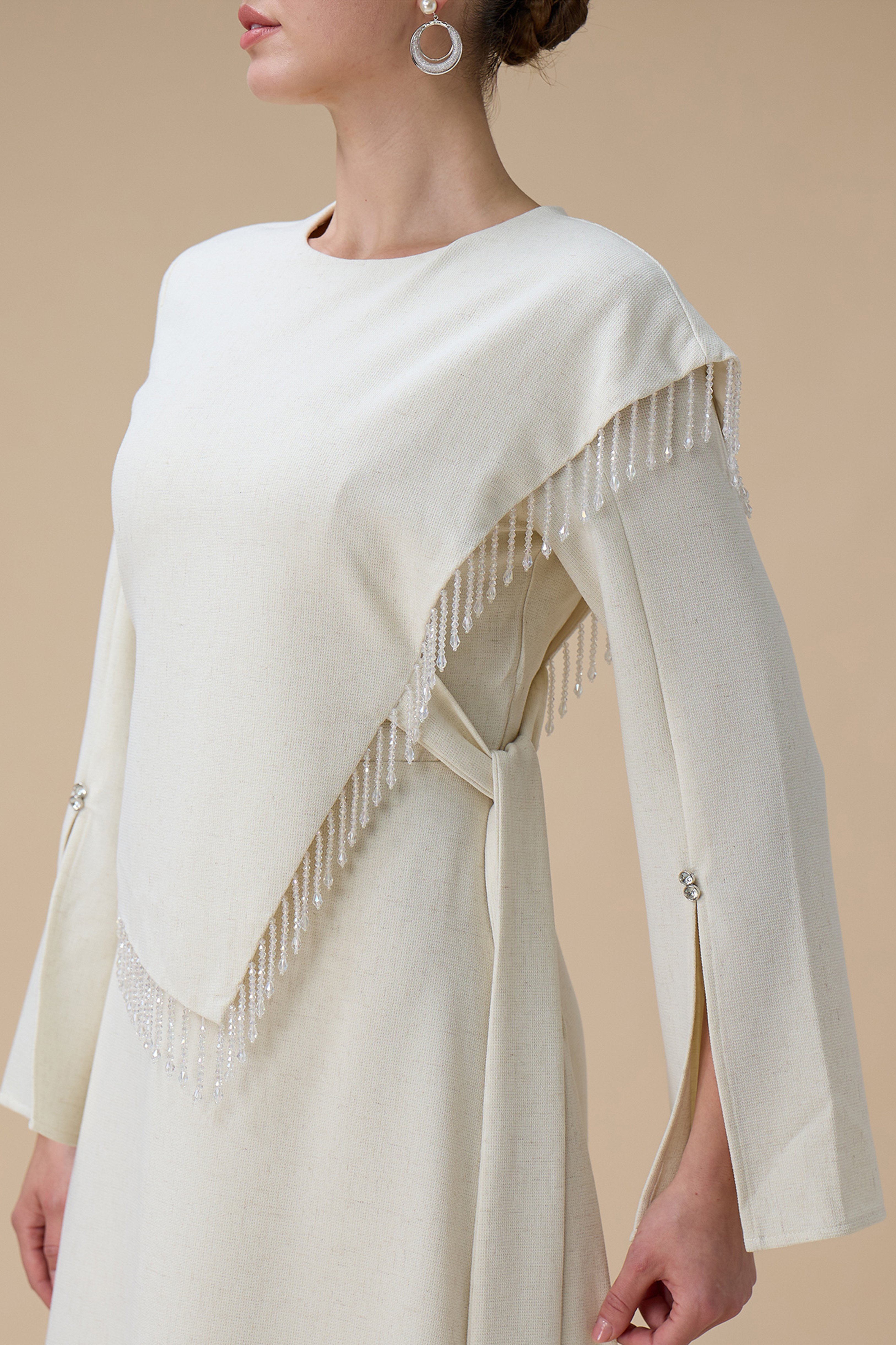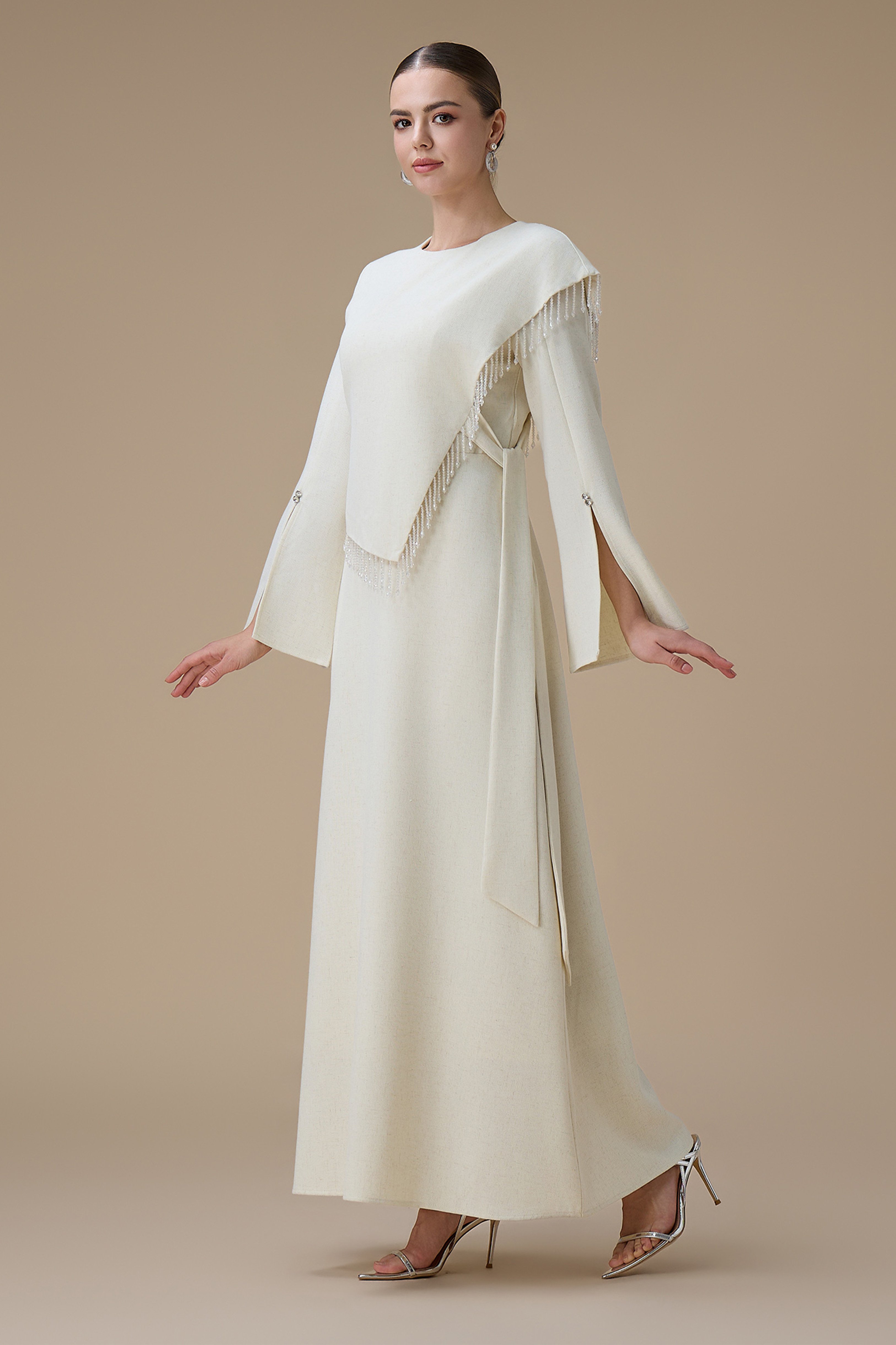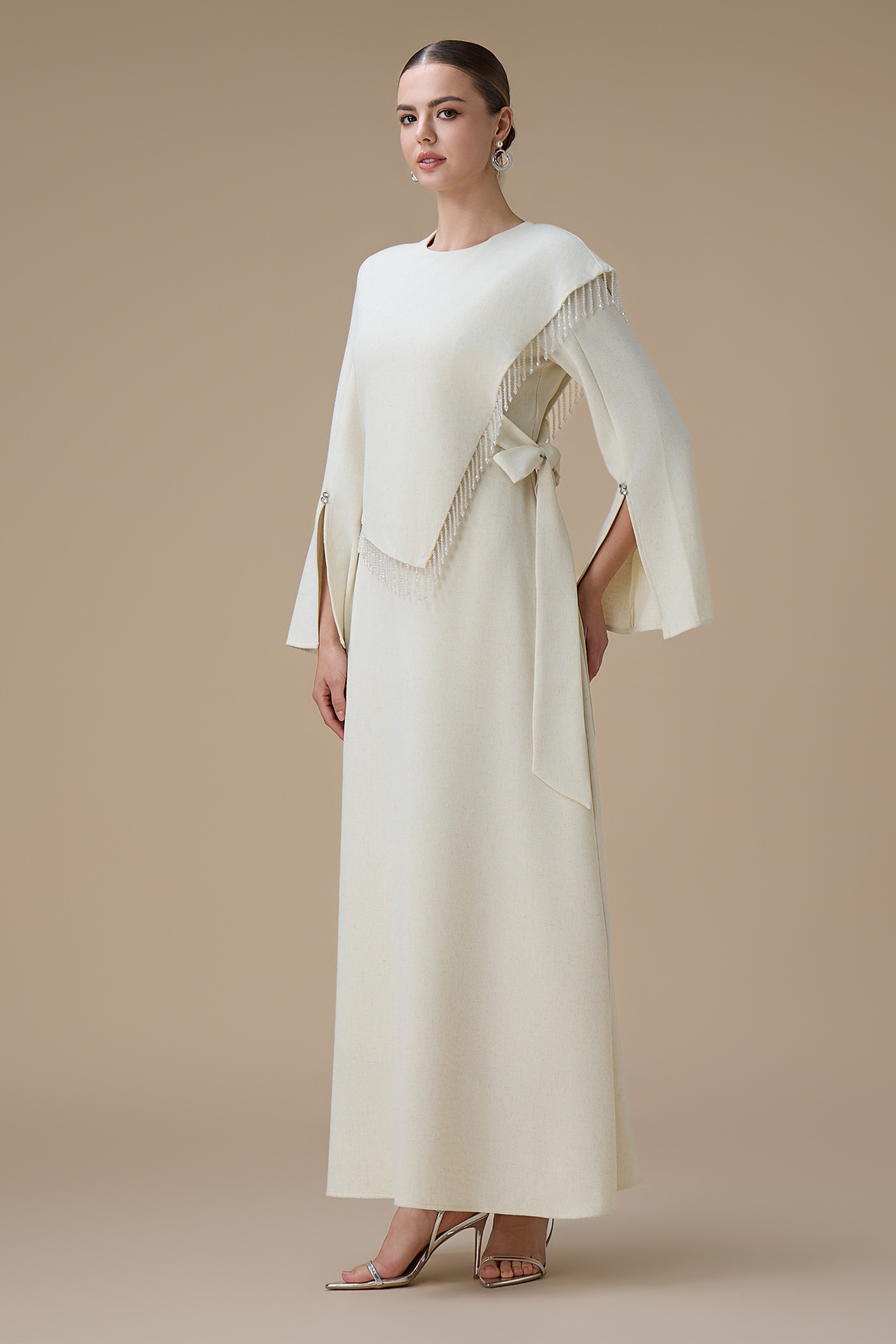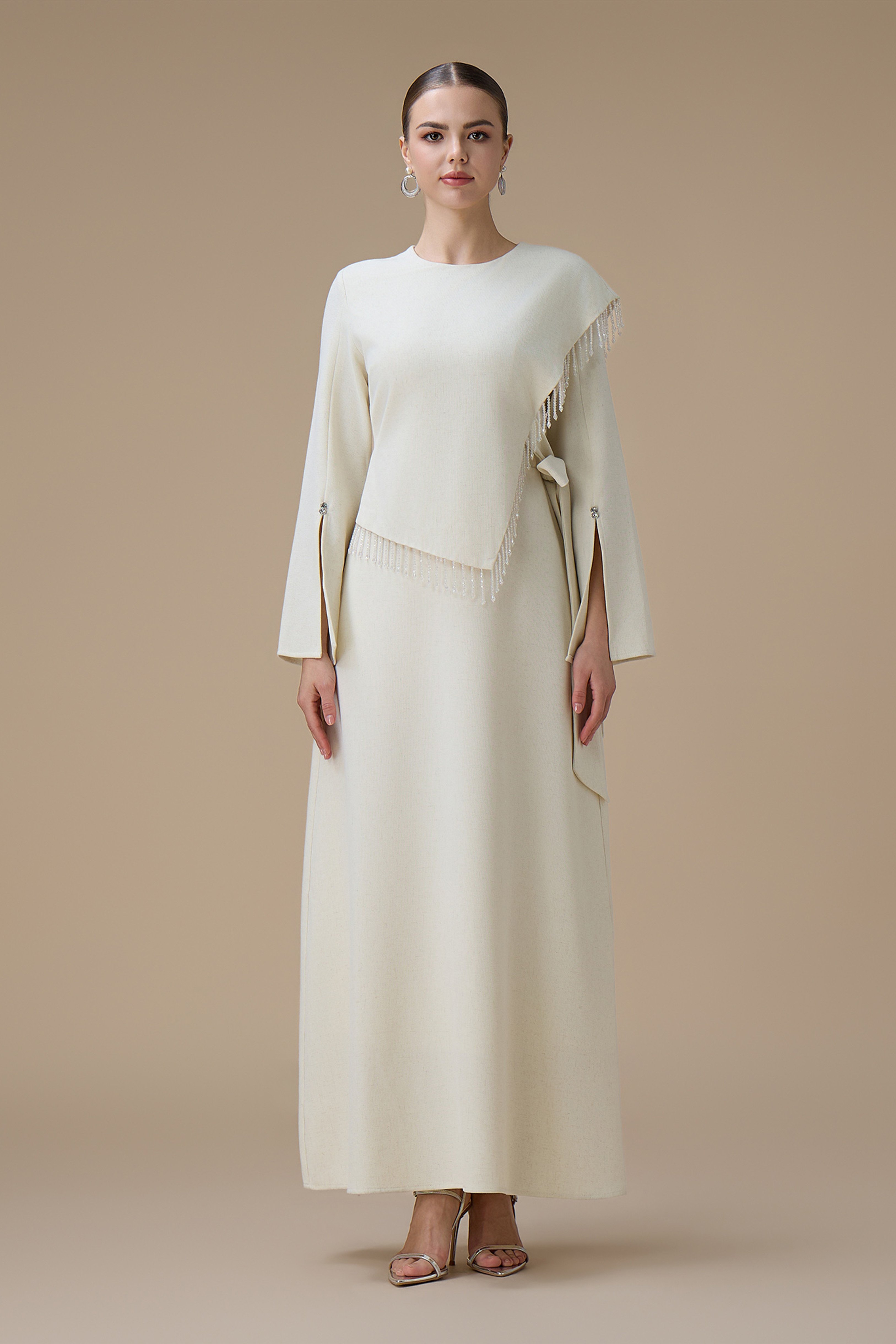 فستان بيج طويل برباط جانبي، بأكمام طويلة وياقة دائرية