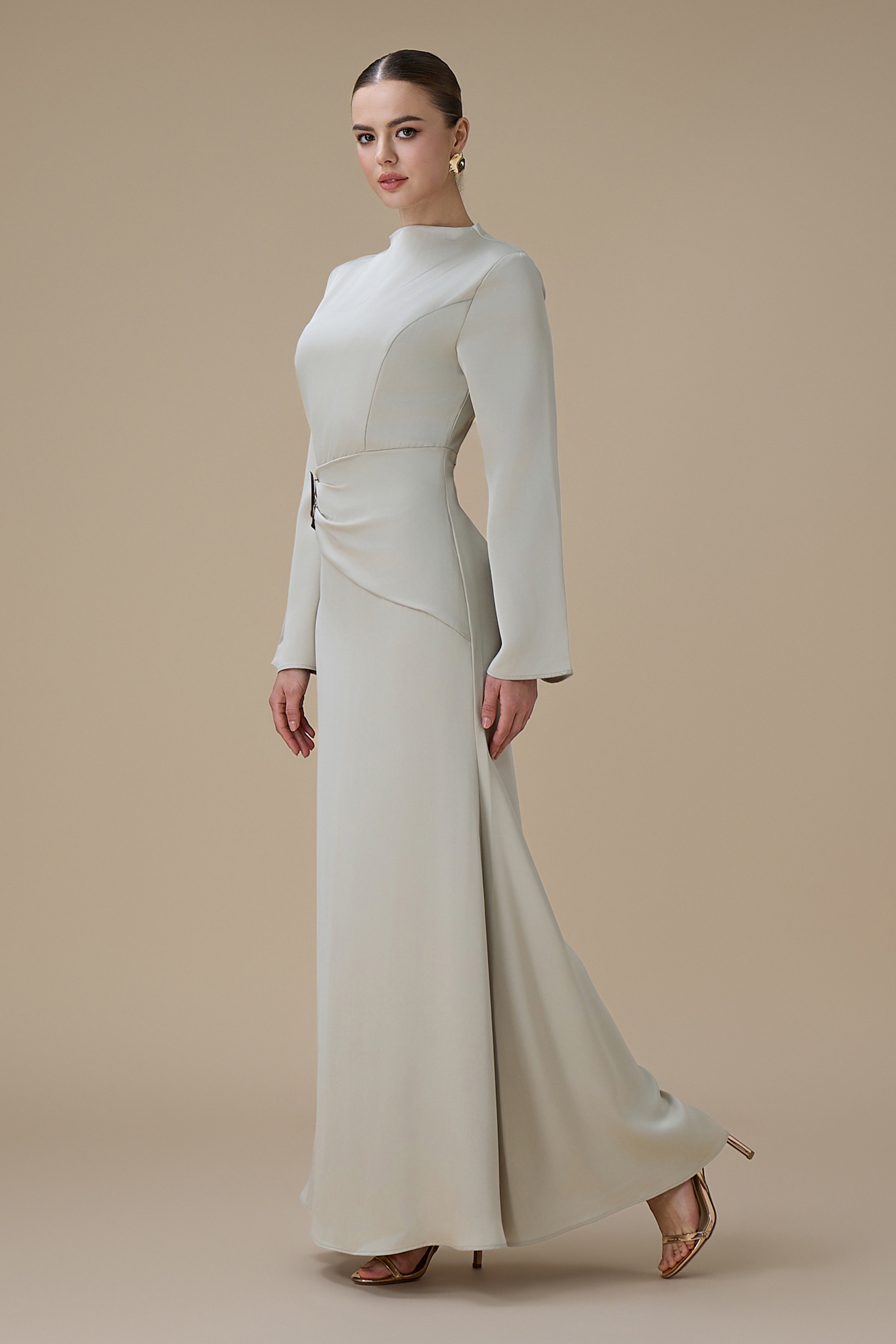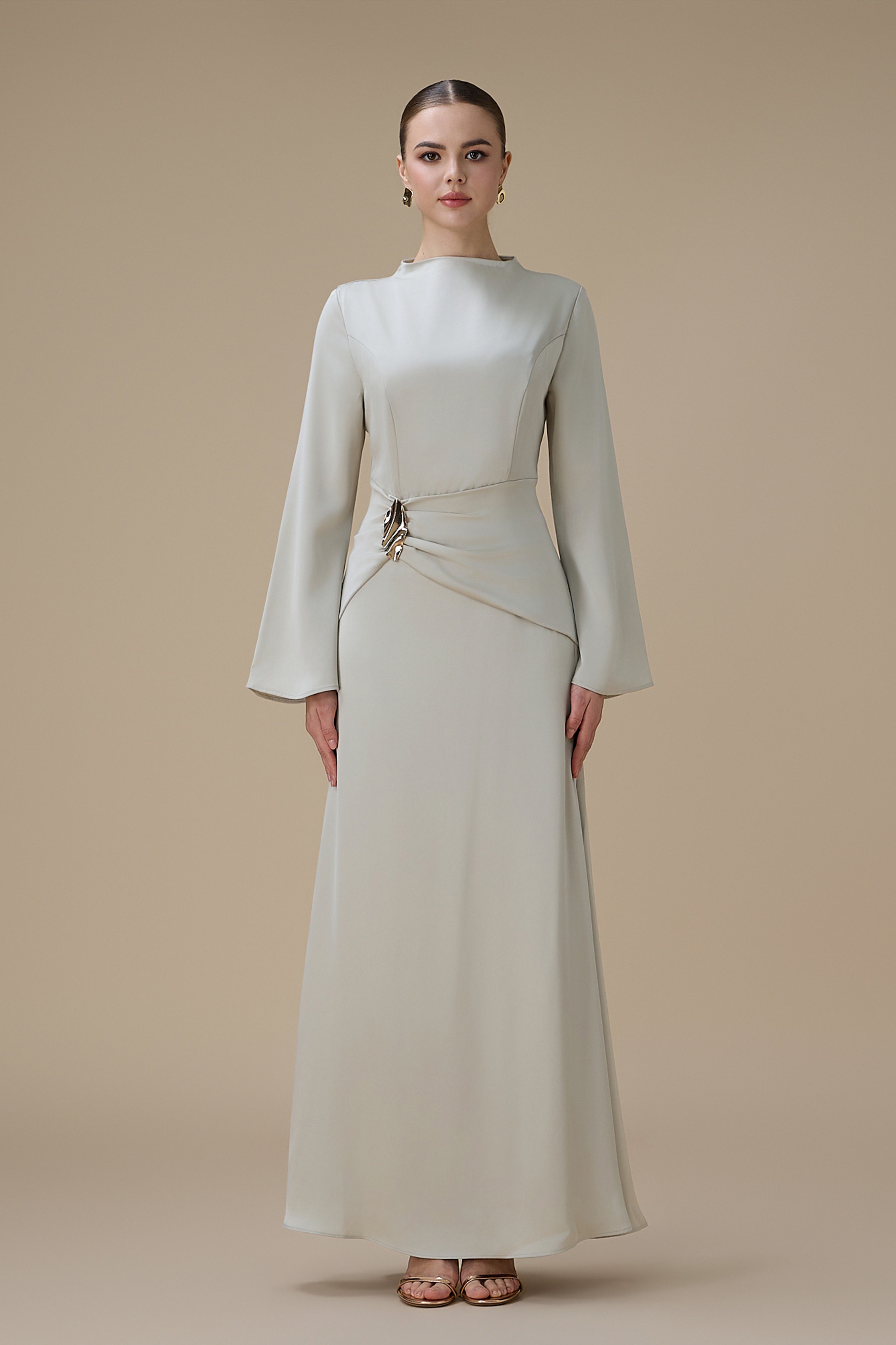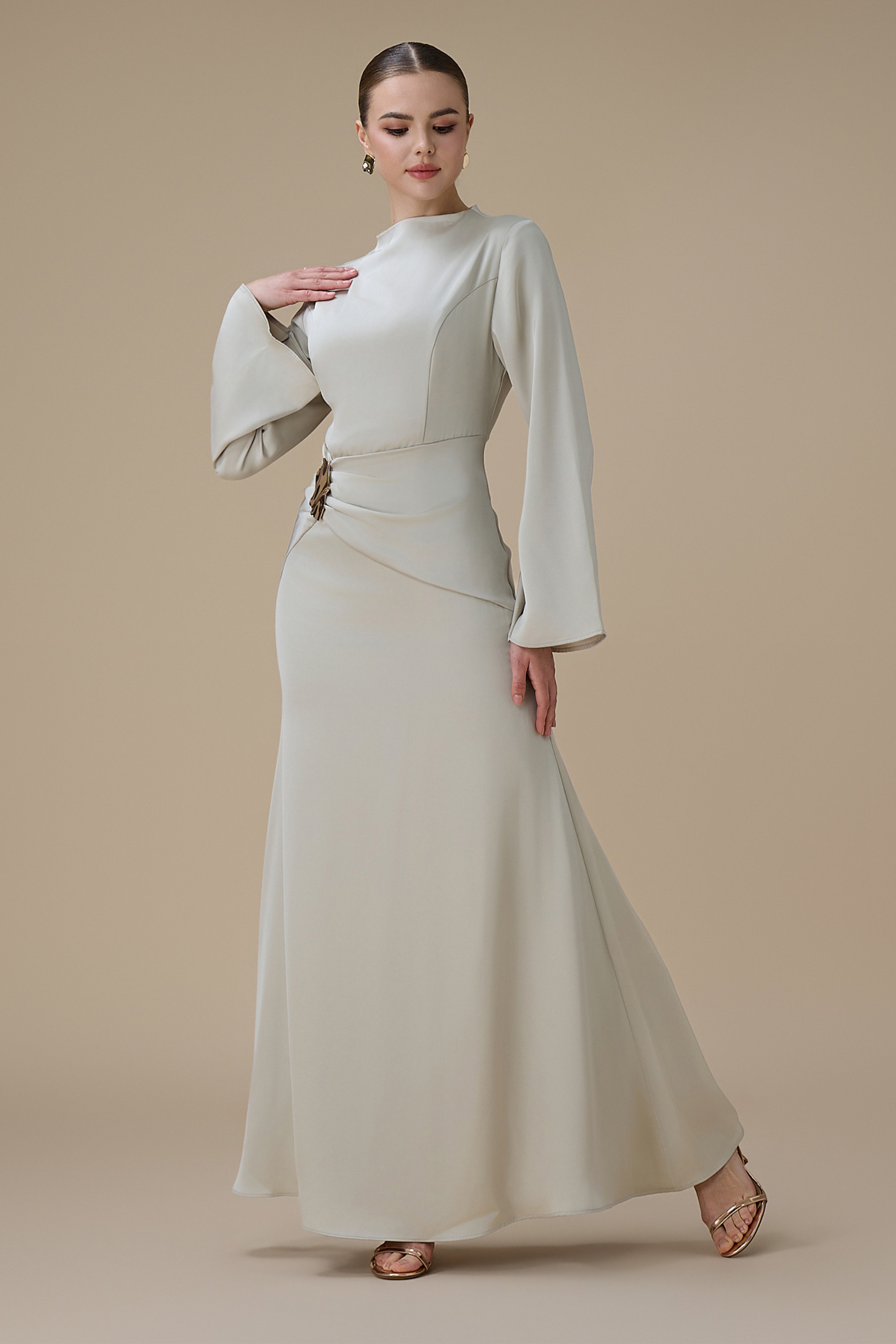 نوع القصة: فستان بيج طويل بتصميم انيق مع تفصيل معدني ناعم عند الخصر بأكمام طويلة