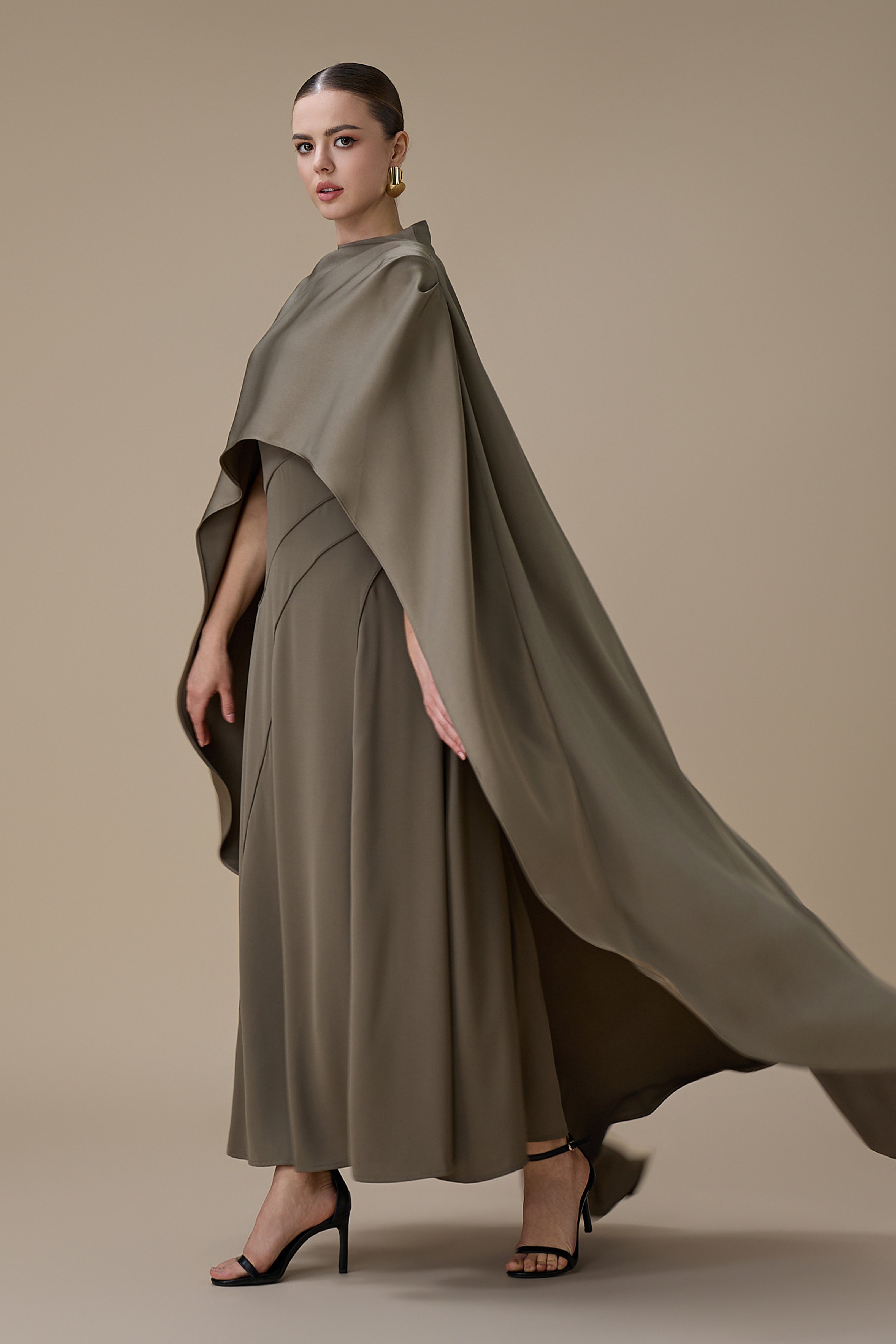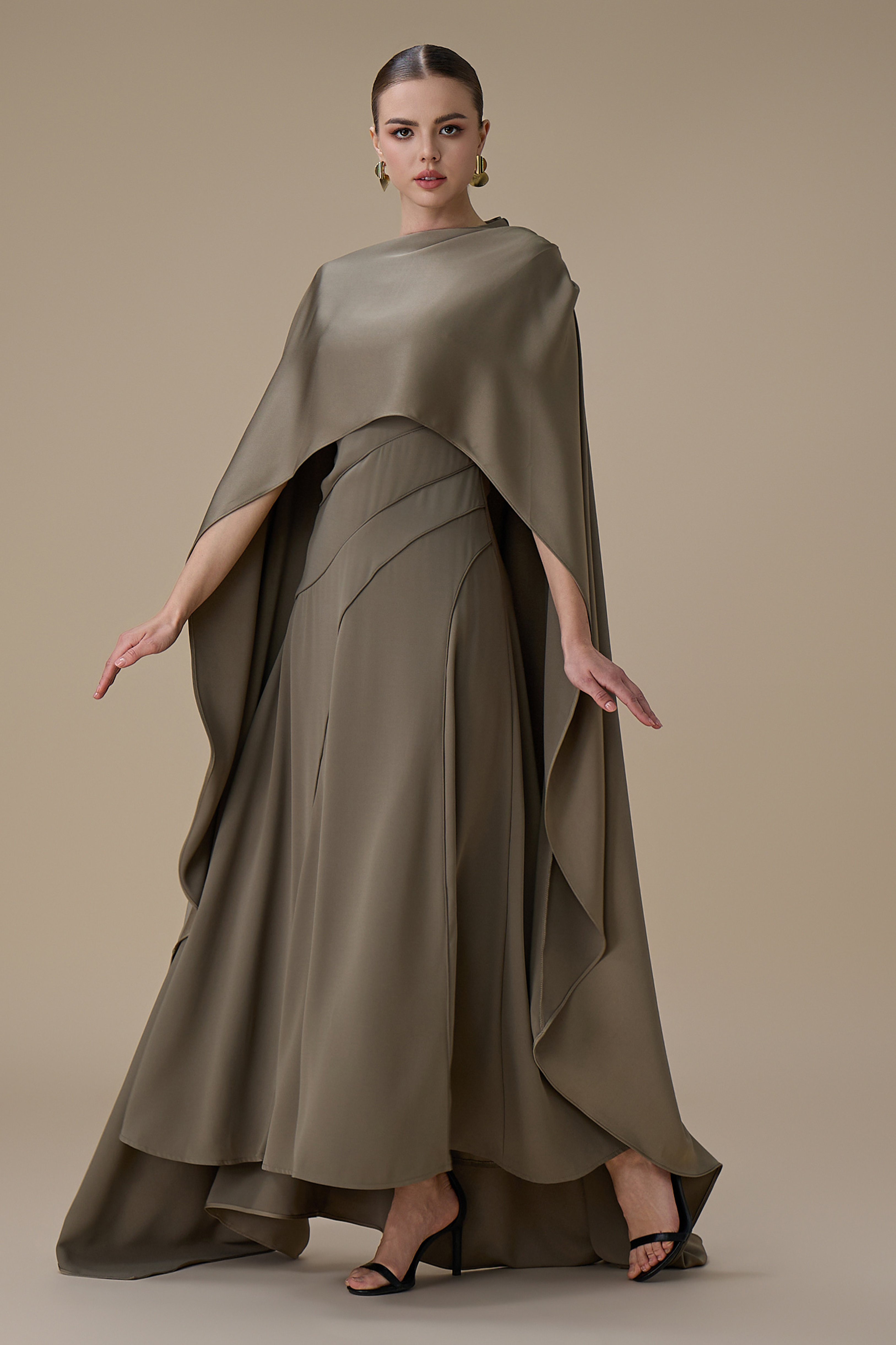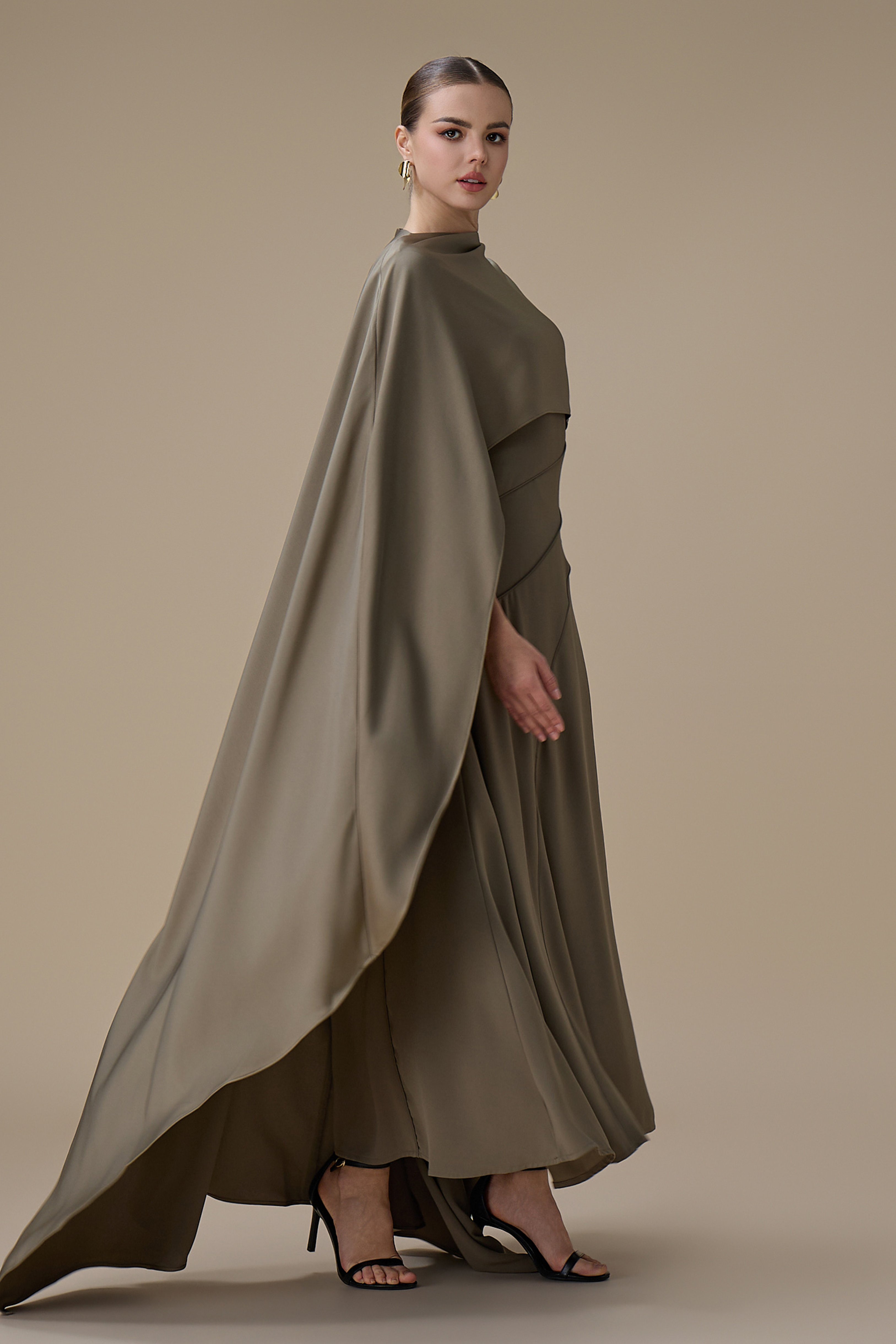 • نوع القصة: فستان ميدي من قطعتين زيتي بتصميم كاب بدون اكمام بياقة دائرية