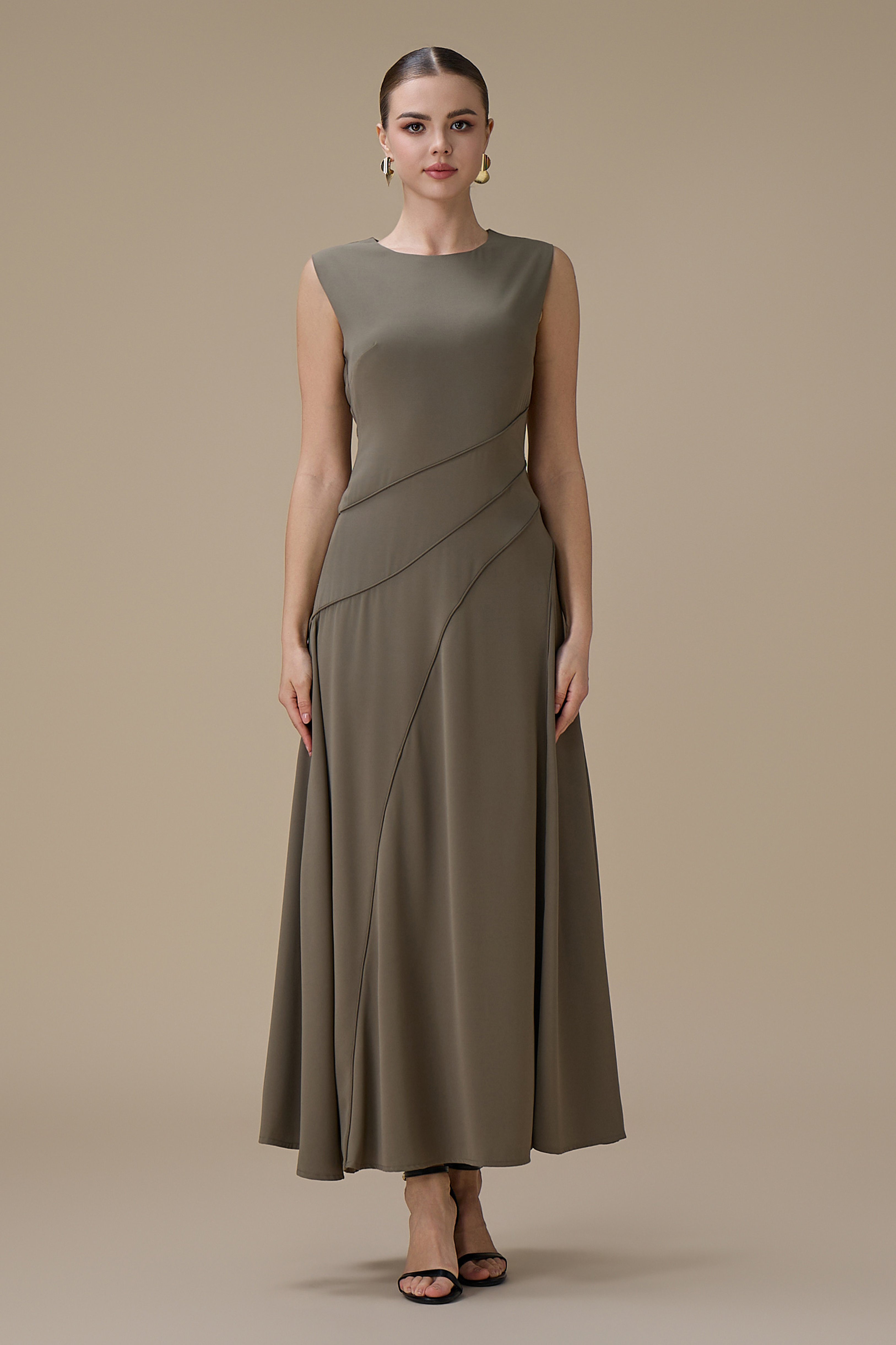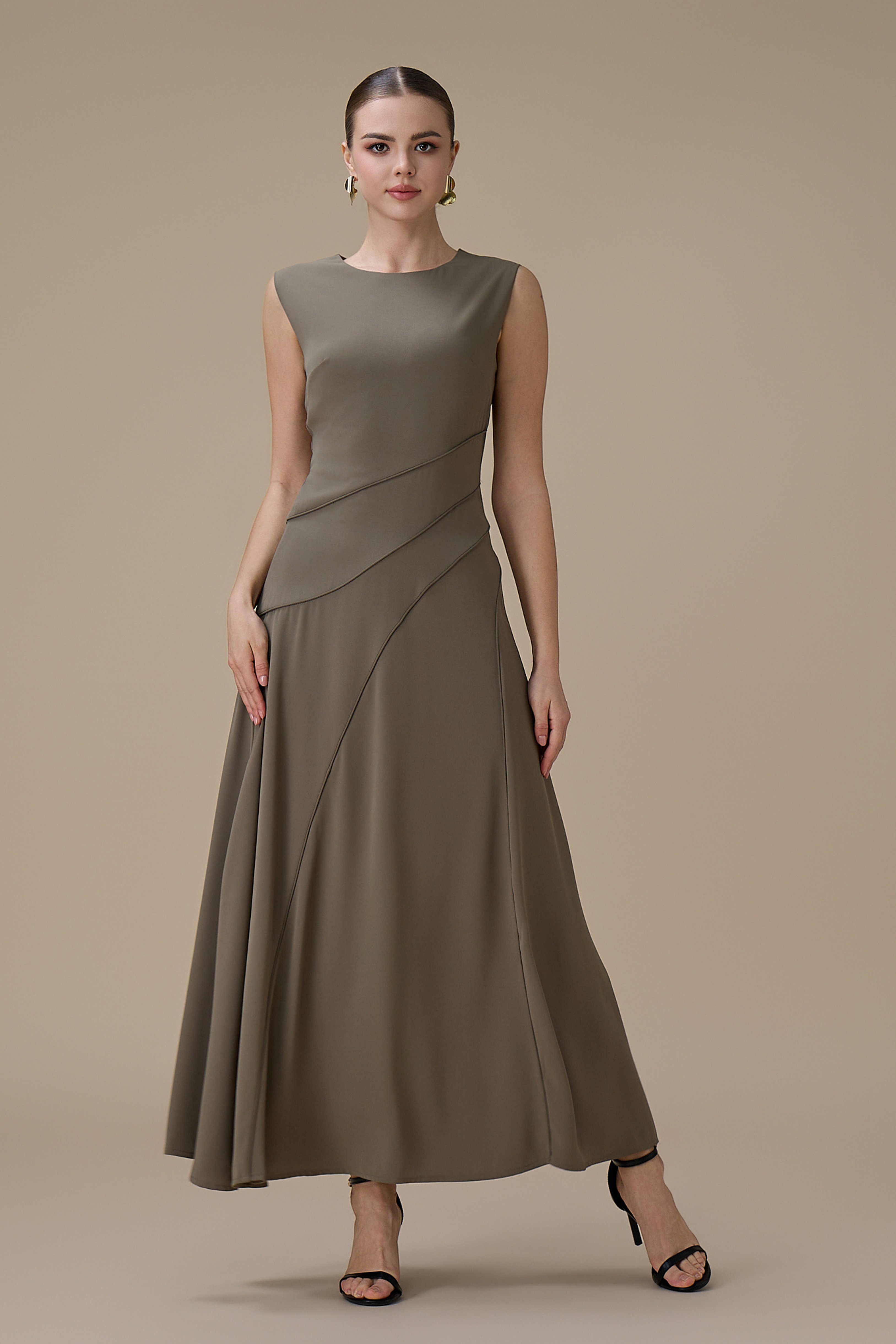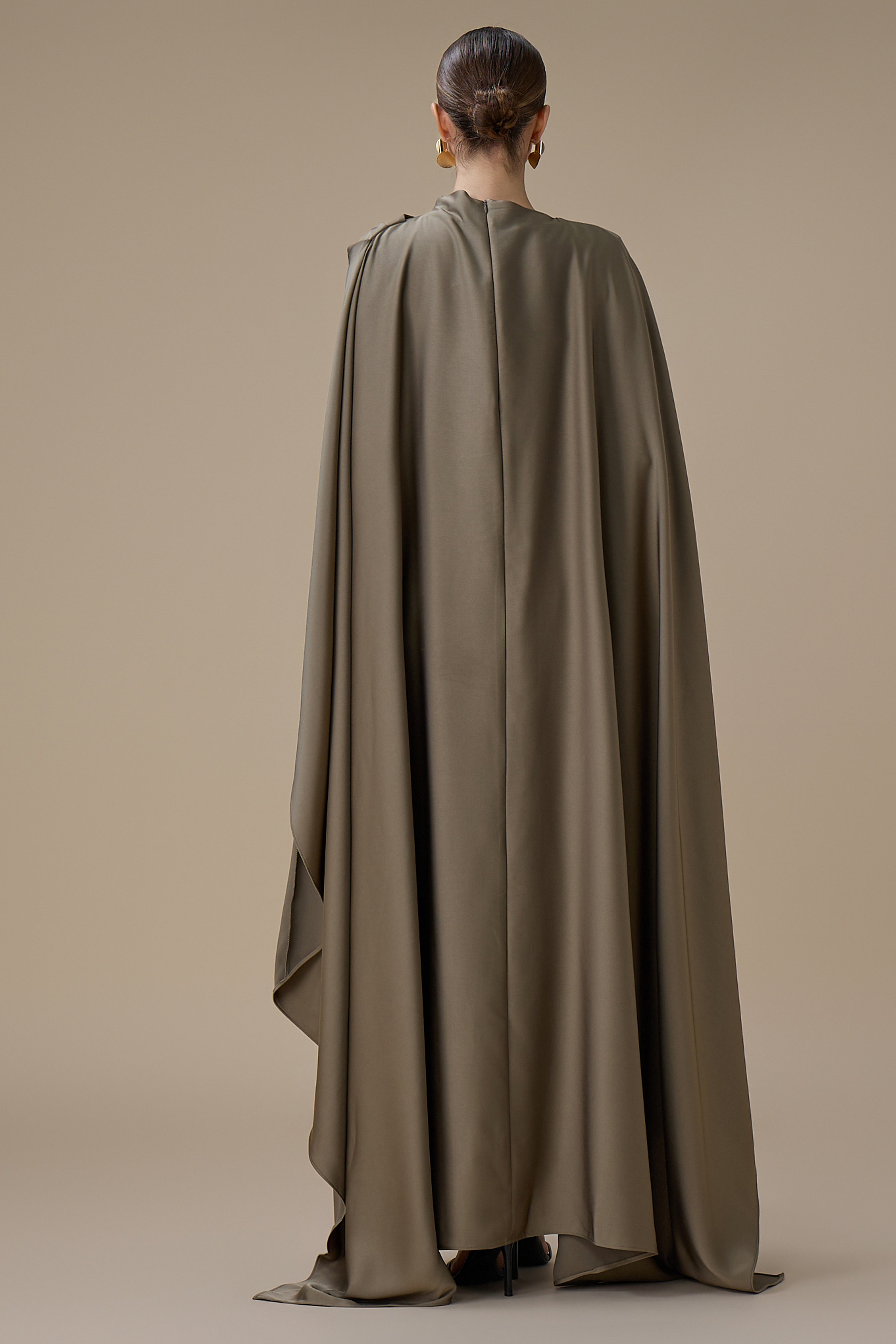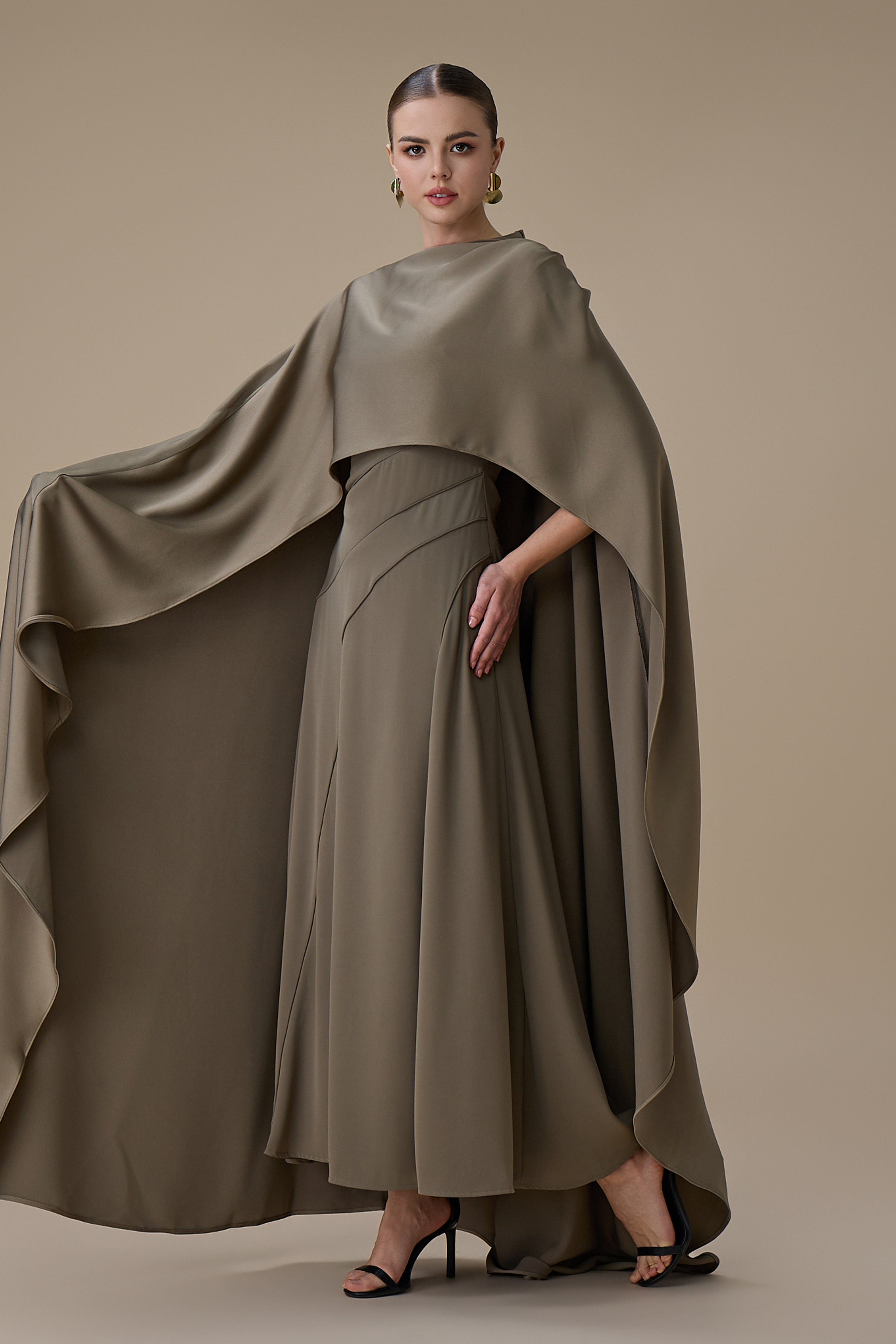 • نوع القصة: فستان ميدي من قطعتين زيتي بتصميم كاب بدون اكمام بياقة دائرية