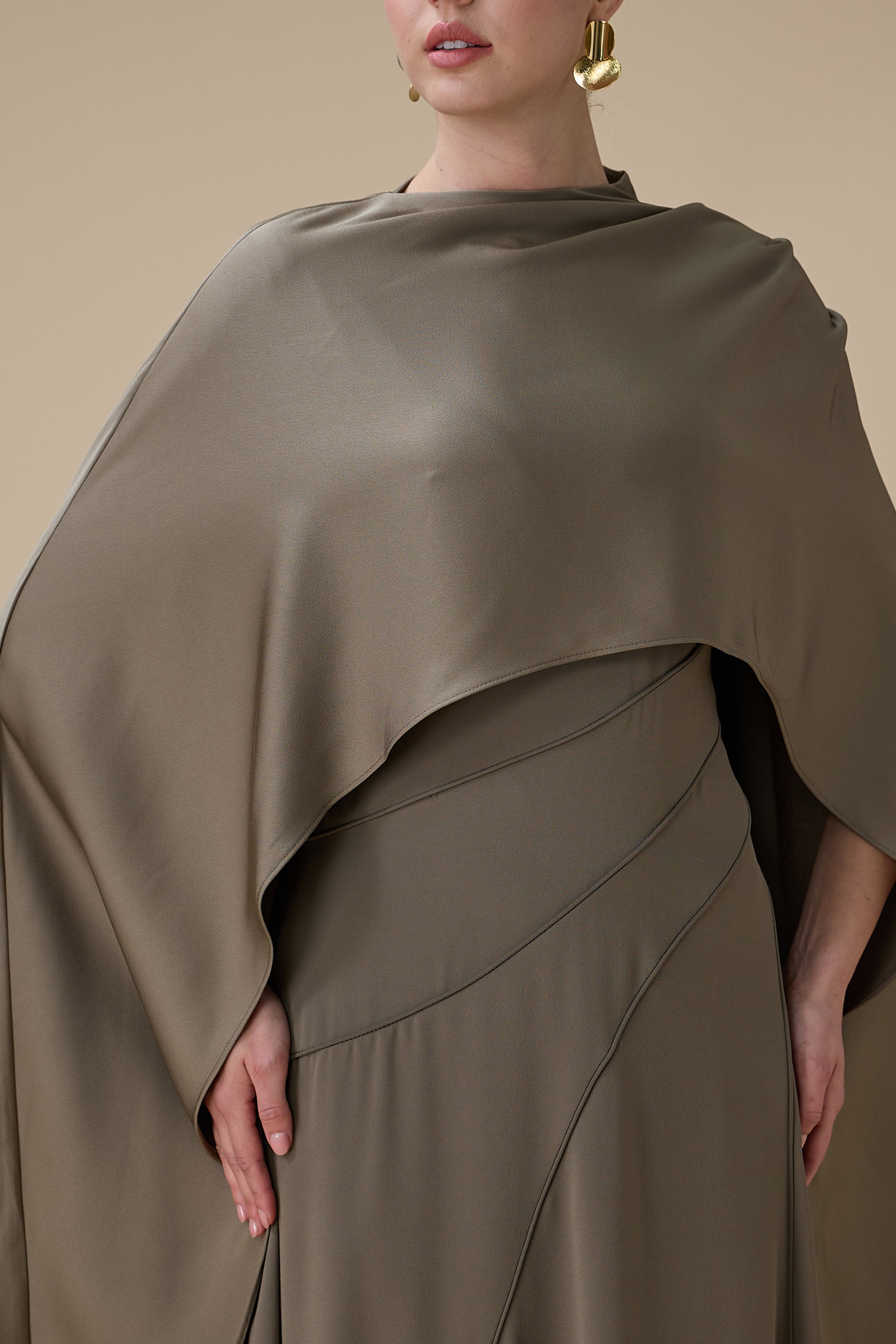 • نوع التصميم: فستان ميدي من قطعتين زيتي بتصميم كاب