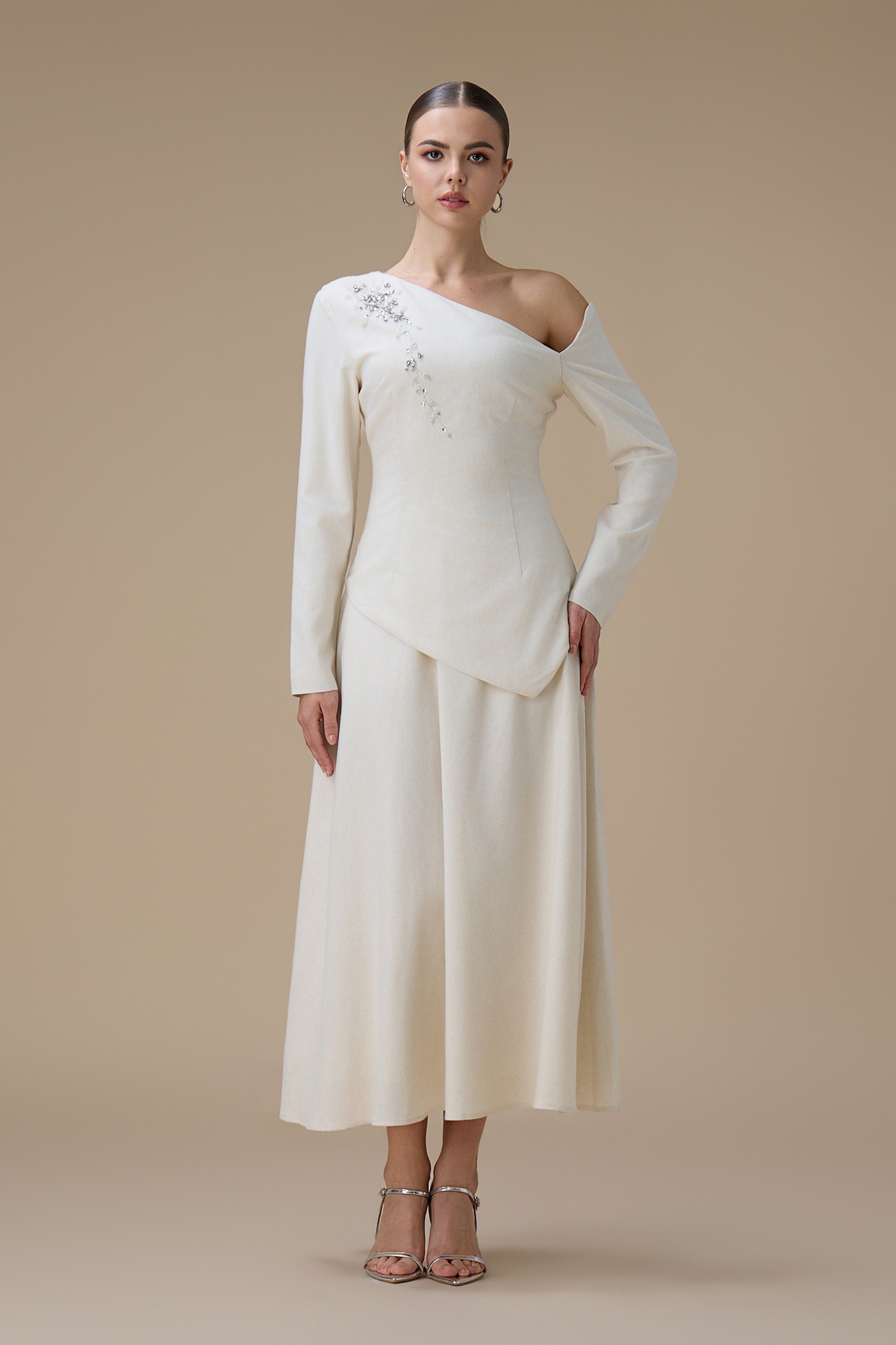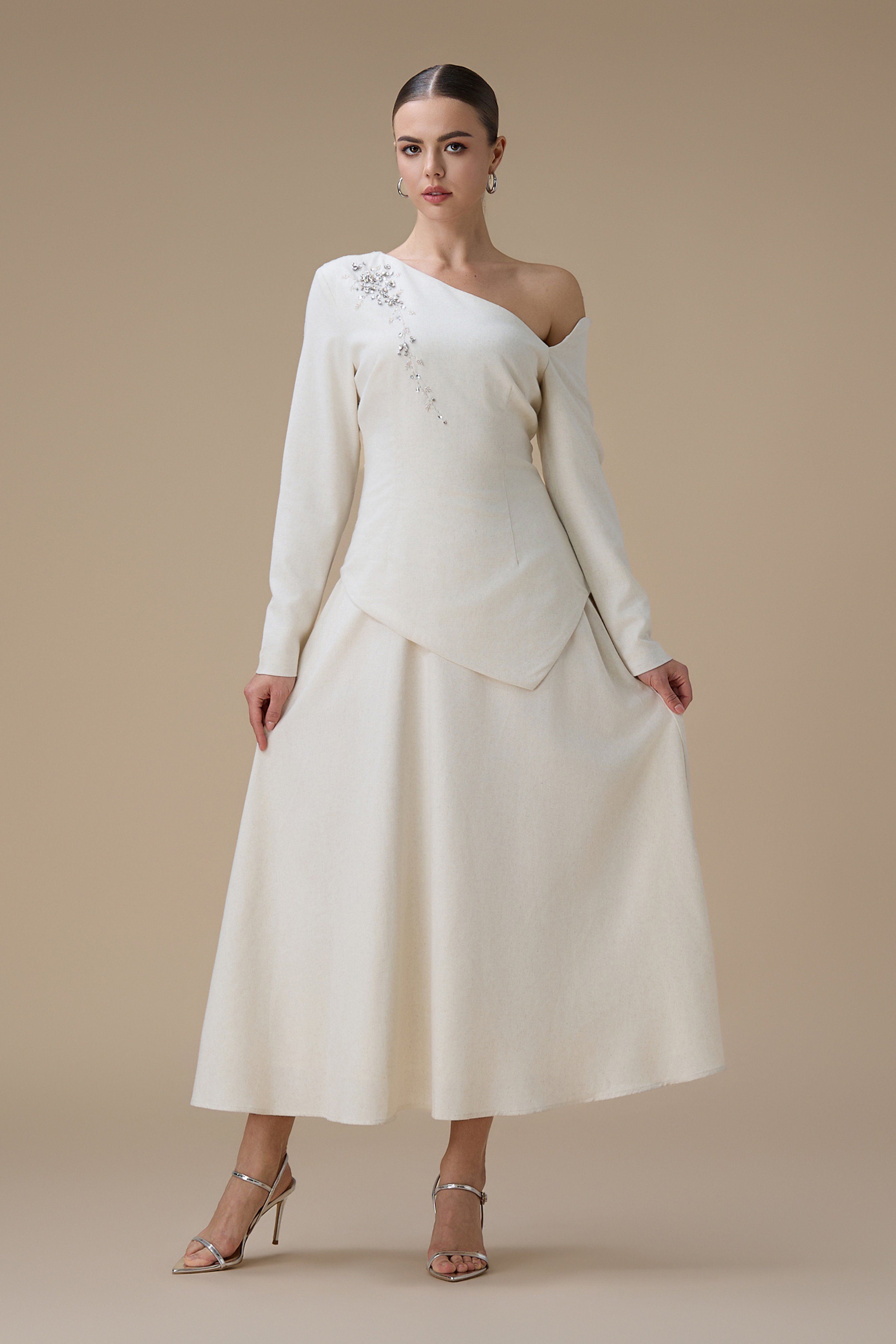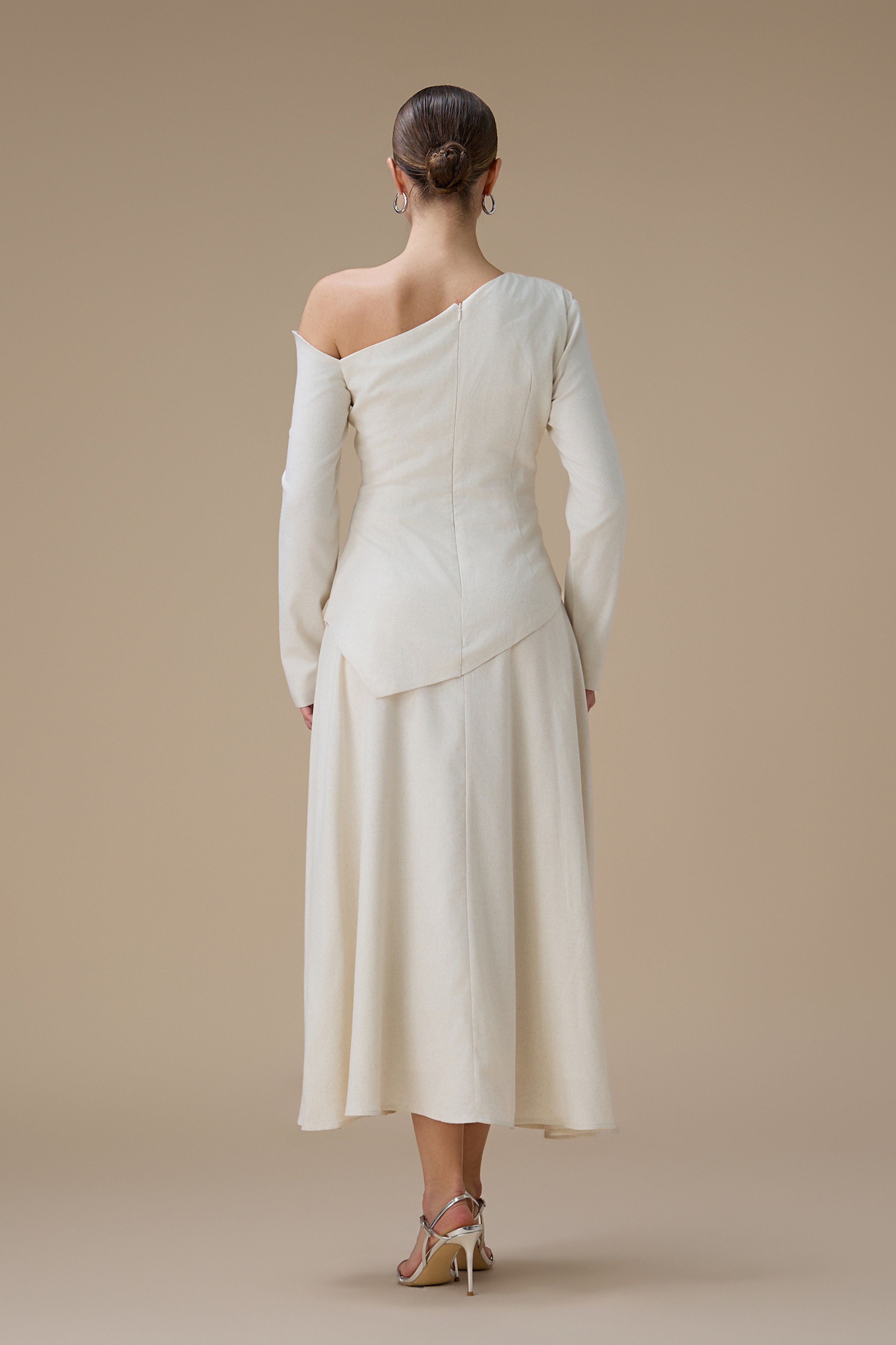 فستان ماكسي باللون أوف وايت بتصميم كتف واحد