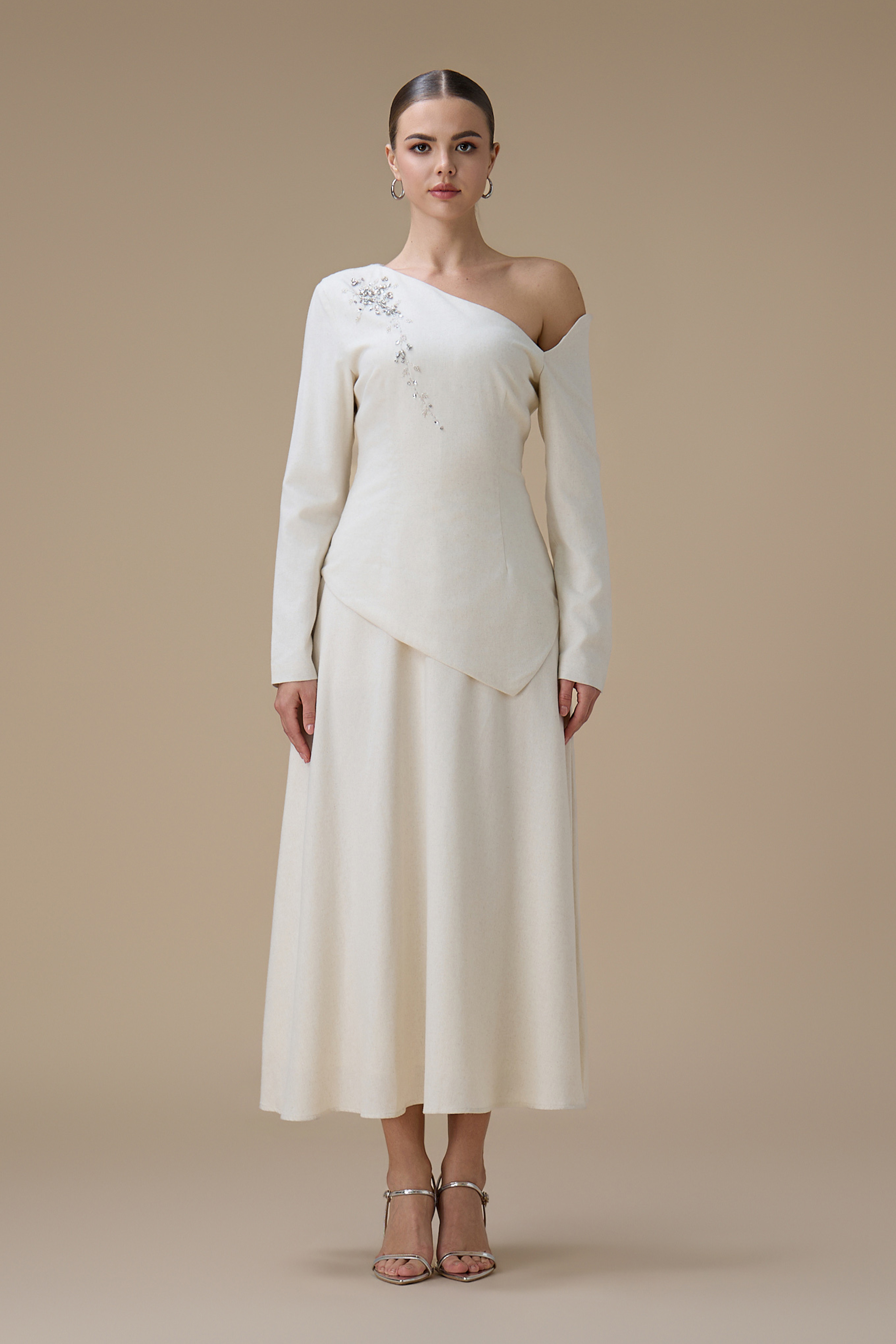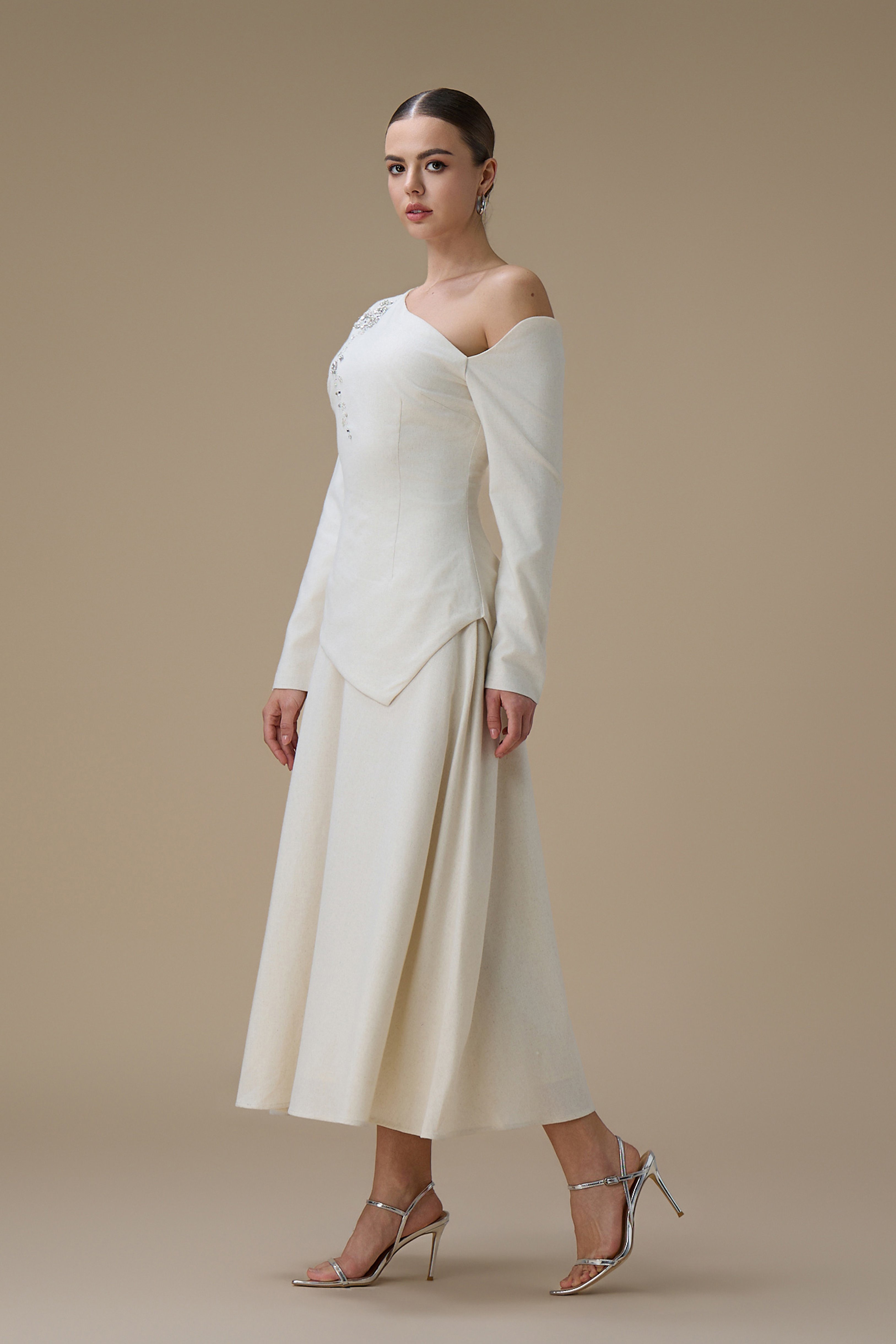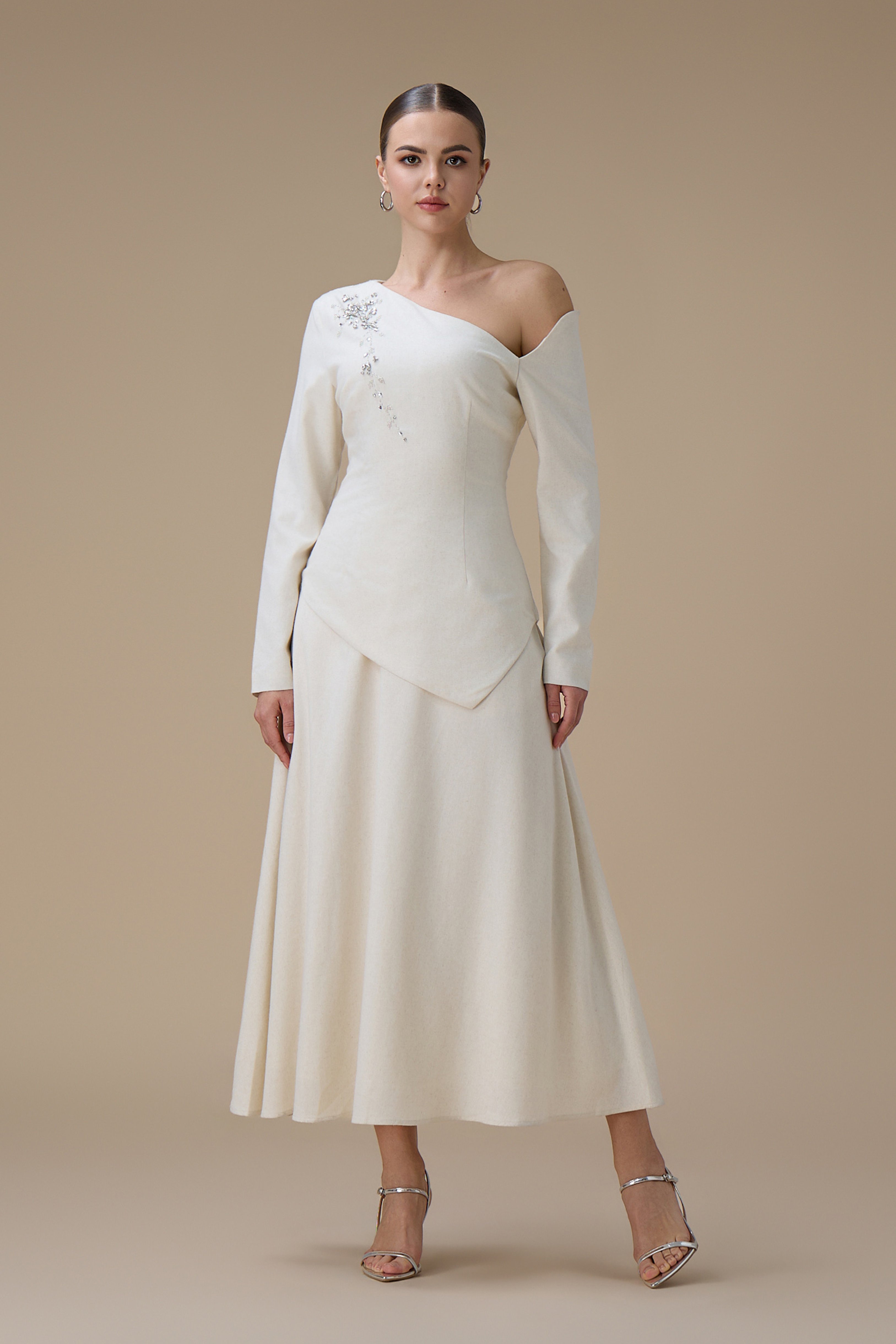 فستان ماكسي باللون أوف وايت بتصميم كتف واحد
