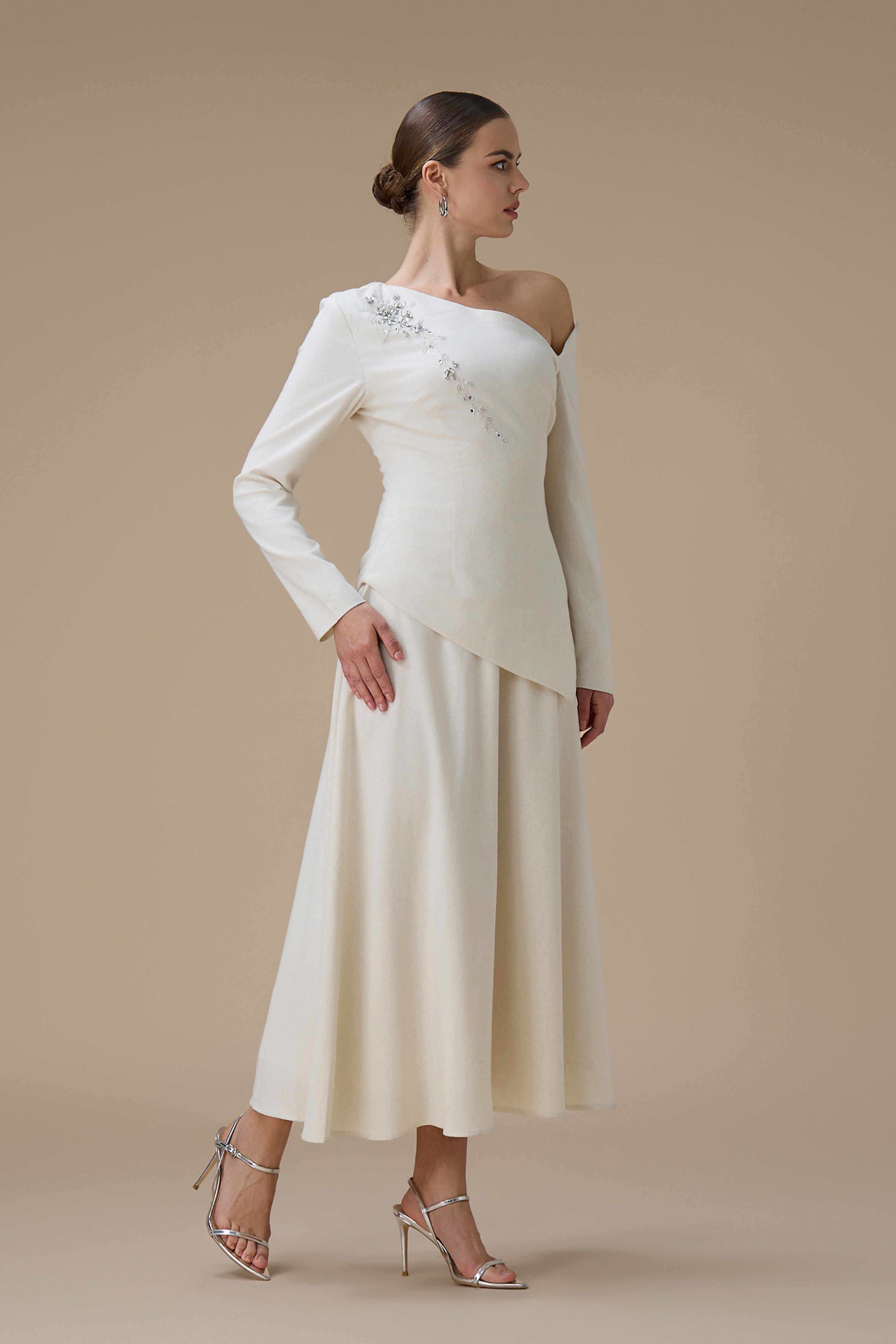 تصميم أنيق بكتف واحد مع تطريز لامع وأكمام طويلة