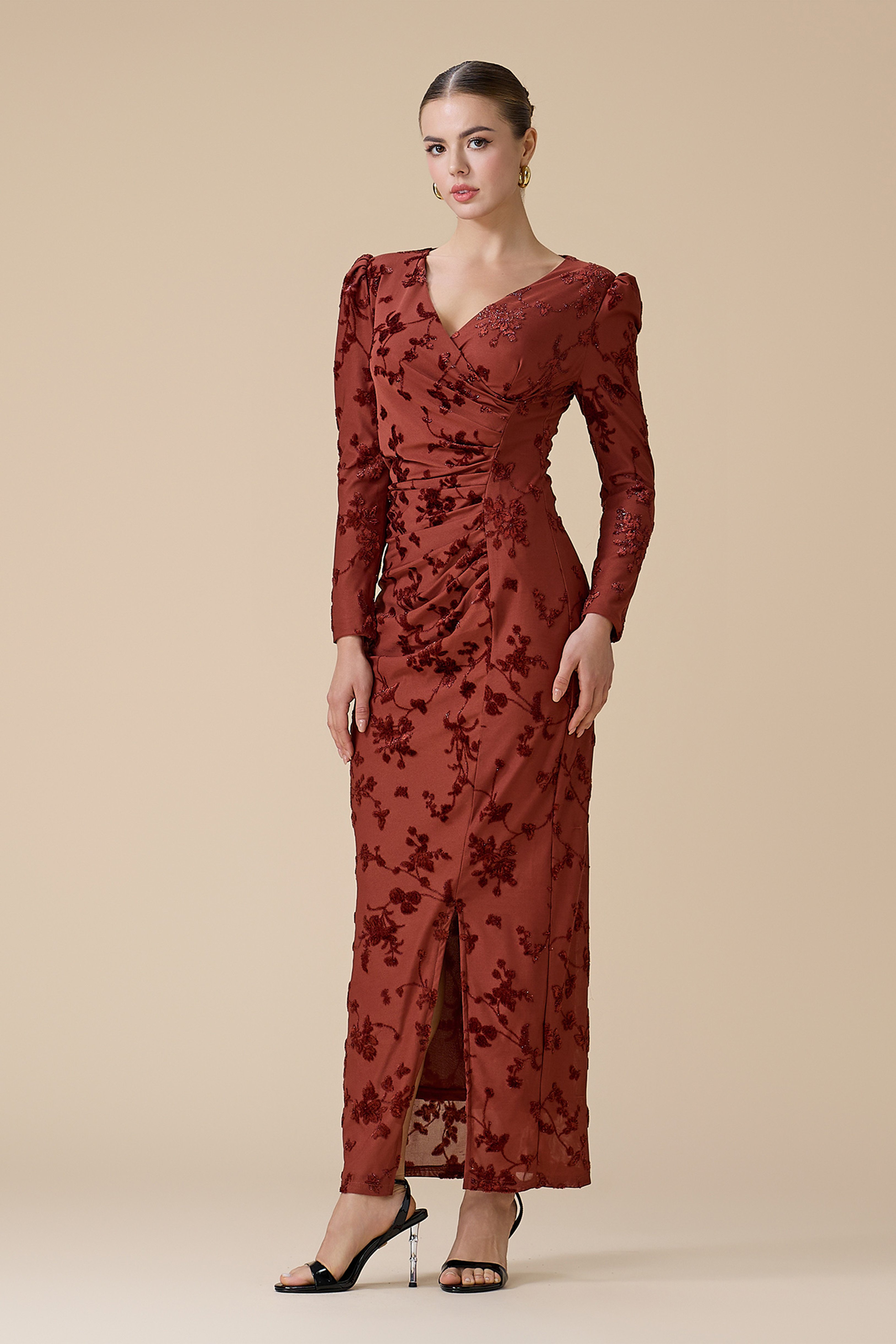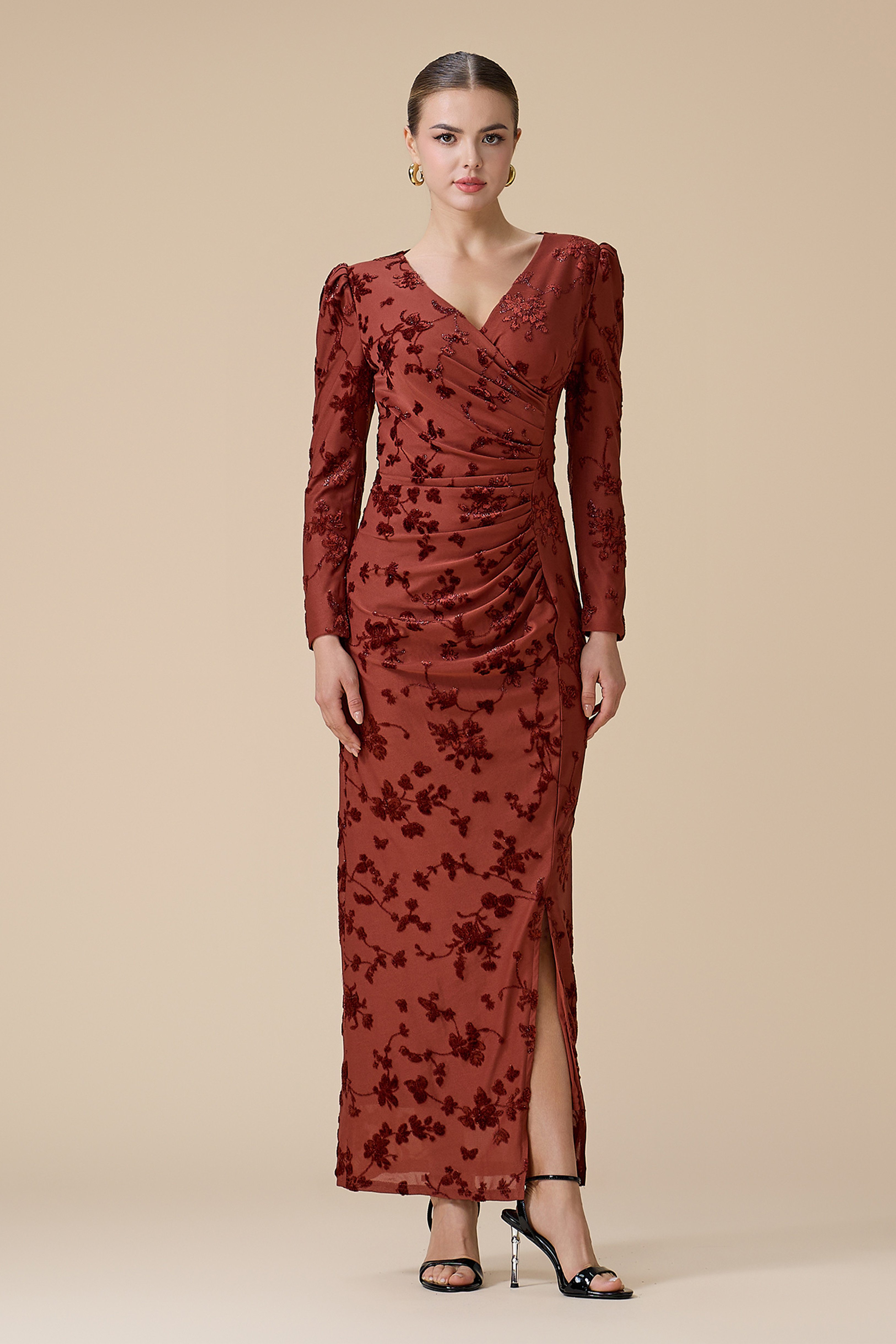 - نوع القصة: فستان طويل مخمل برتقالي مشجّر – برقبة V – تفاصيل درابيه جانبية – أكمام طويلة – خصر مخصّر – تمدد مريح