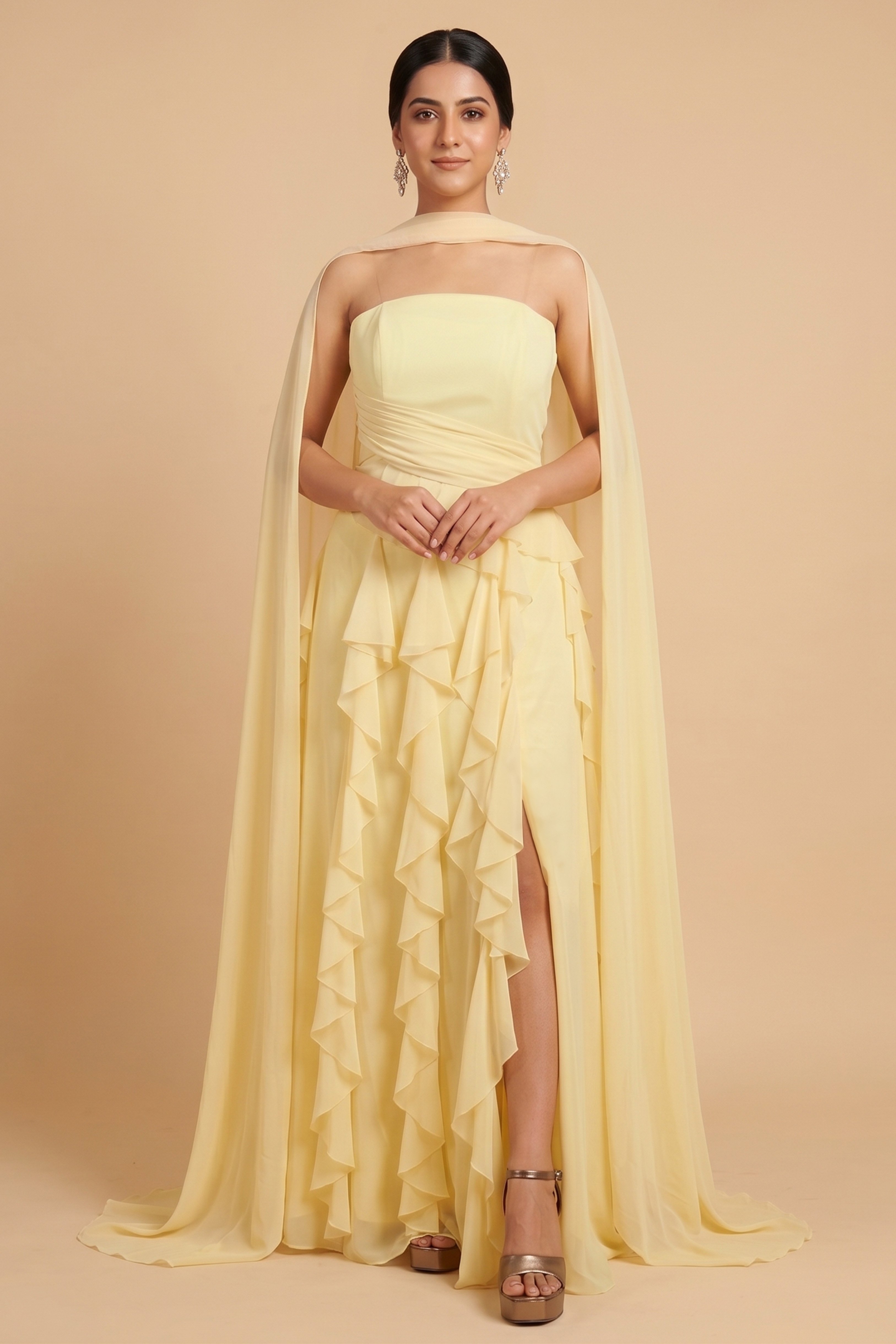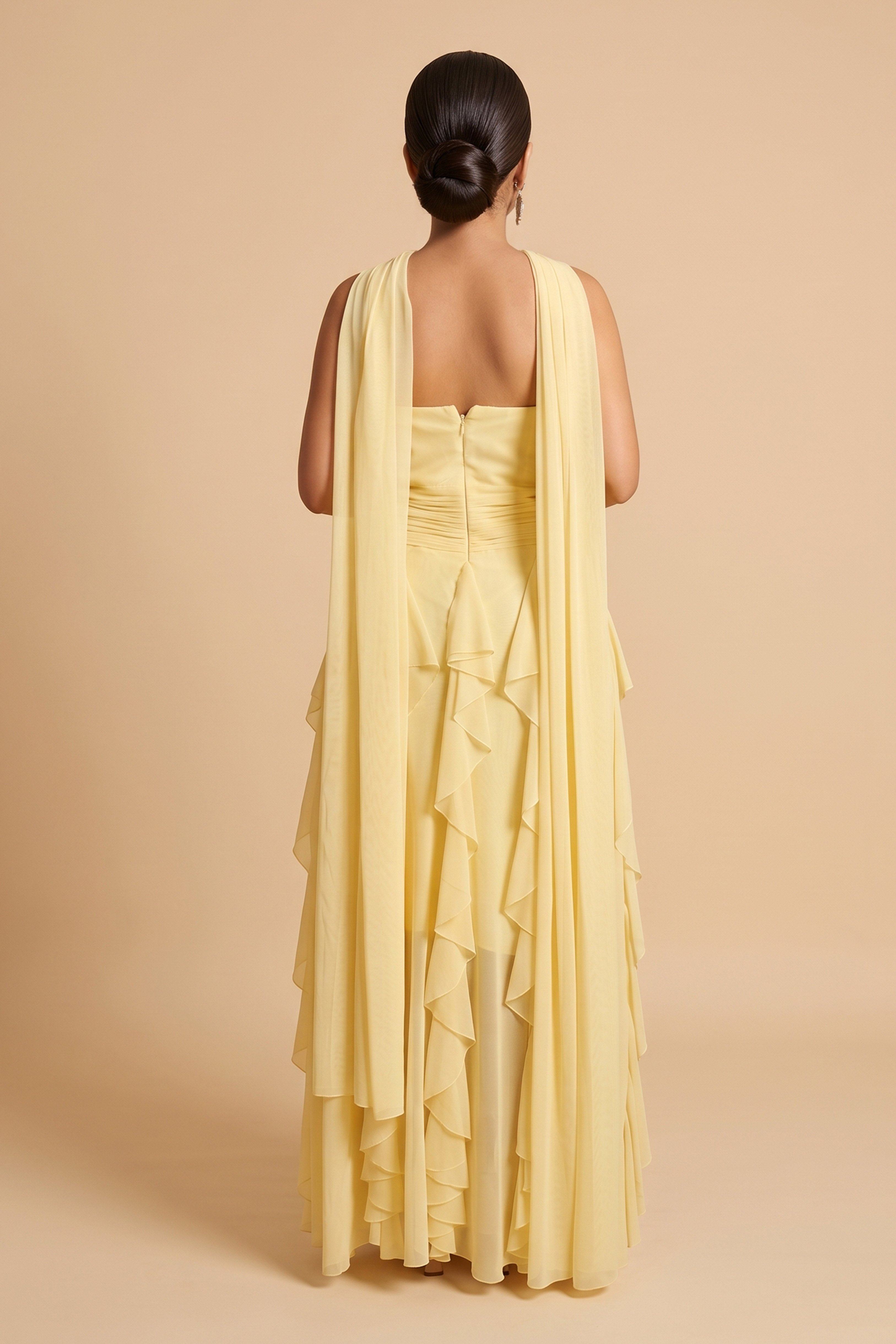 • نوع القصة: فستان ماكسي أصفر فاتح شيفون بشال بطبقات كشكش مع ثنيات درابيه