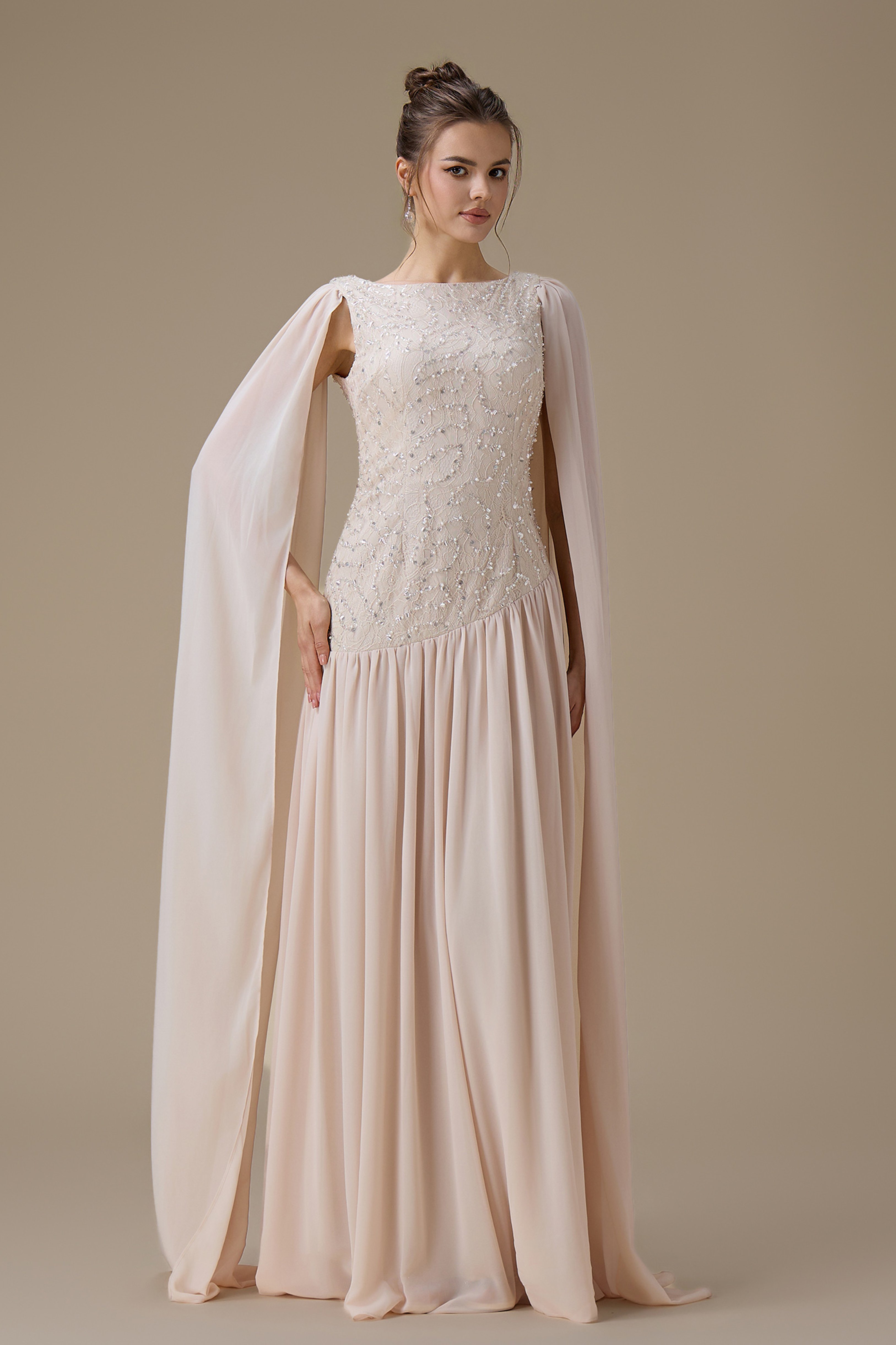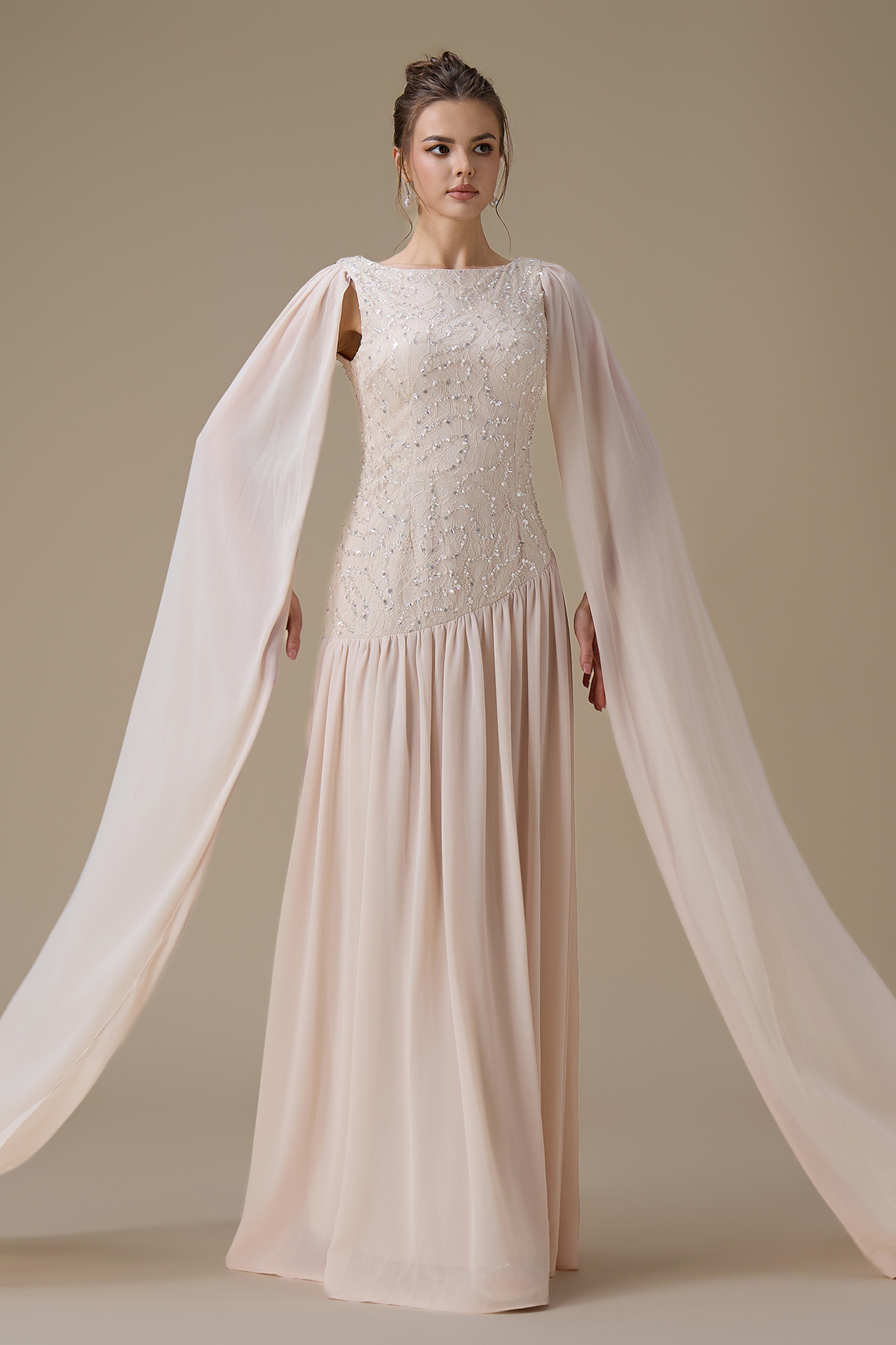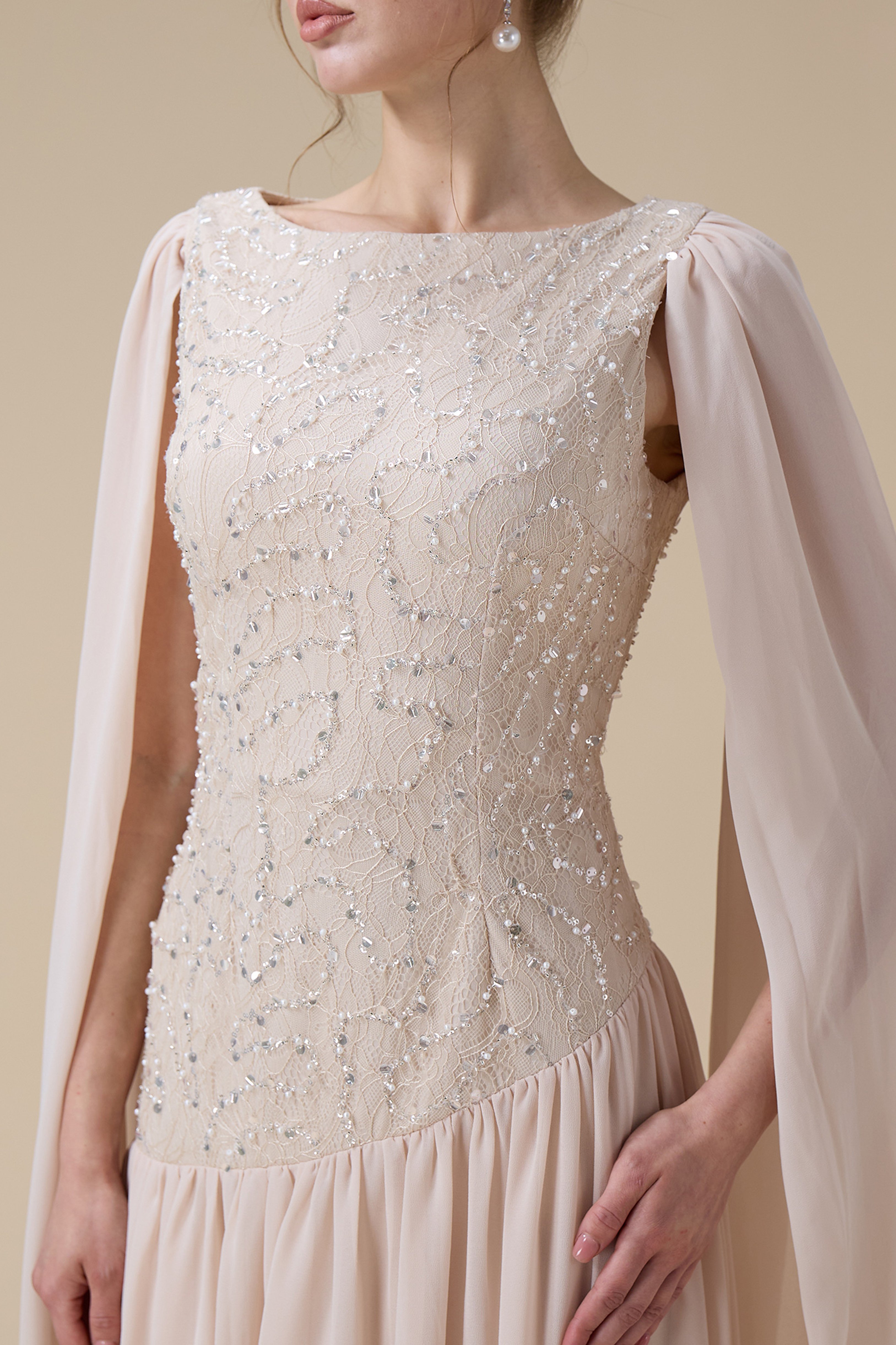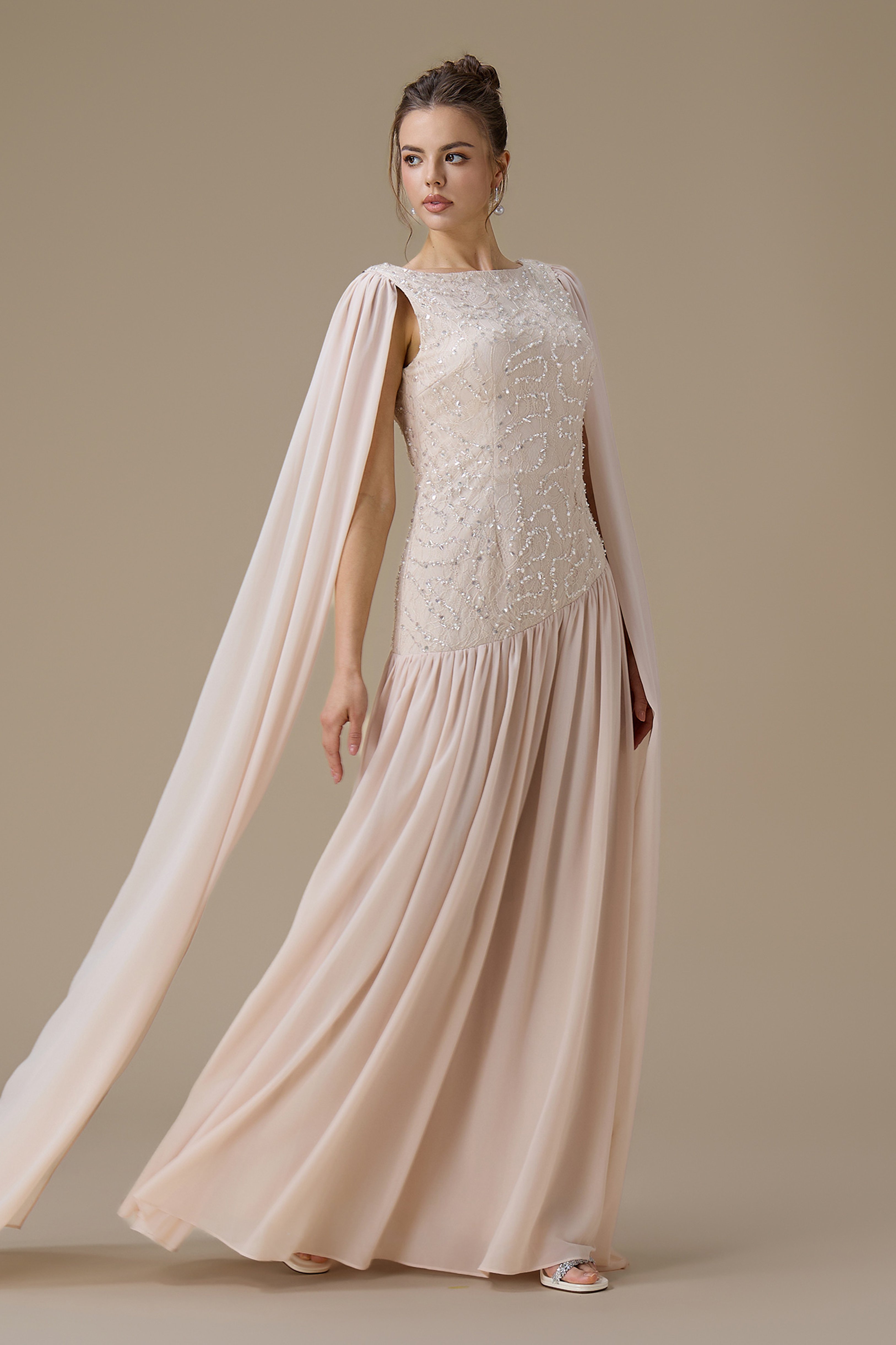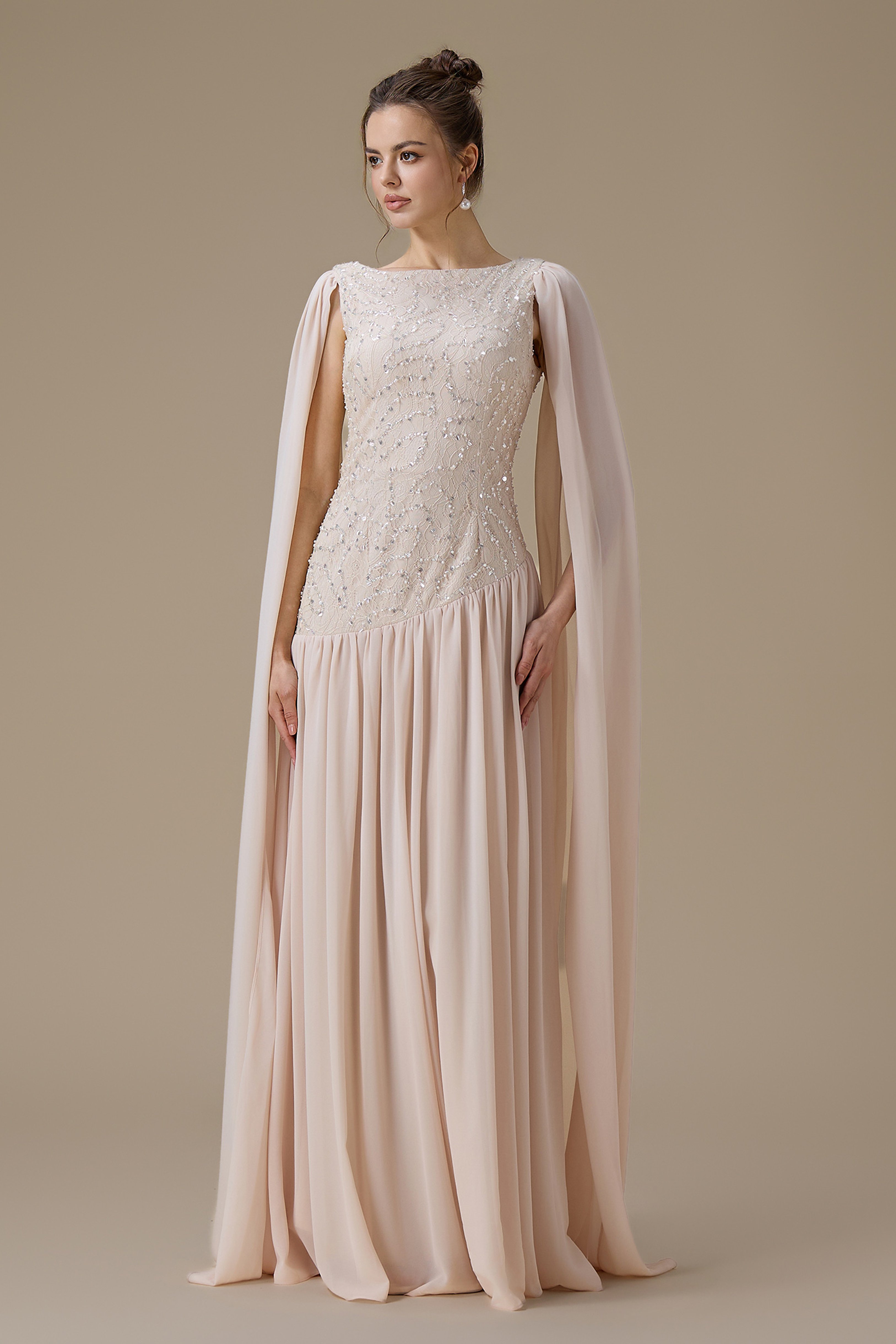 • نوع القصة: فستان شيفون سهرة طويل بيج مطرز بأكمام كيب بياقة مستديرة