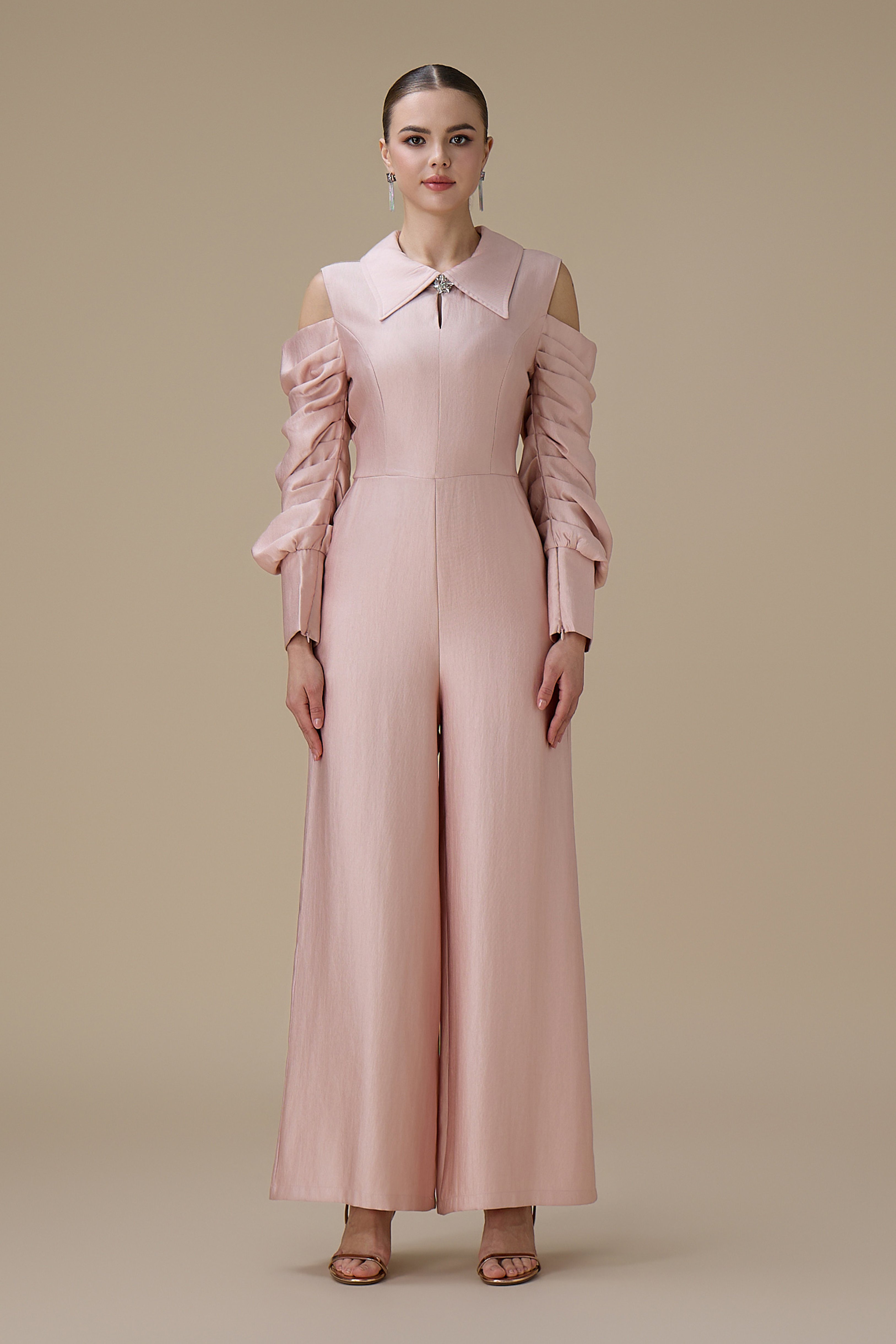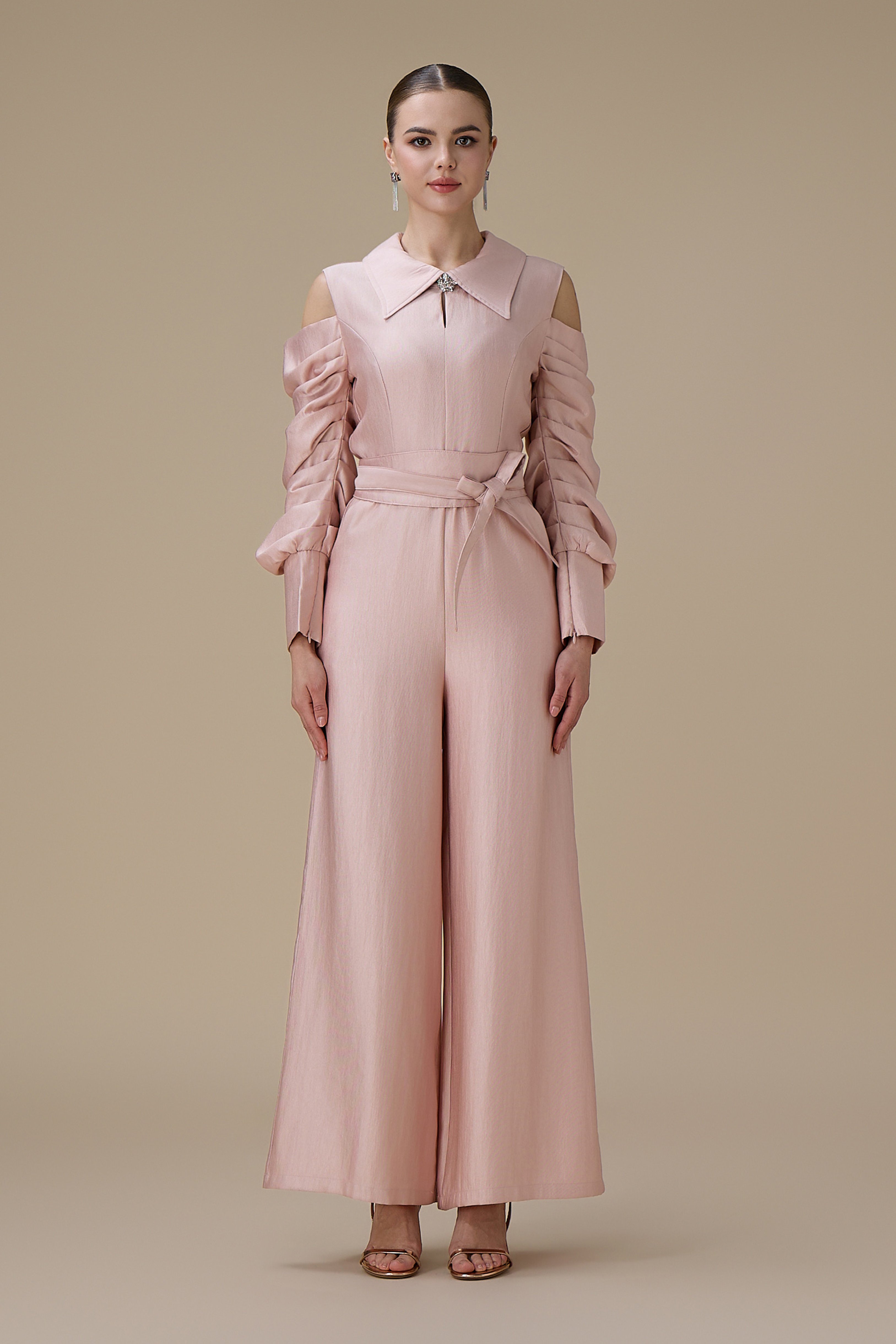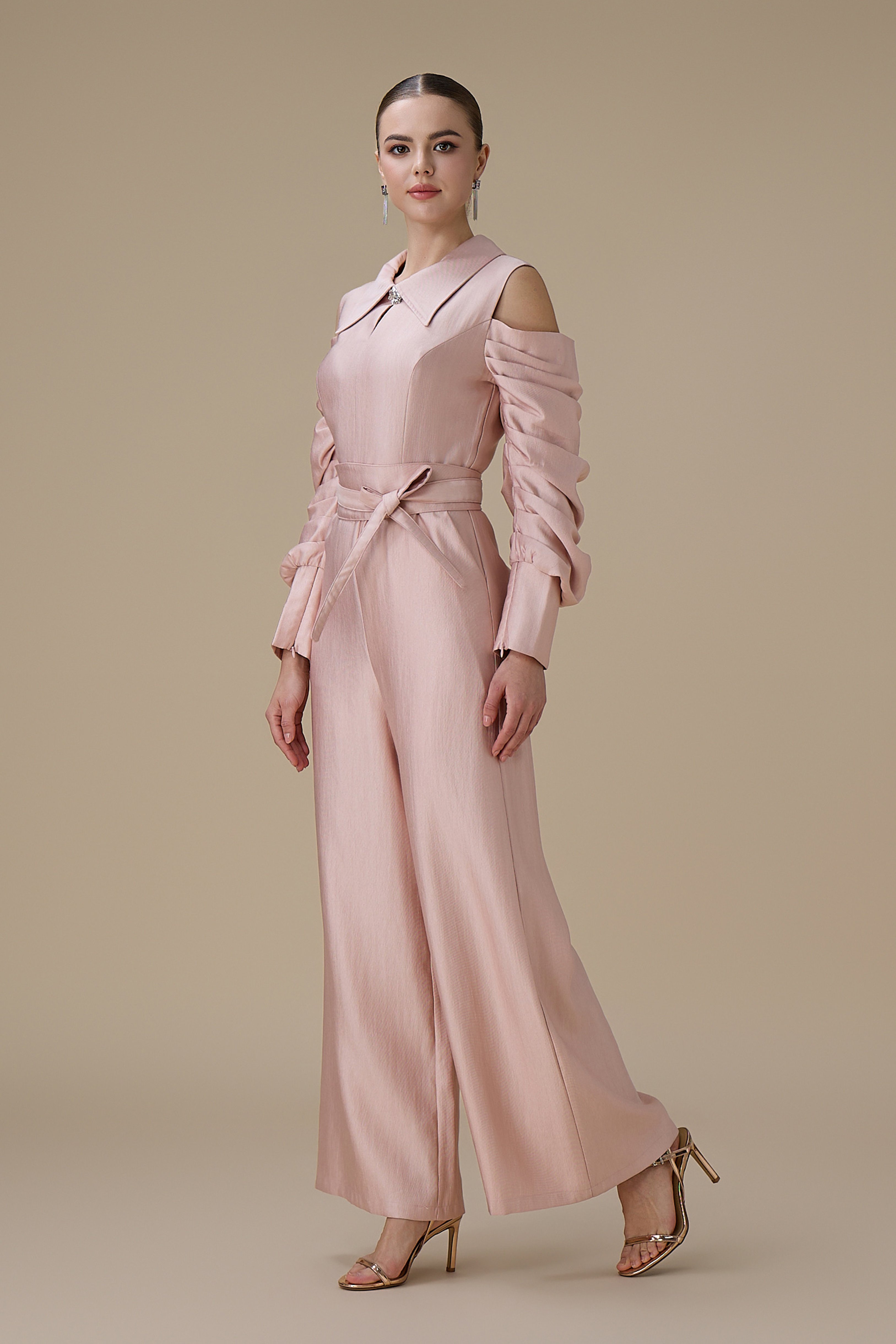 نوع القصة: جمبسوت وردي أكمام مكشوفة طويلة ببقصة بنطال واسع وياقة مطوية