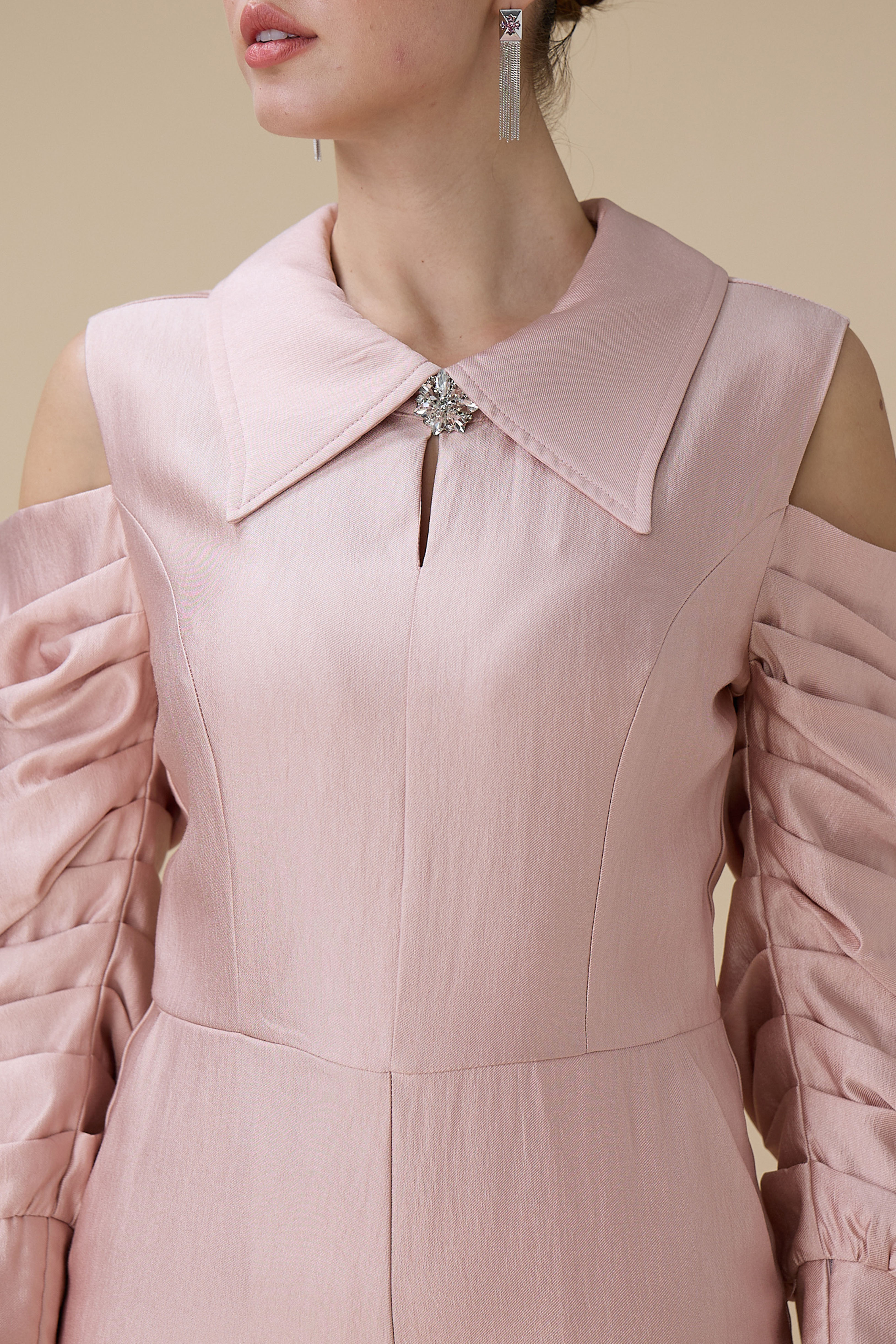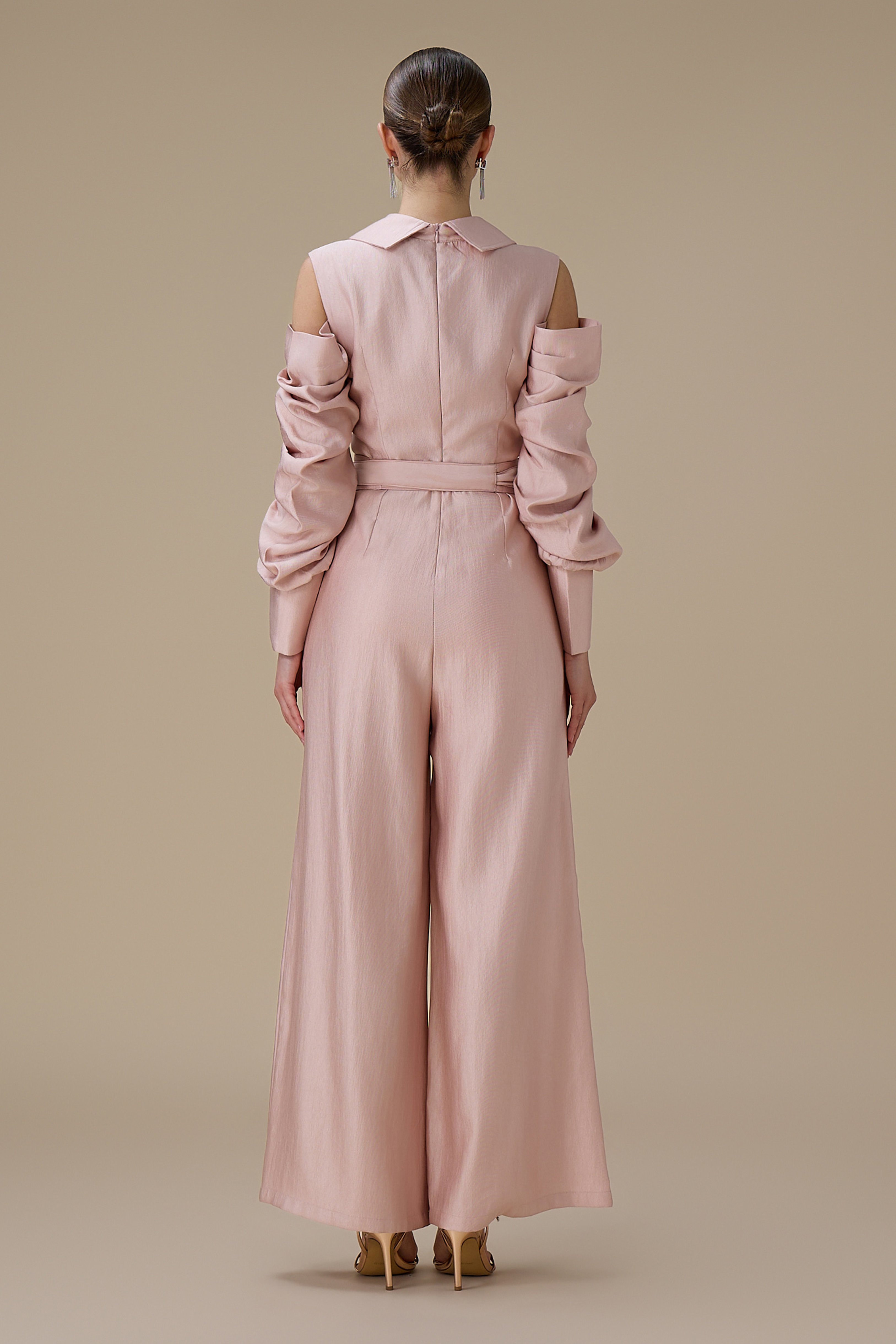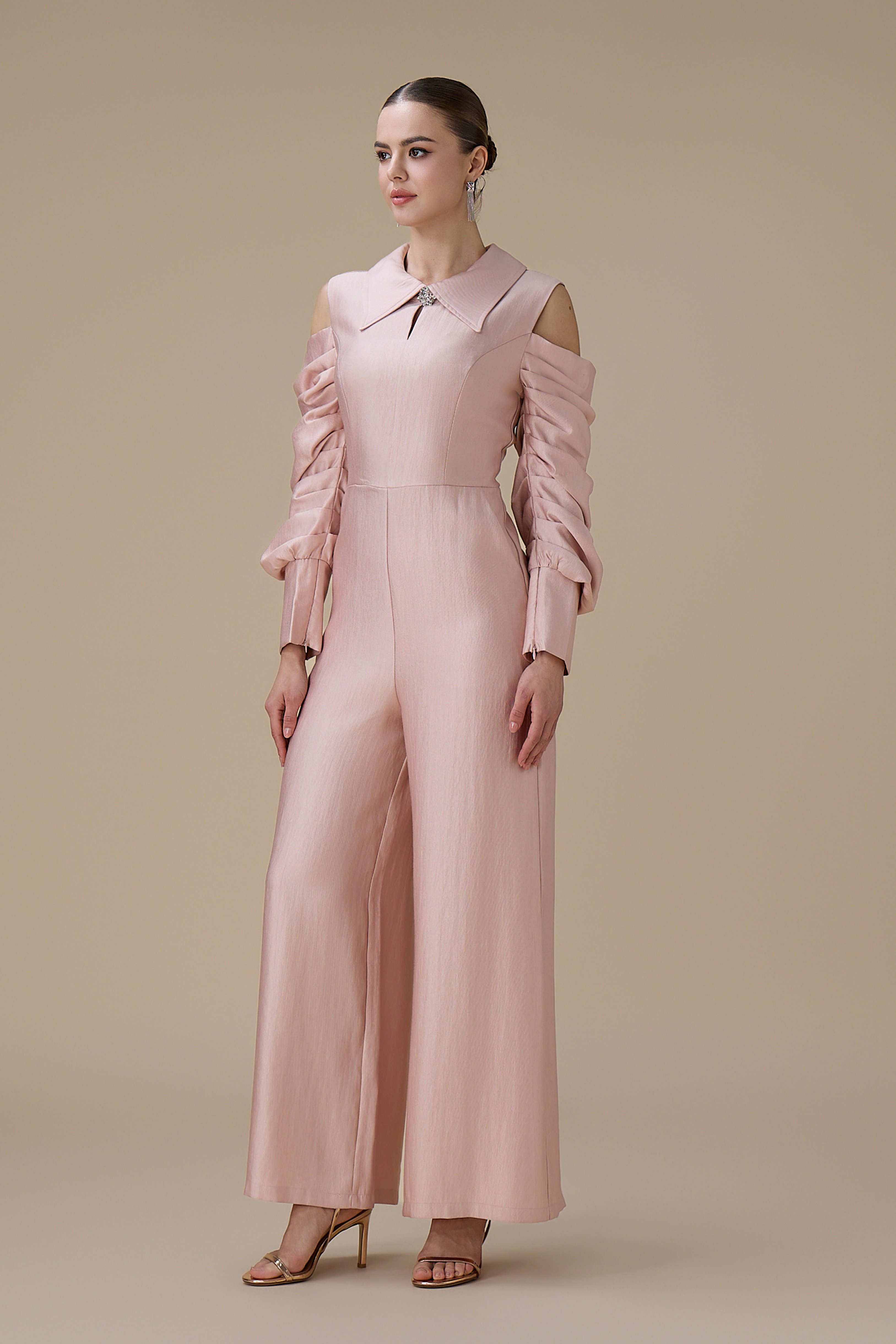 نوع القصة: جمبسوت وردي أكمام مكشوفة طويلة ببقصة بنطال واسع وياقة مطوية