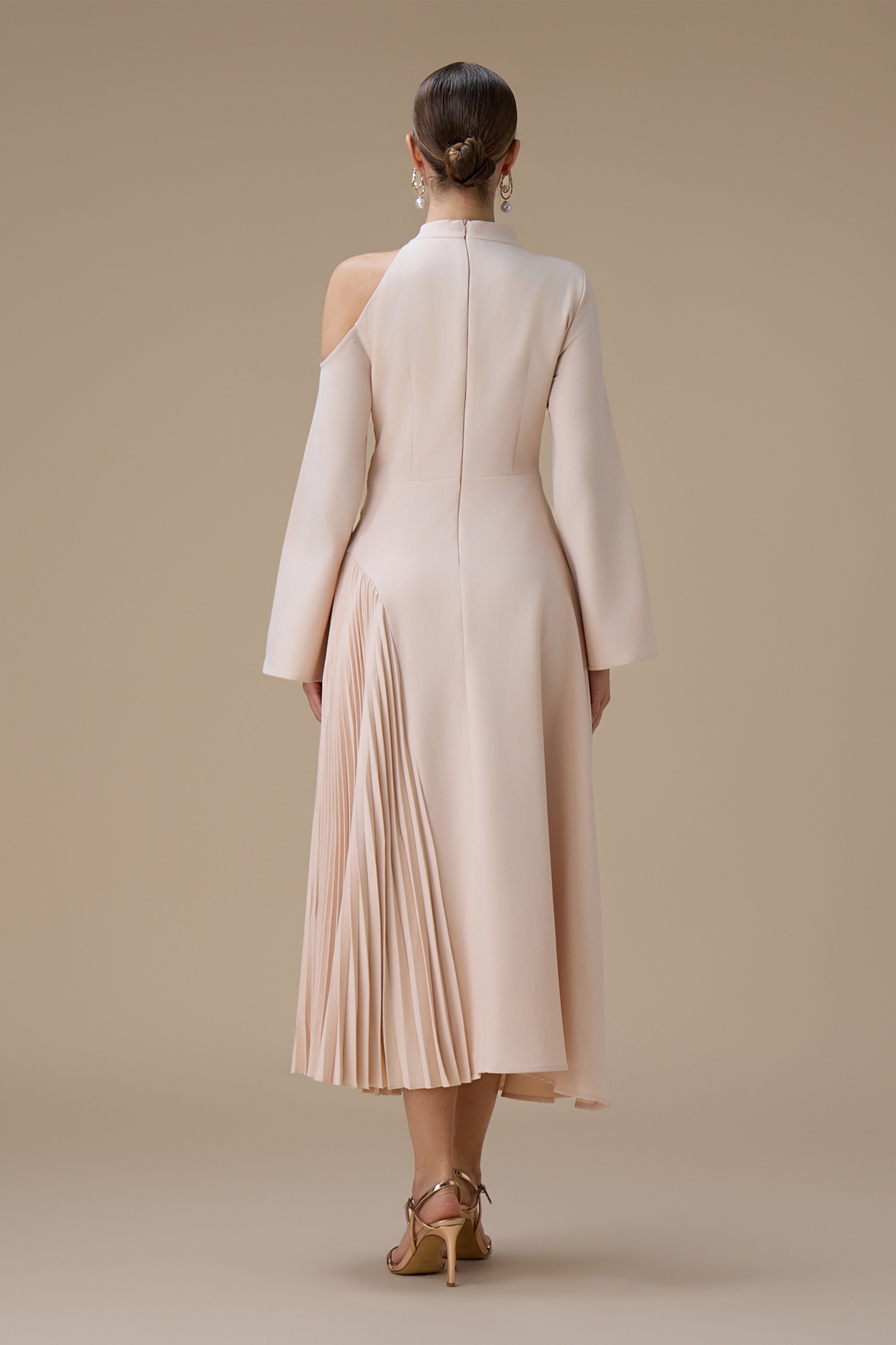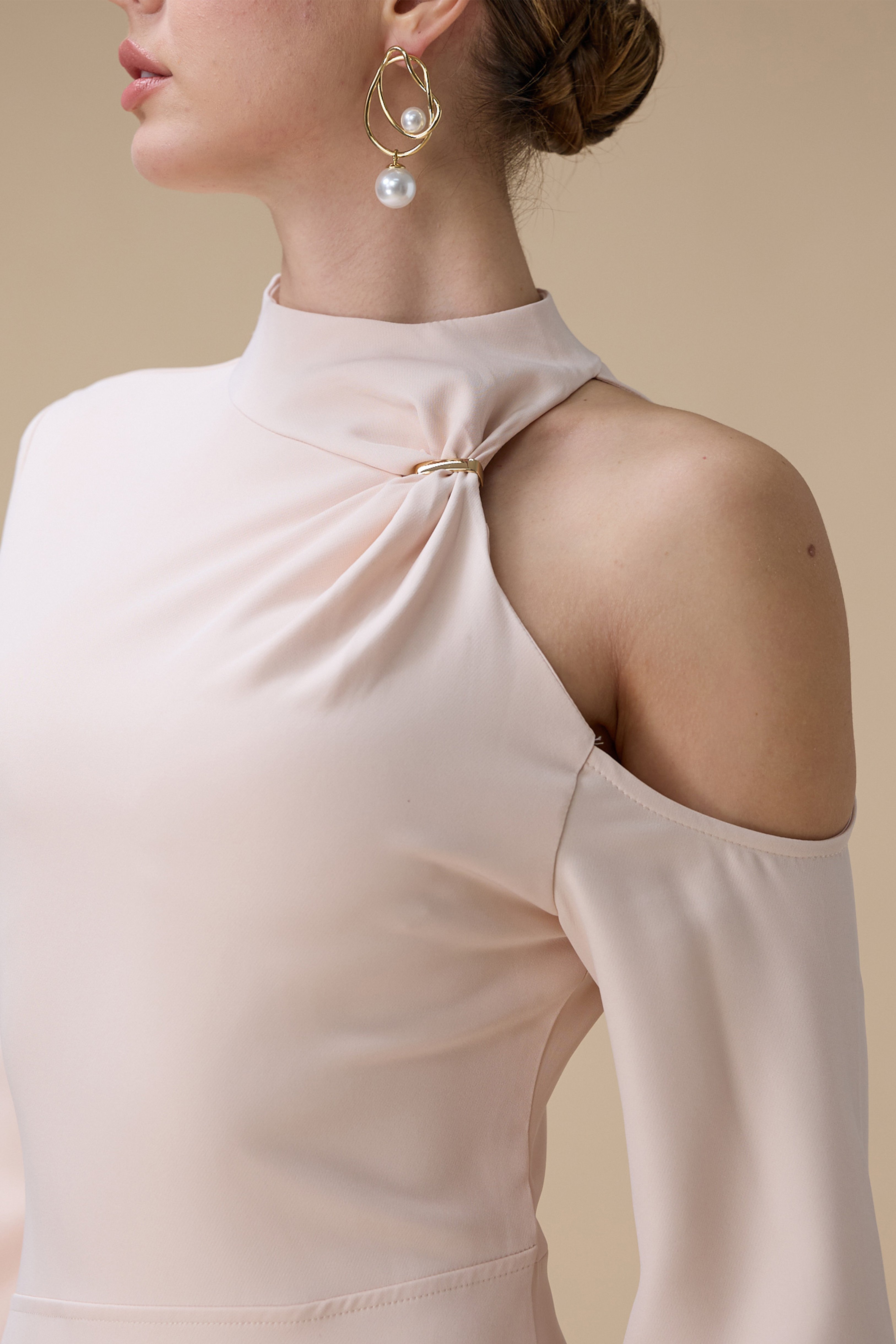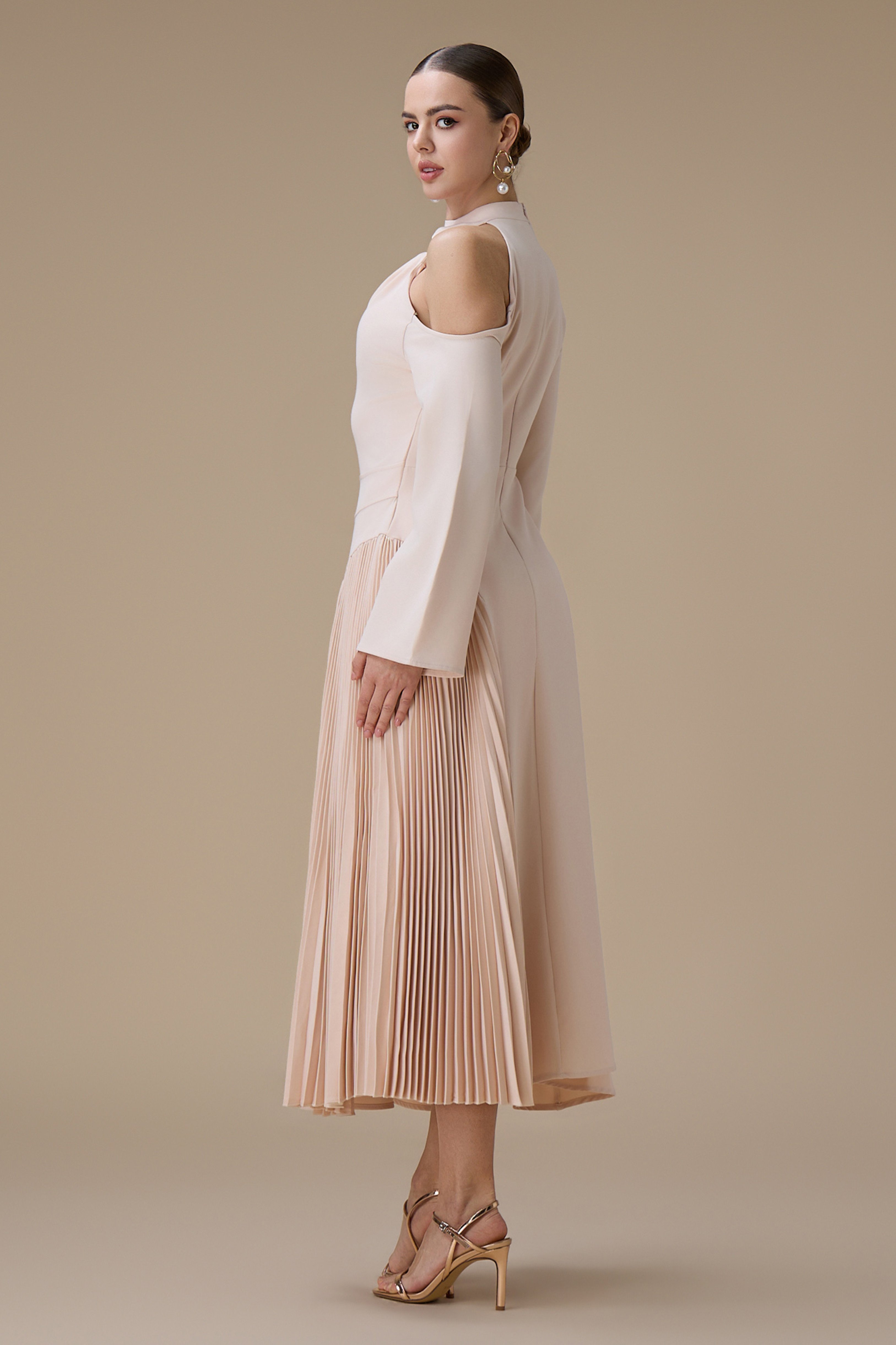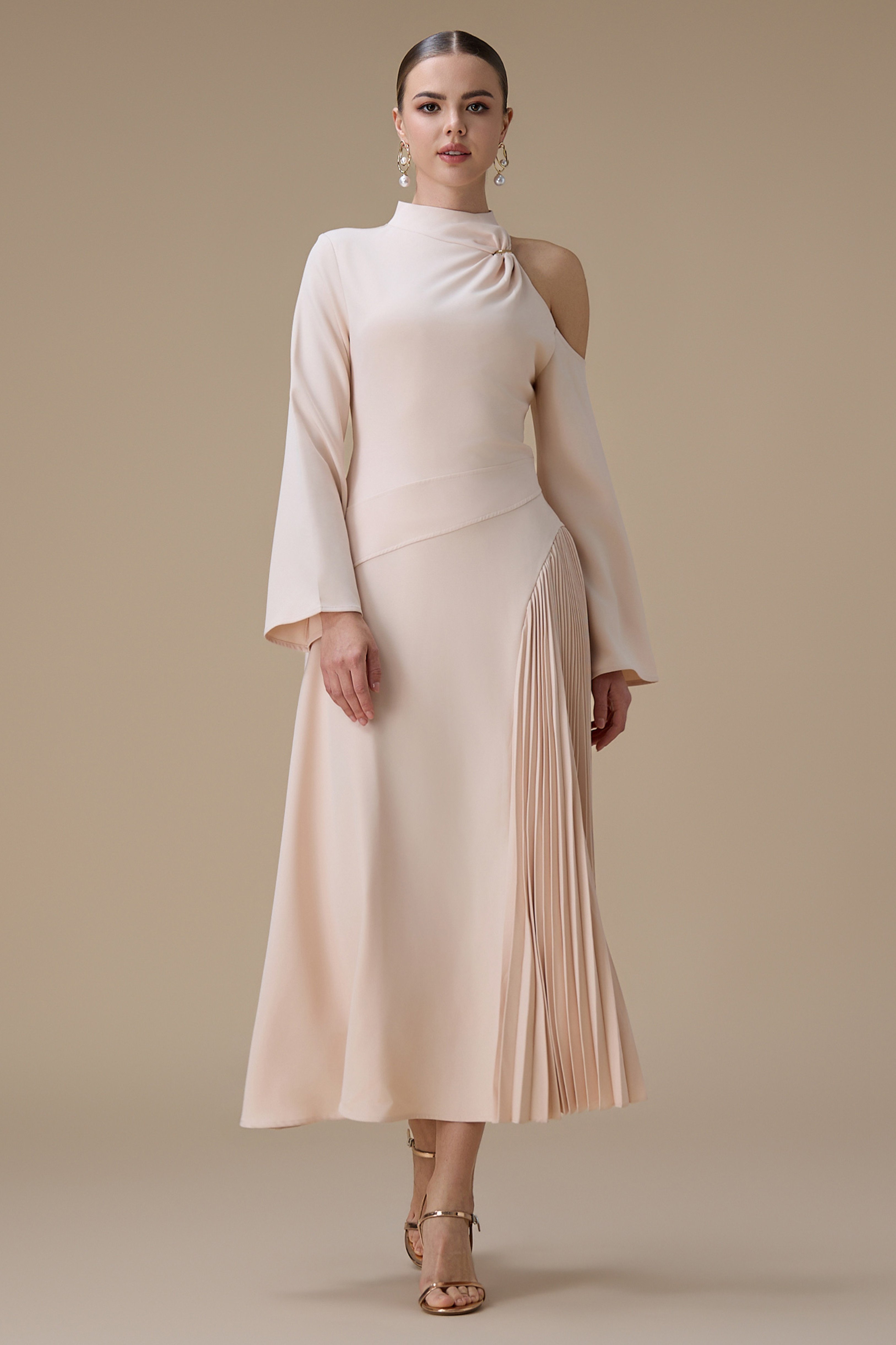 الياقة: ياقة عالية بتصميم كتف واحد