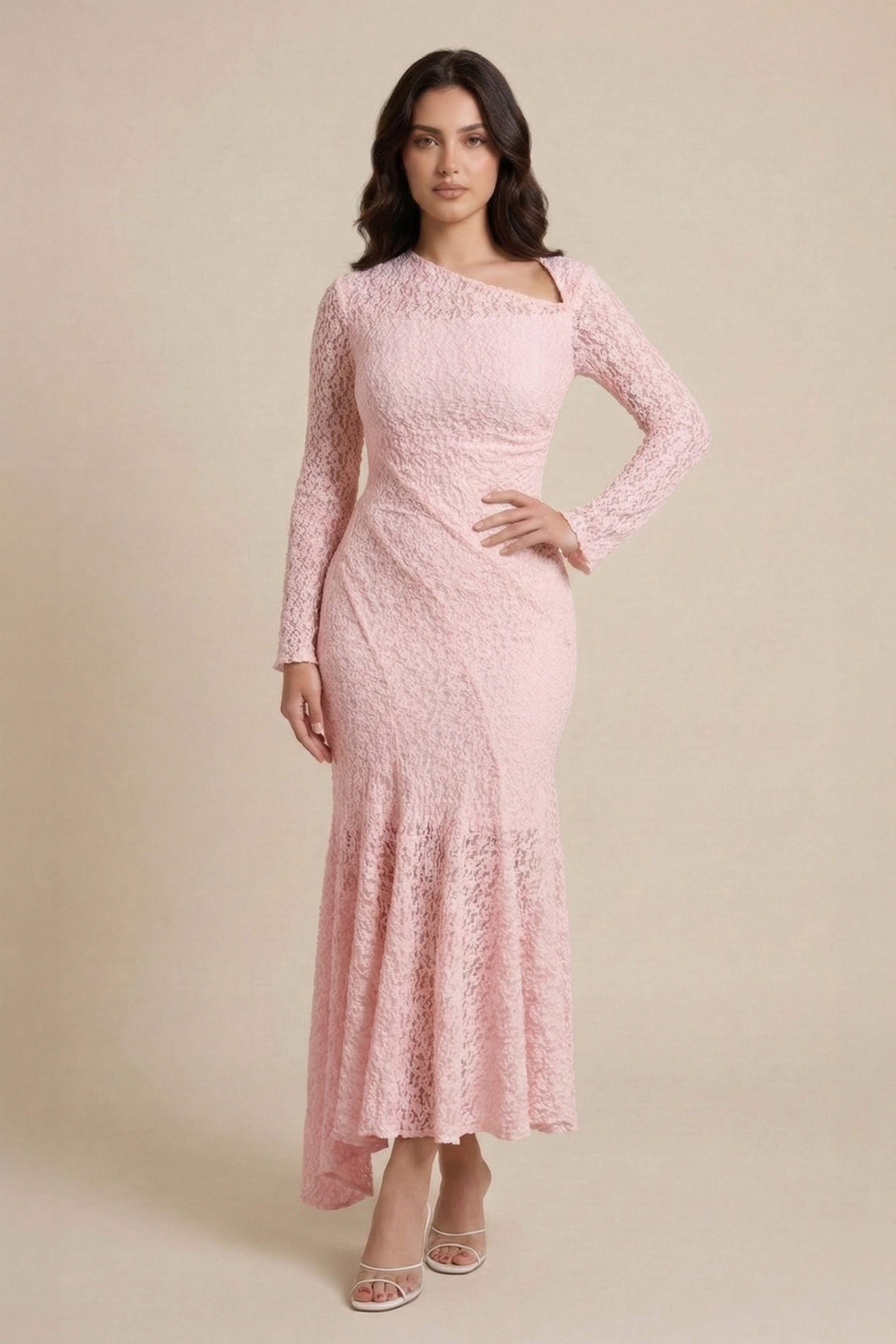 نوع القصة: فستان ماكسي دانتيل لون وردي بياقة مائلة وأكمام طويلة