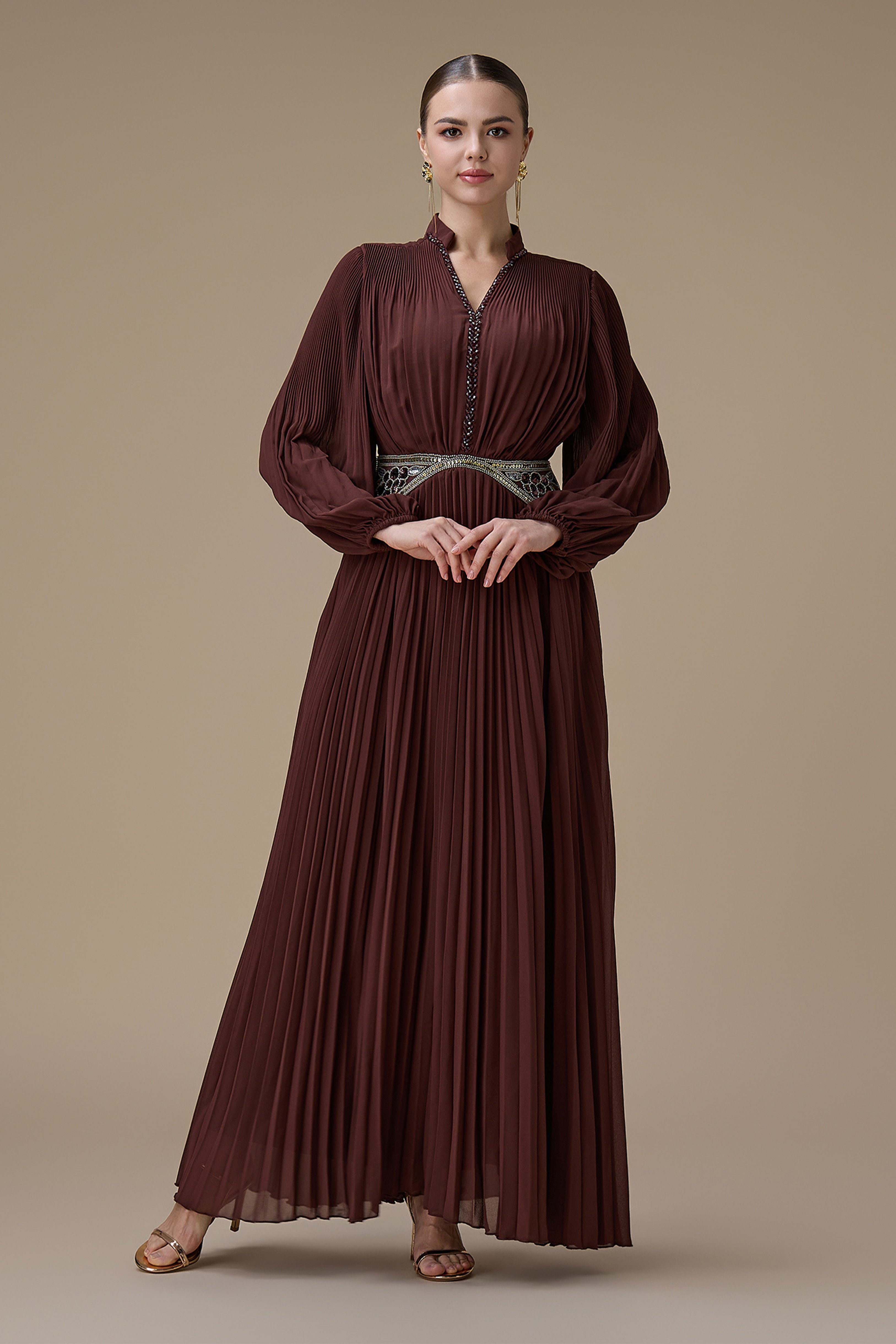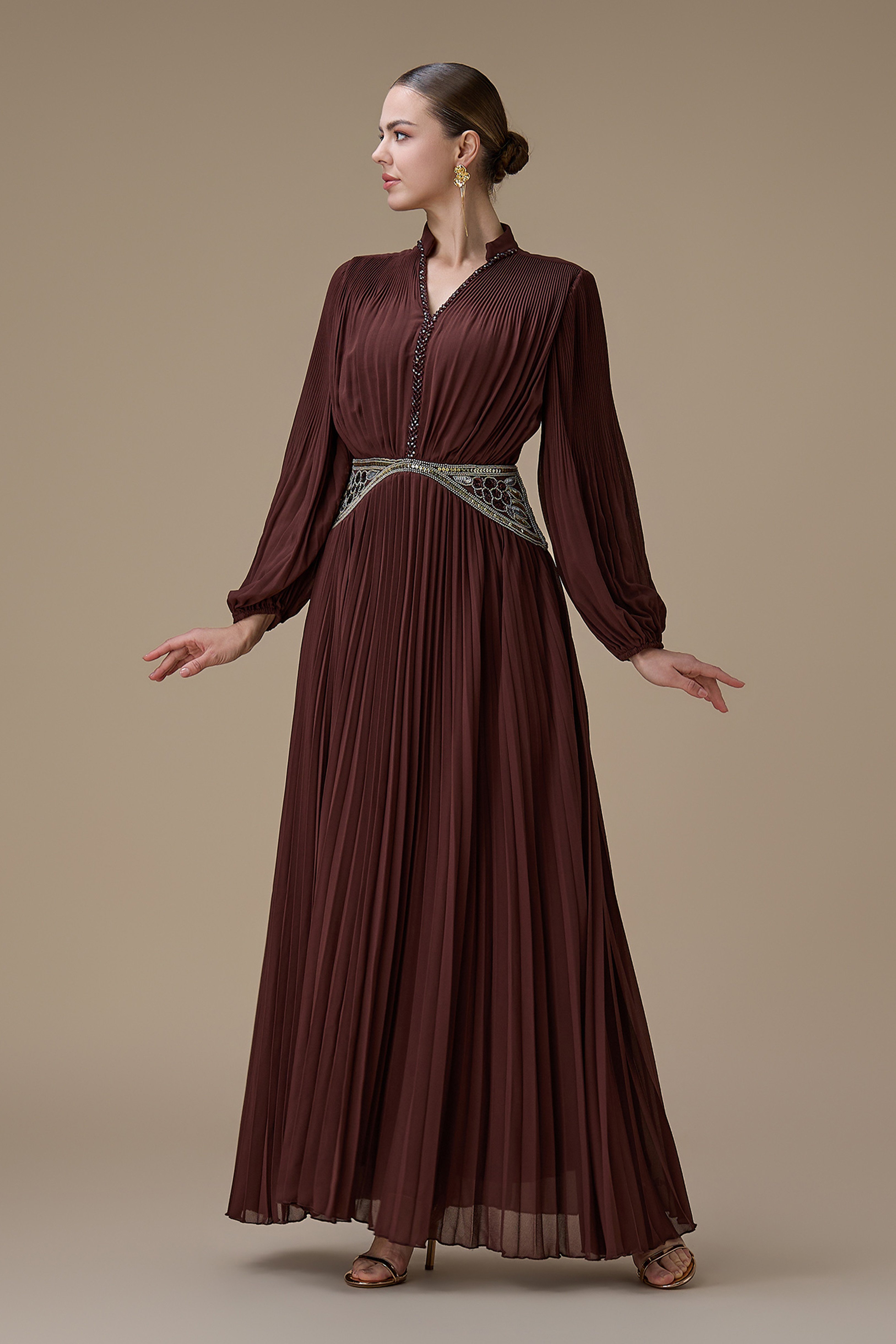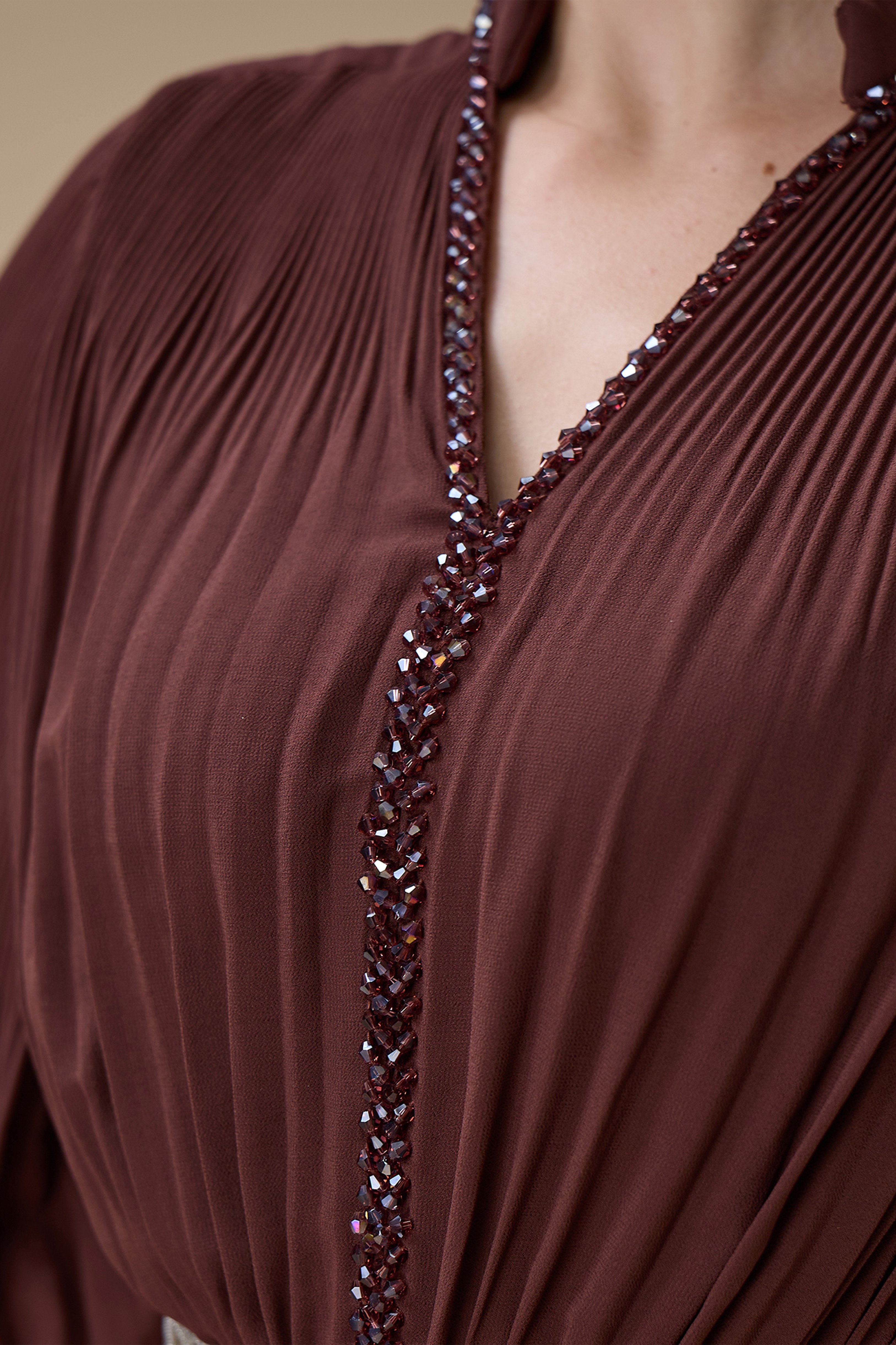 نوع القصة: فستان طويل بني بكسرات مزين بترتر بأكمام طويلة وياقة v