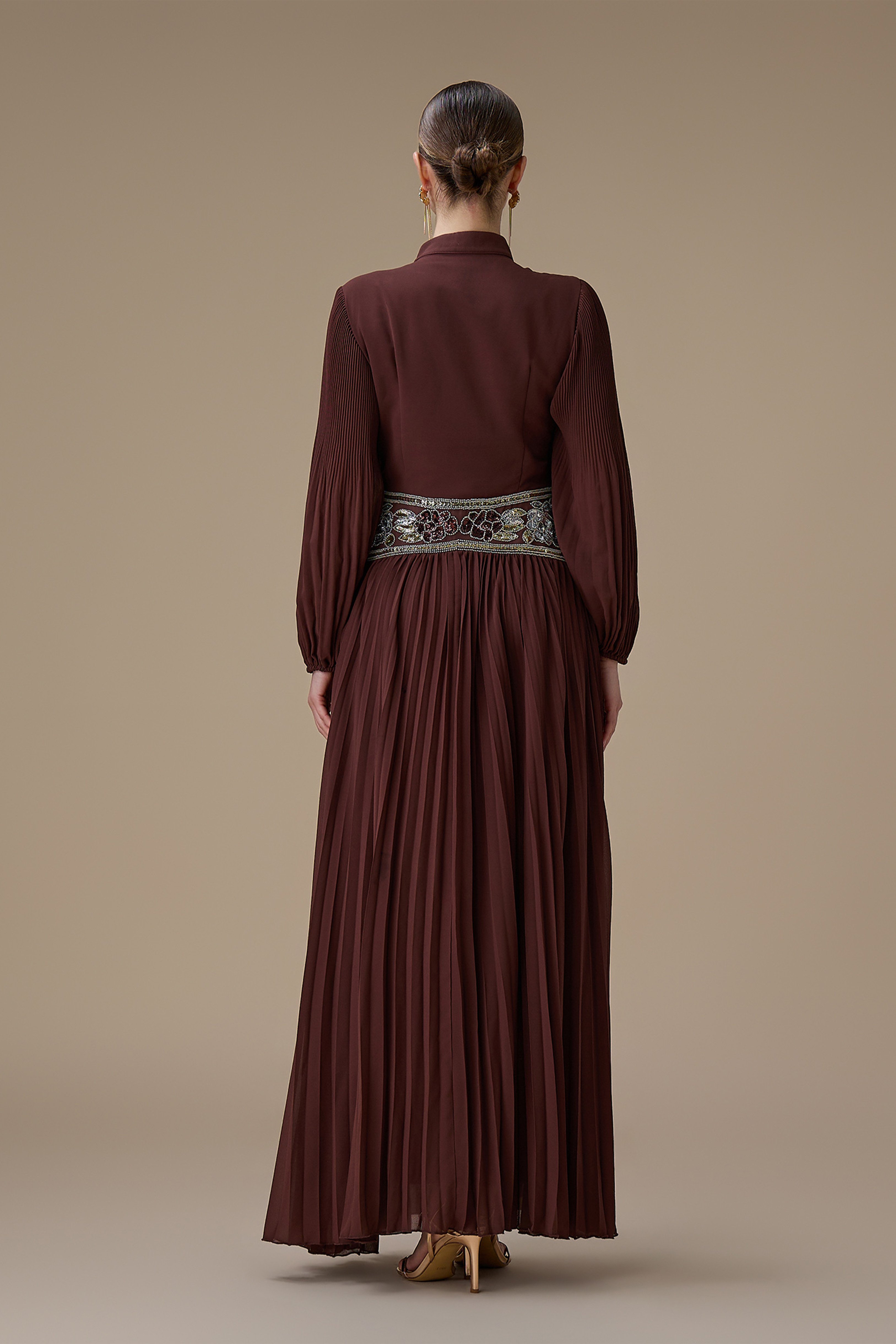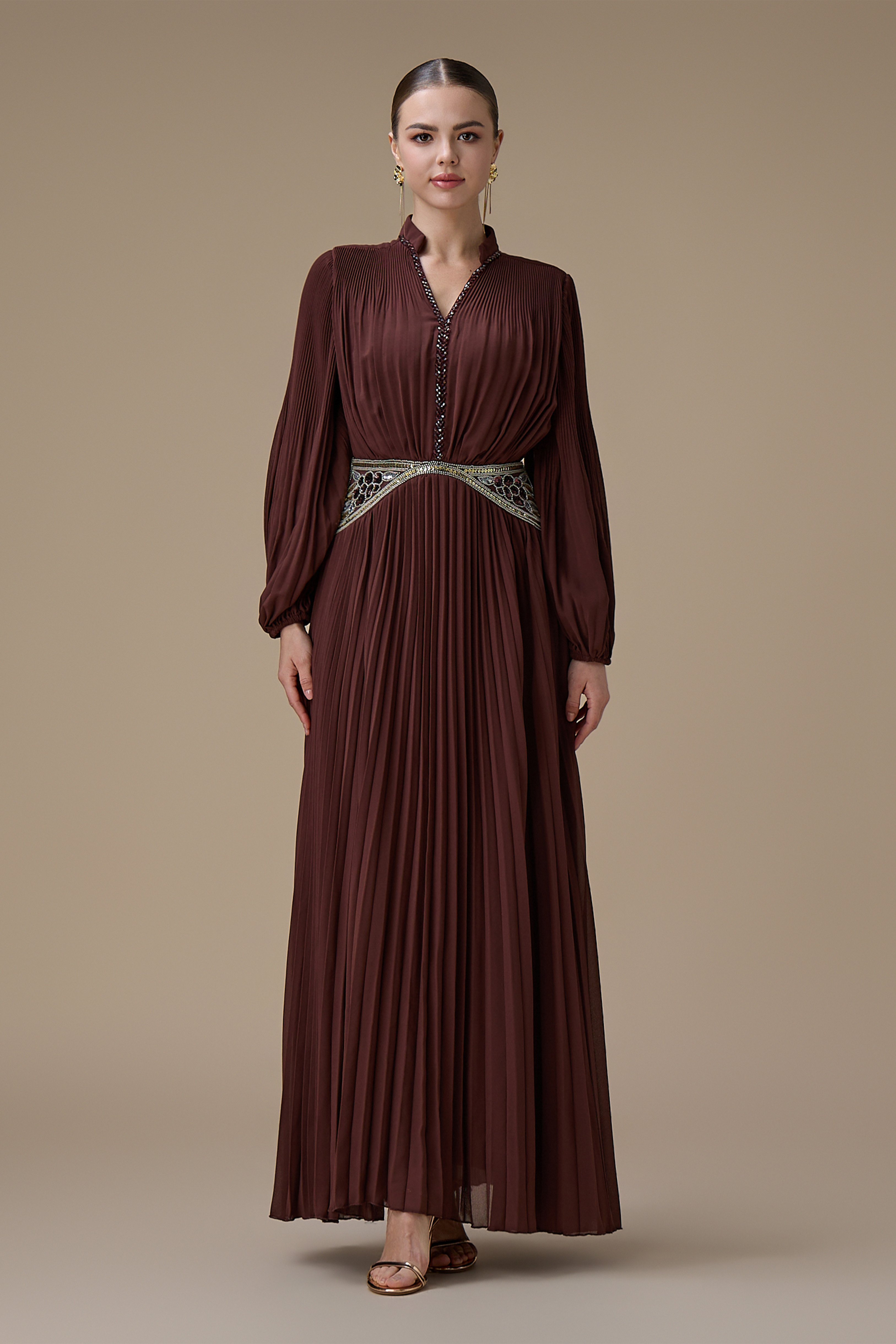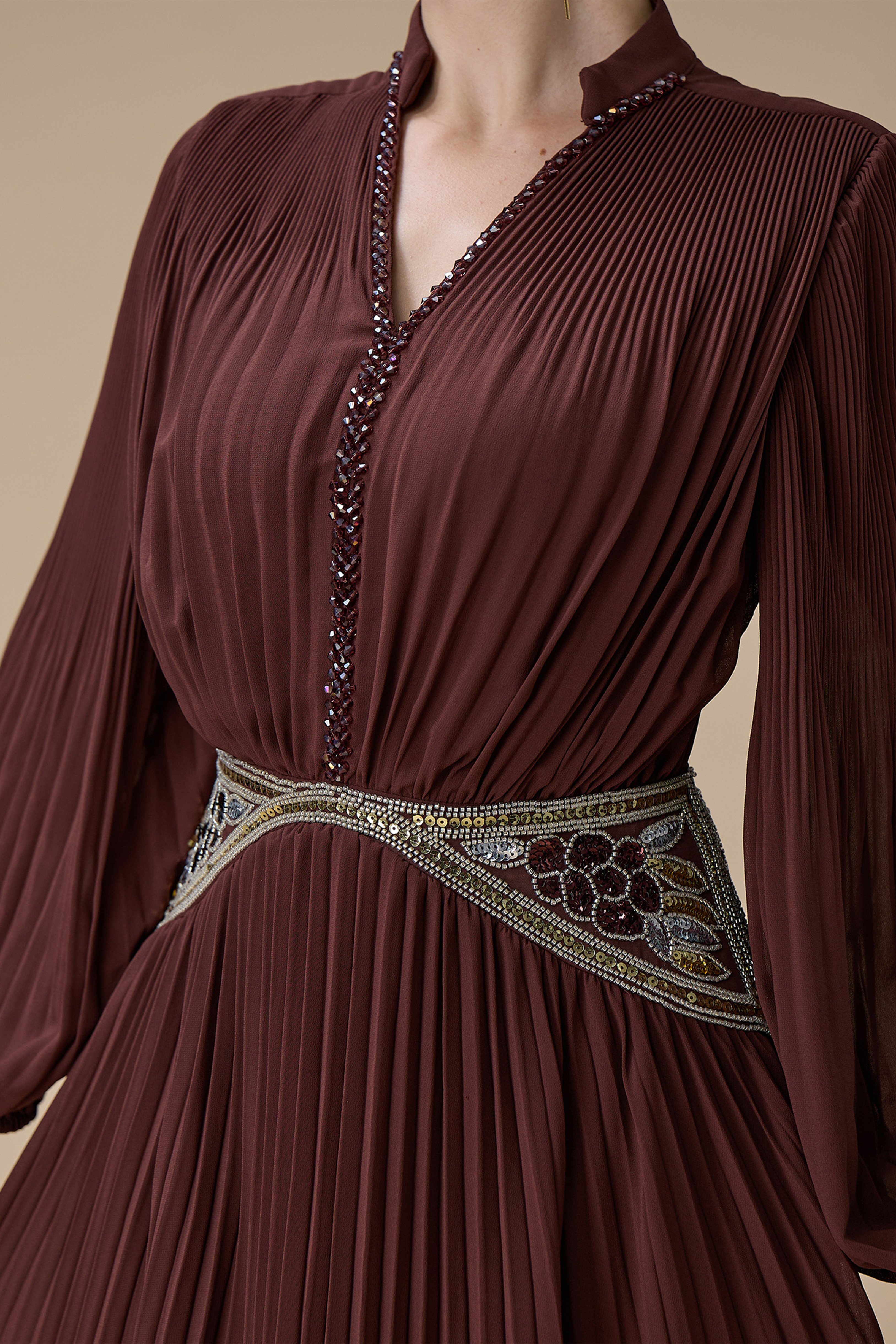 نوع القصة: فستان طويل بني بكسرات مزين بترتر بأكمام طويلة وياقة v