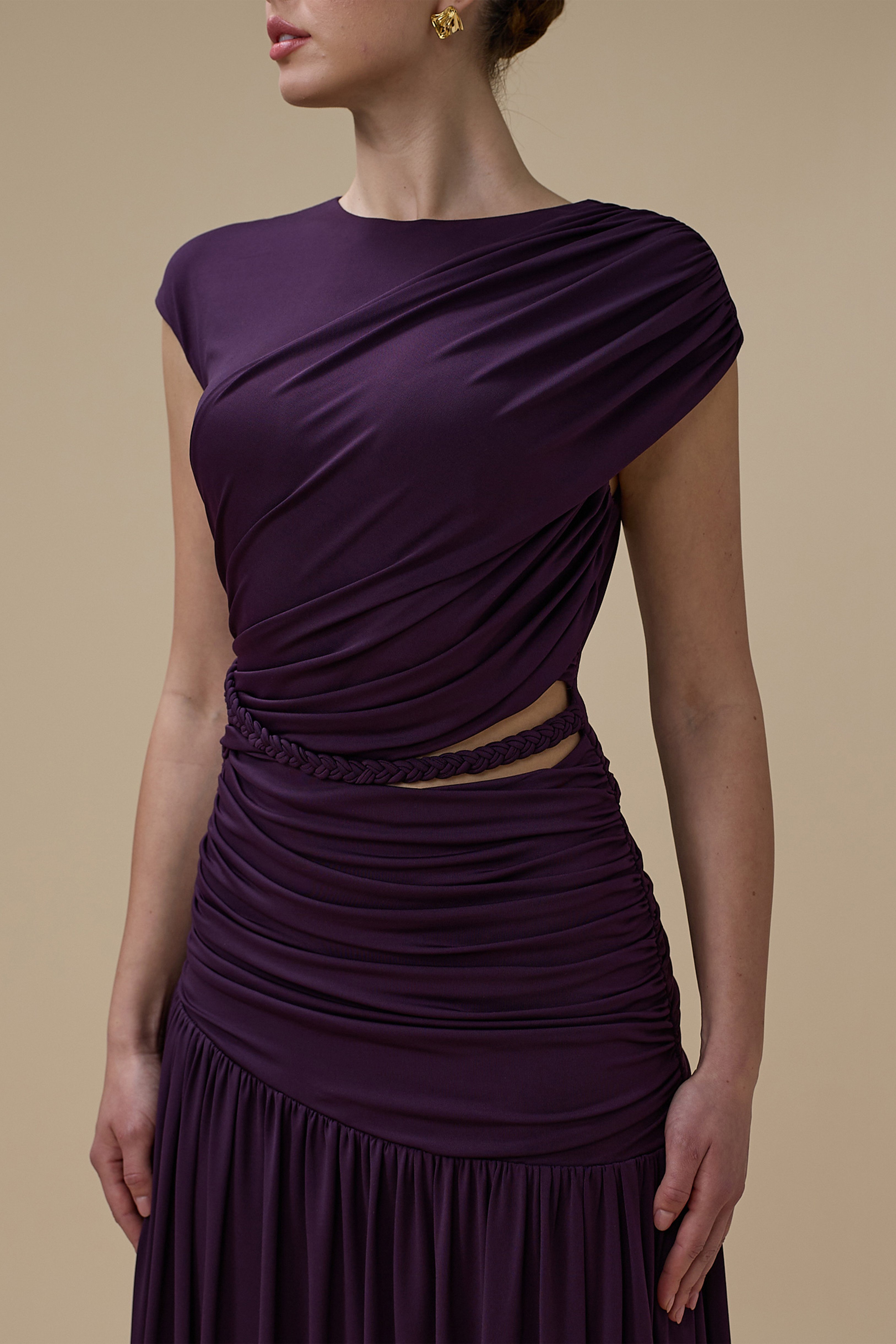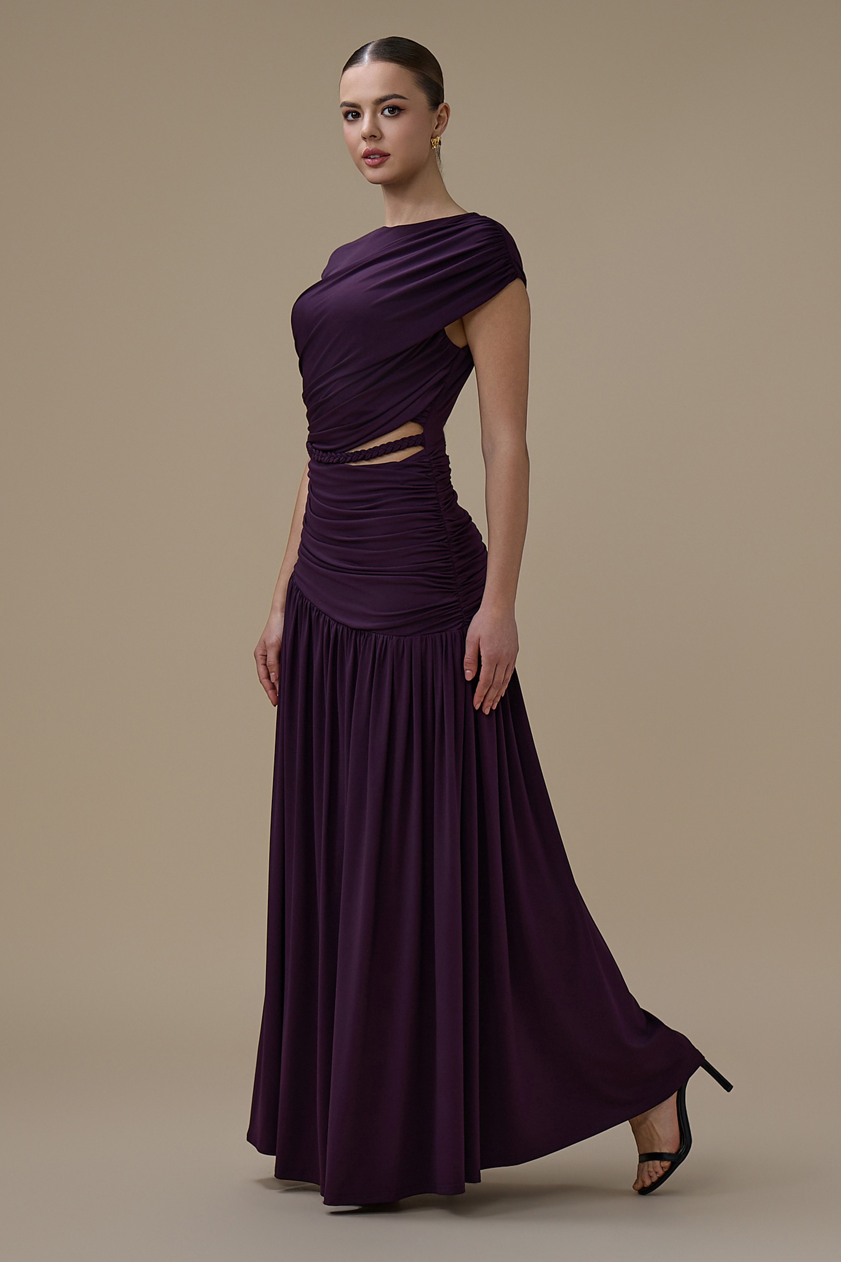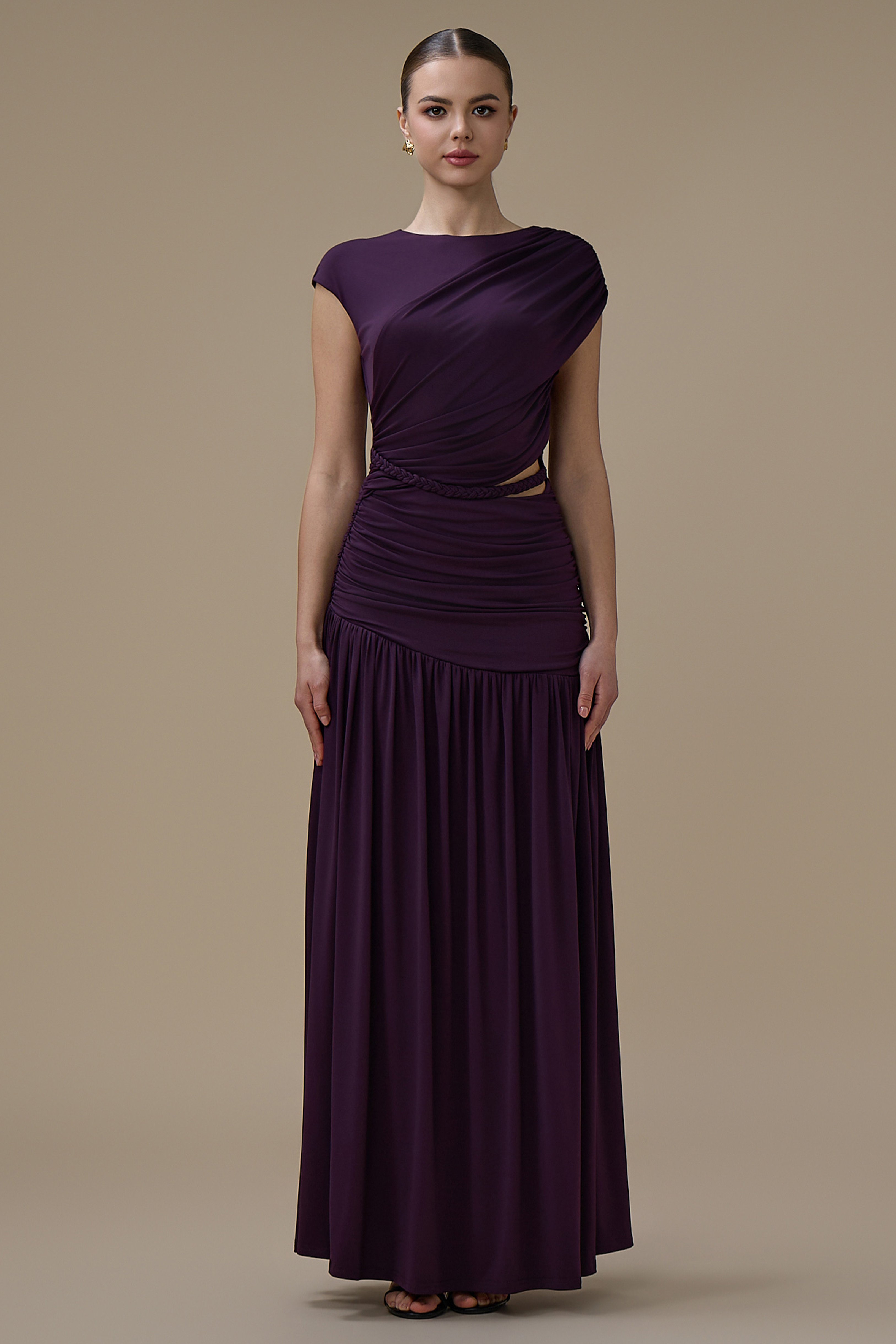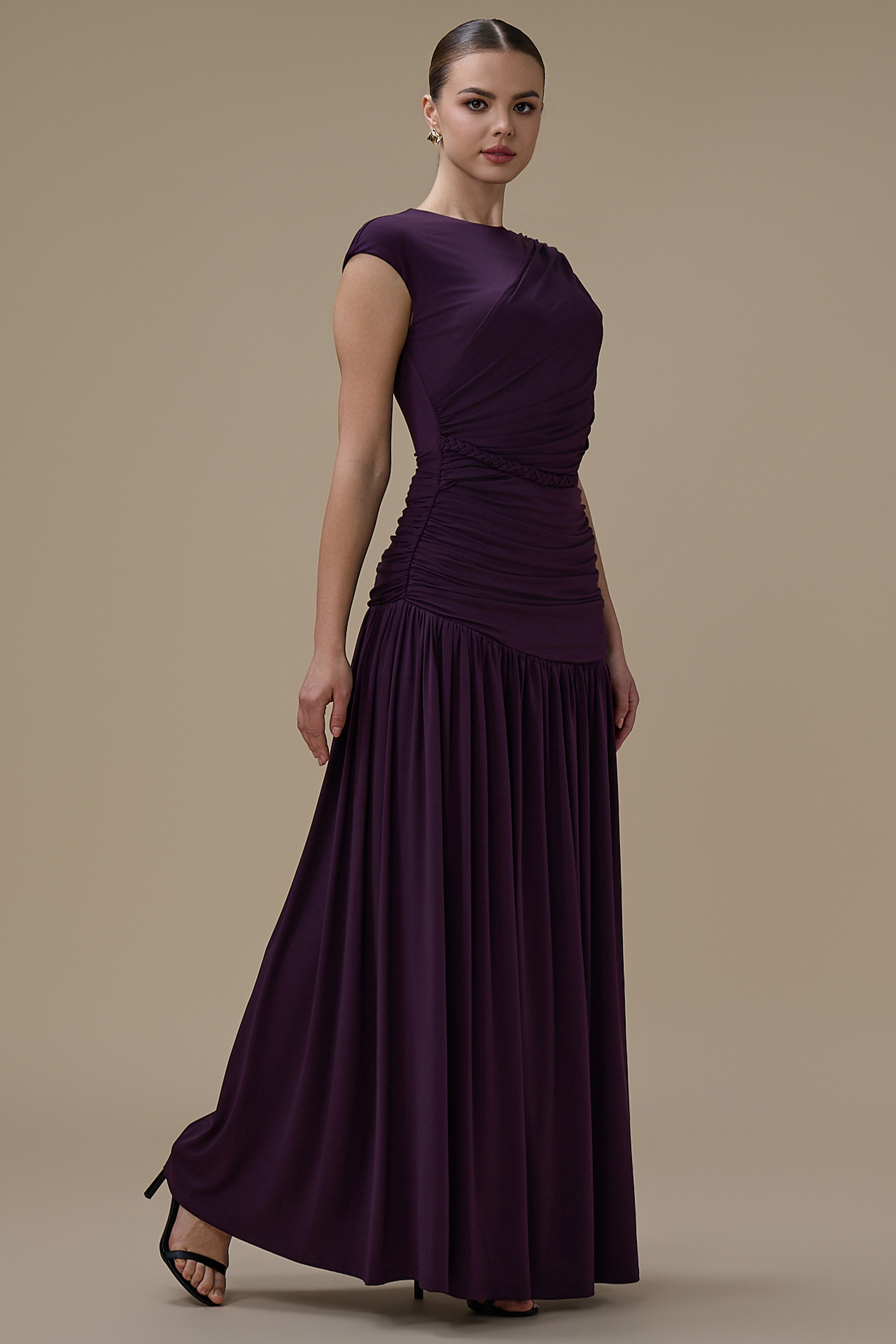 نوع القصة: فستان طويل بنفسجي درابيه بفتحة من الخصر وشكل حزام مضفّر بياقة مستديرة