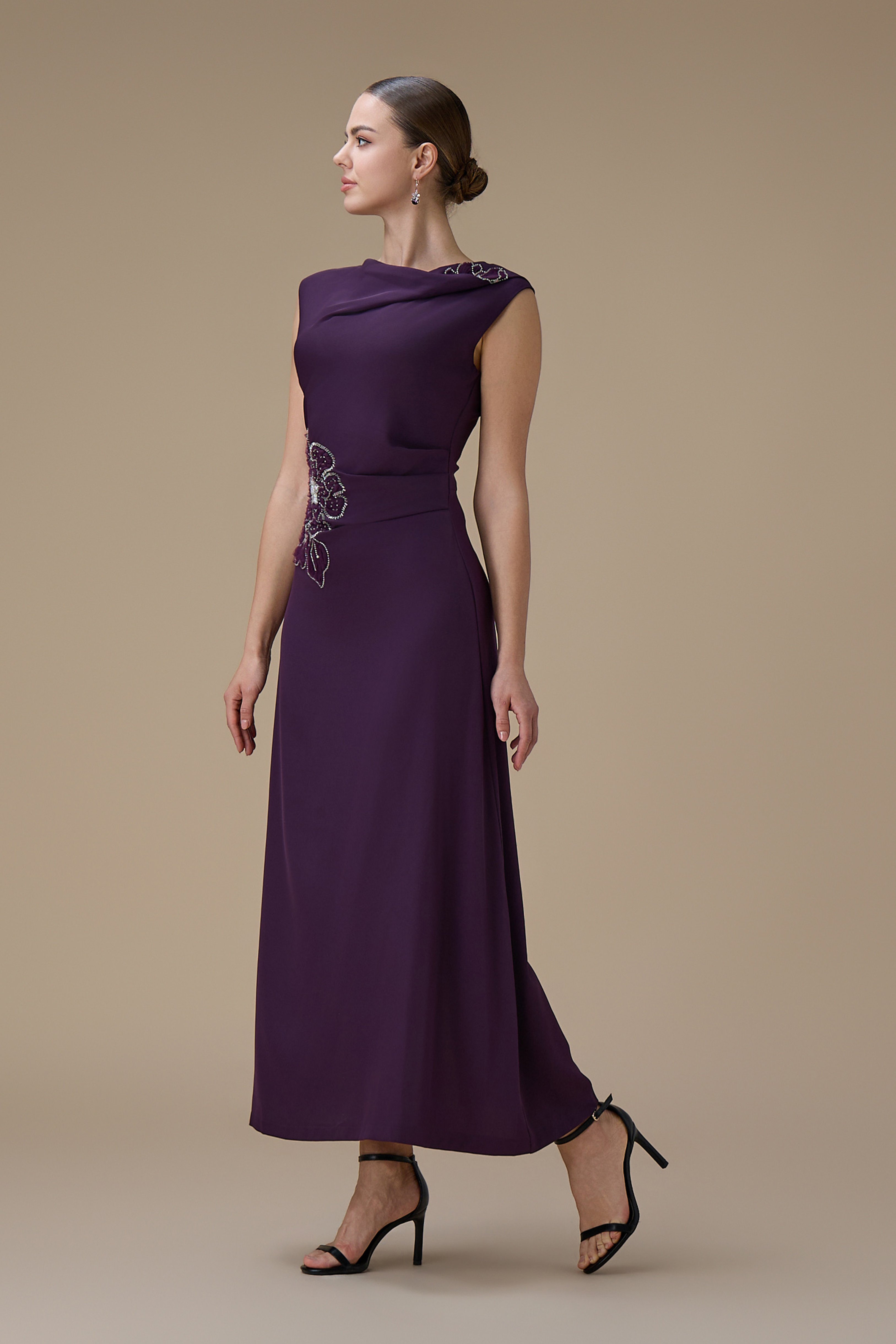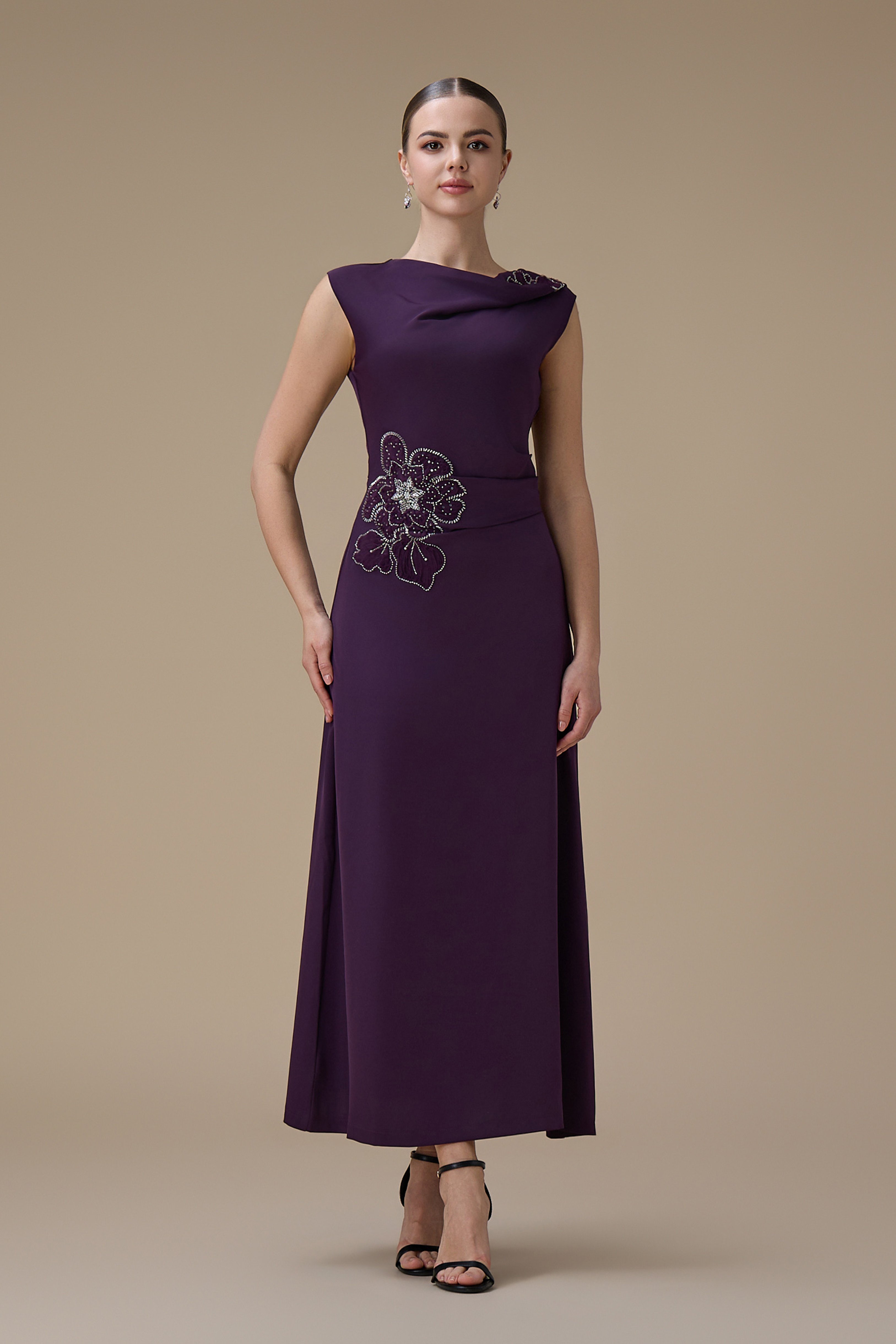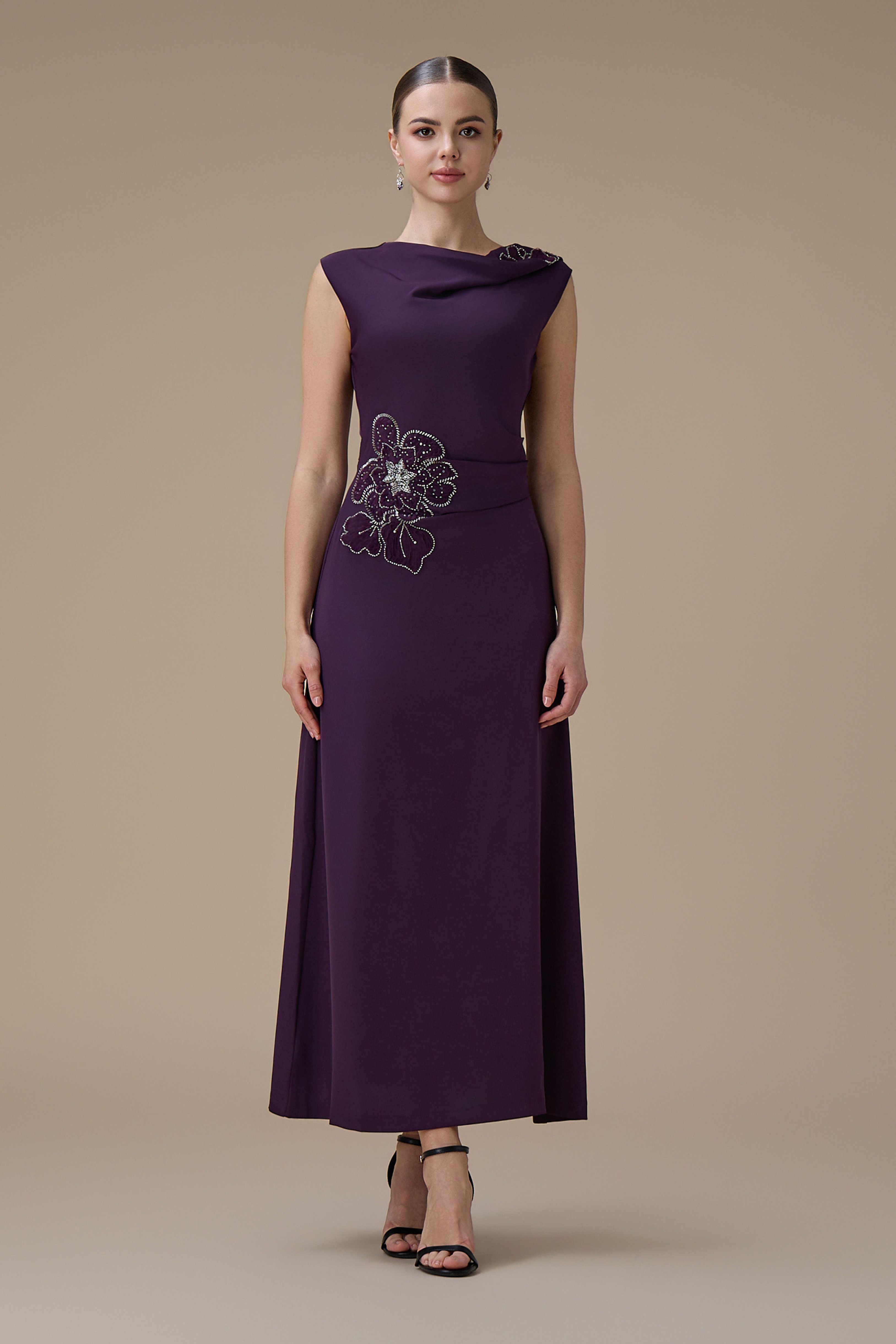 نوع القصة: فستان ماكسي بلون بنفسجي مع تطريز زهري بياقة غير متماثلة