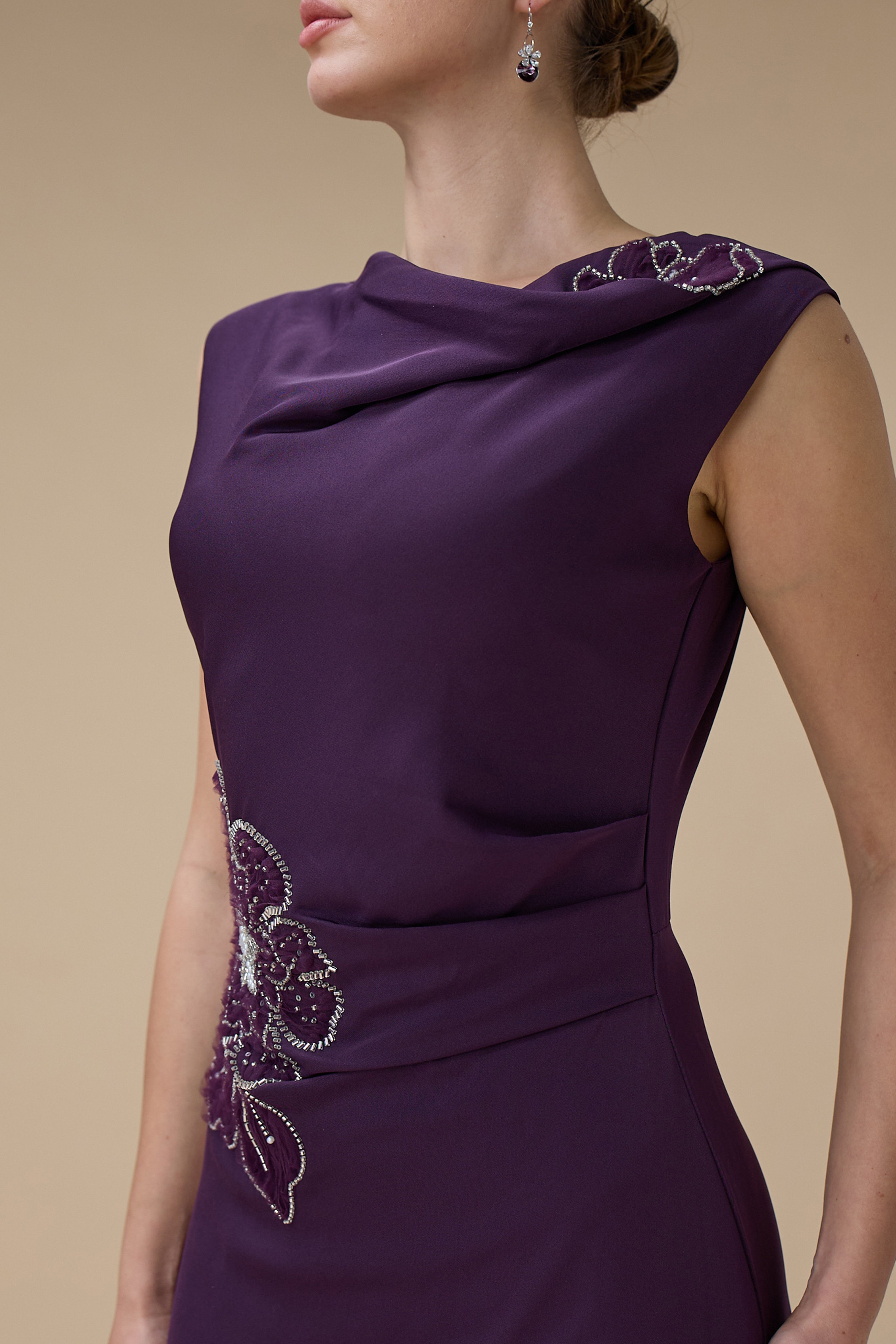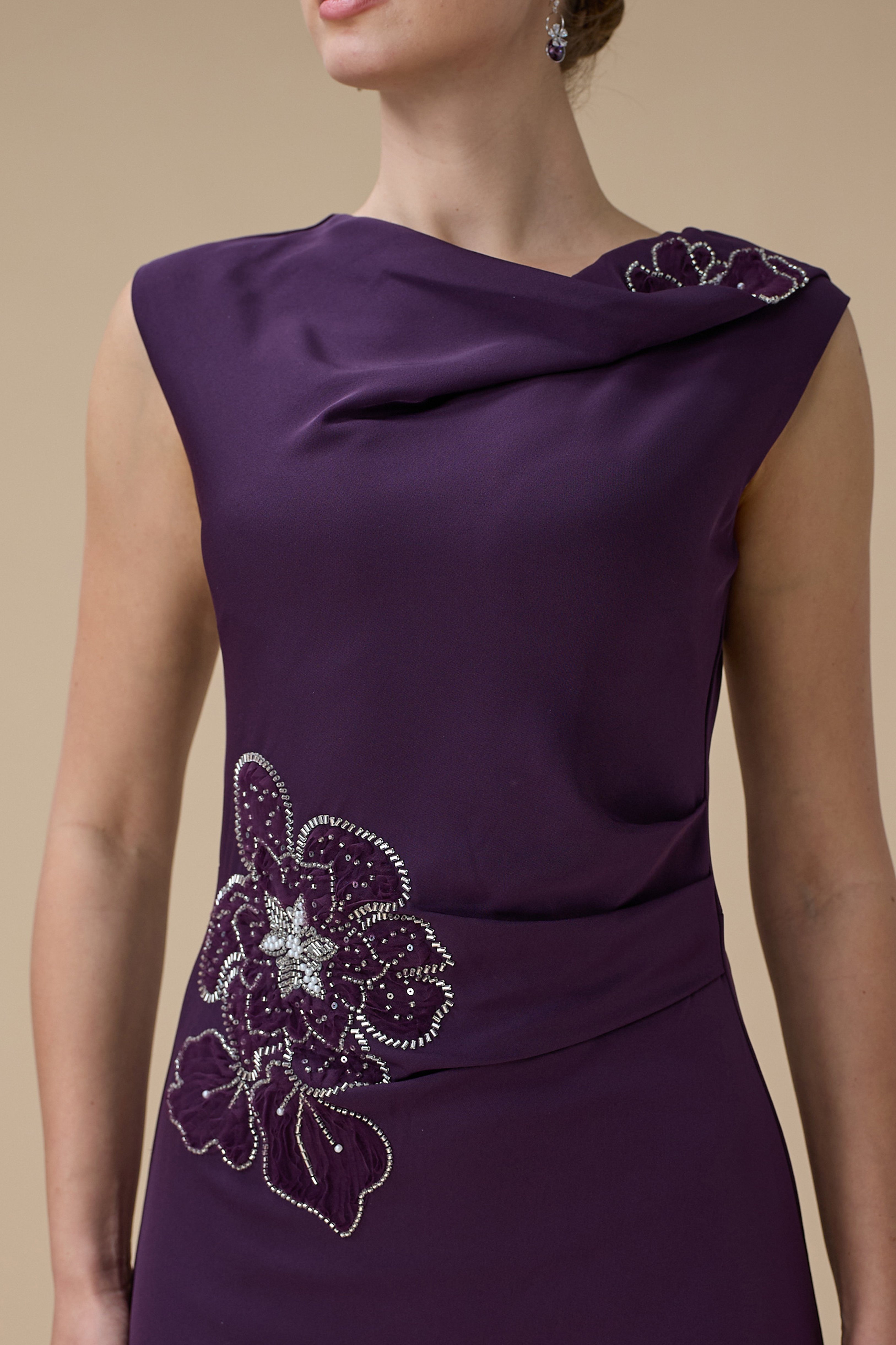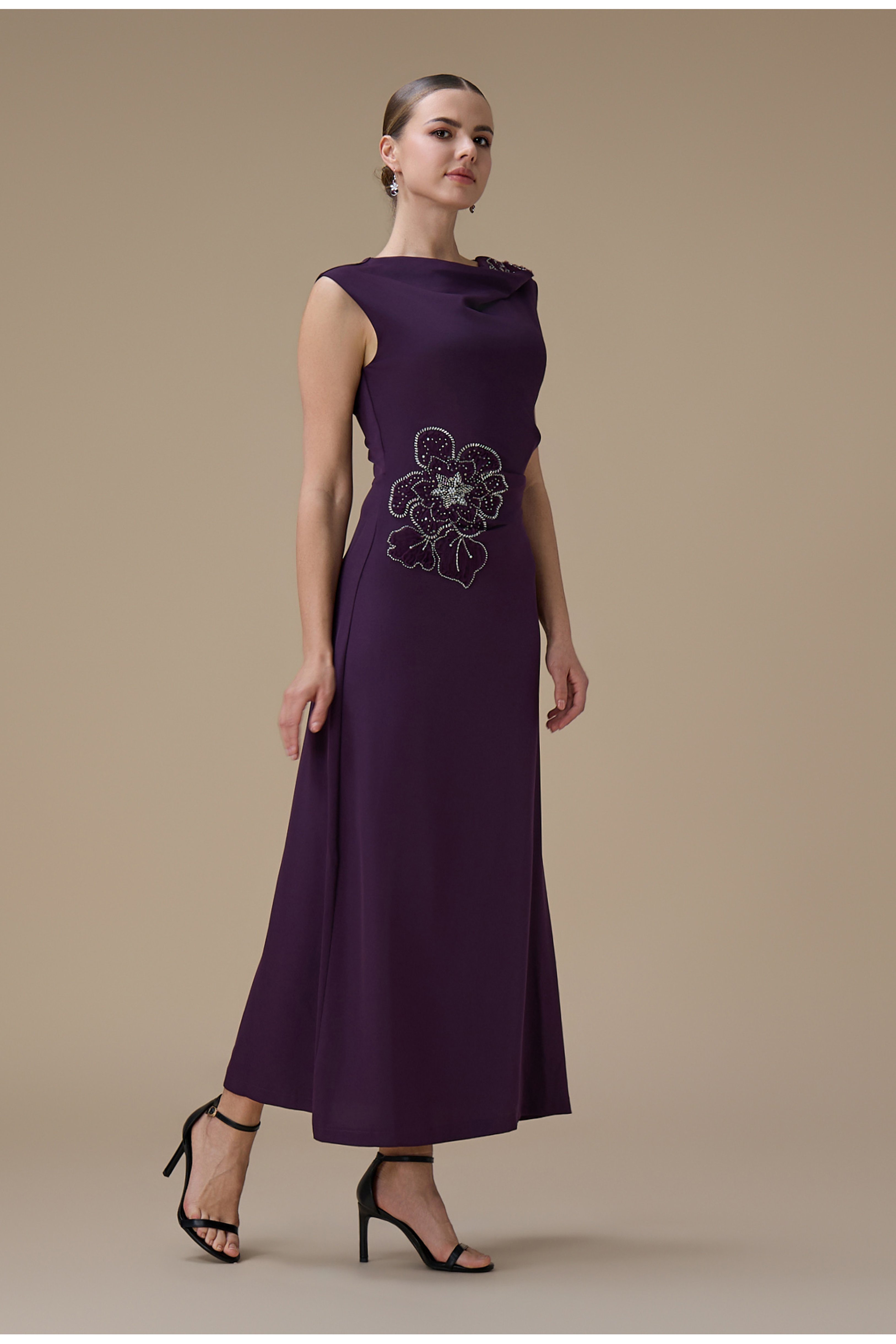 نوع القصة: فستان ماكسي بلون بنفسجي مع تطريز زهري بياقة غير متماثلة