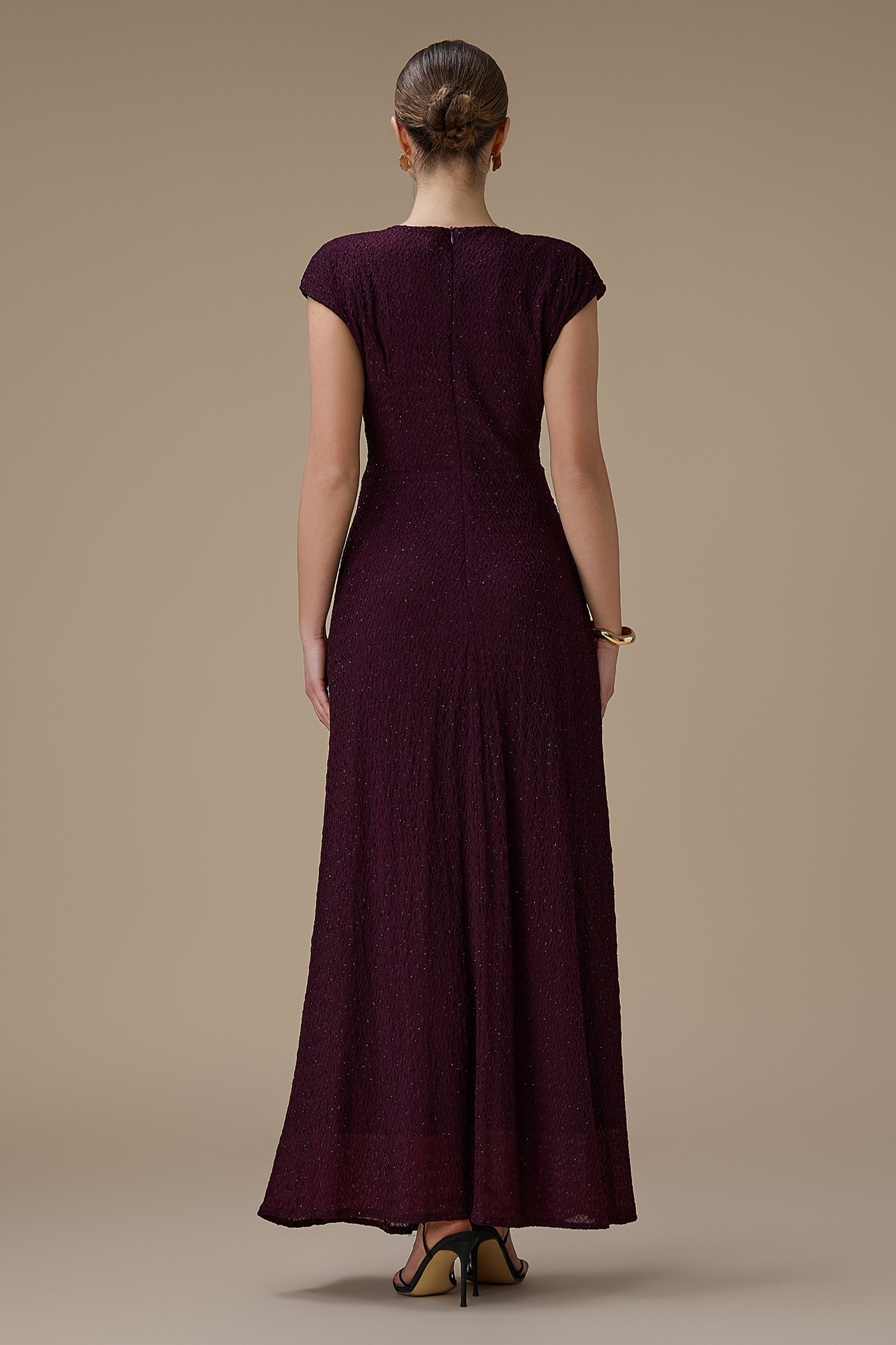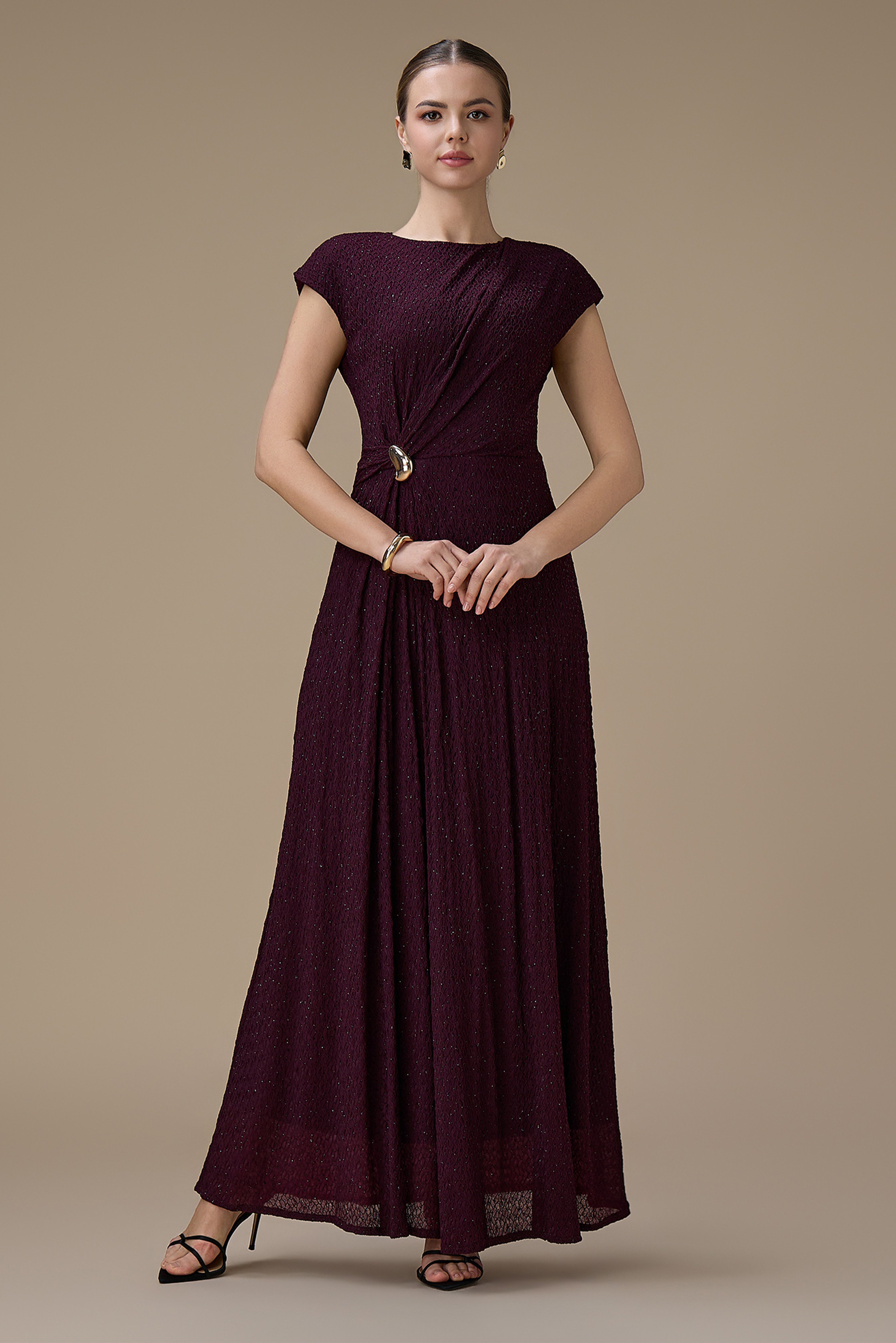 نوع القصة: فستان طويل بنفسجي بتفصيلية جانبية مطرز بأكمام قصيرة وياقة دائرية