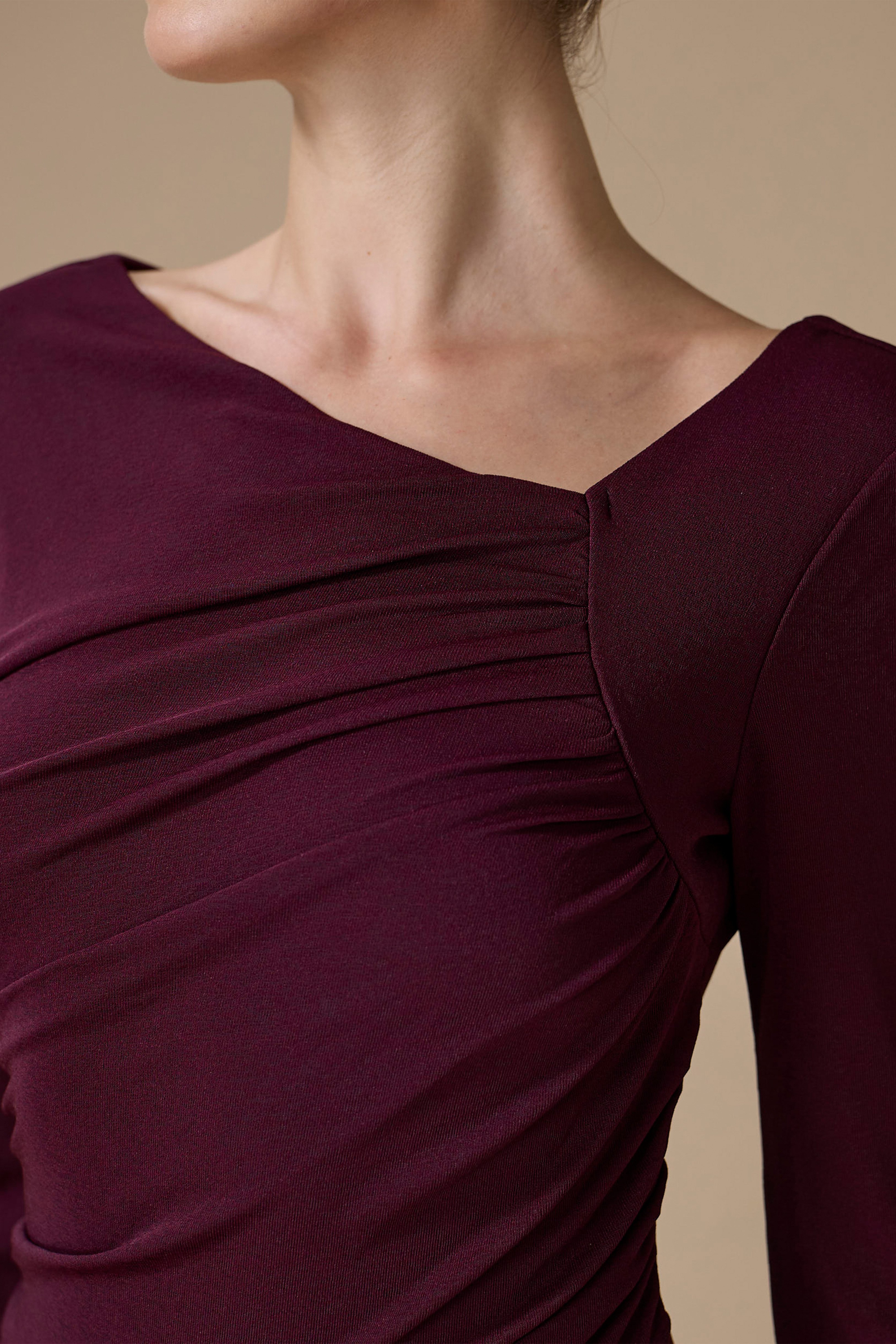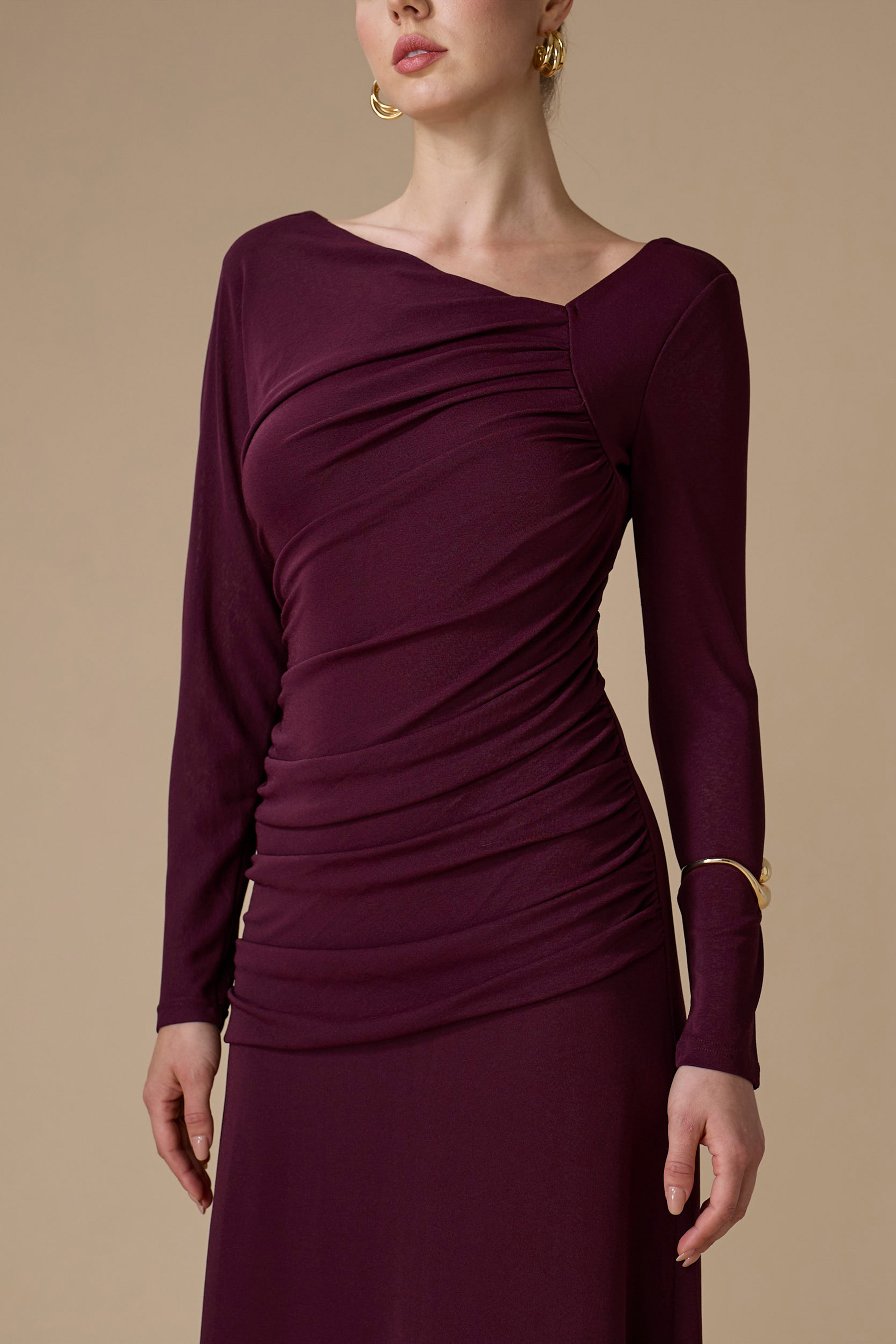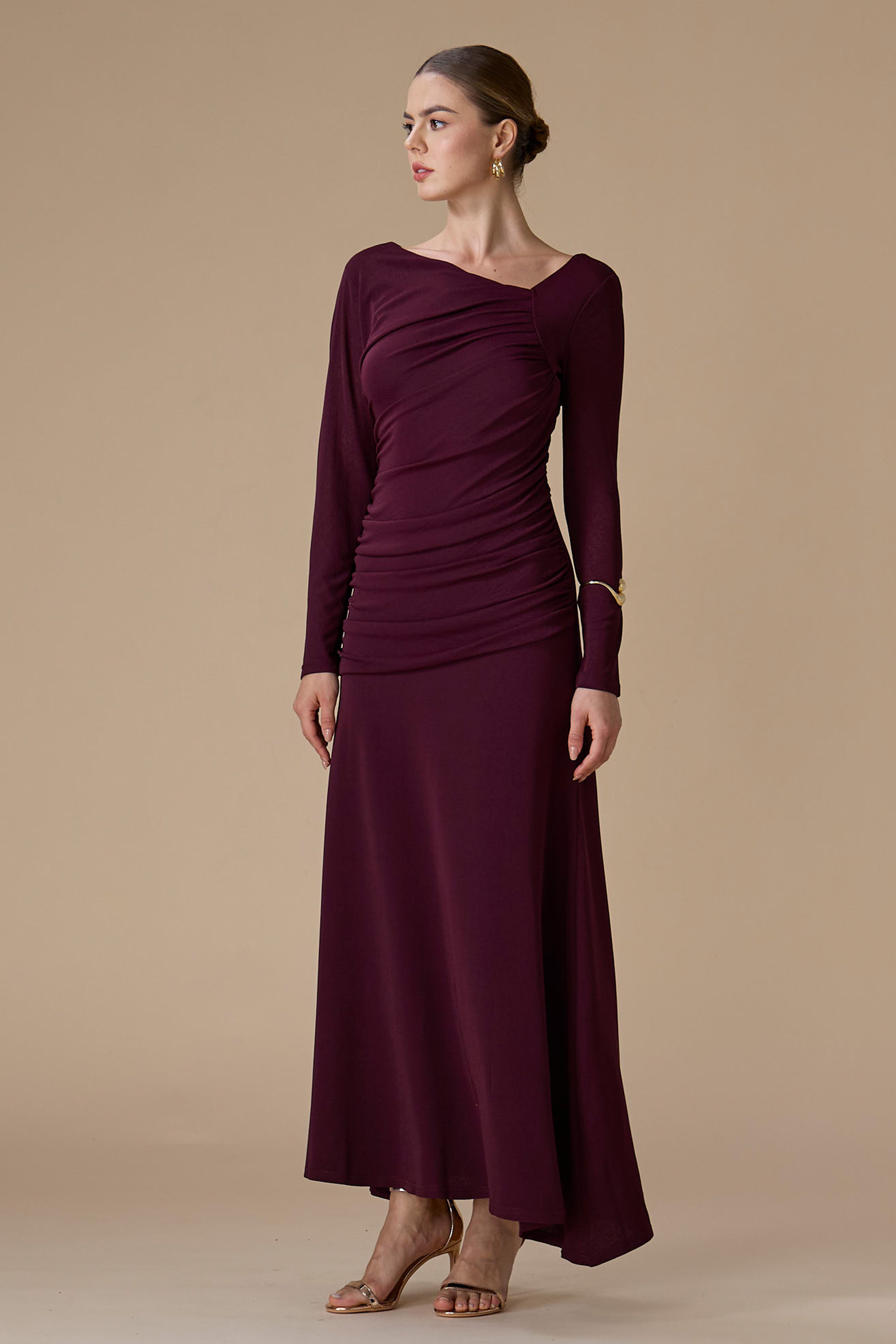 - نوع القصة: فستان بنفسجي درابيه طويل بقصة مستقيمة بياقة غير متماثلة وأكمام طويلة ضيقة