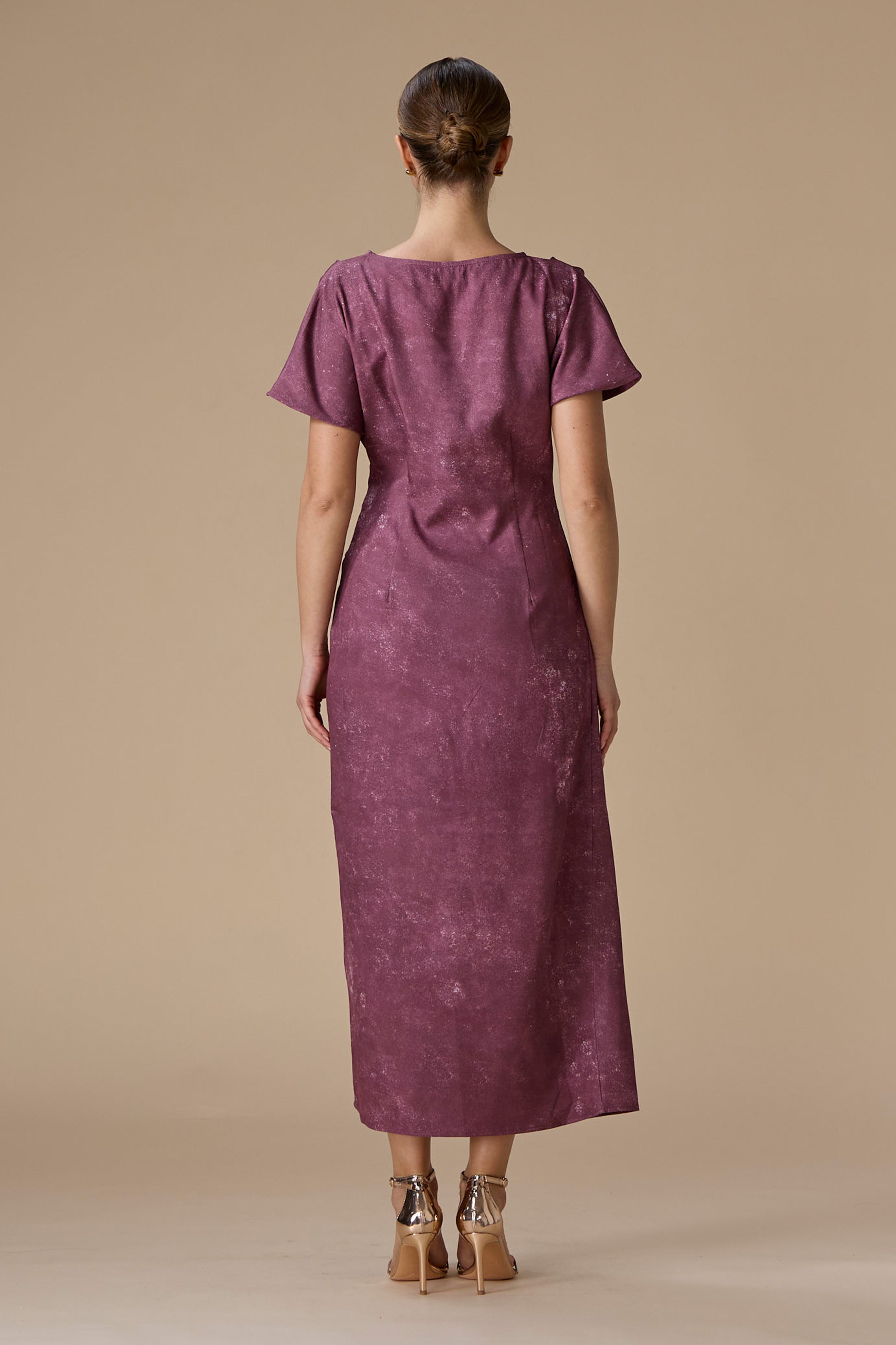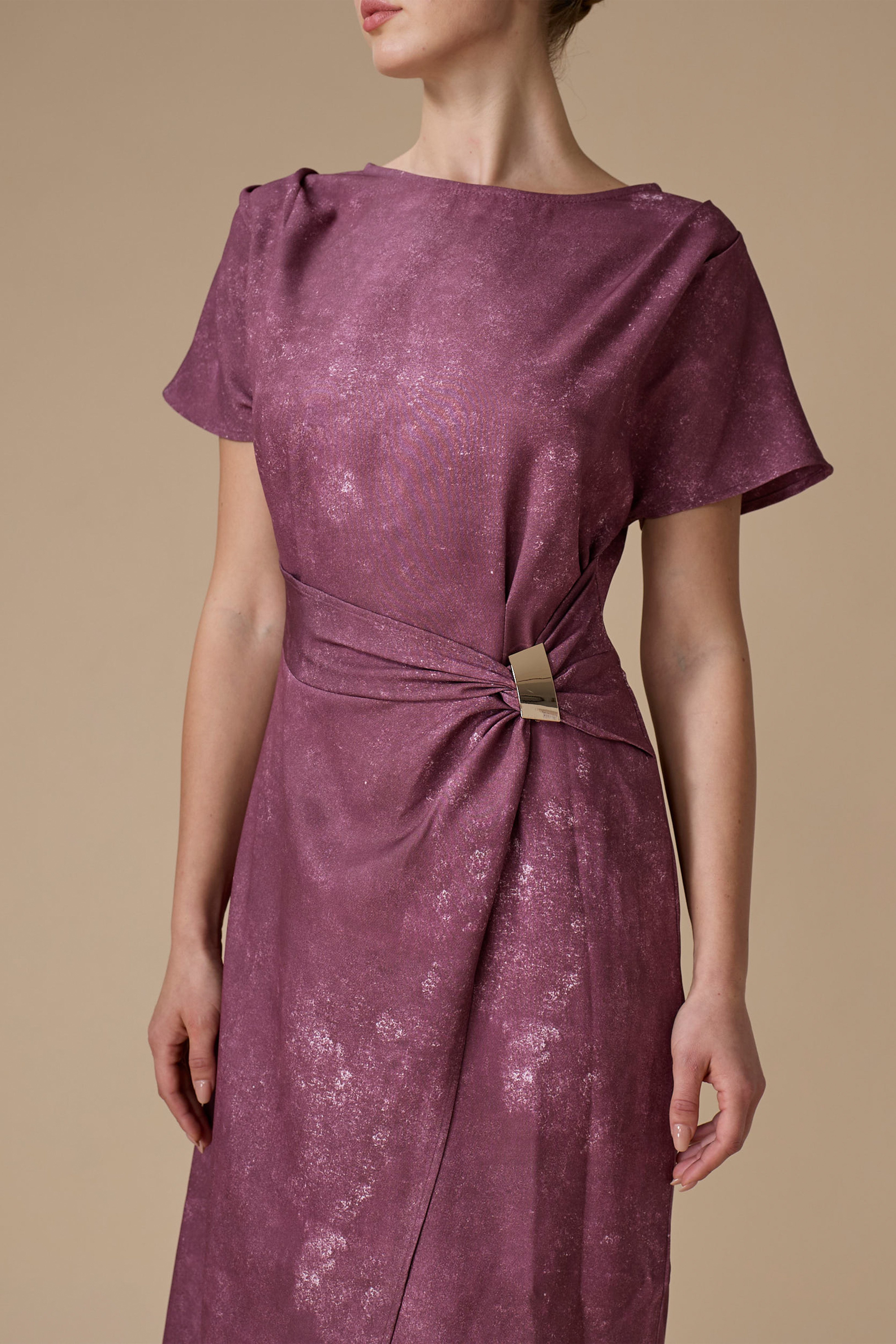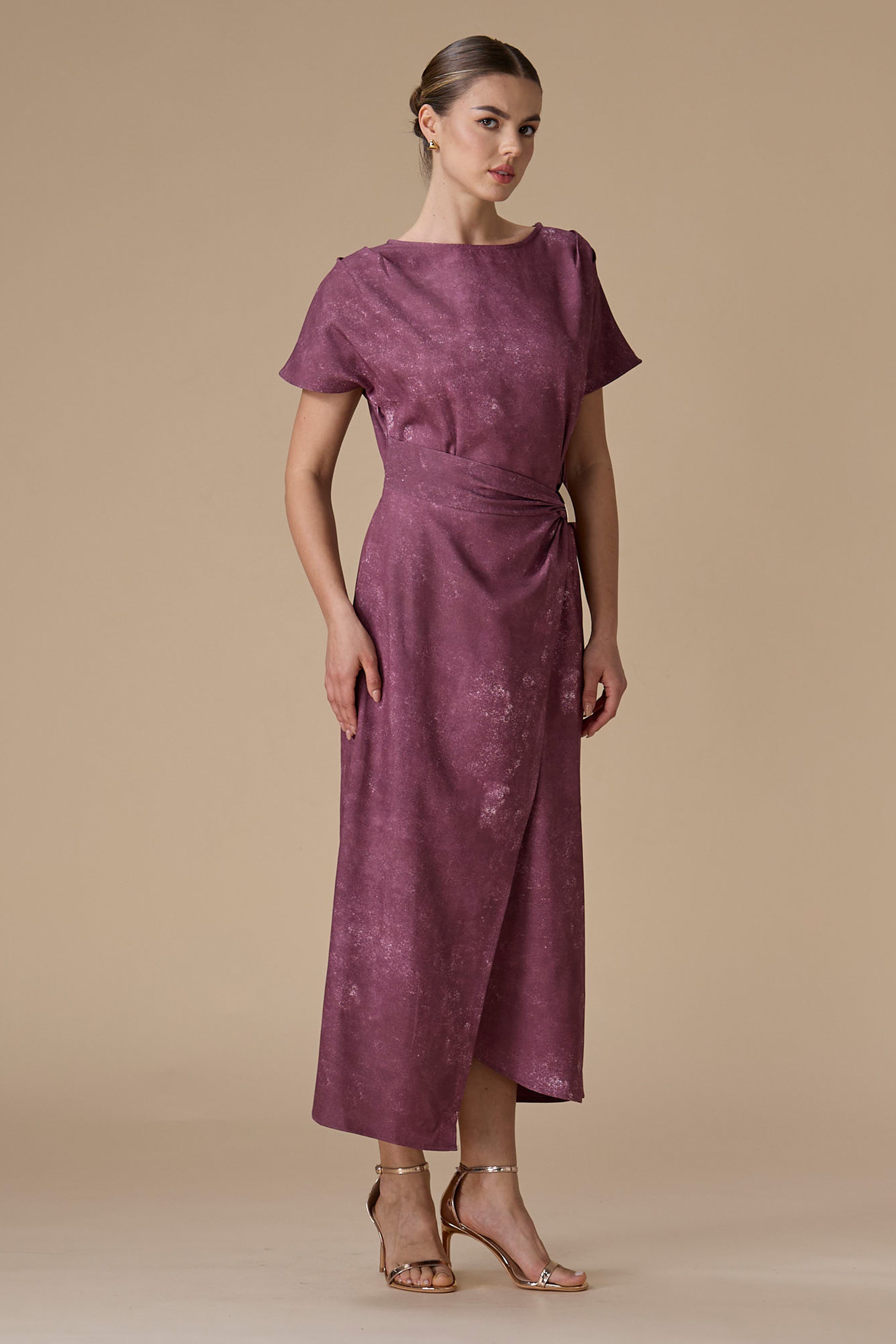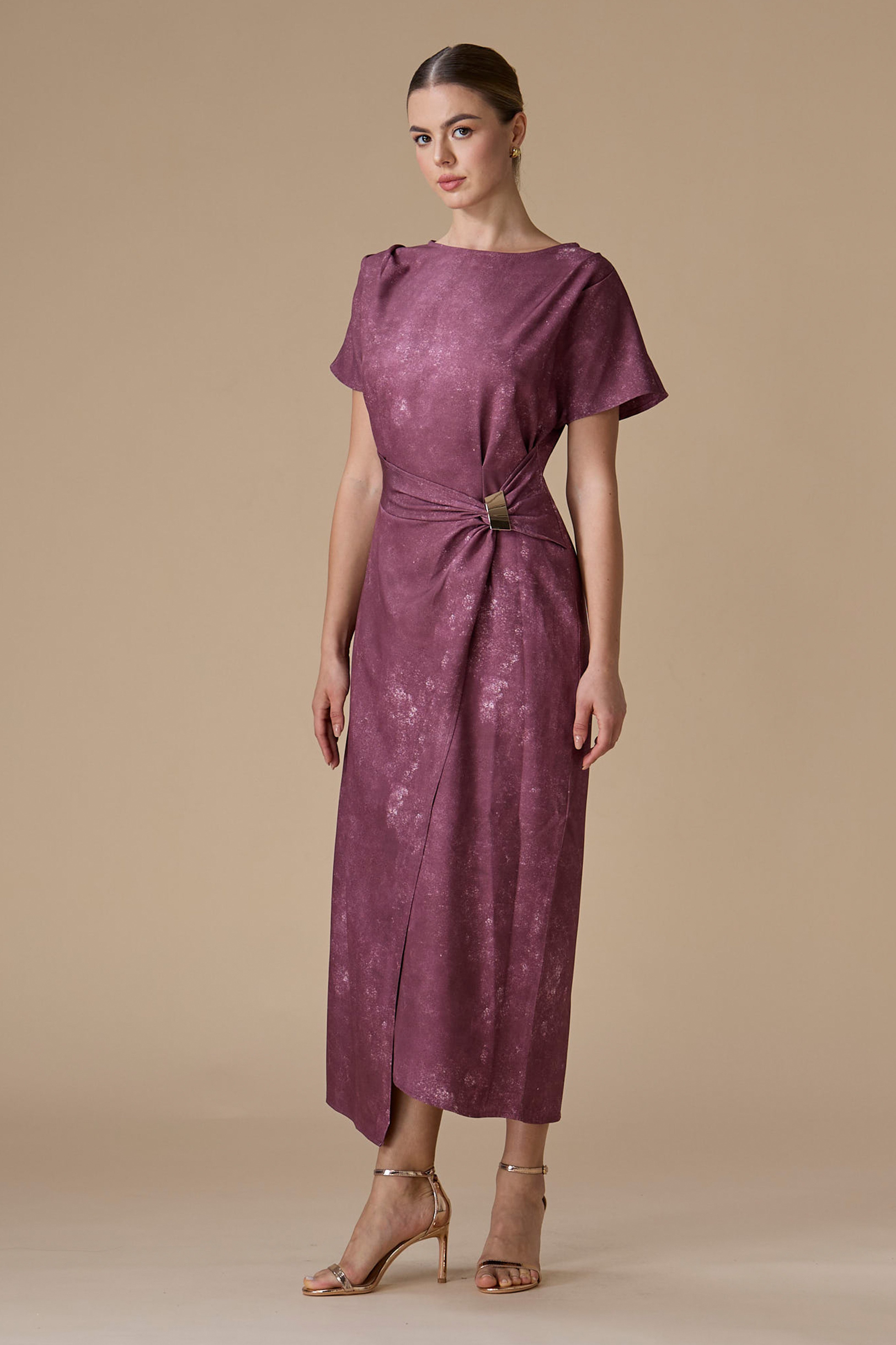 فستان وردي ماكسي بدرابيه جانبي بمشبك أنيق