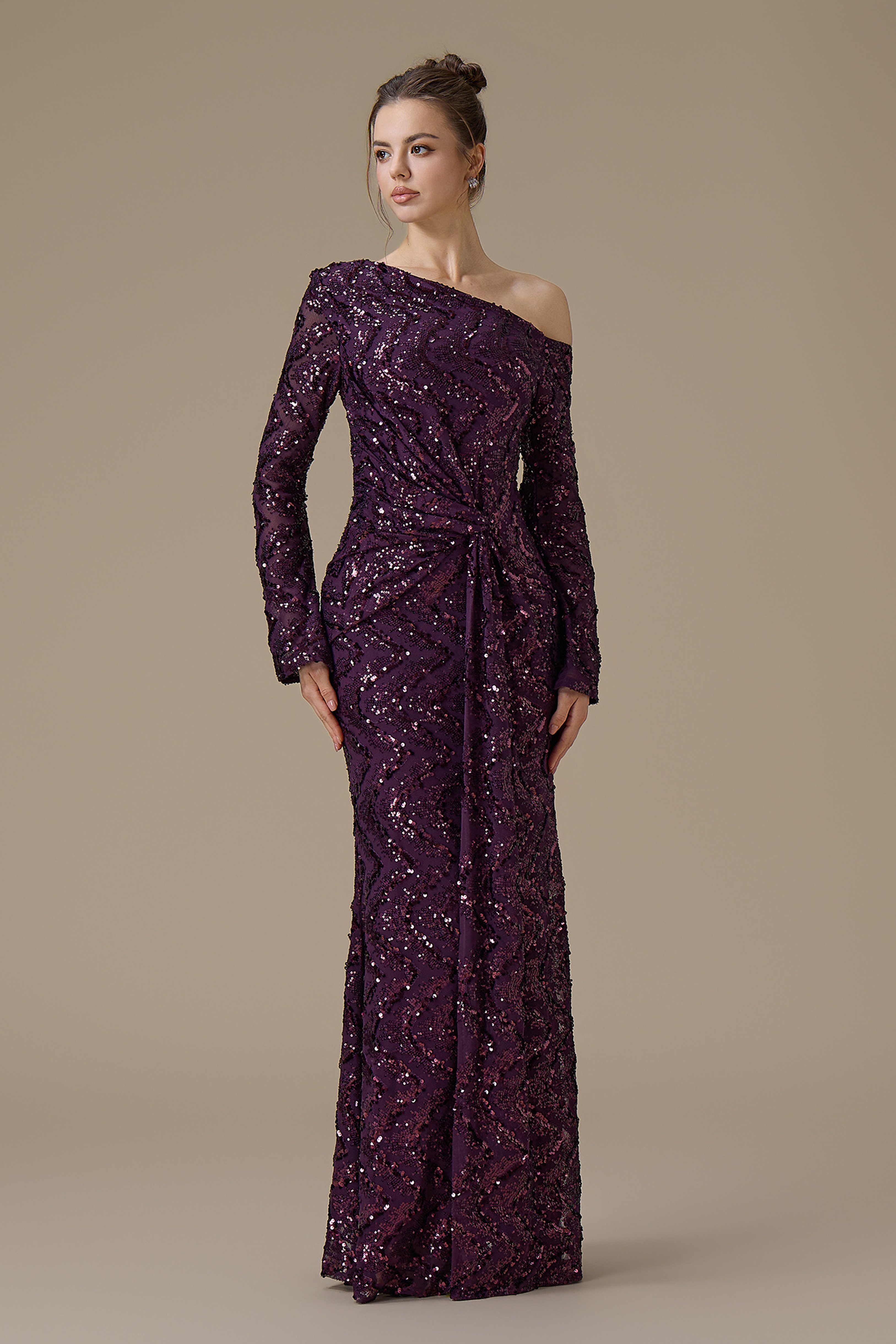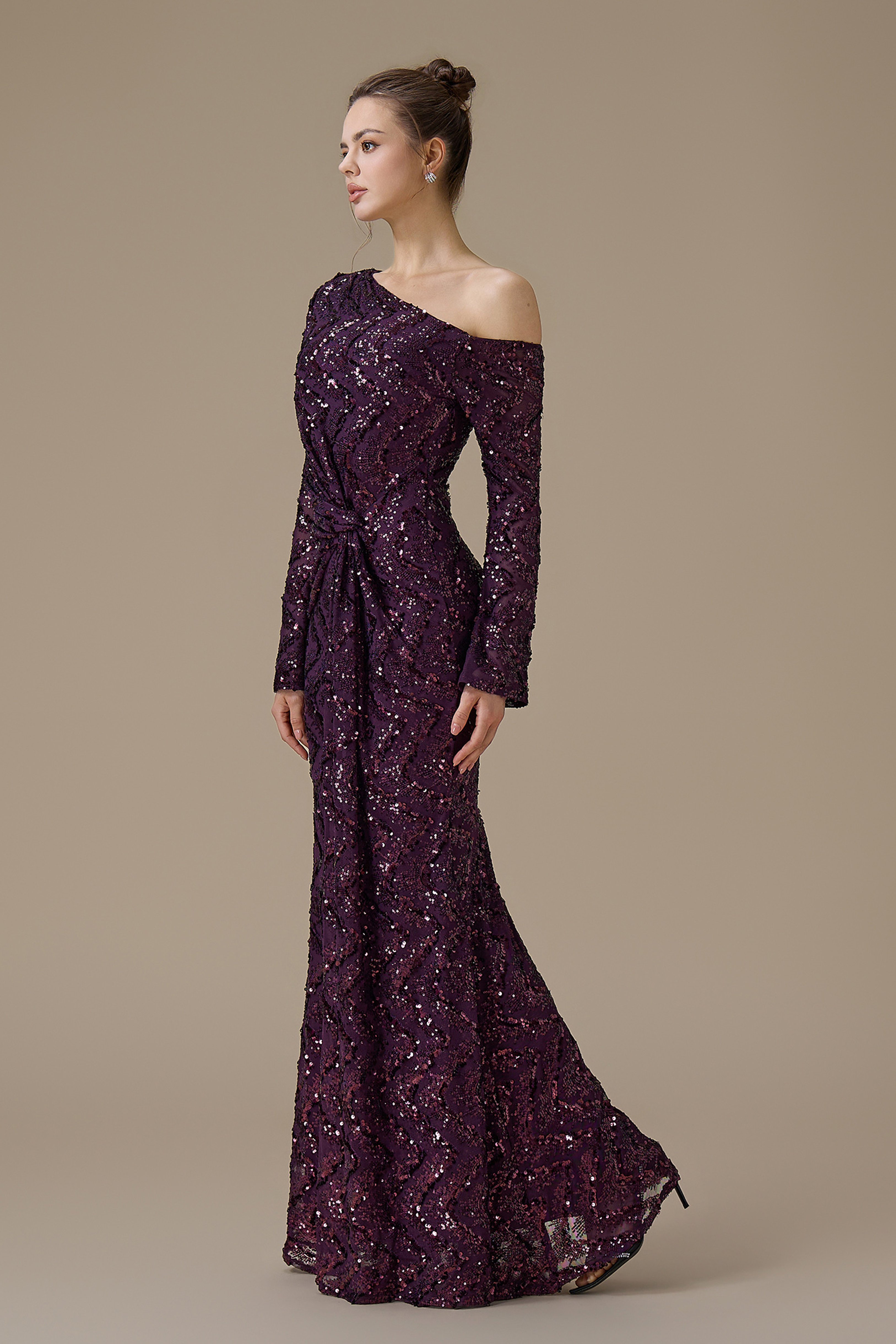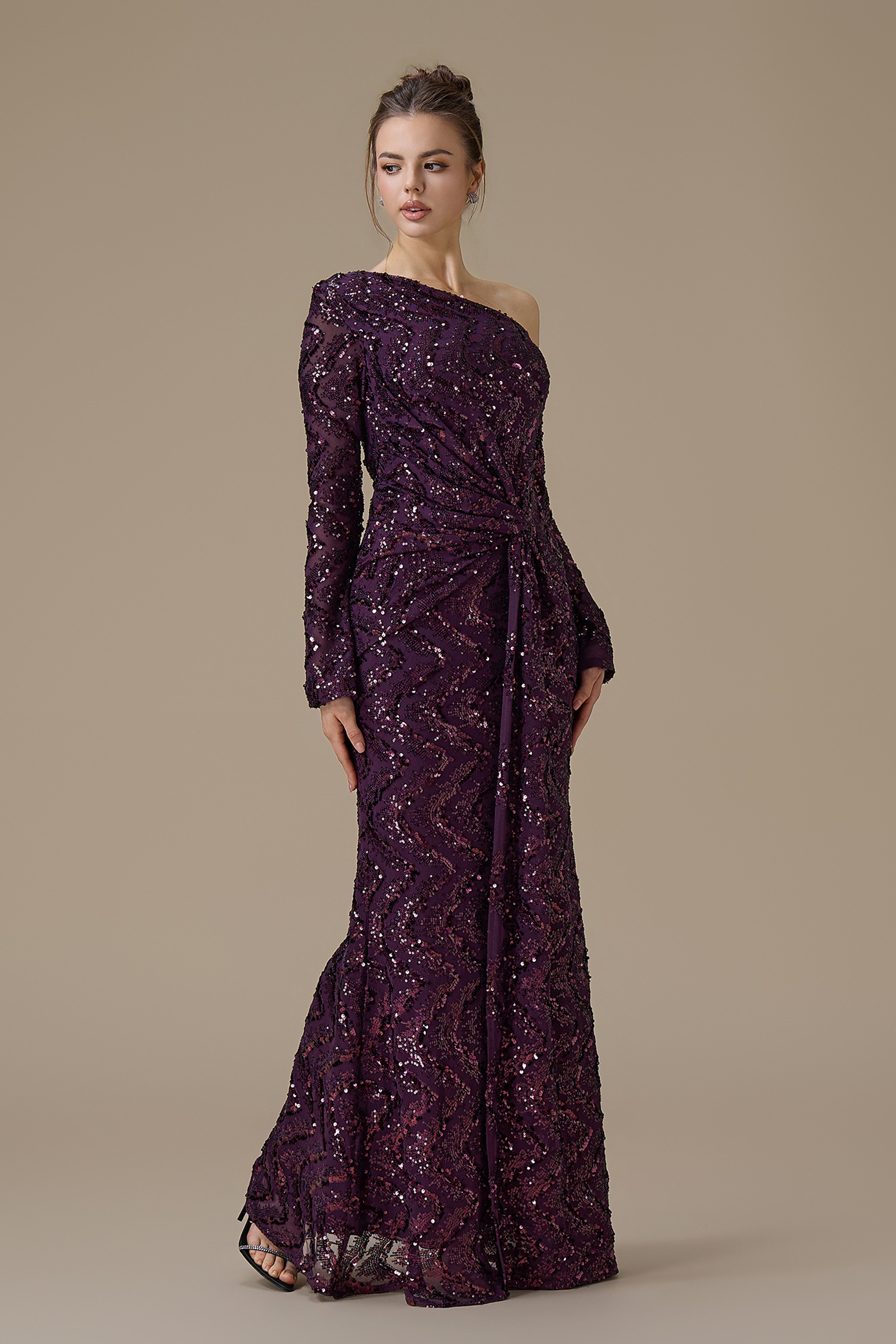 فستان سهرة طويل بنفسجي بكتف واحد مزموم الخصر بأكمام طويلة
