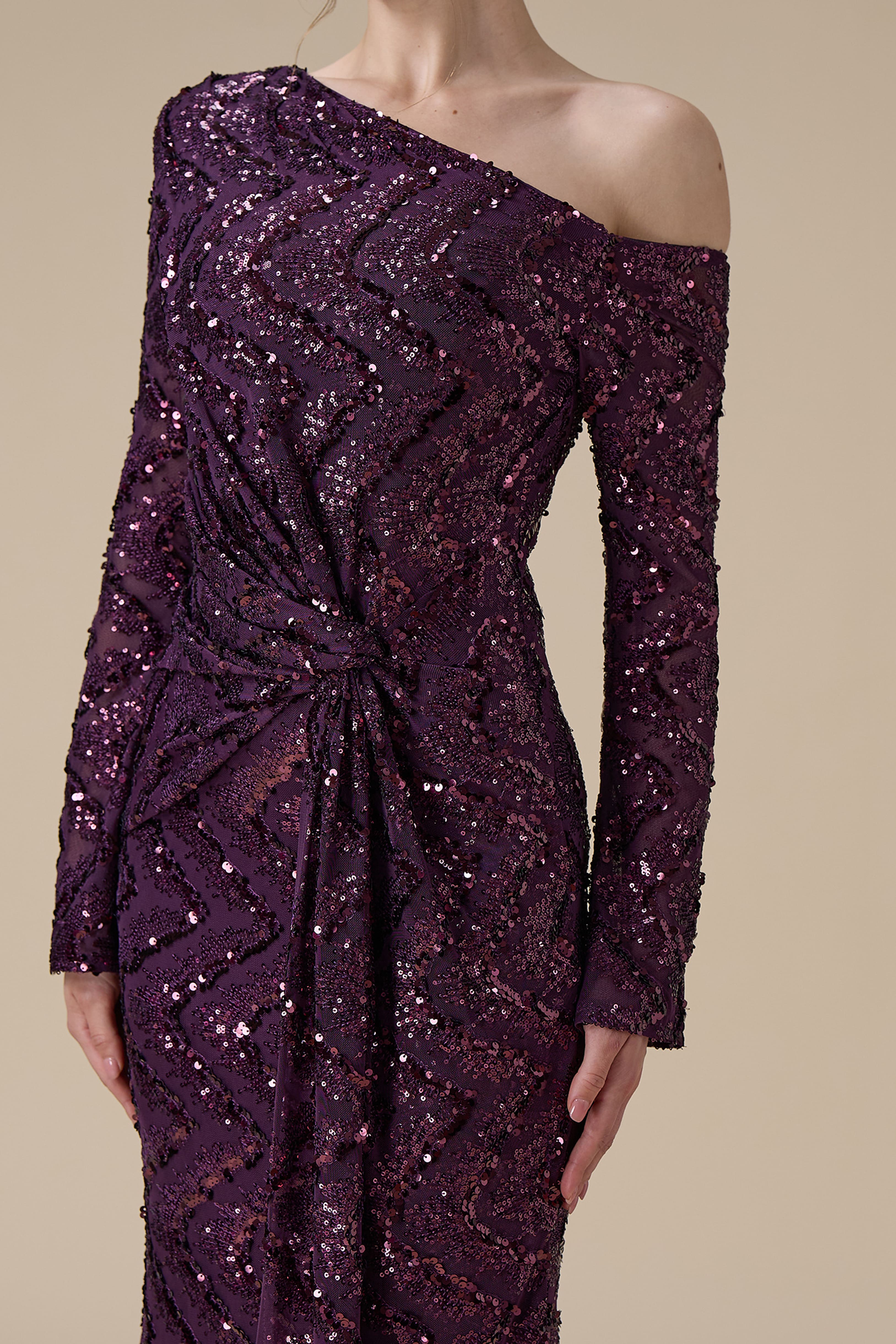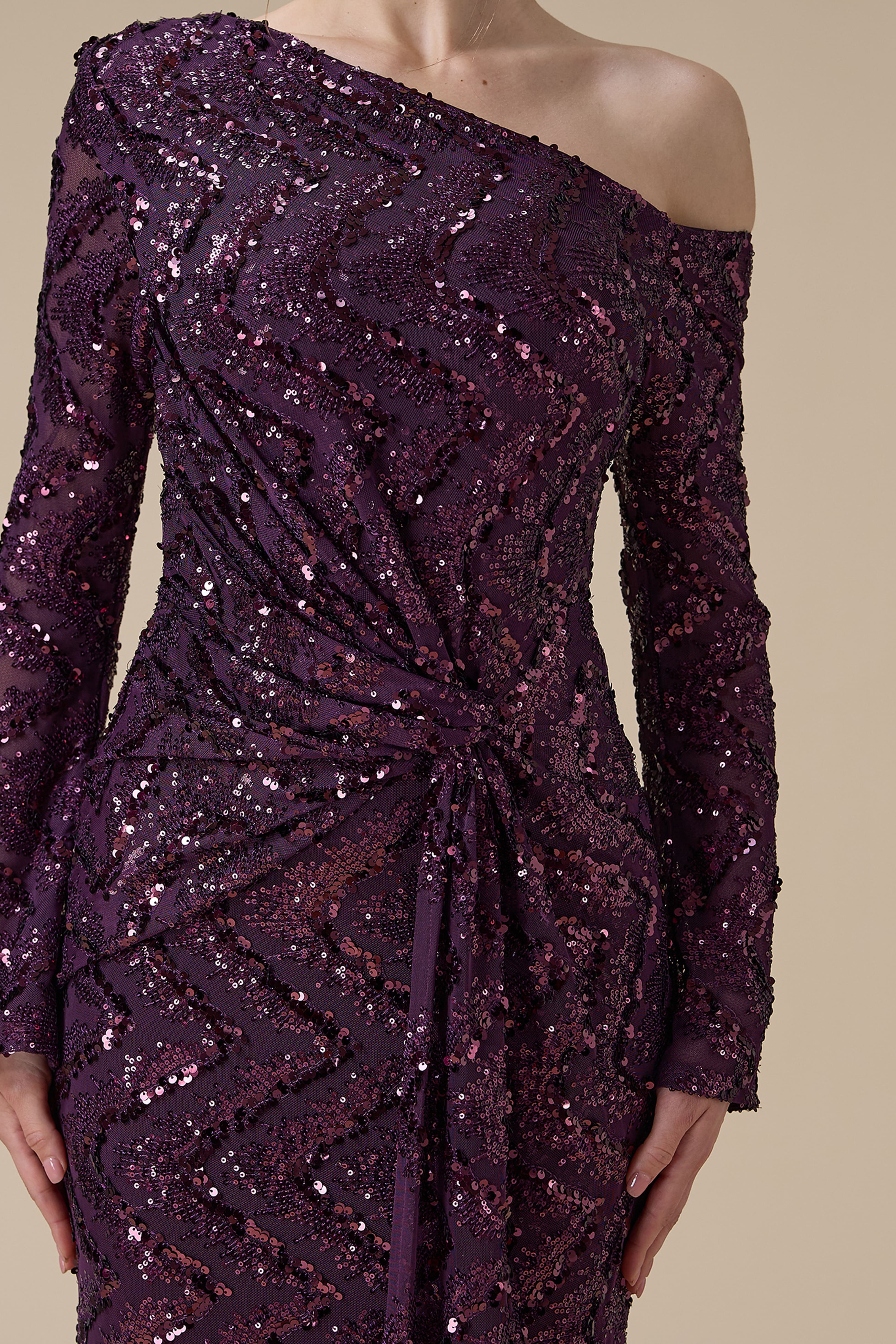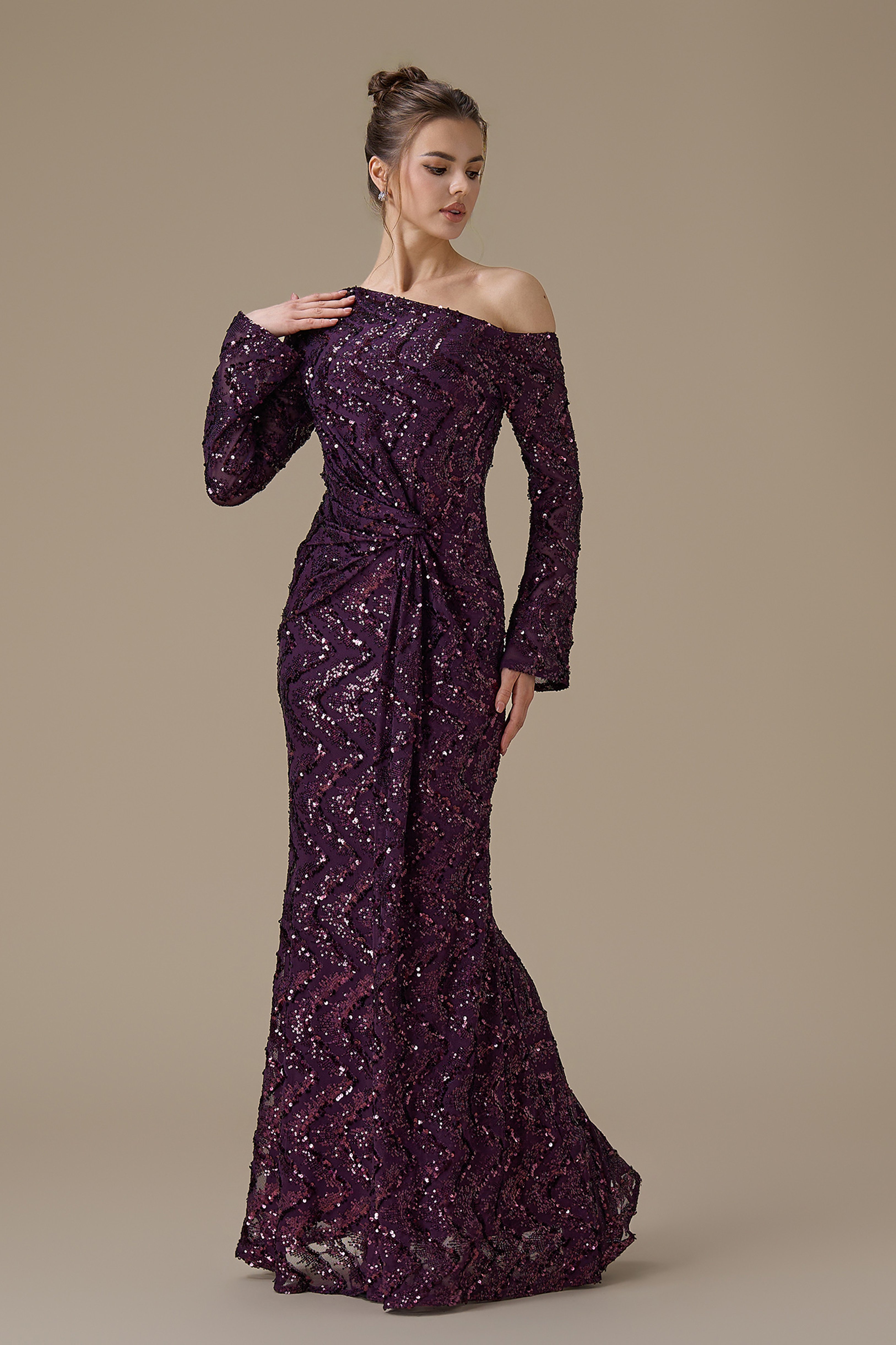 فستان سهرة طويل بنفسجي بكتف واحد مزموم الخصر بأكمام طويلة
