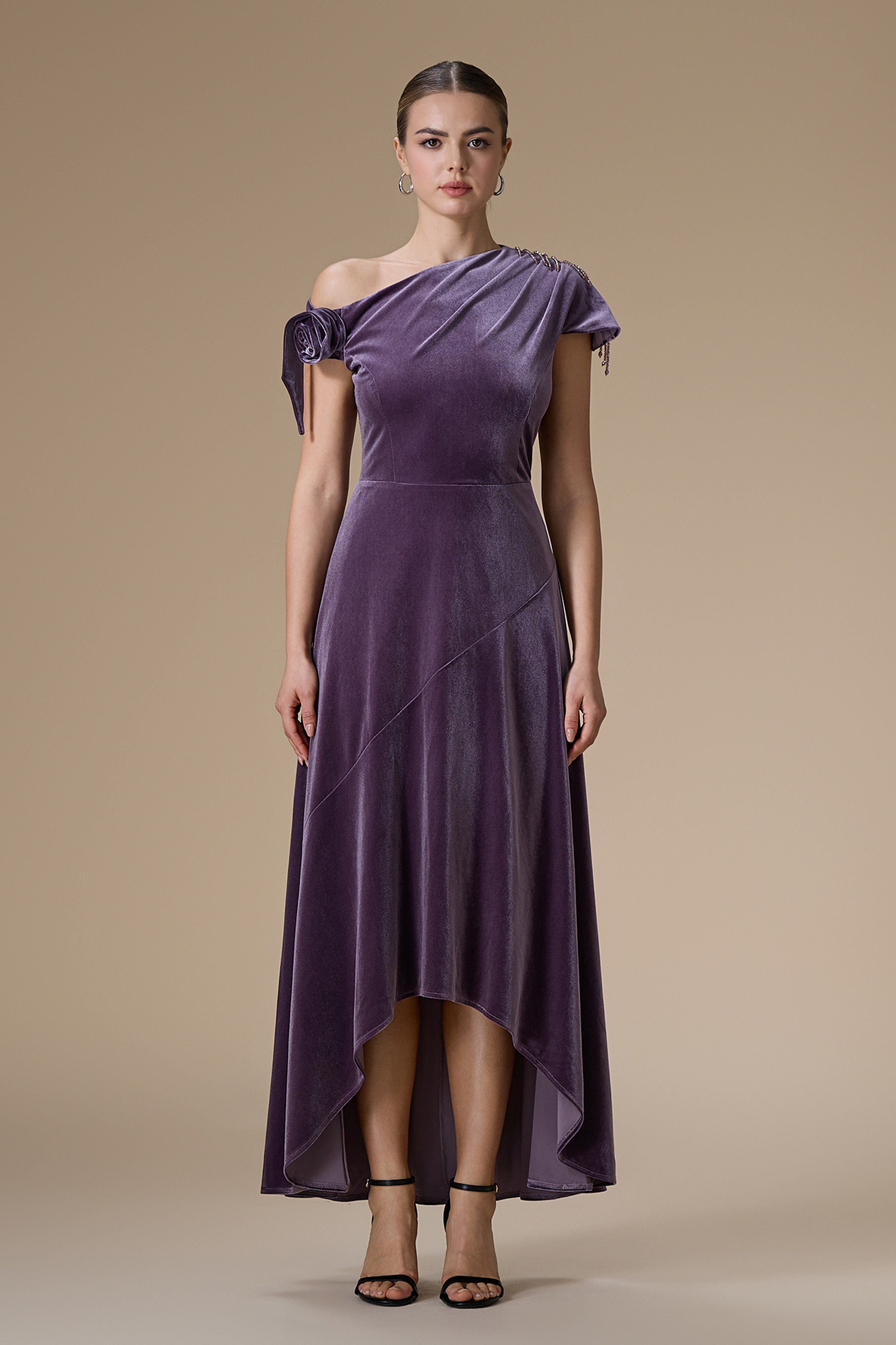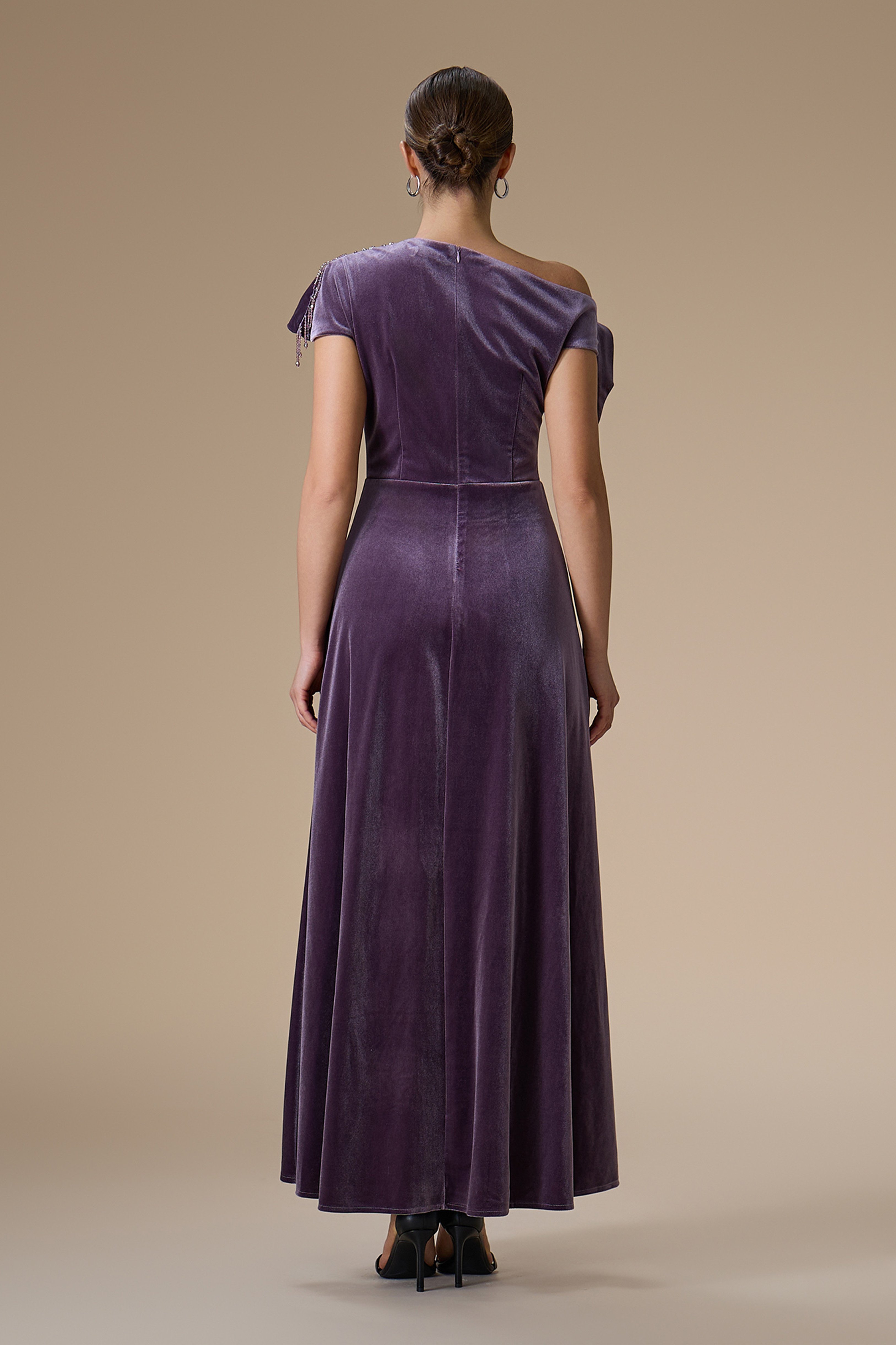 فستان موف مخمل ميدي غير متماثل الطول بقصة أوف شولدر مزين بالخرز