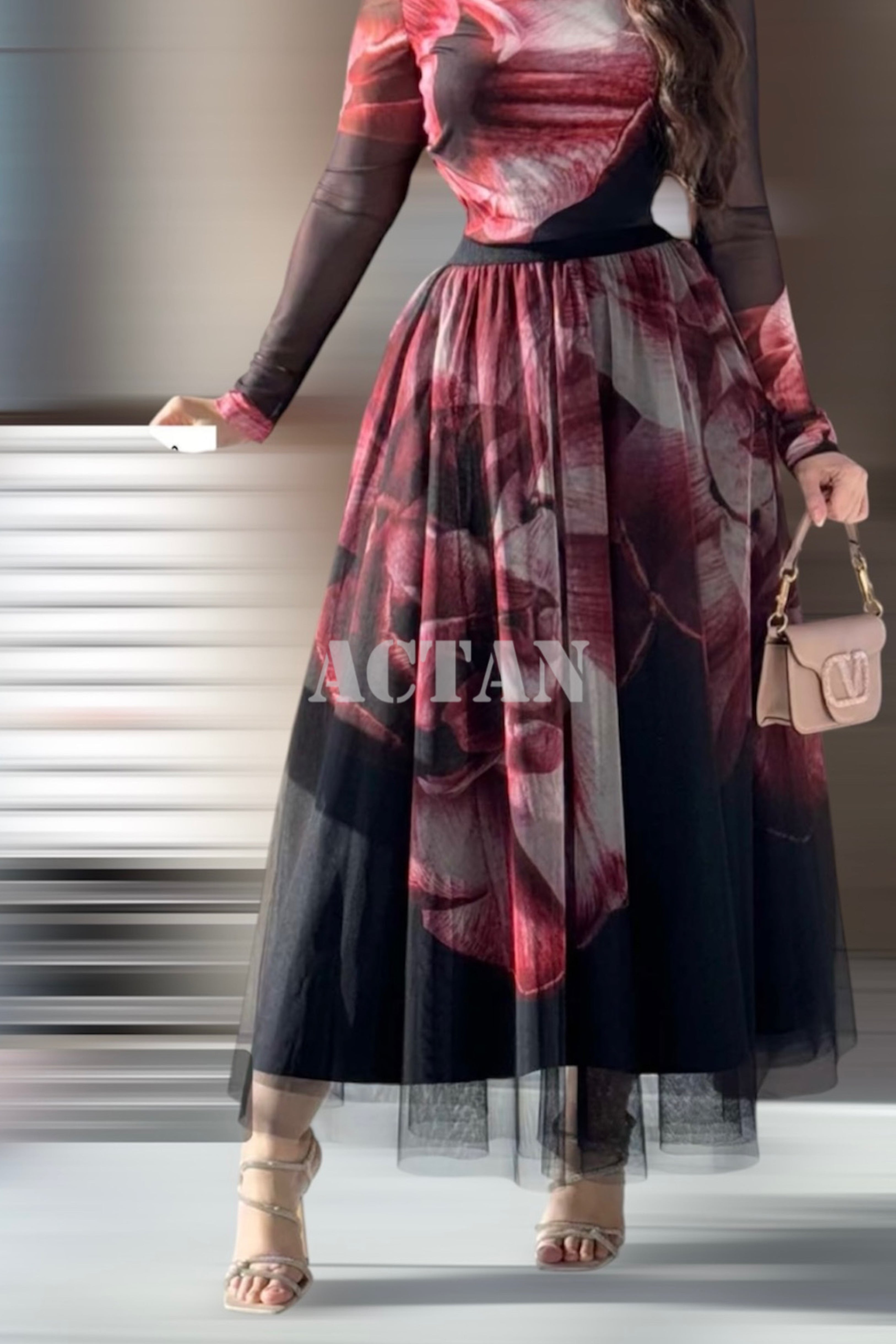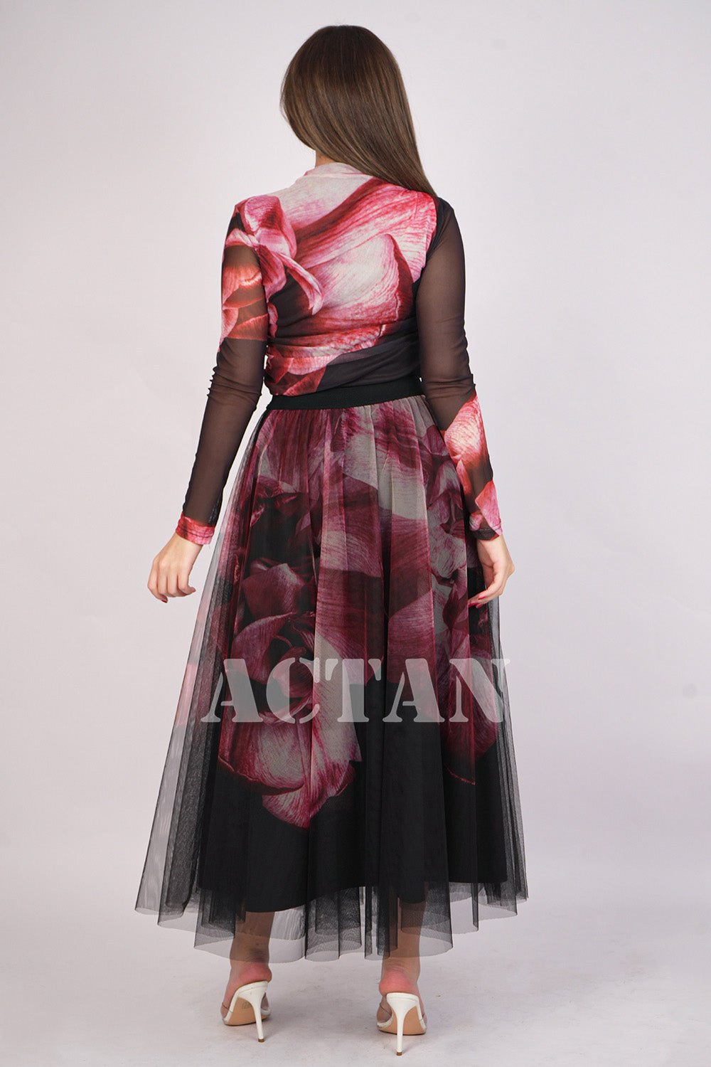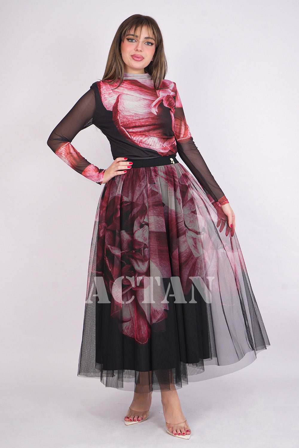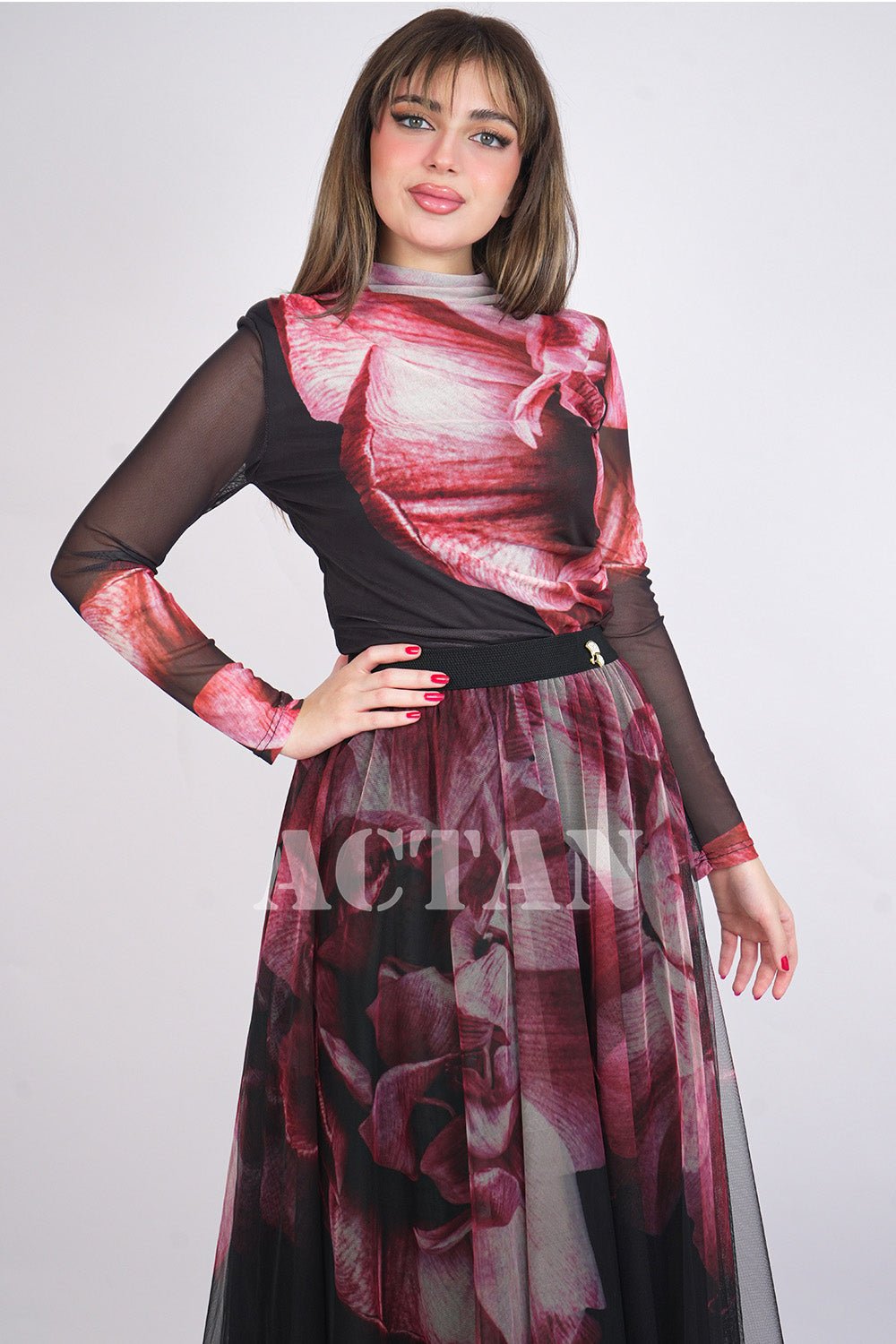 طقم تنورة وبلوزة تول بطبعة أزهار لون أحمر