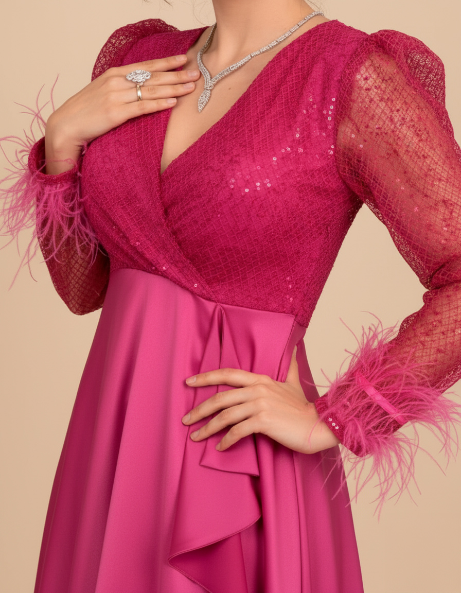 : قصير بزم على الخصر كلوش بطيات من الأمام، ياقة V، وأكمام طويلة مزينة بالريش مع حزام