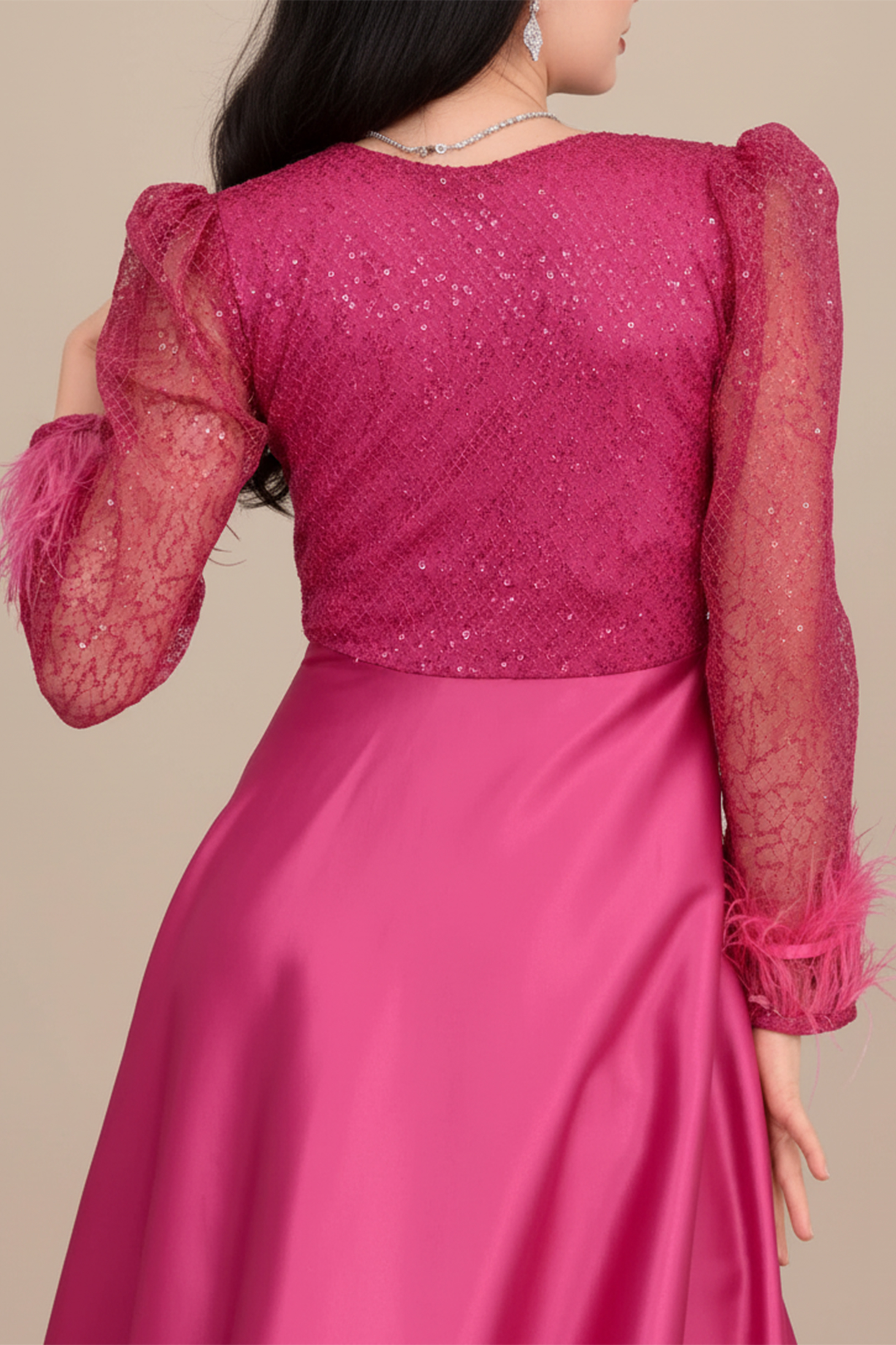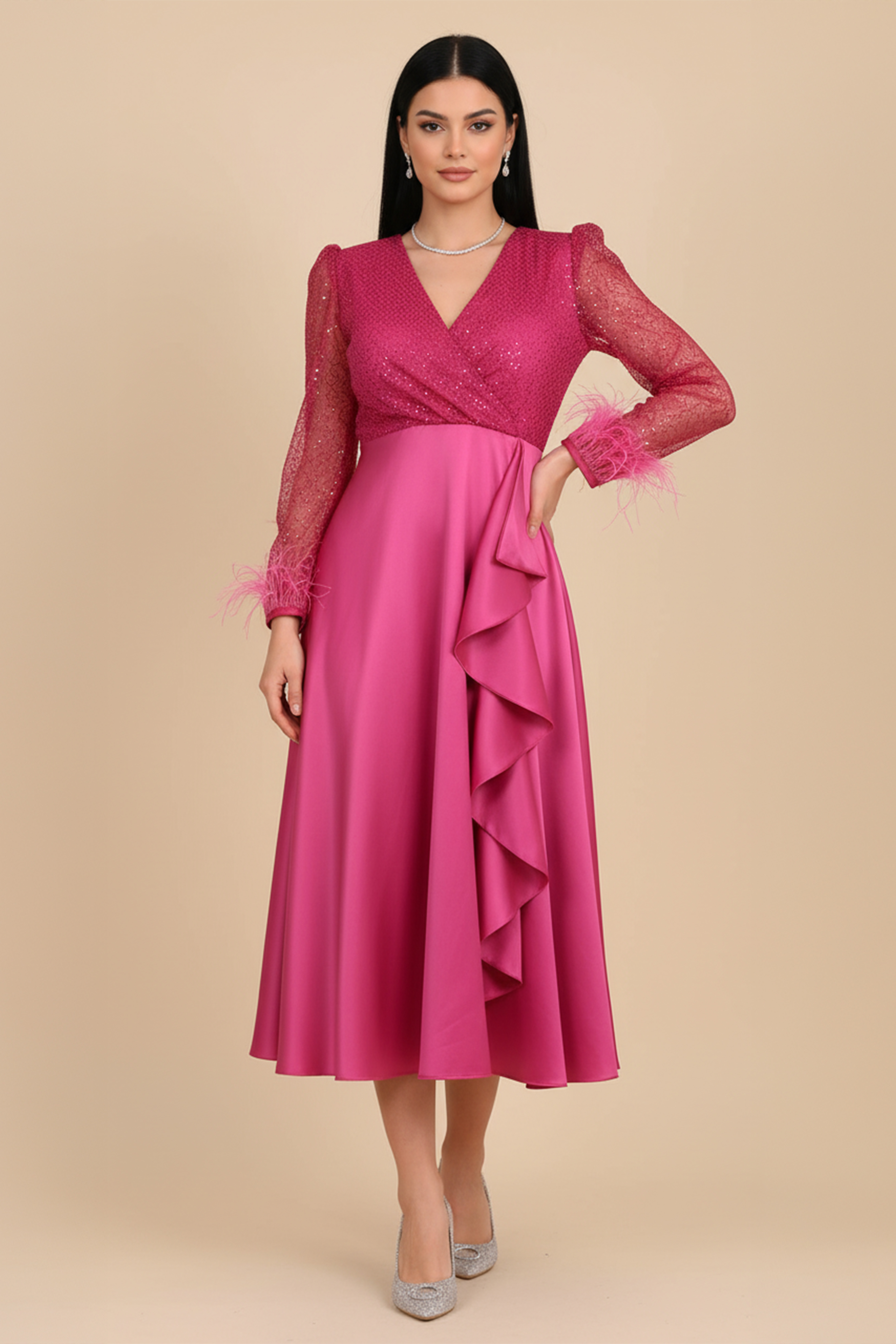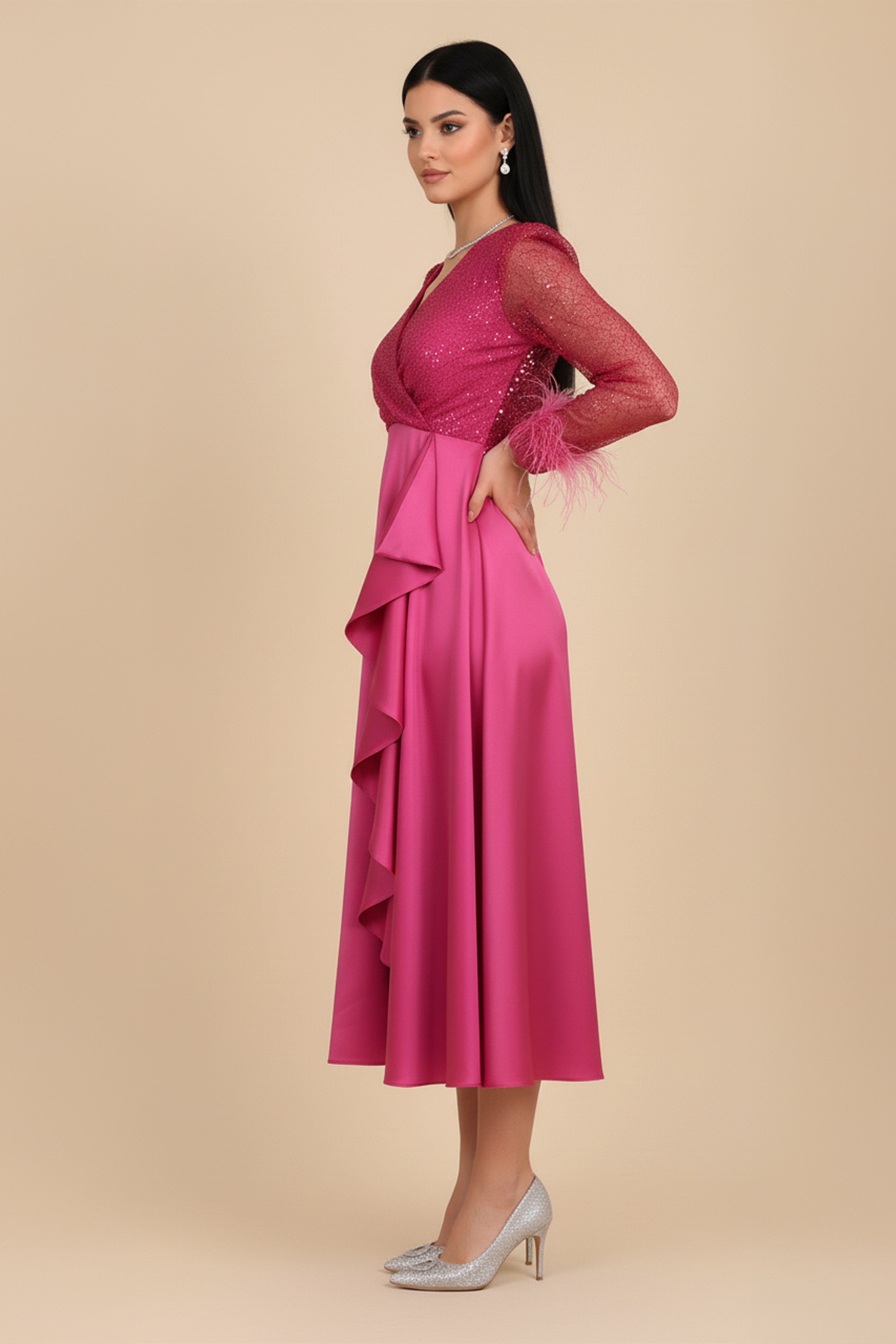 فستان قصير مطرز الصدر بترتر مزين بريش لون فوشي