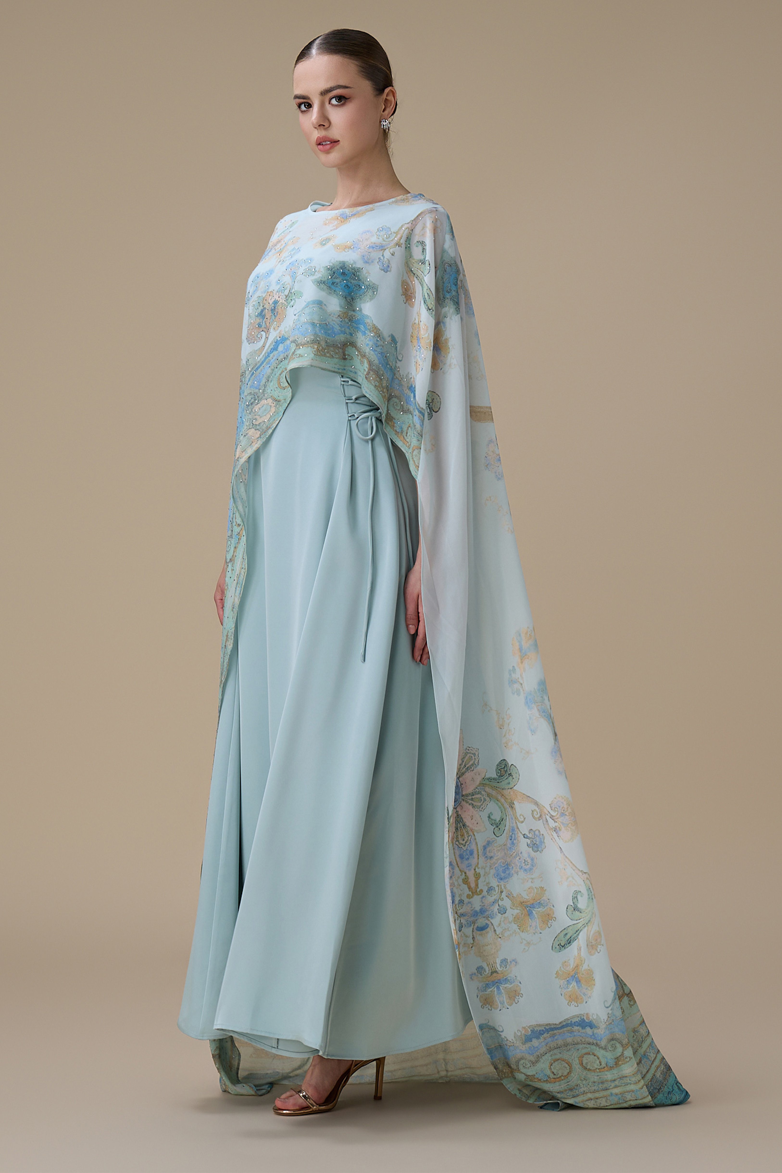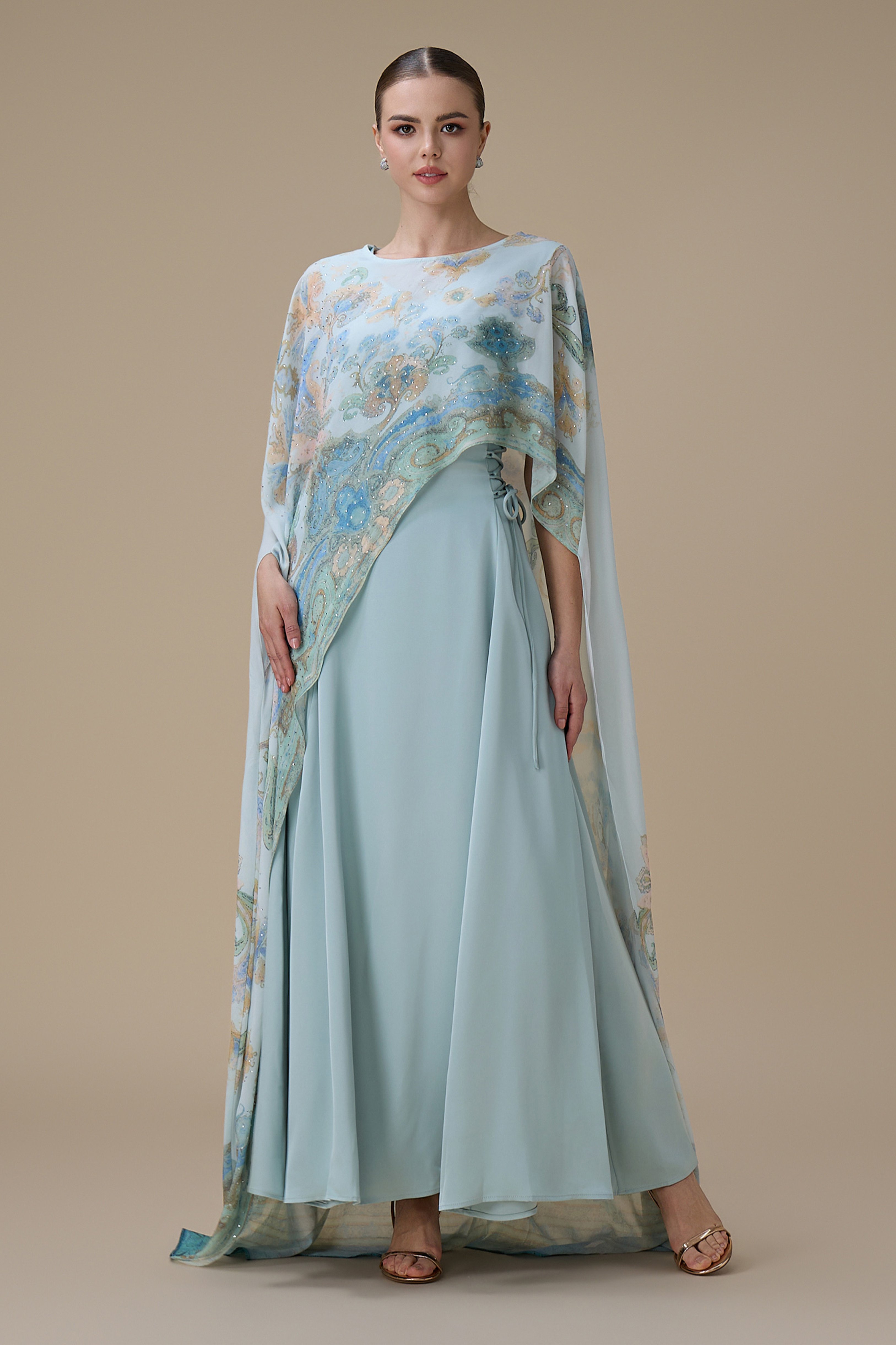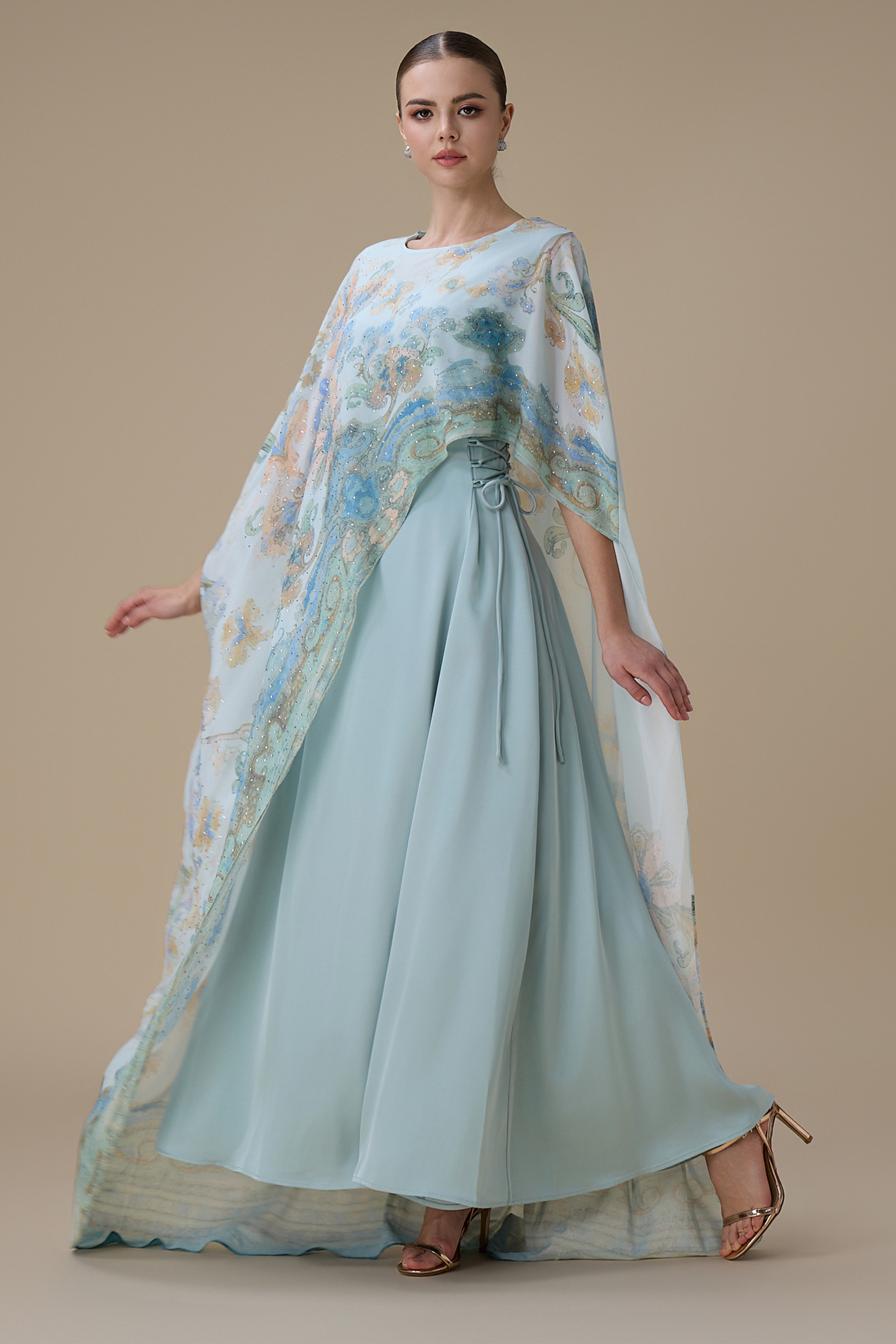 نوع القصة: جلابية طويلة من قطعتين بشال مطبوع ورباط عالخصر بياقة دائرية
