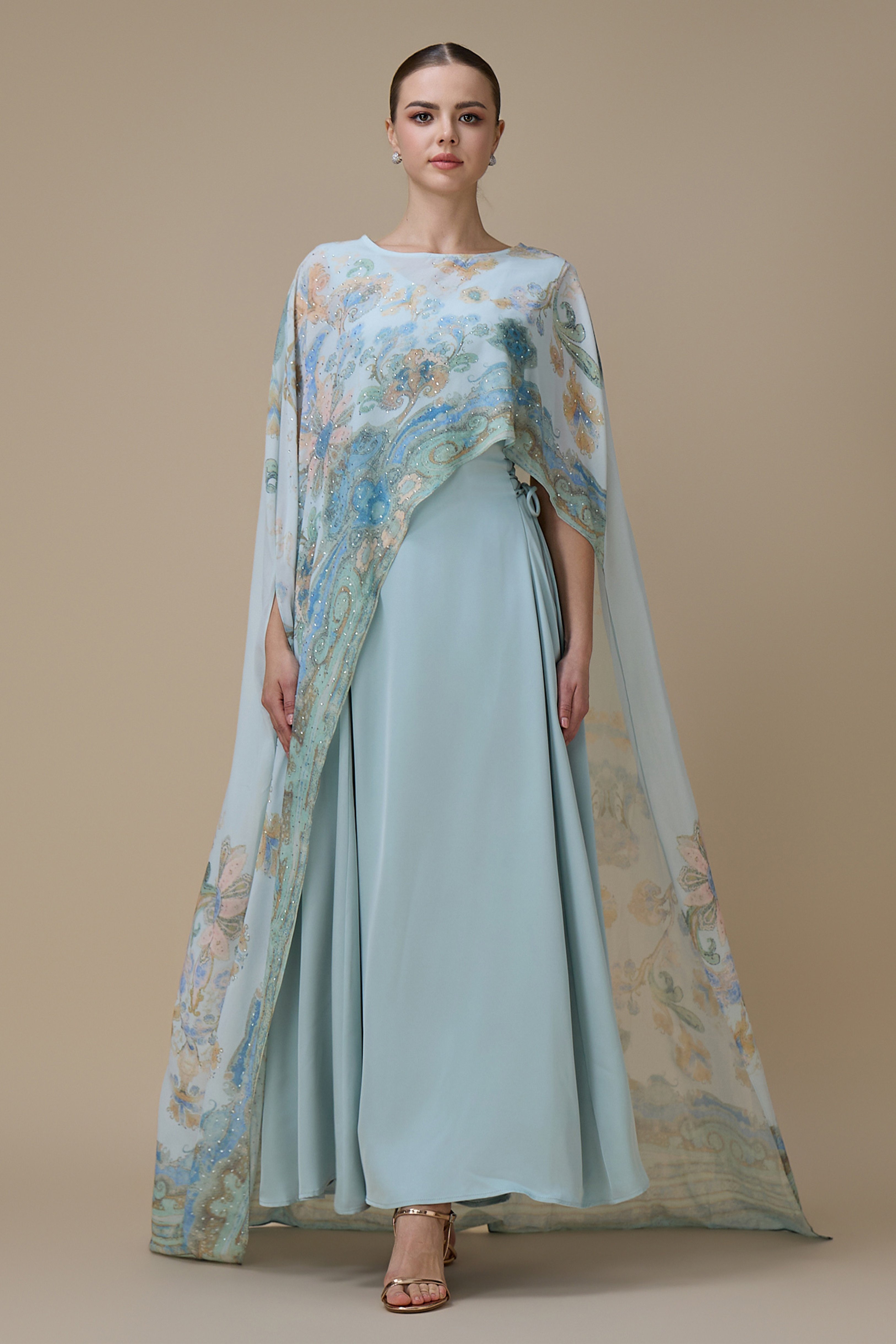 نوع التصميم: جلابية طويلة من قطعتين بشال مطبوع