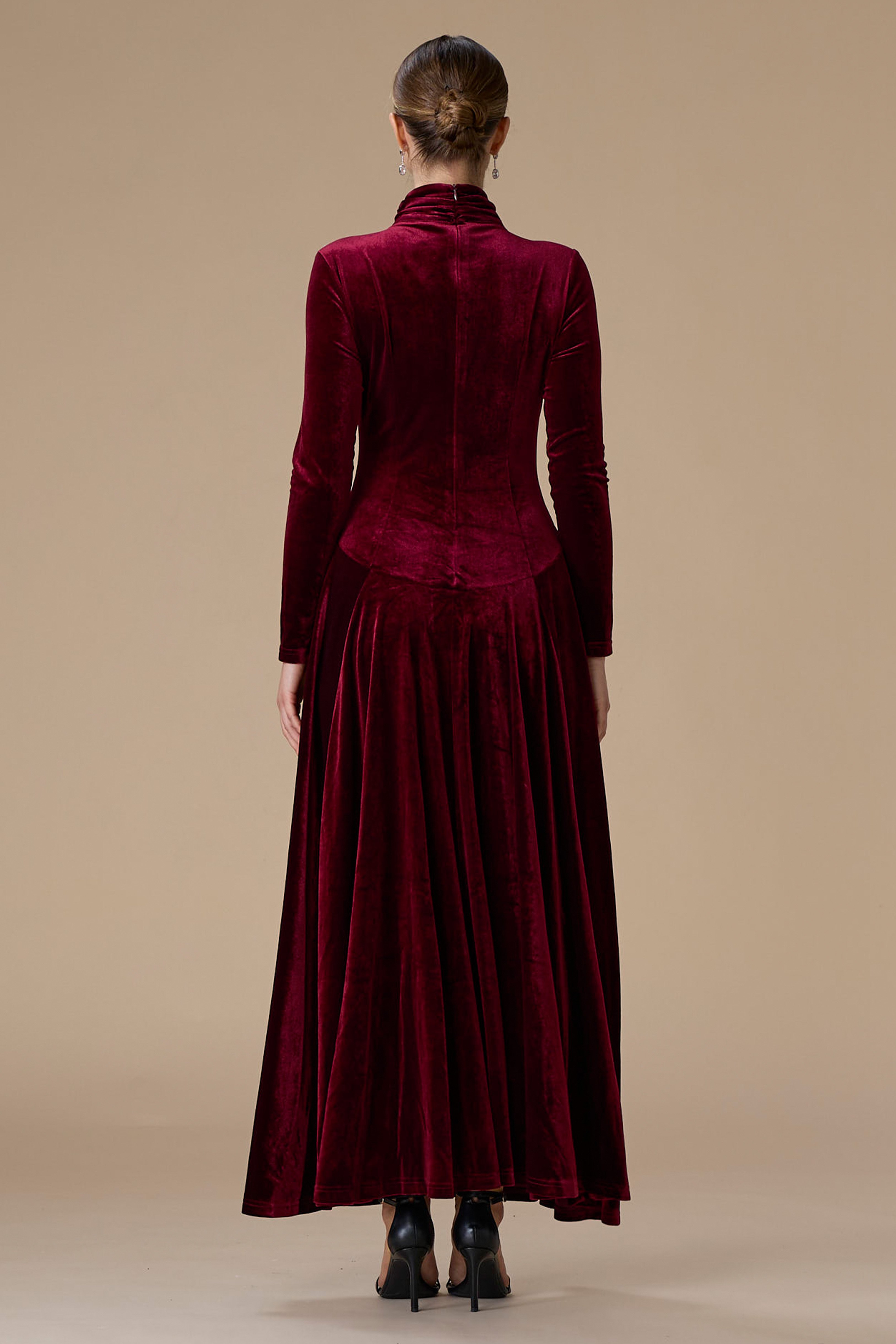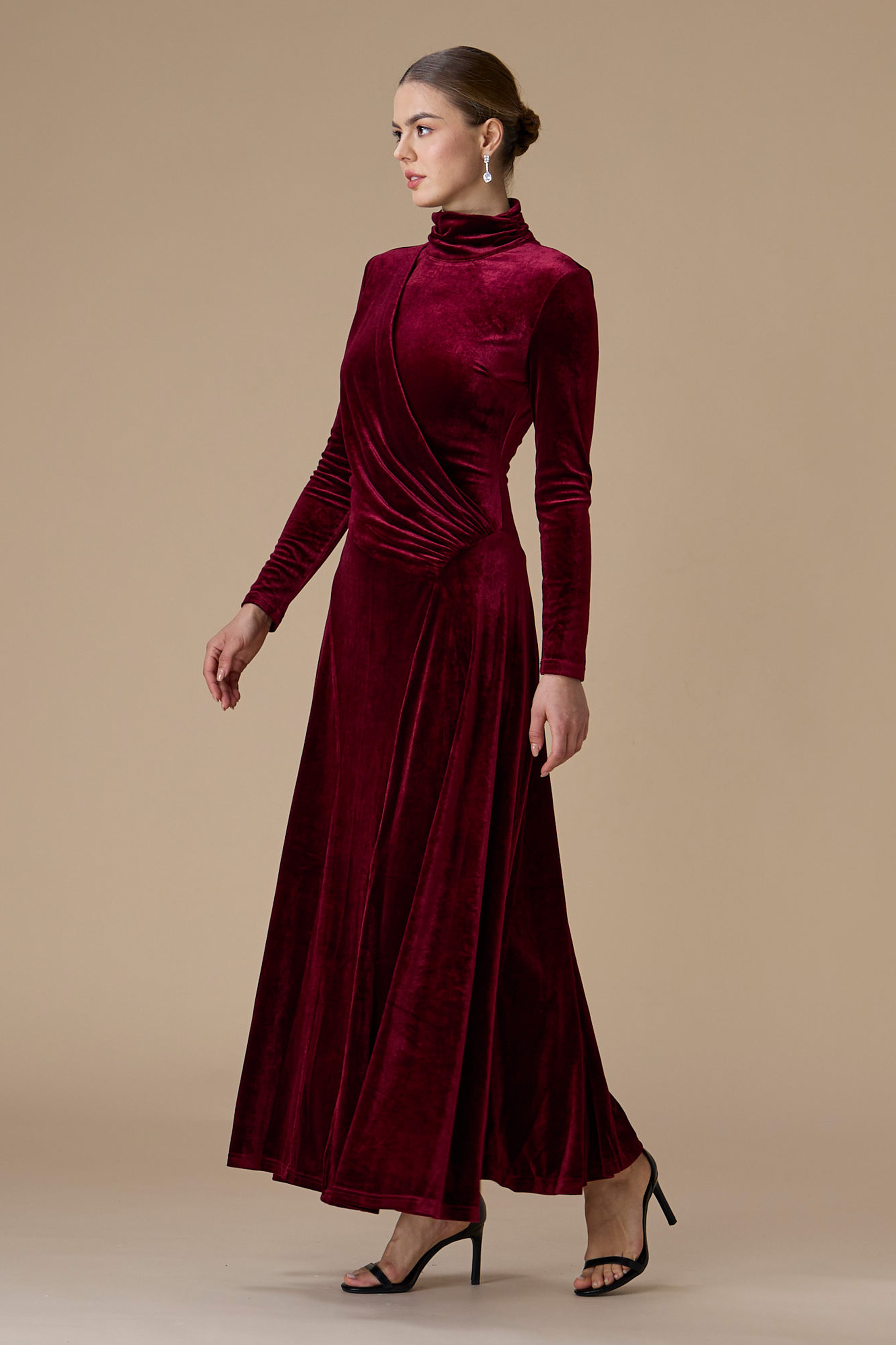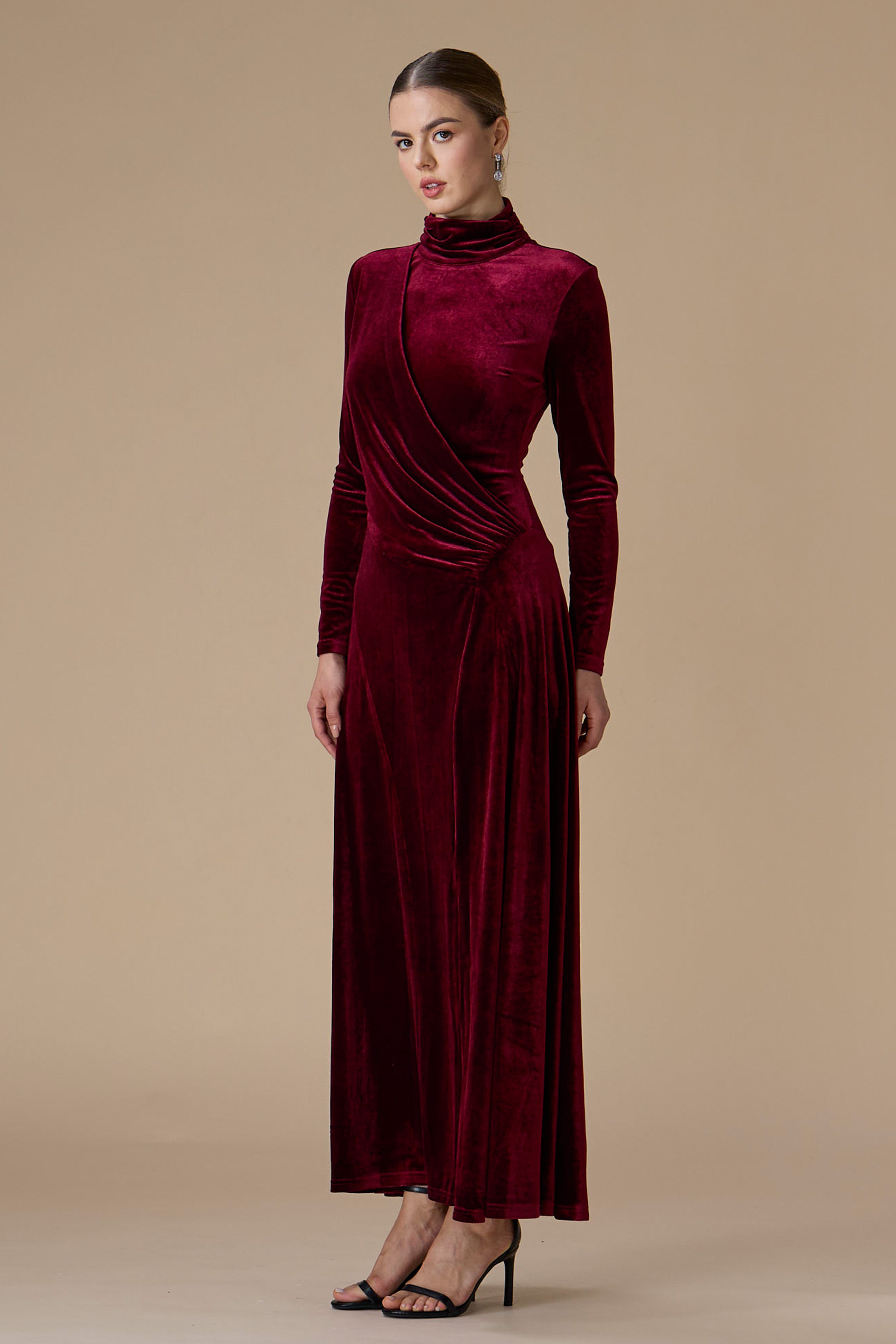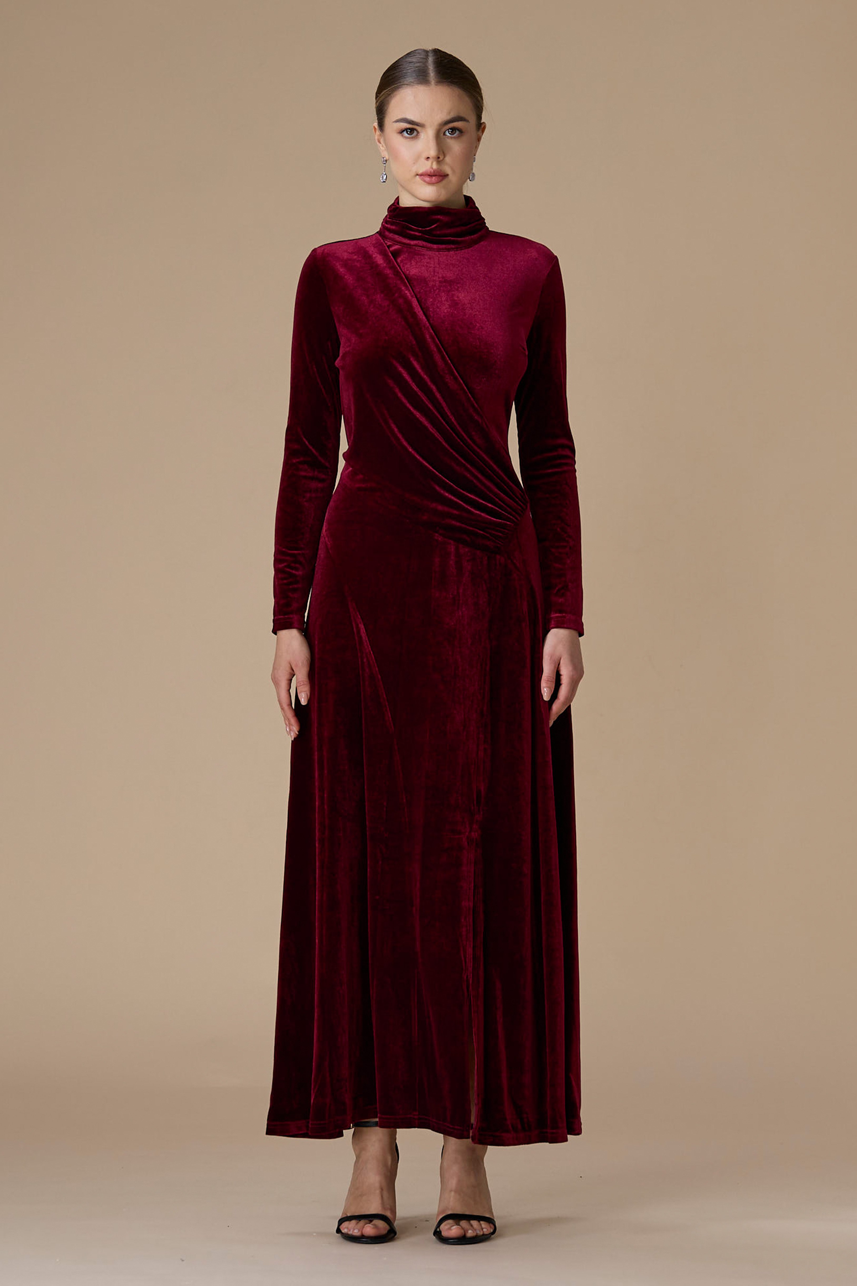 • نوع القصة: فستان برغندي مخمل درابيه طويل بياقة عالية وأكمام طويلة وضيقة