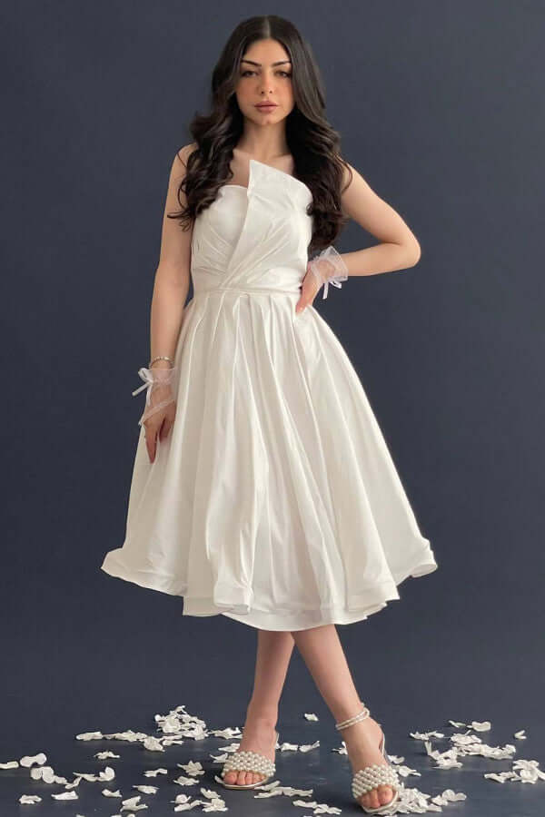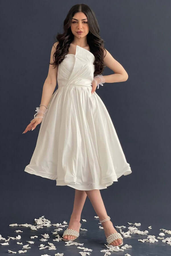 : فستان قصير بقصة كلوش، مزموم عند الخصر، بتصميم توب غير متماثل من الصدر
