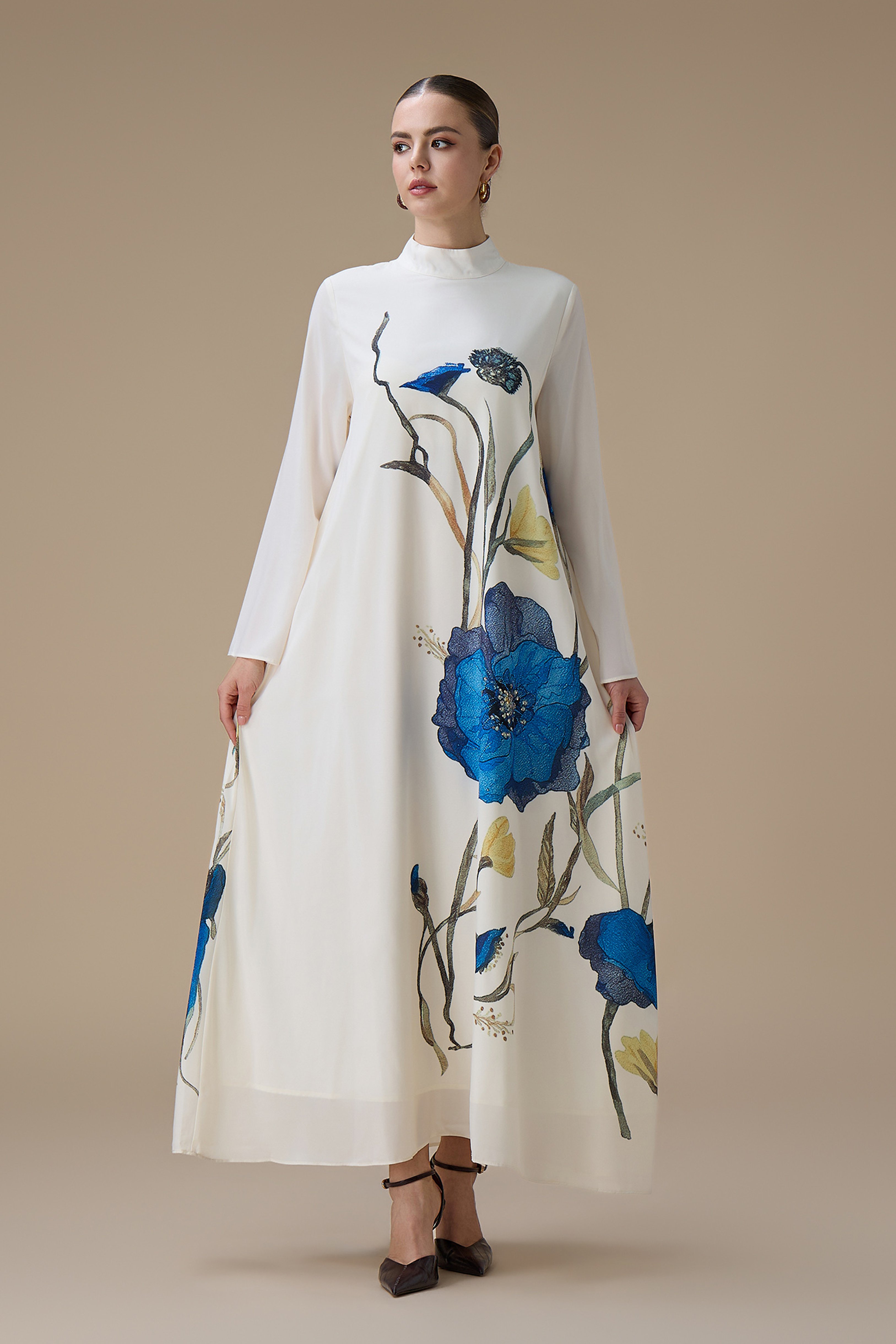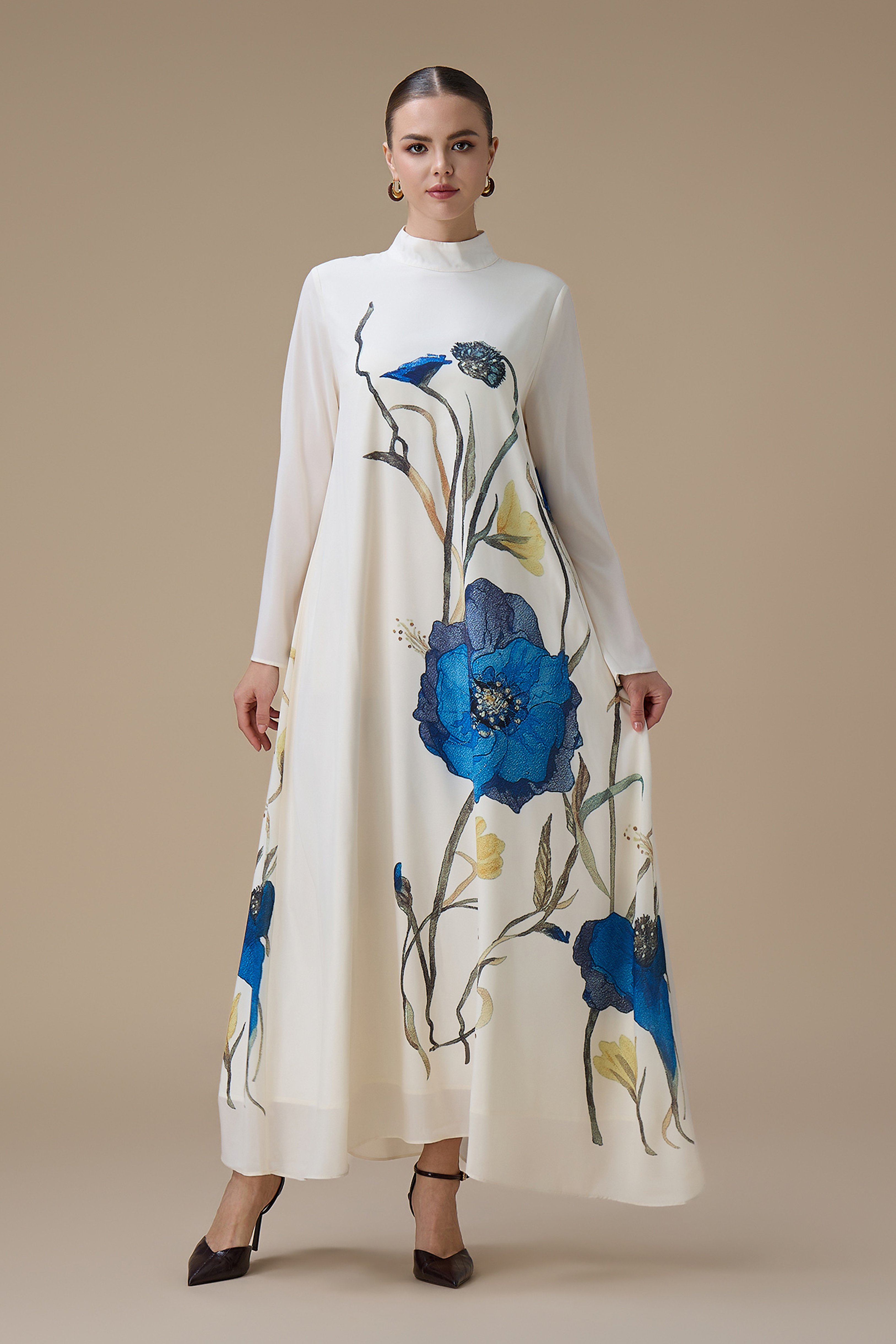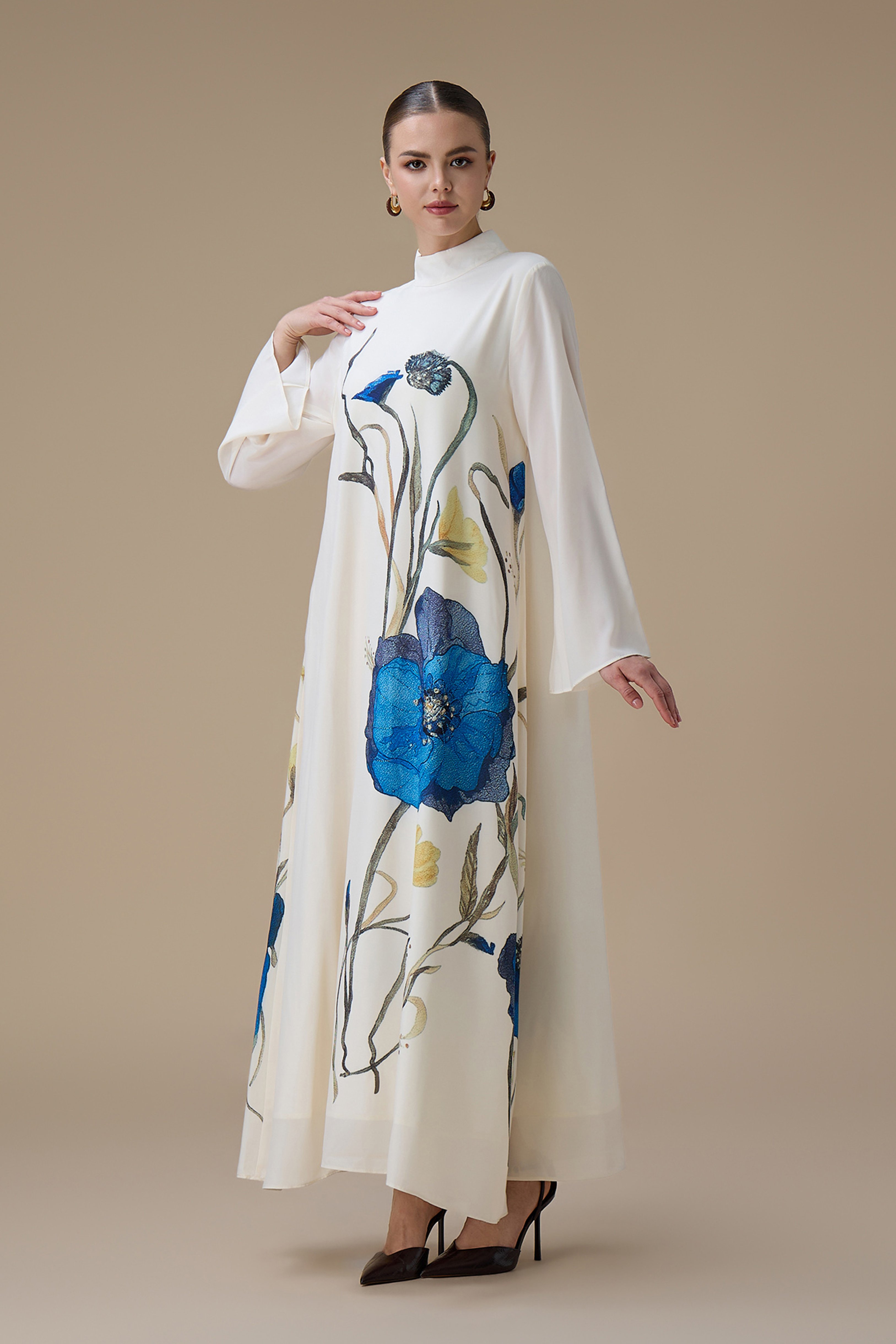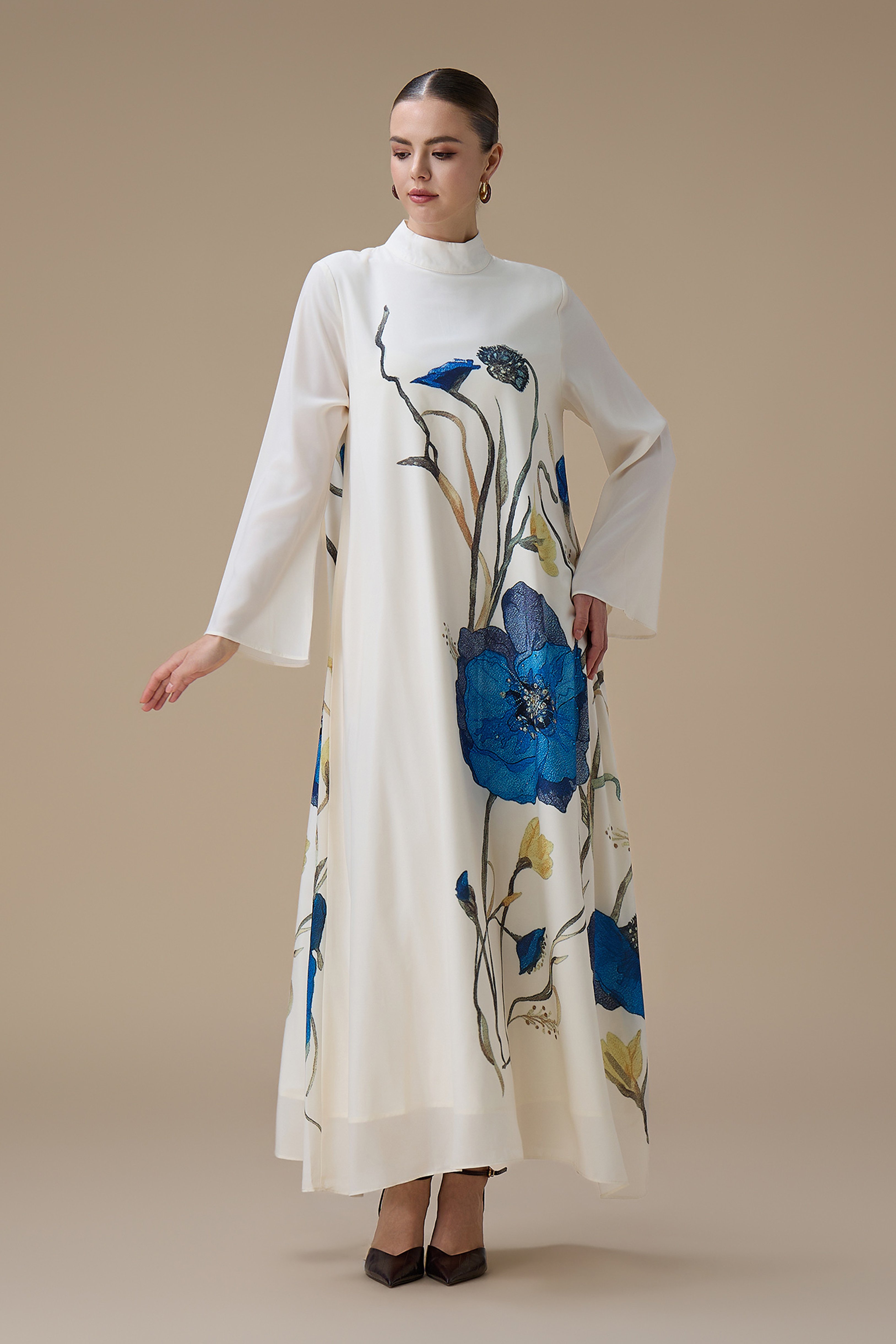 جلابية طويلة بتطريز زهور زرقاء وياقة عالية