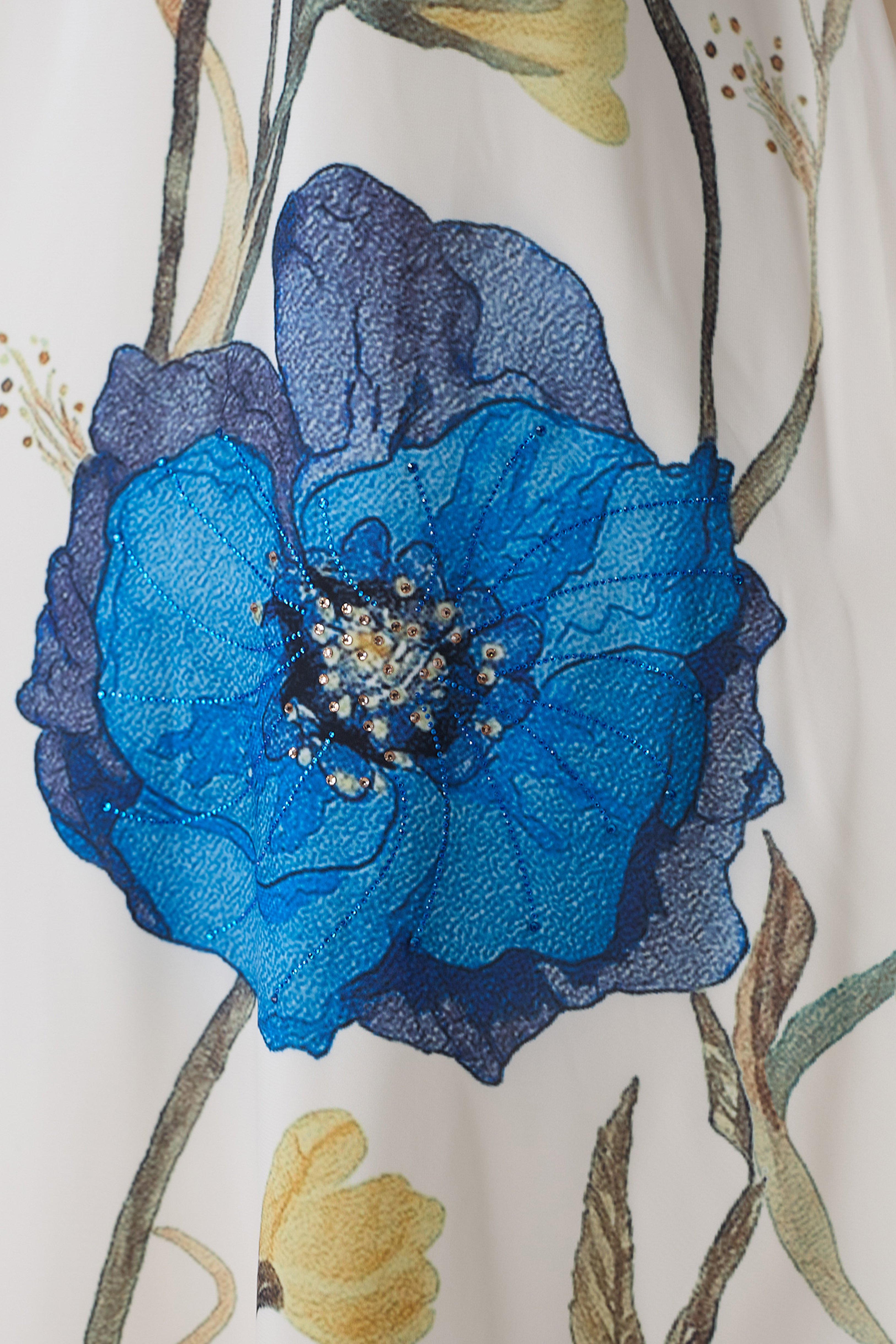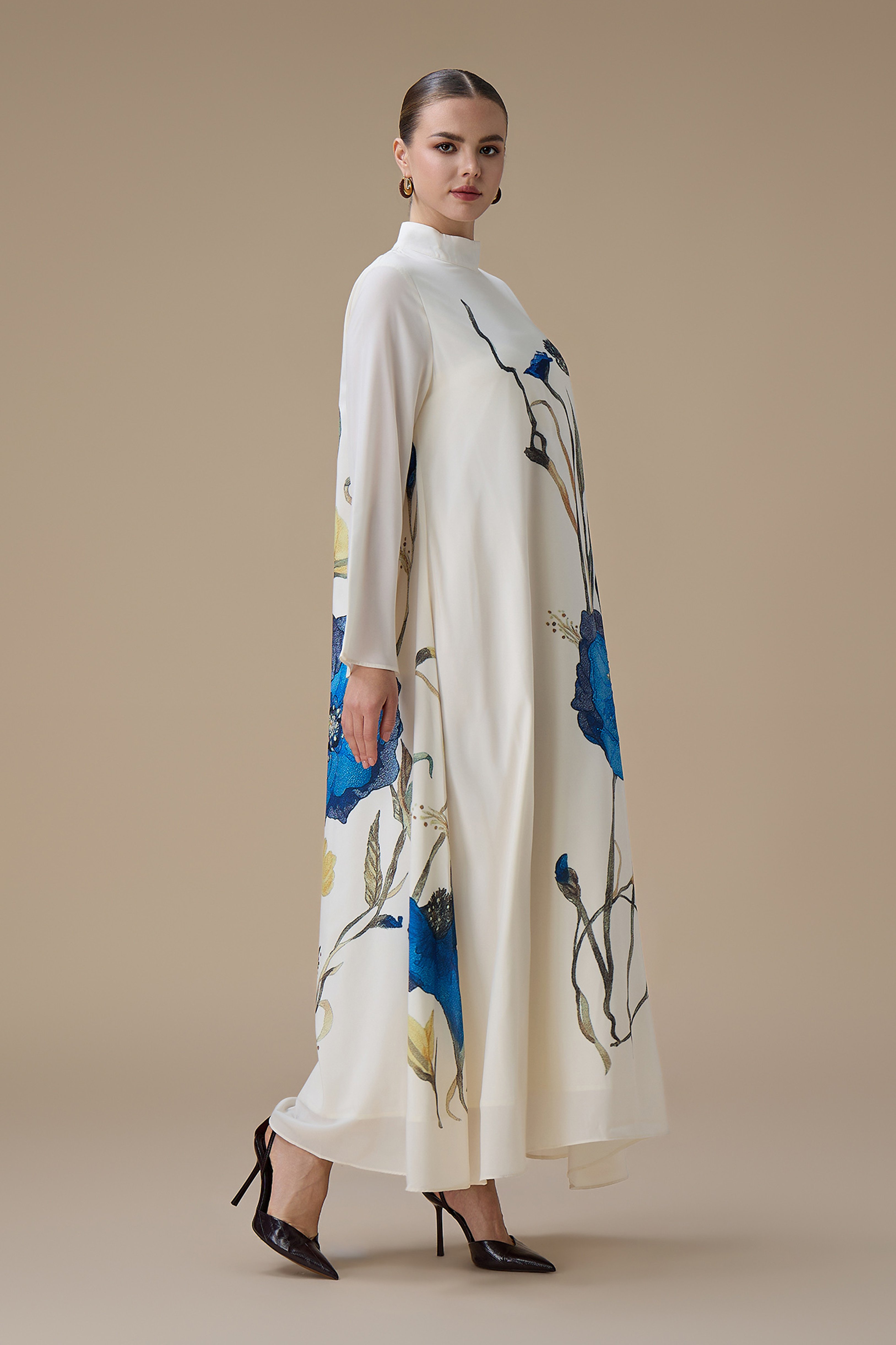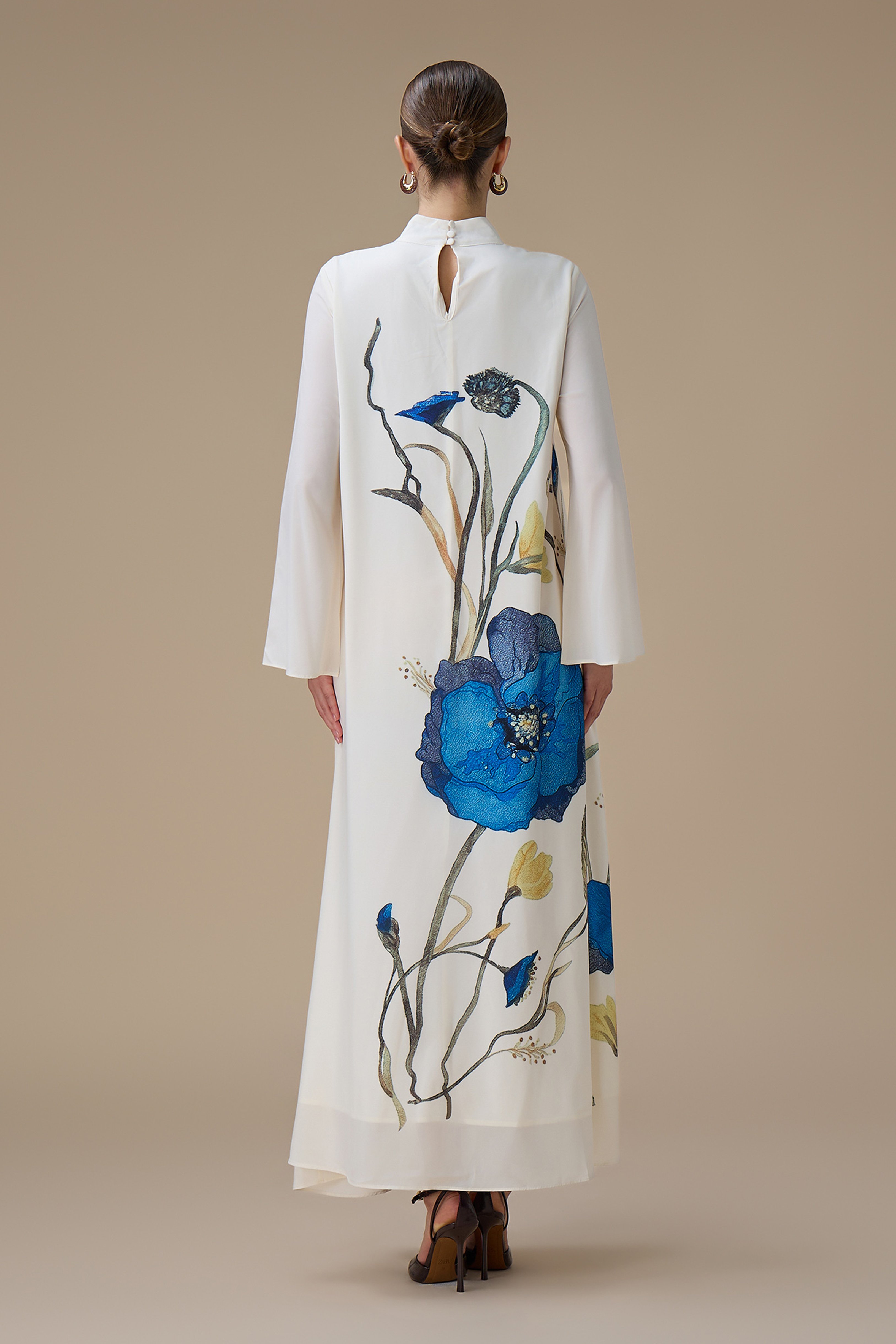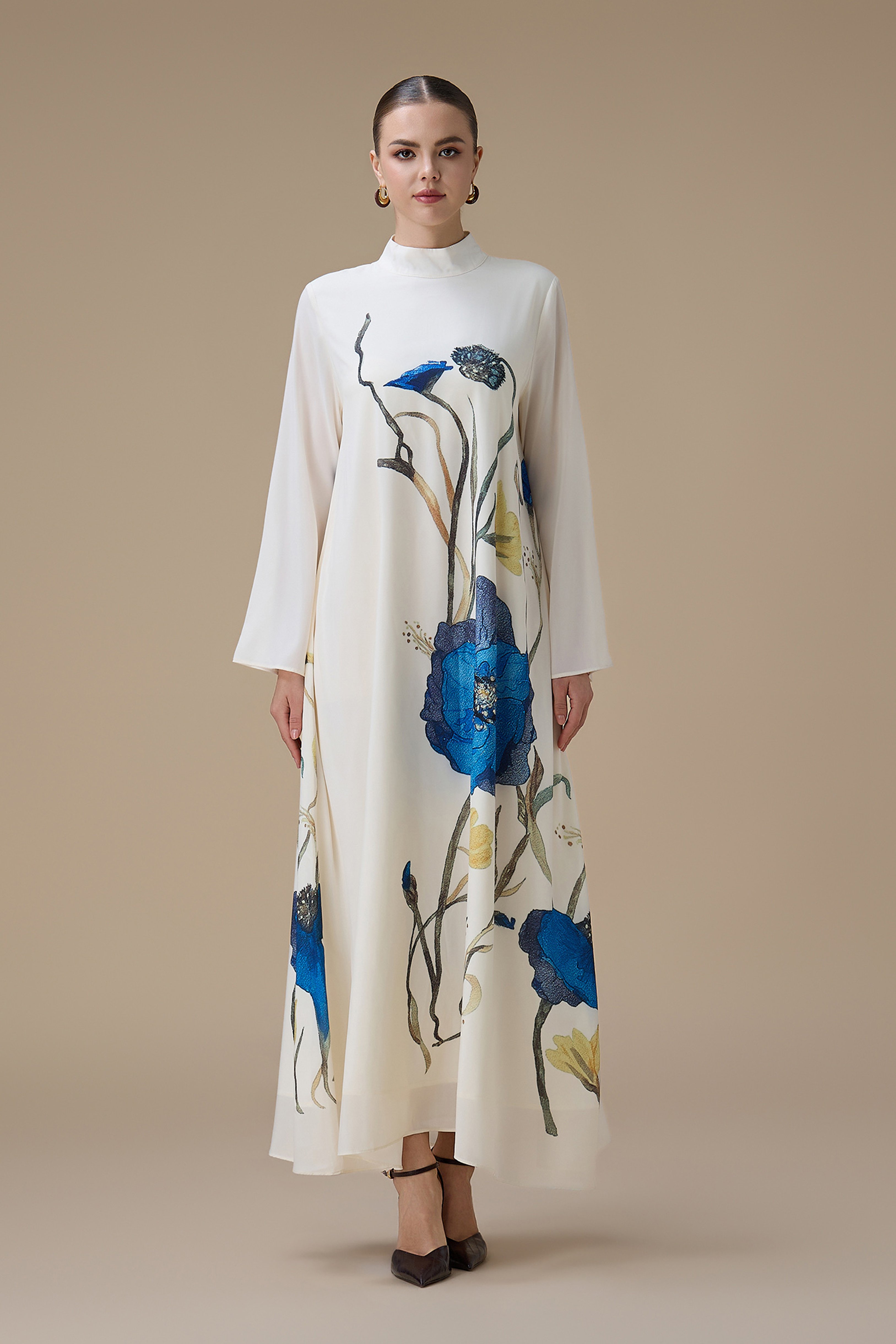جلابية طويلة بتطريز زهور زرقاء وياقة عالية