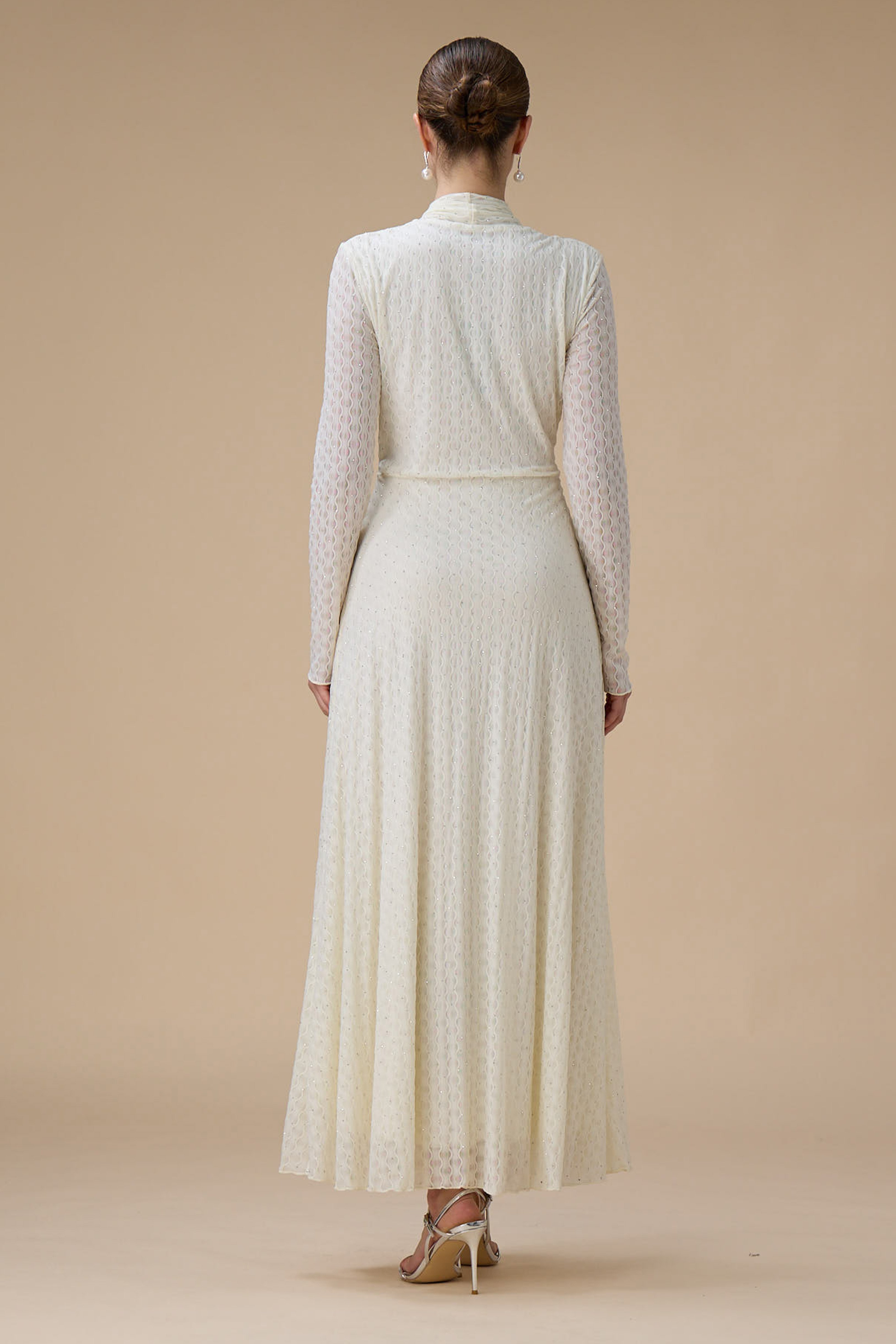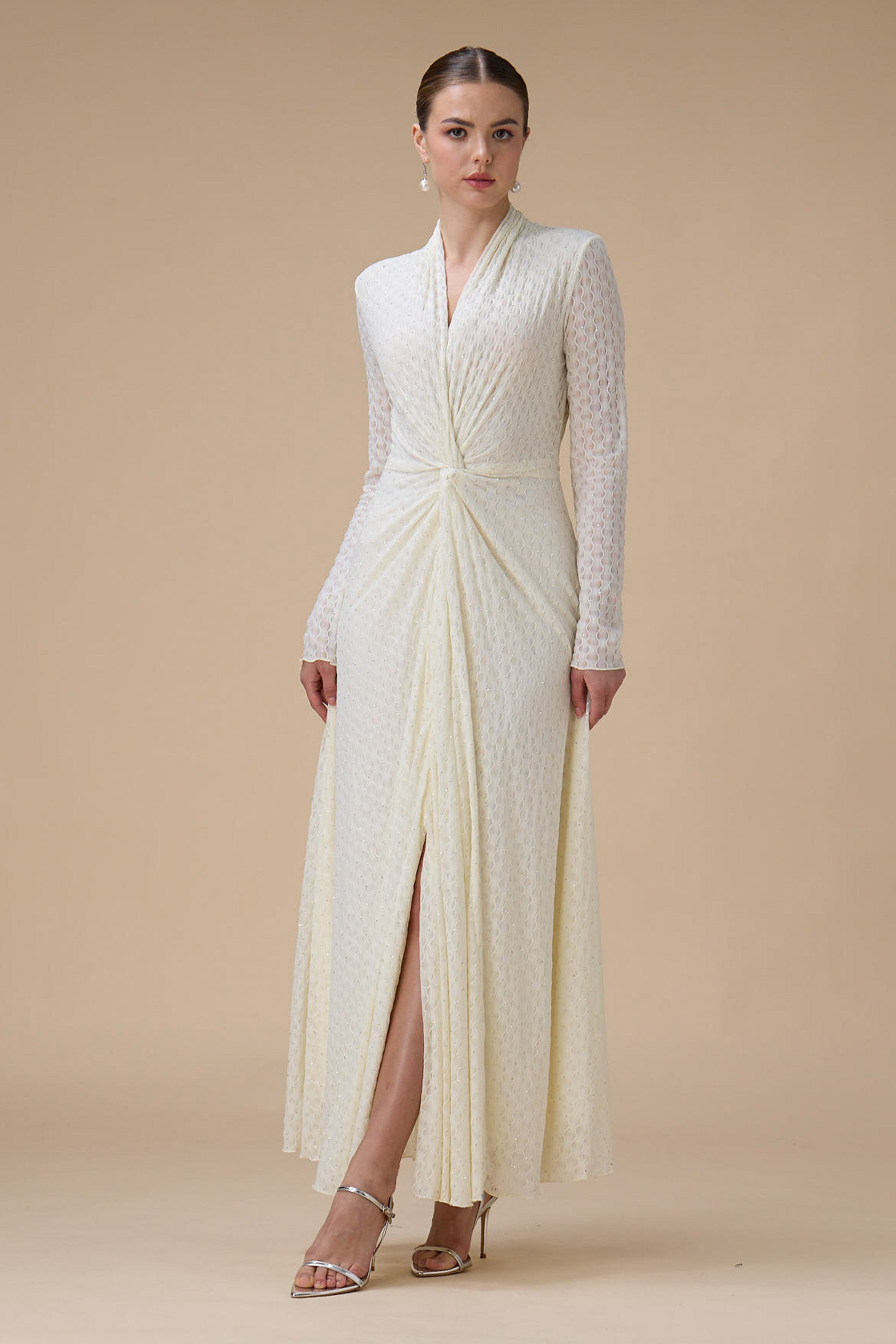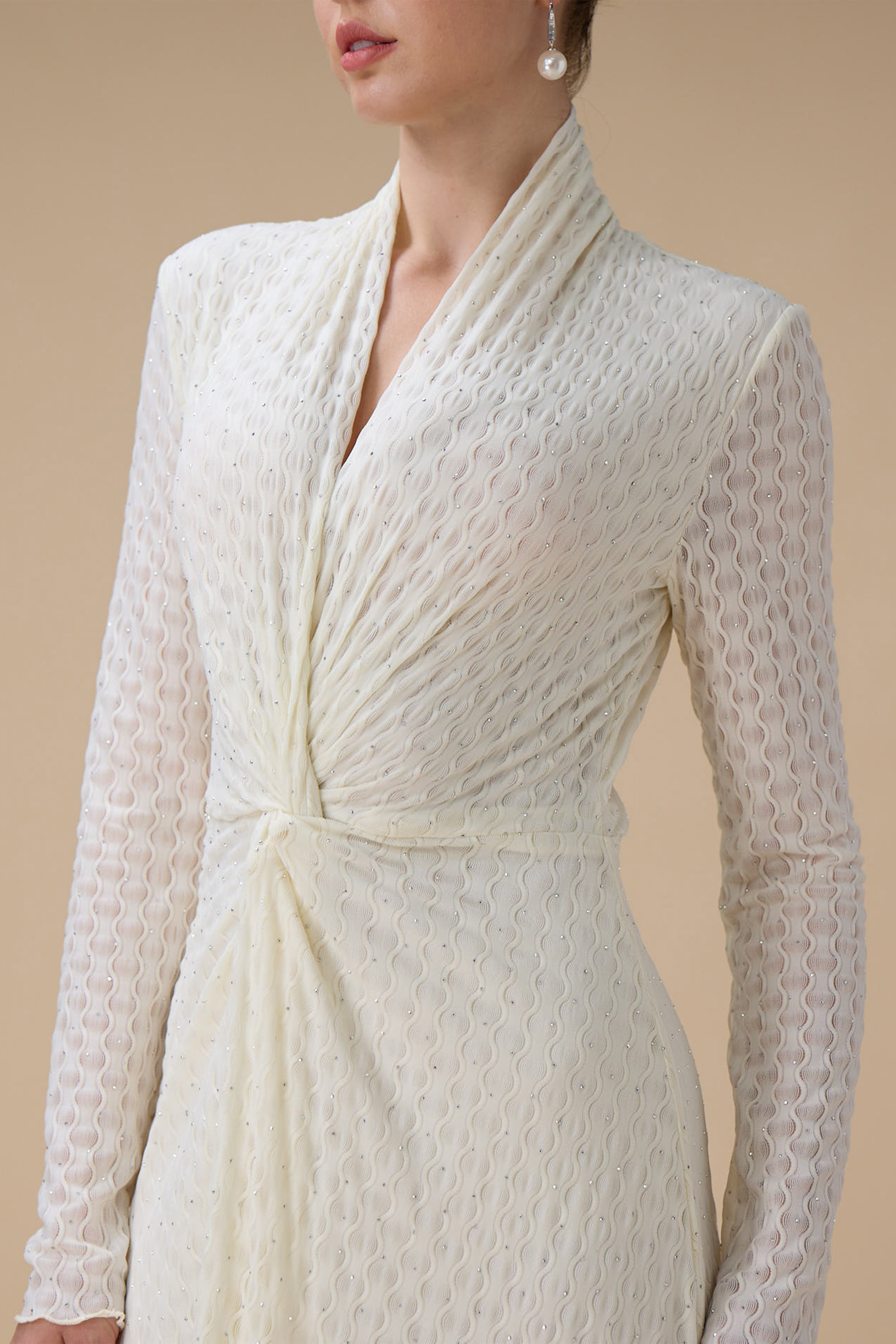 • نوع القصة: فستان سكري طويل مرصع بالفصوص بقصة ملتفة وياقة V وأكمام طويلة بفتحة من المنتصف
