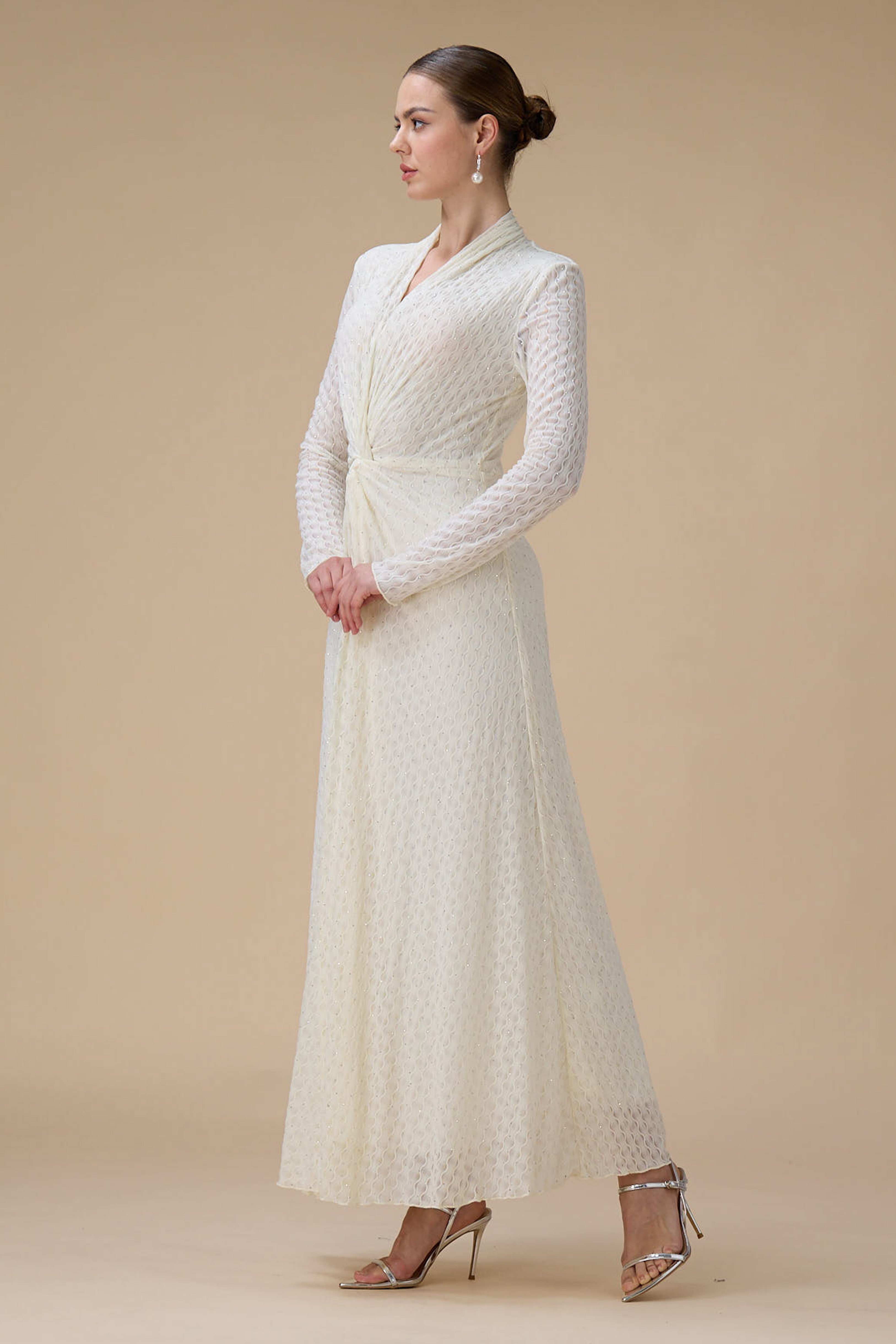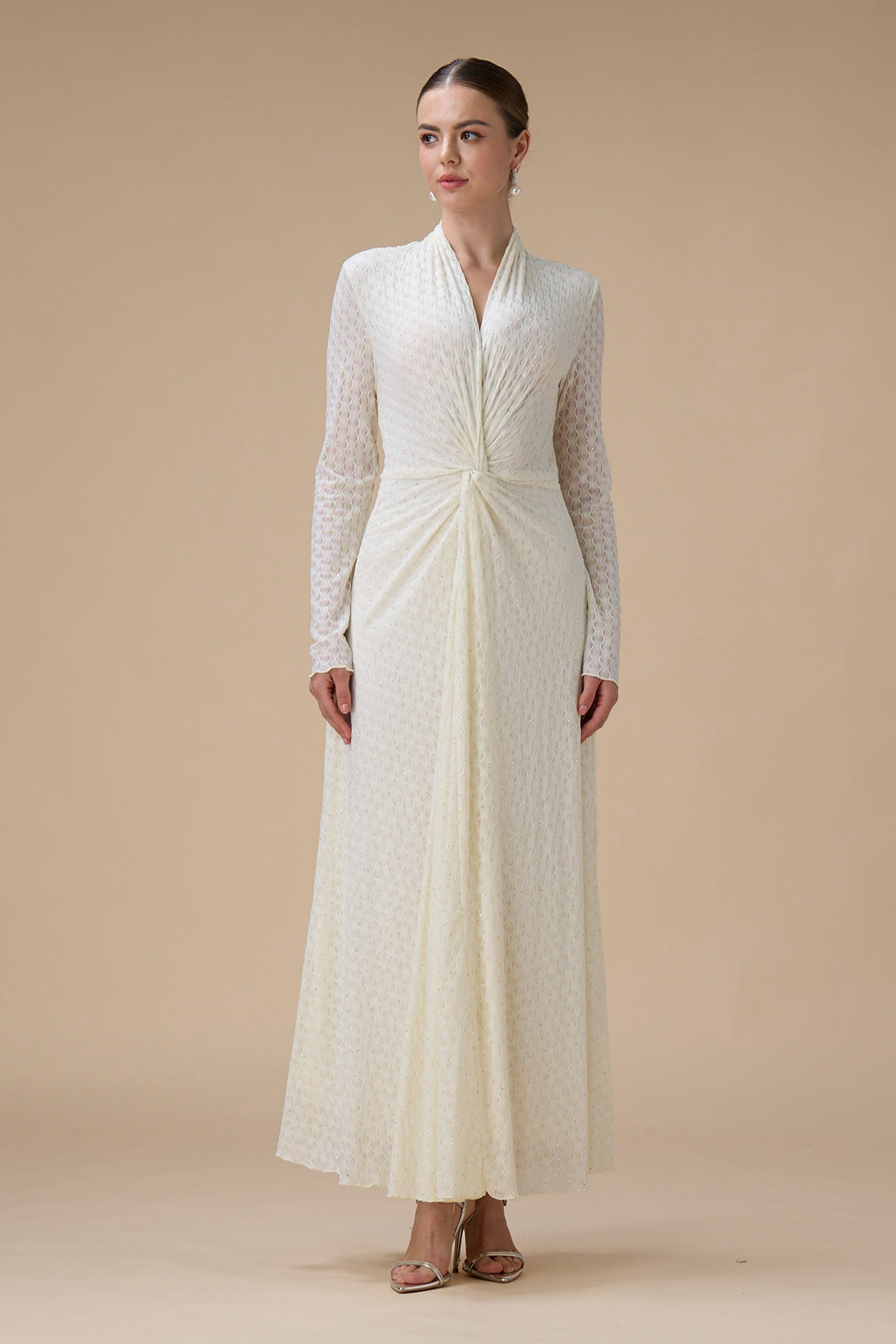 • نوع التصميم: فستان سكري طويل بقصة ملتفة