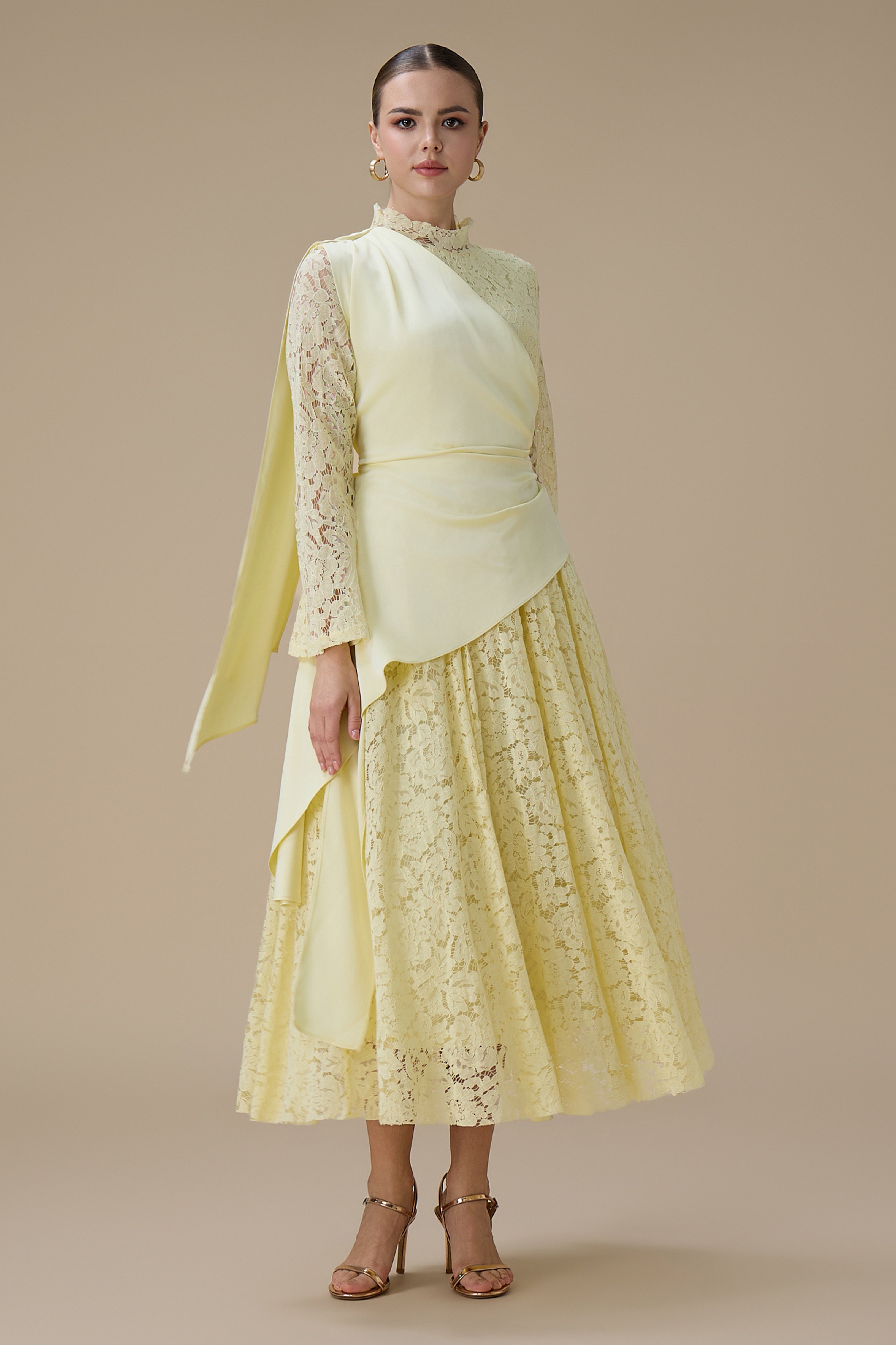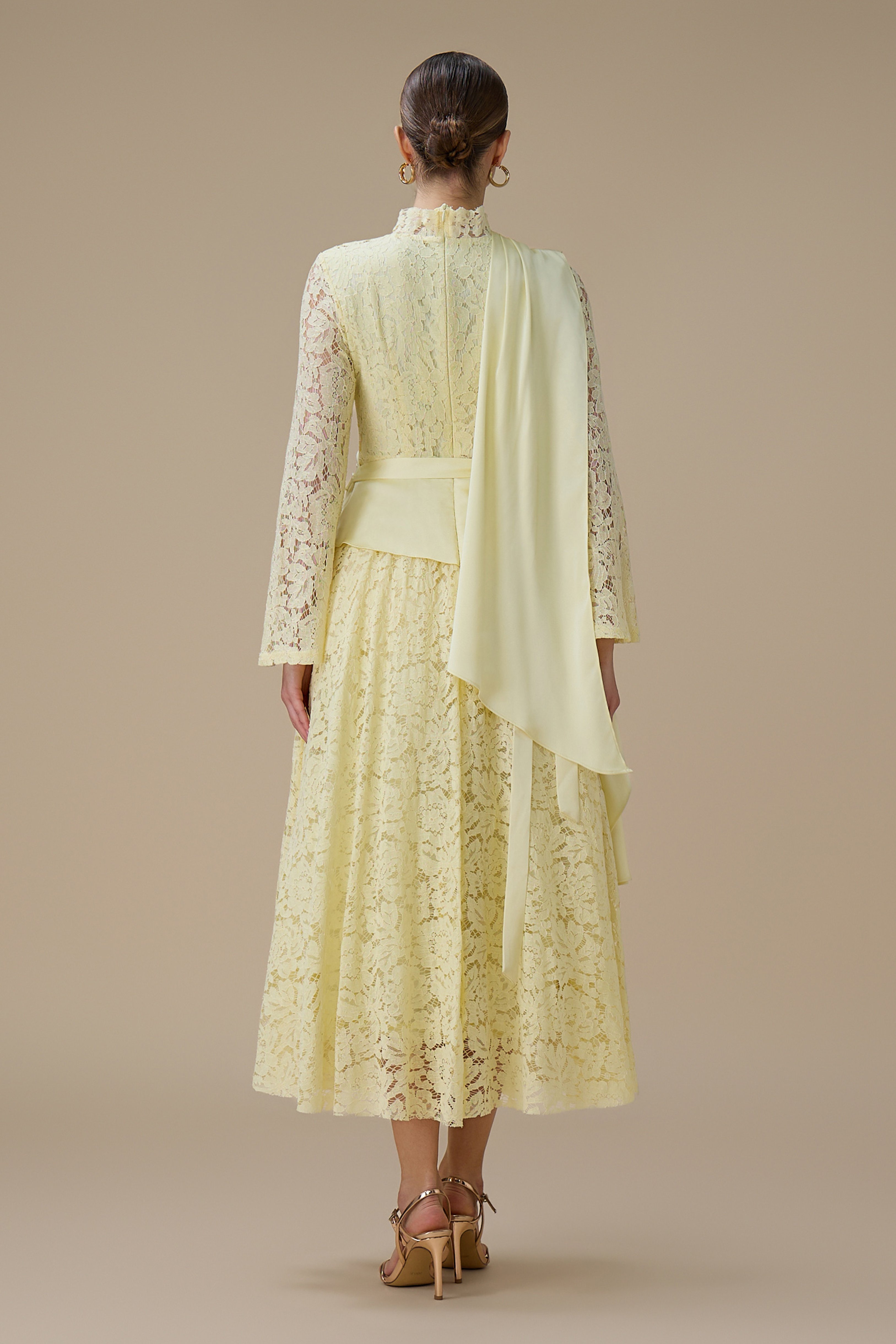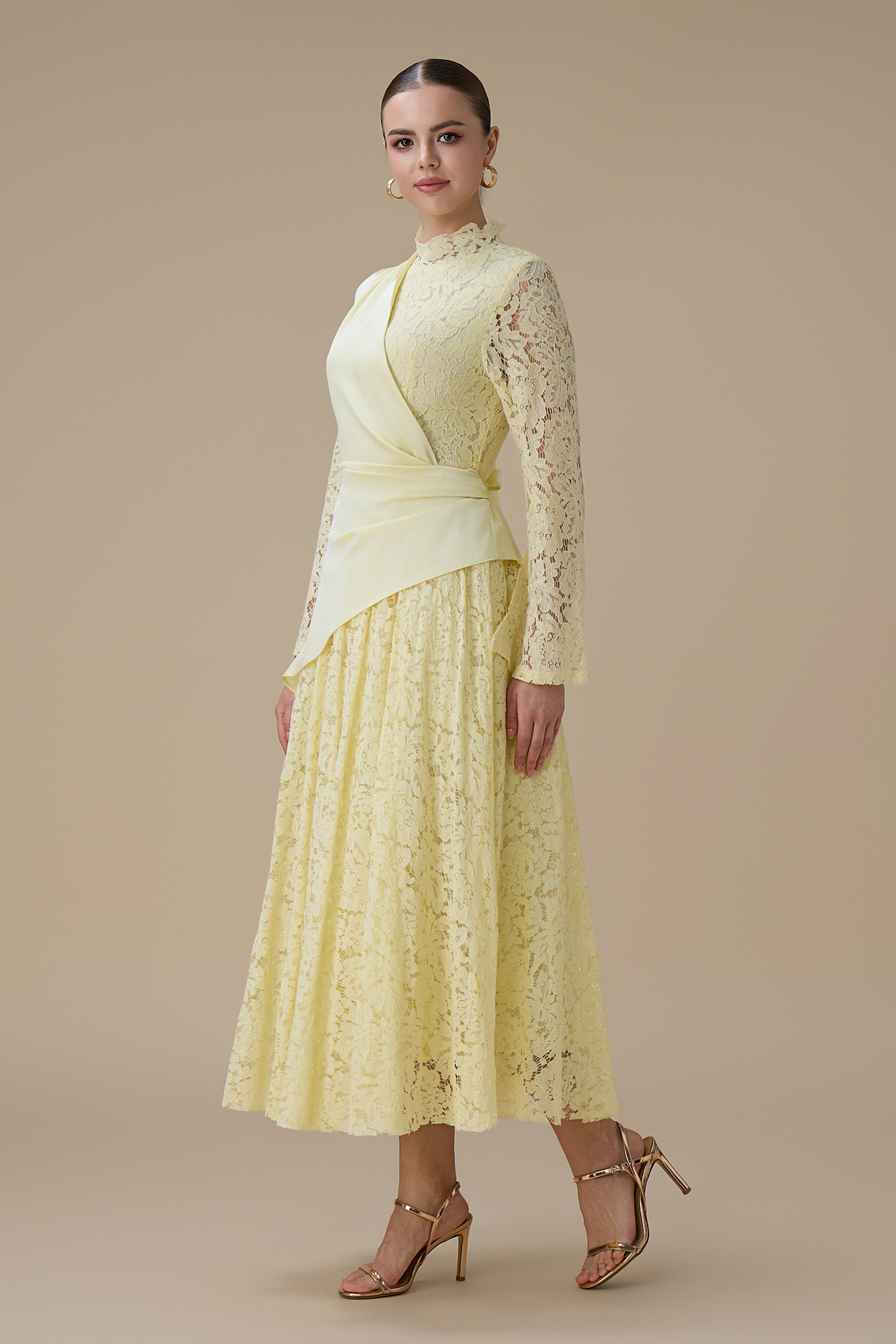 نوع القصة: فستان ماكسي دانتيل أصفر فاتح بقصة علوية ملتفة بأكمام طويلة وياقة عالية
