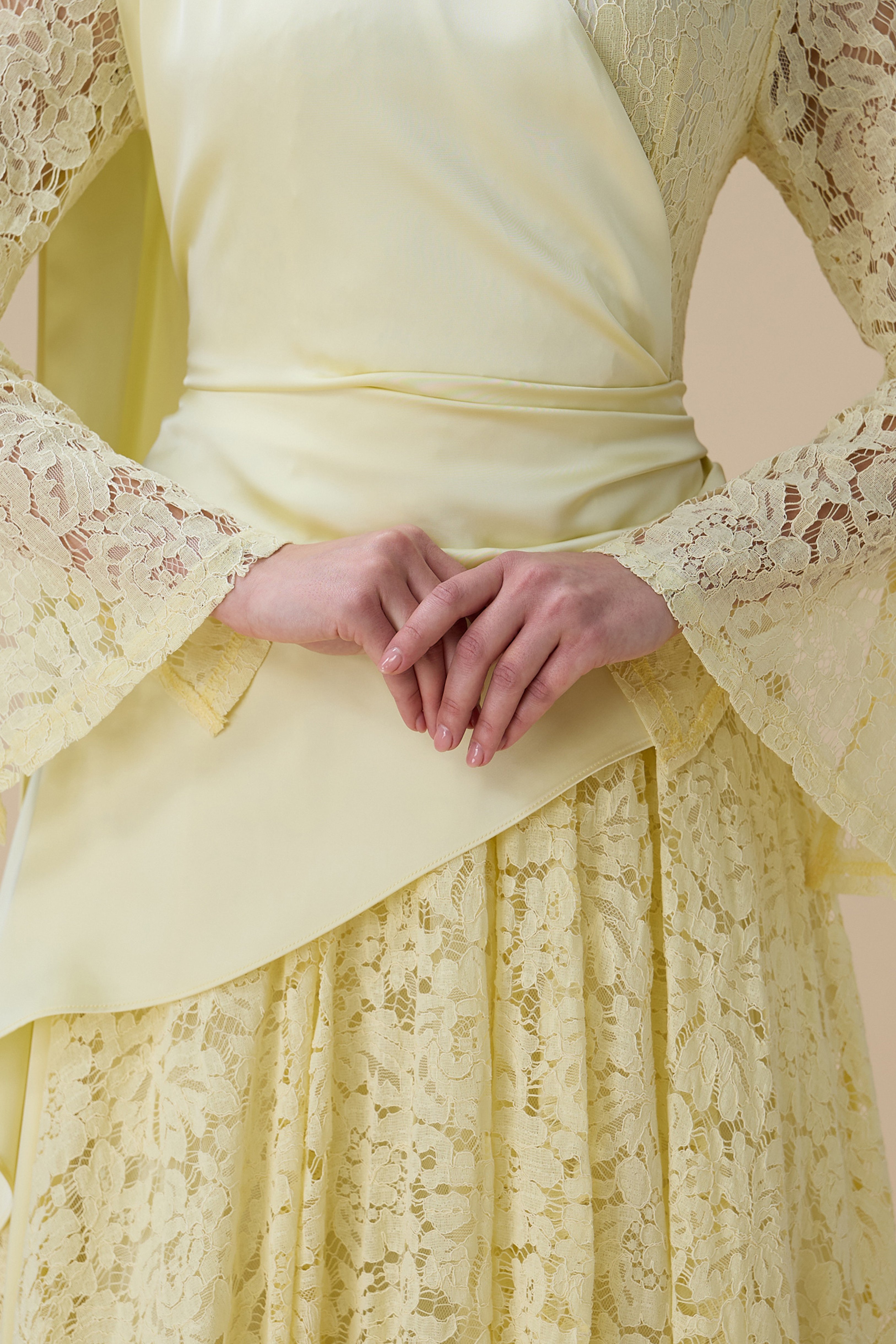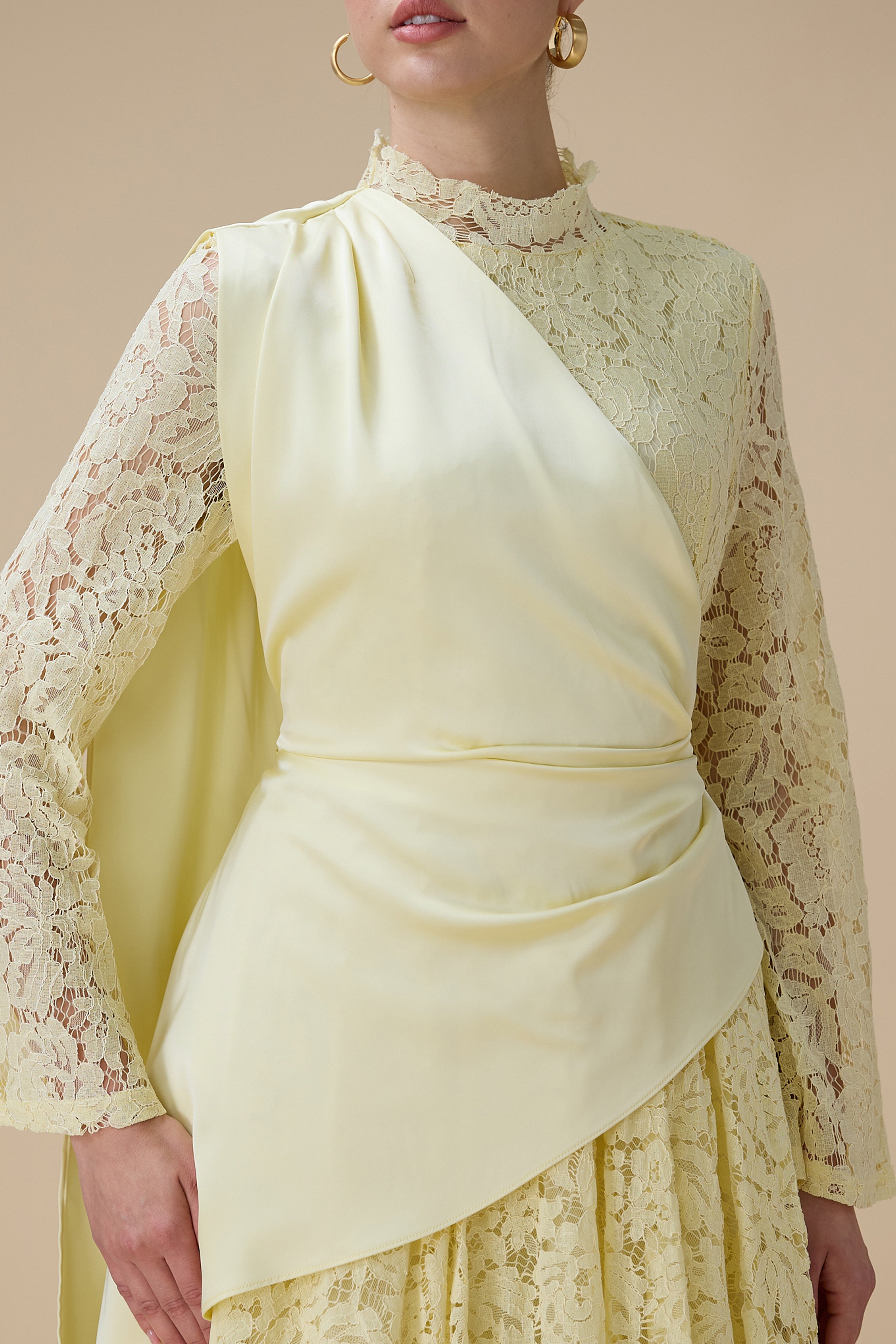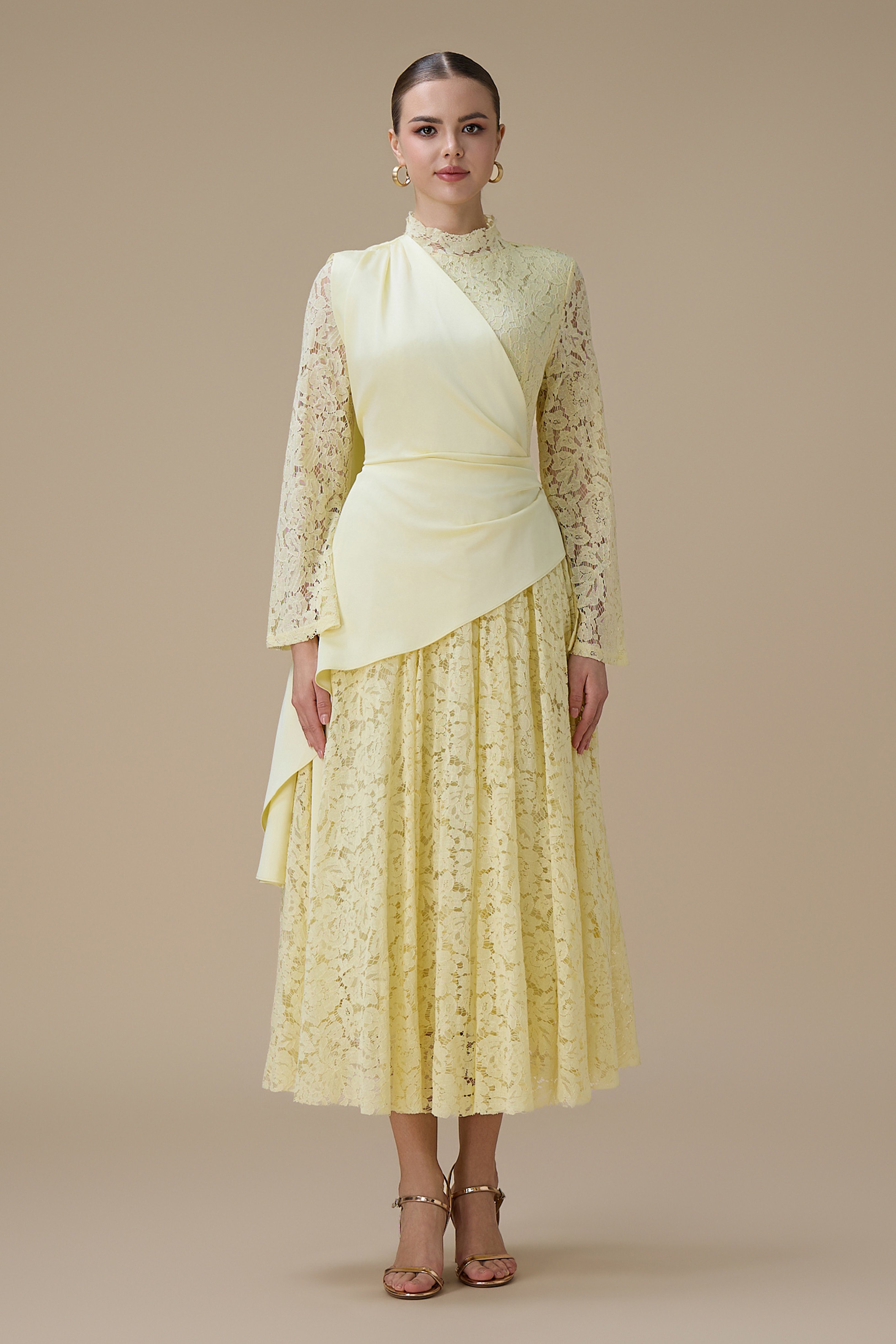 نوع القصة: فستان ماكسي دانتيل أصفر فاتح بقصة علوية ملتفة بأكمام طويلة وياقة عالية