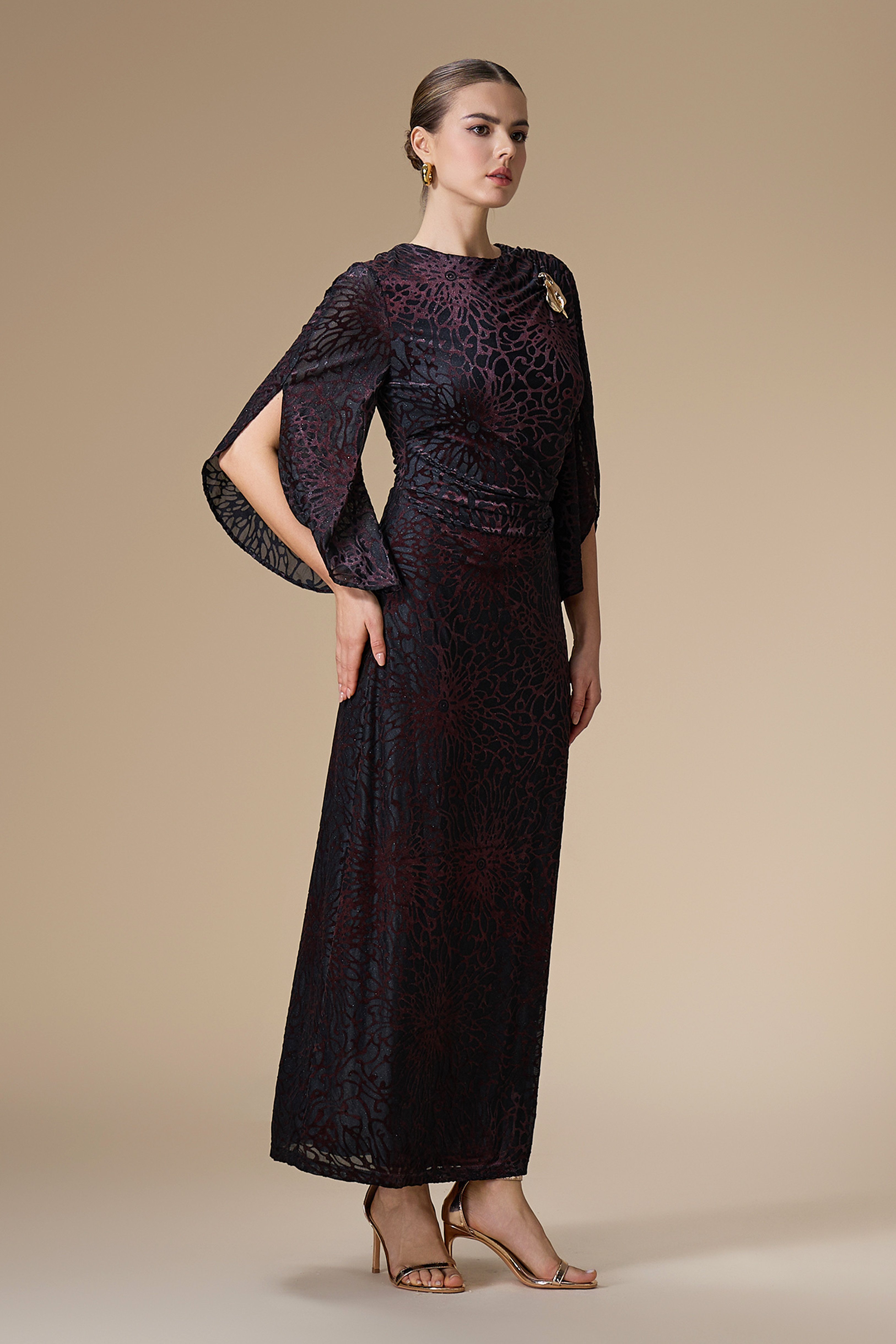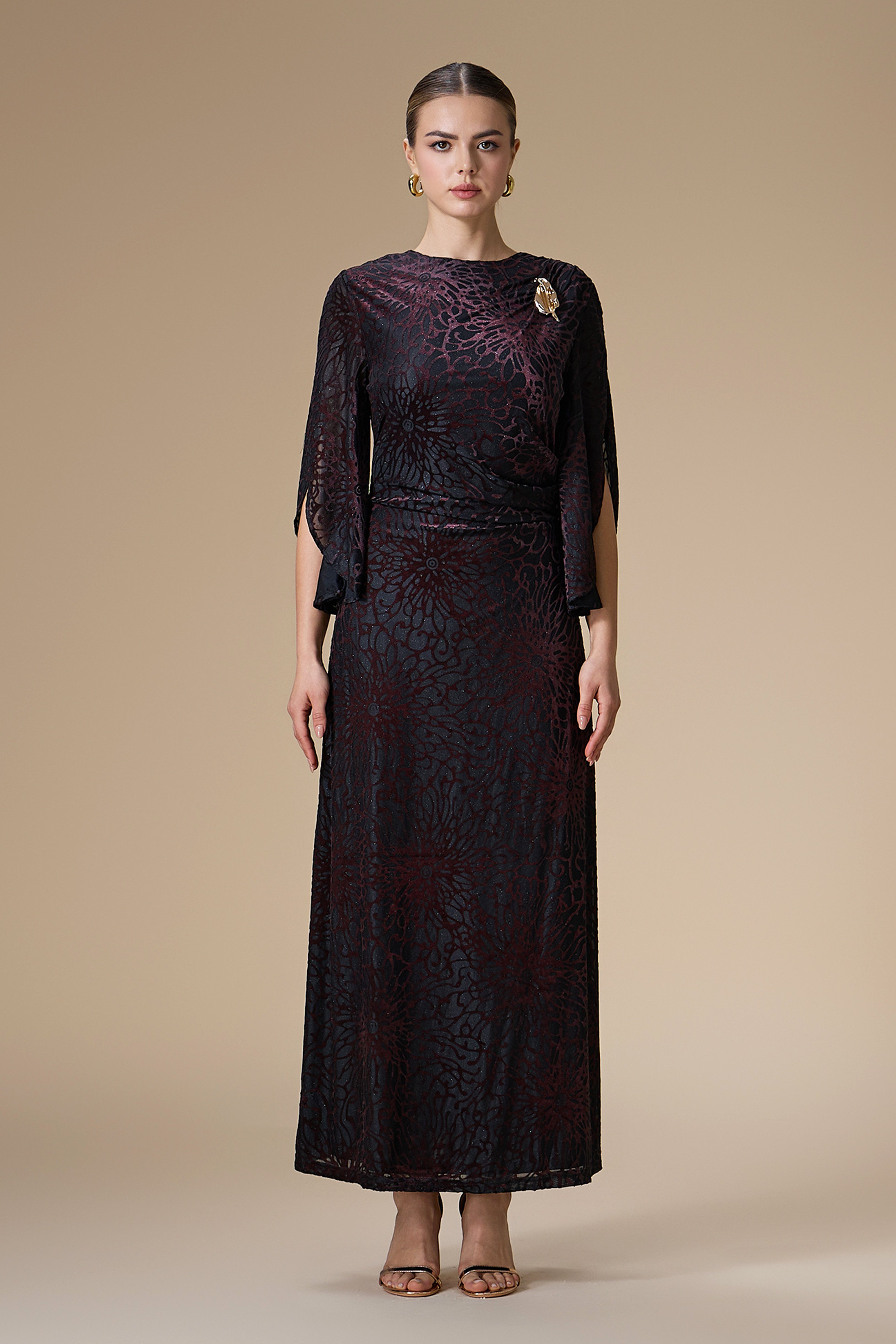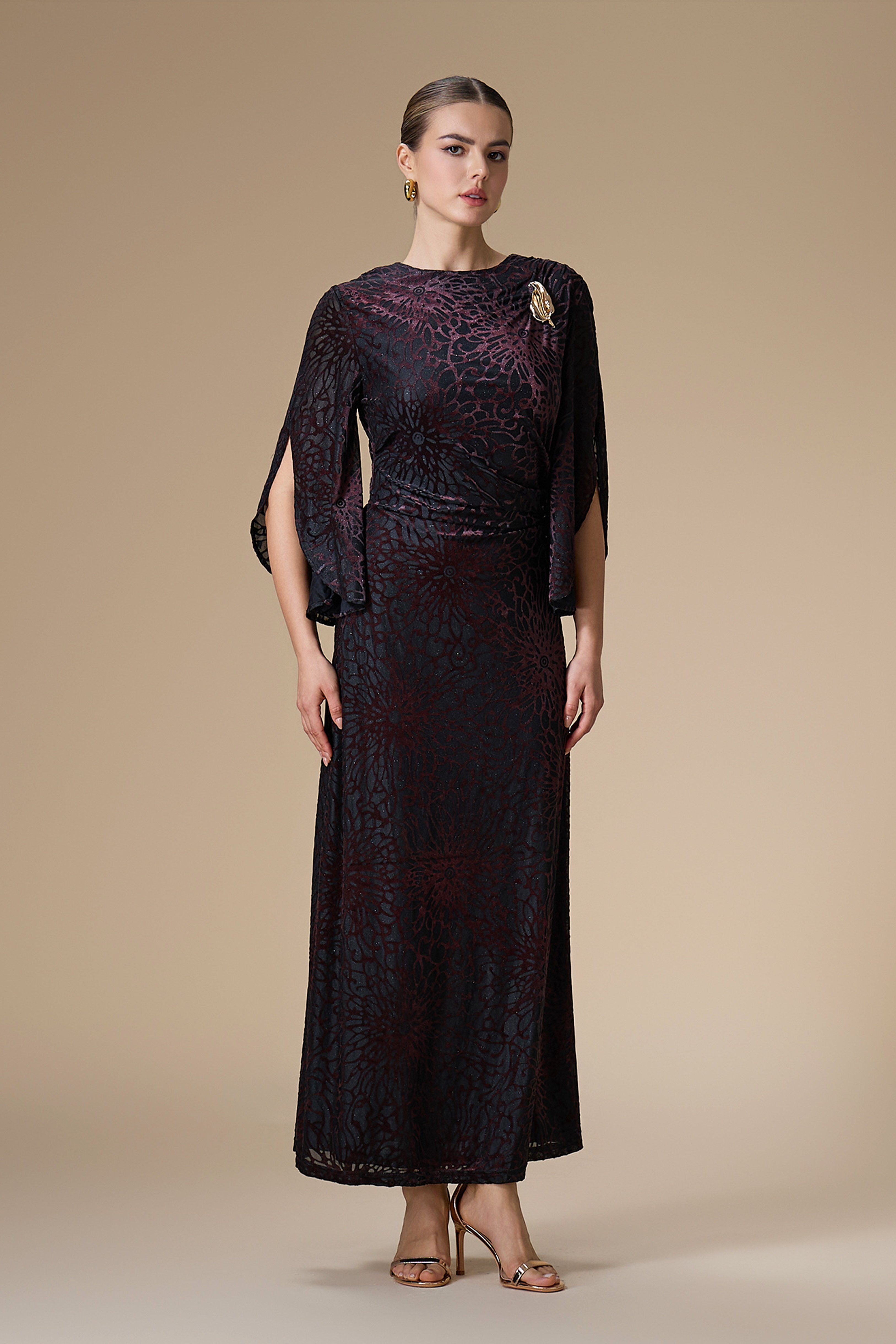 - نوع القصة: فستان طويل مخمل بلون عودي بنقوش بارزة، مزين ببروش ذهبي، بأكمام طويلة مع فتحة طولية، وياقة دائرية مغلقة، مع خصر محدد وتمدد مريح