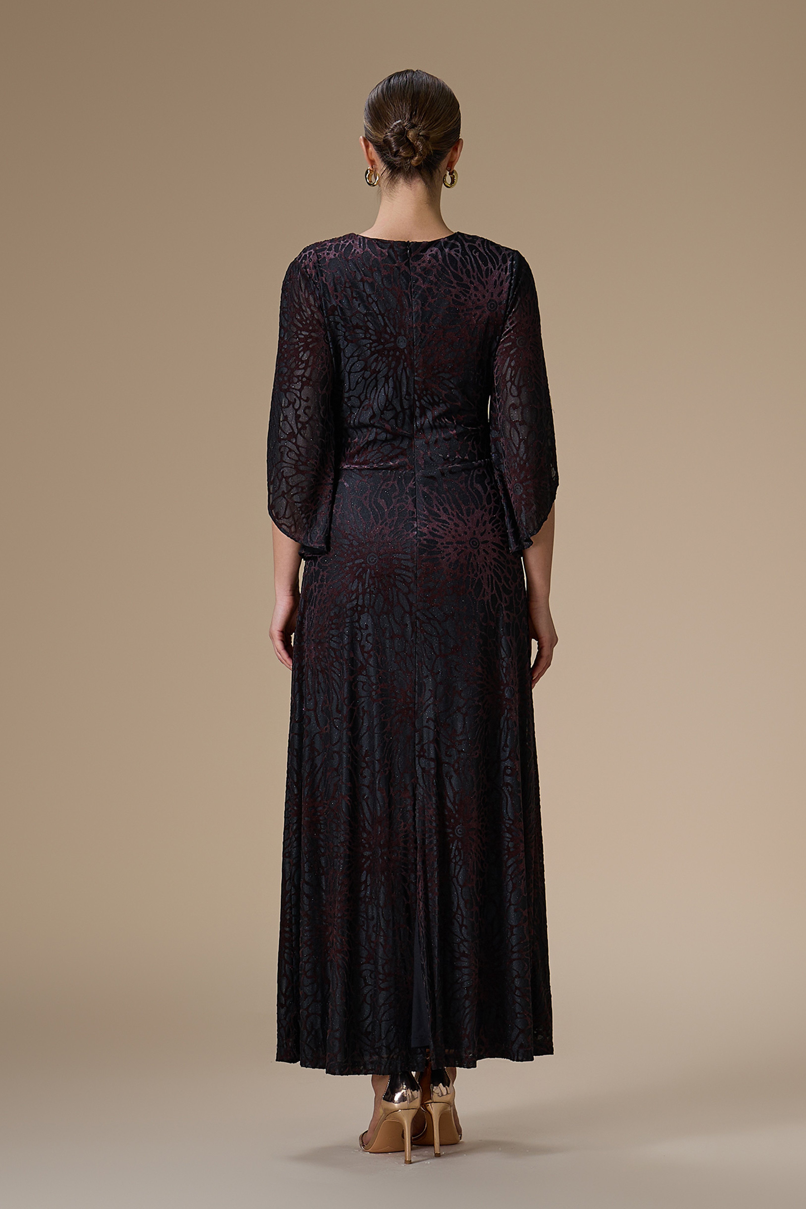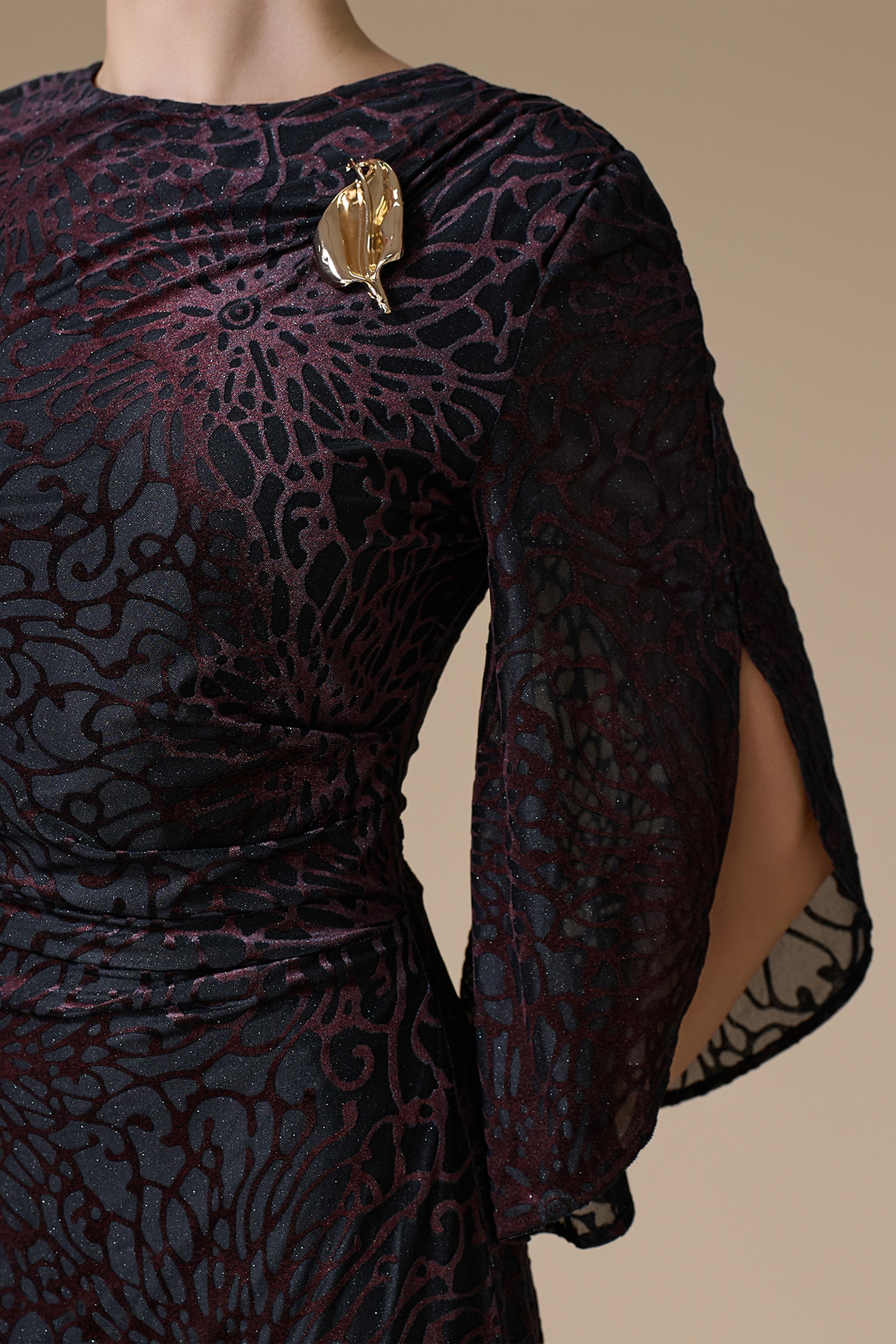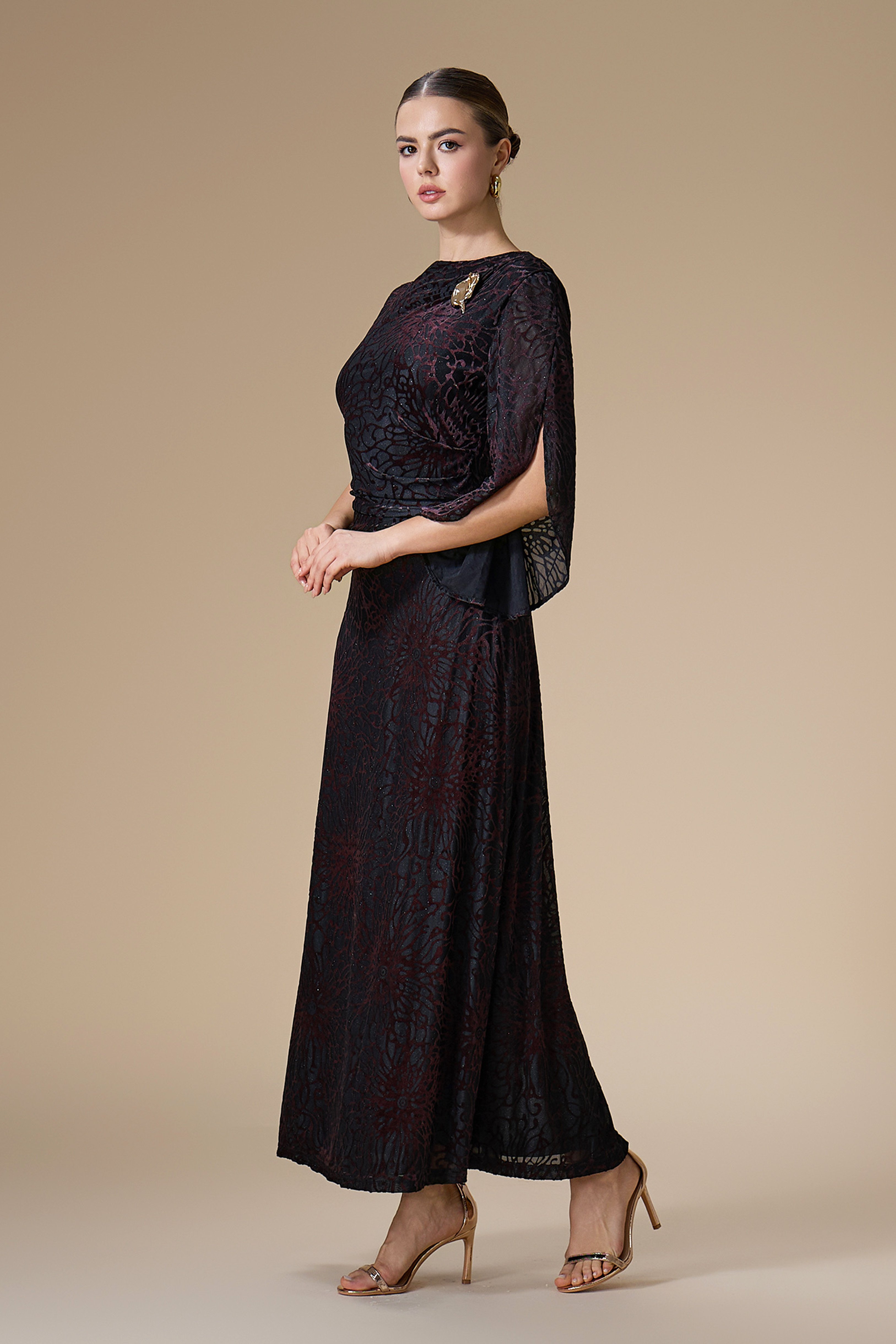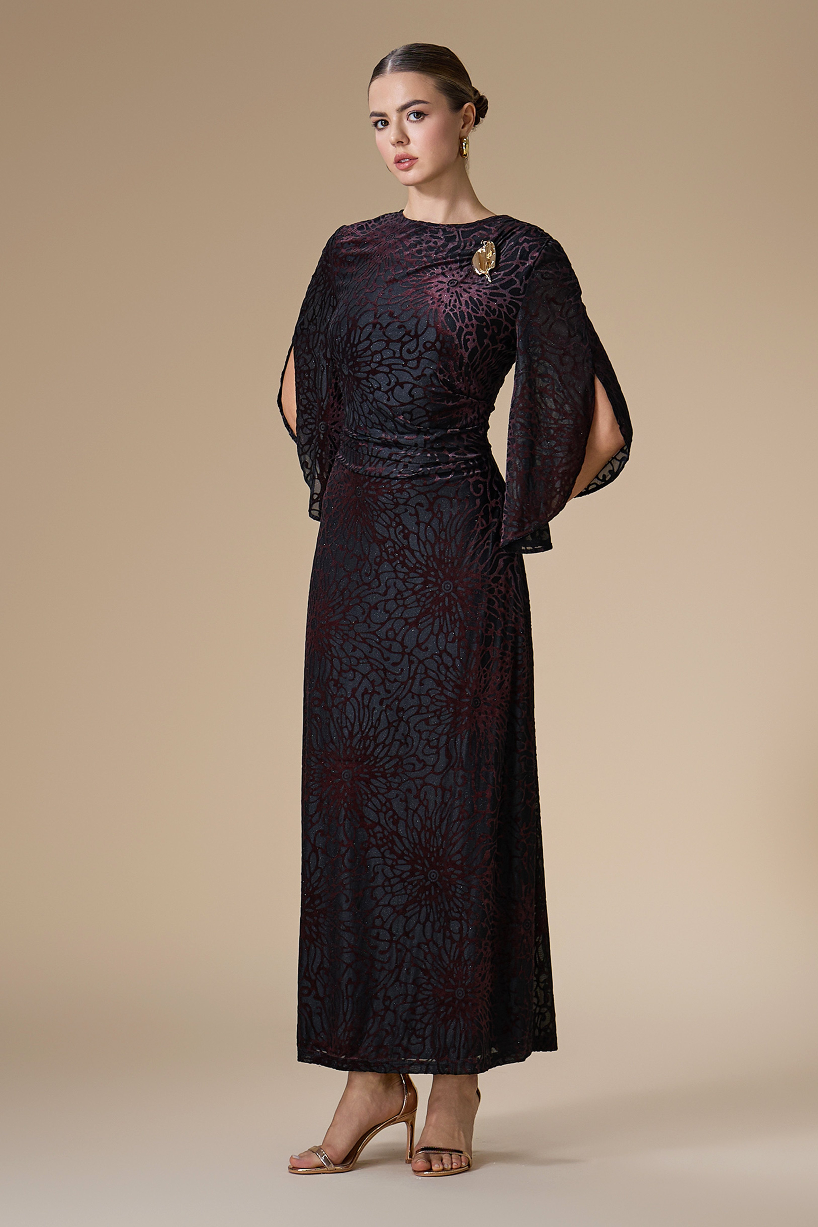 - نوع القصة: فستان طويل مخمل بلون عودي بنقوش بارزة، مزين ببروش ذهبي، بأكمام طويلة مع فتحة طولية، وياقة دائرية مغلقة، مع خصر محدد وتمدد مريح